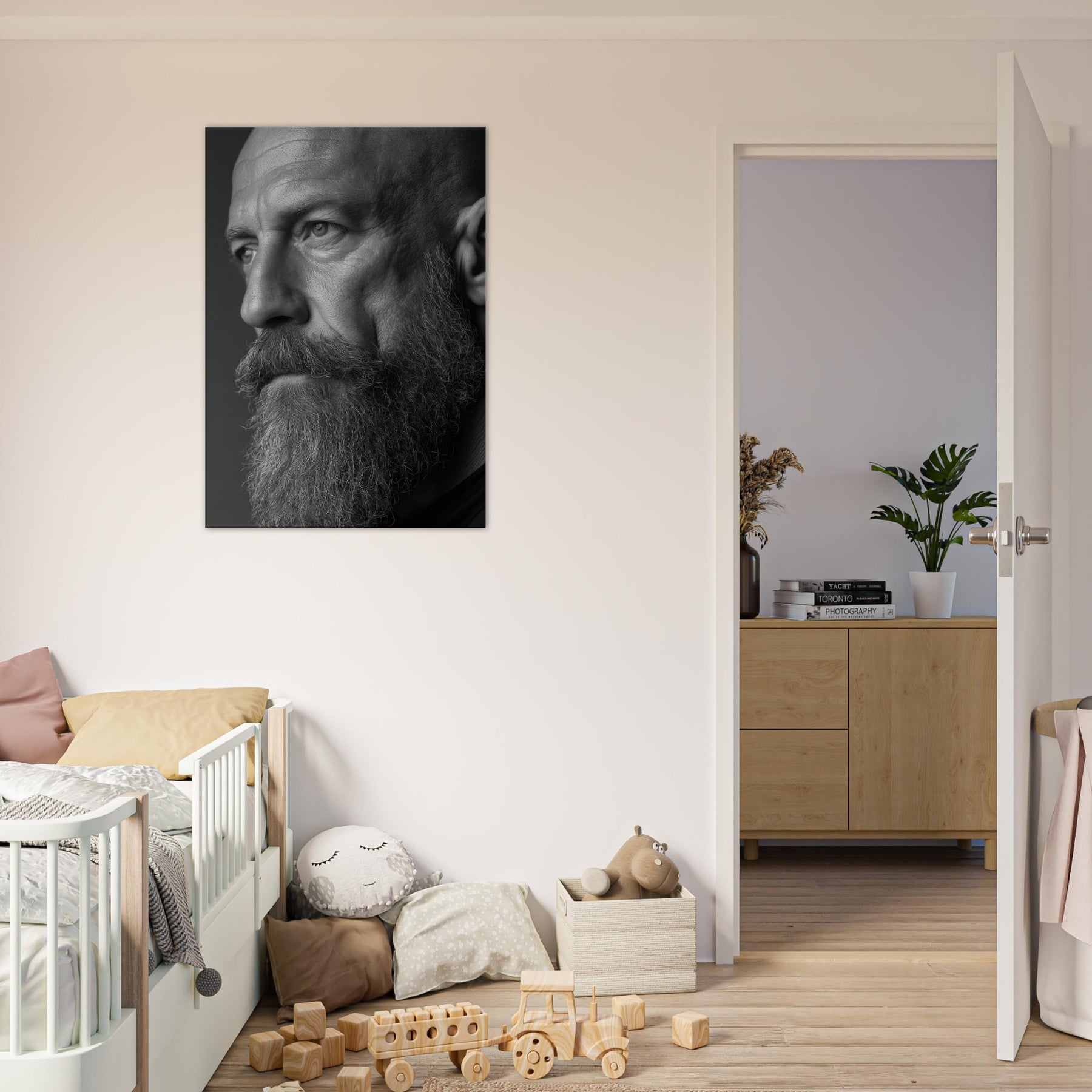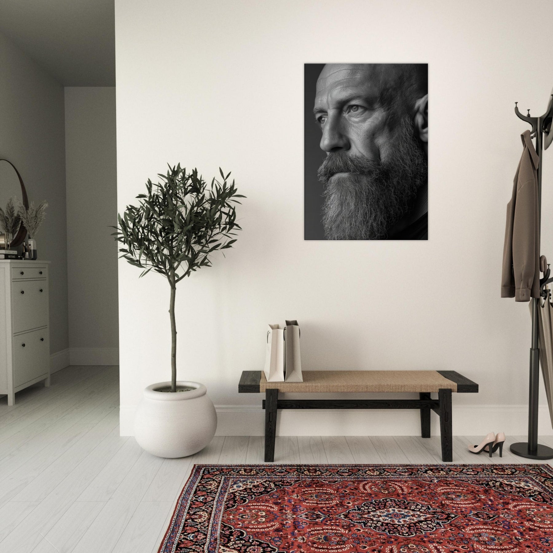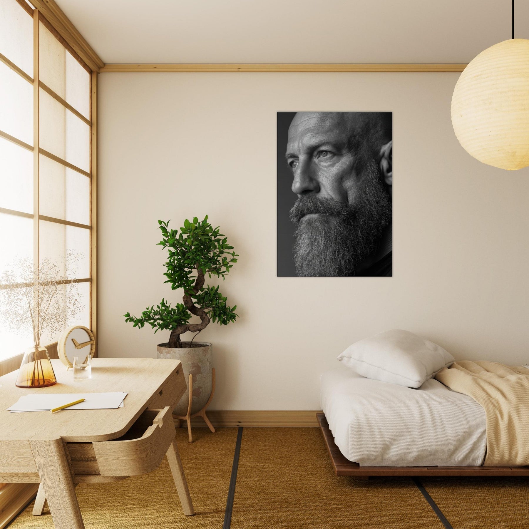 The black and white palette layers texture from the beard's woolly weave to the glint in the gaze as if the room itself exhales. Ideal for a calm corner or a refined gallery wall, it elevates mood with restrained intensity and enduring presence.