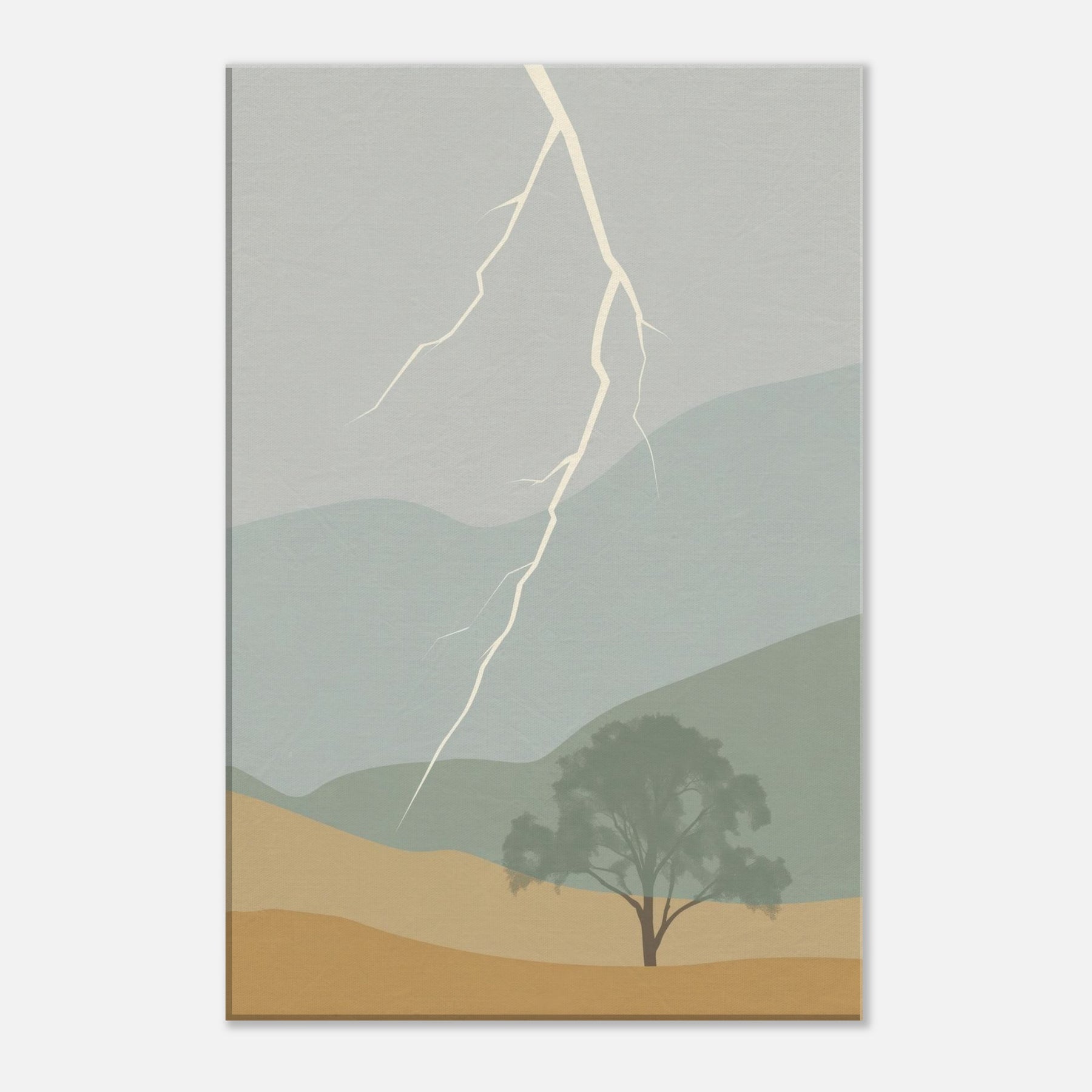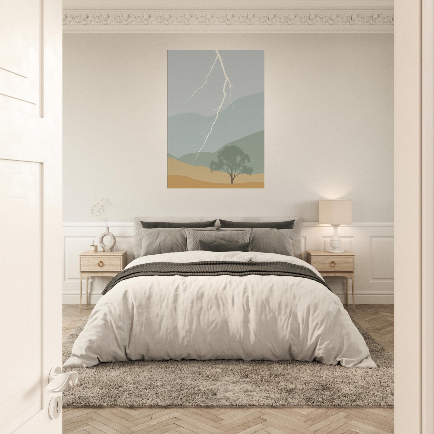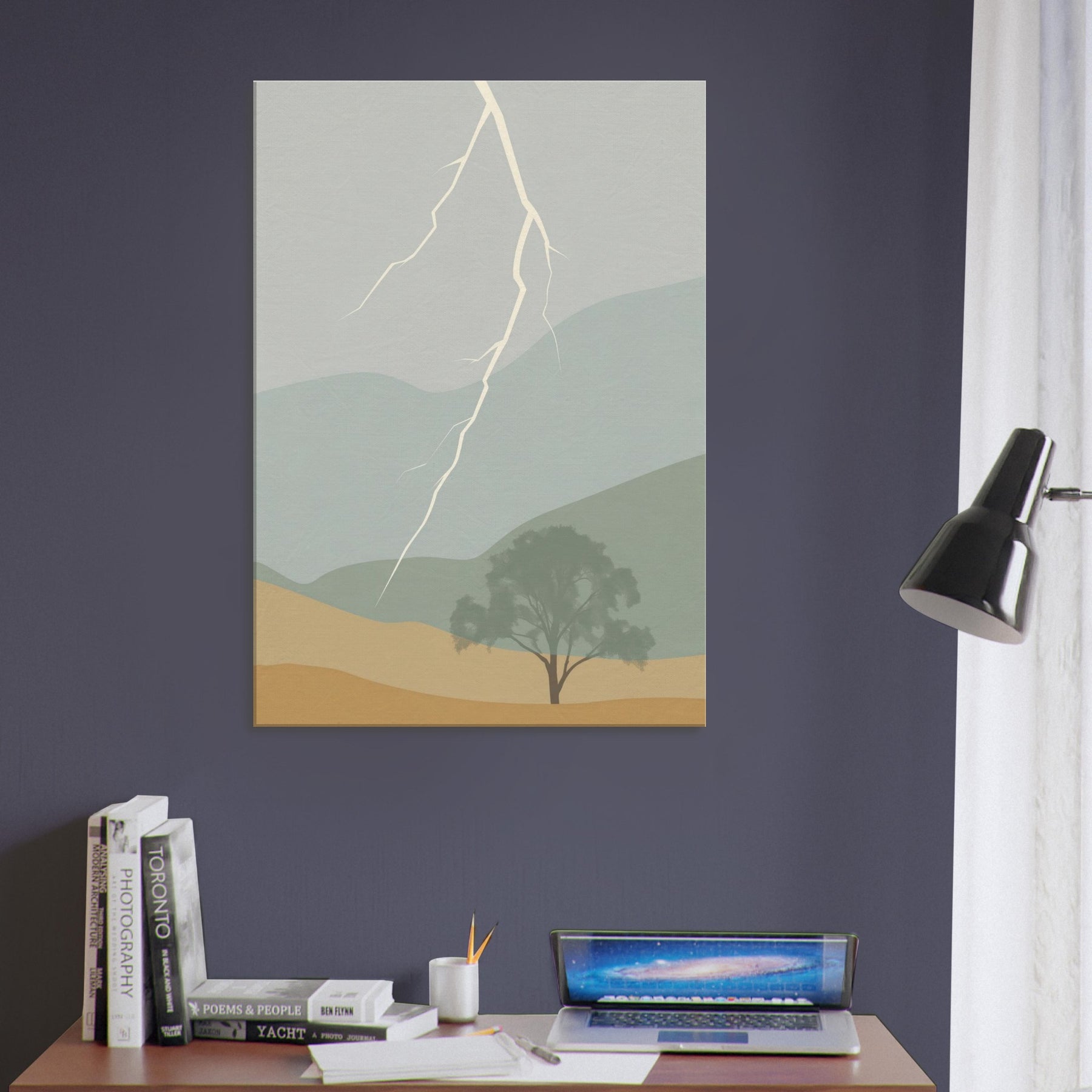 Place this minimalist scene in a quiet corner and feel the air shift with a rising Thunderstorm. The composition strips a storm to its essence: a jagged white bolt slicing through pale skies, a lone tree grounding the horizon, and soft, layered hills that glow in muted blues and sands. It invites calm reflection while suggesting movement like a breath before rain. In a living space, it enhances atmosphere without overpowering, pairing with neutral textiles and soft light to heighten each moment of edge and quiet.