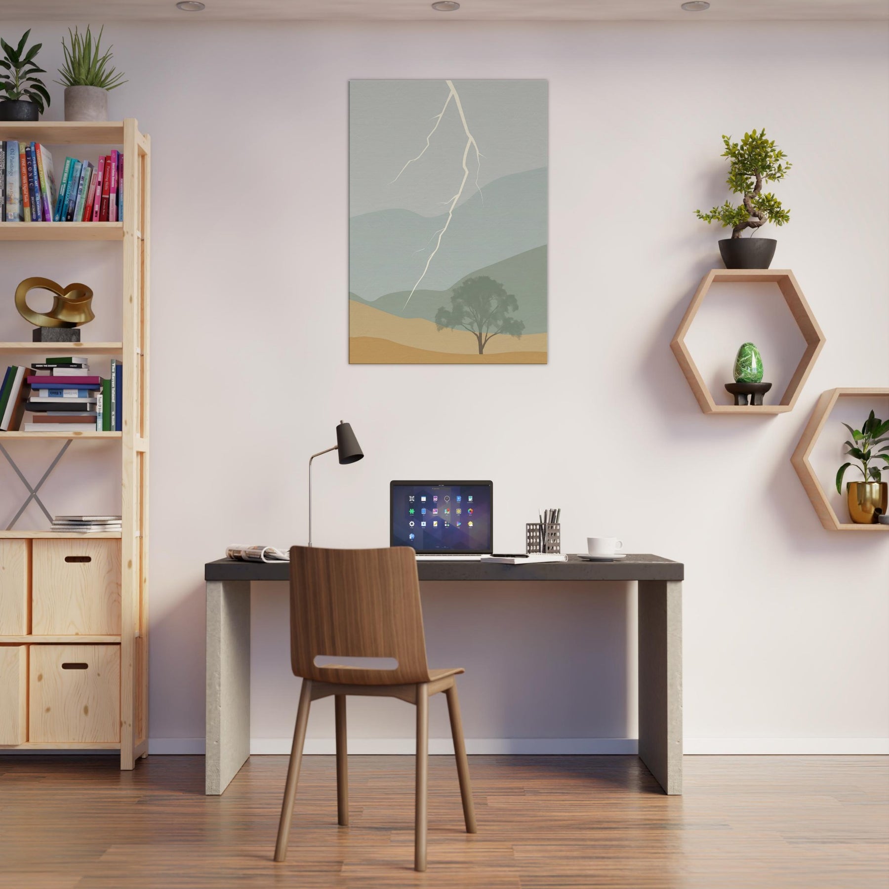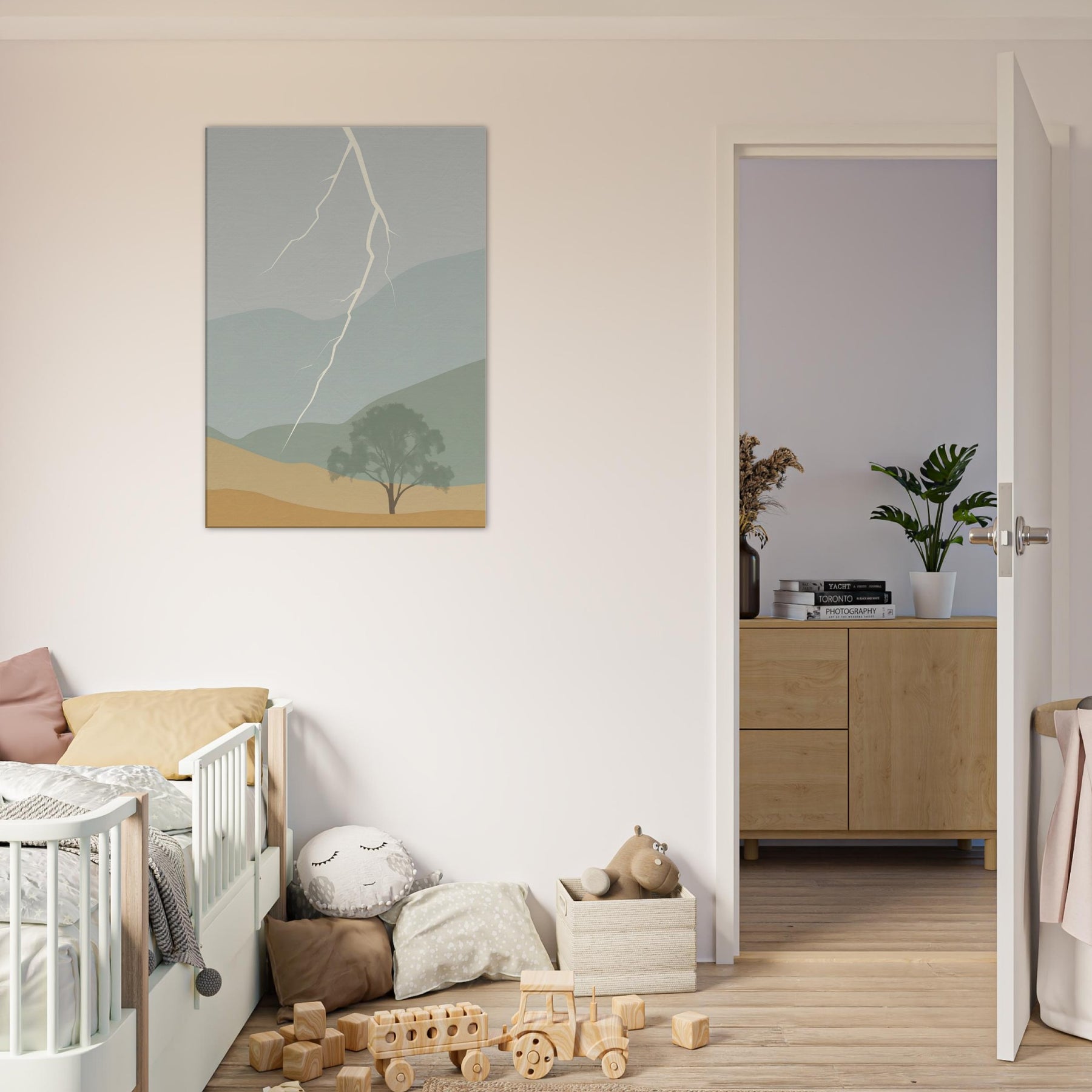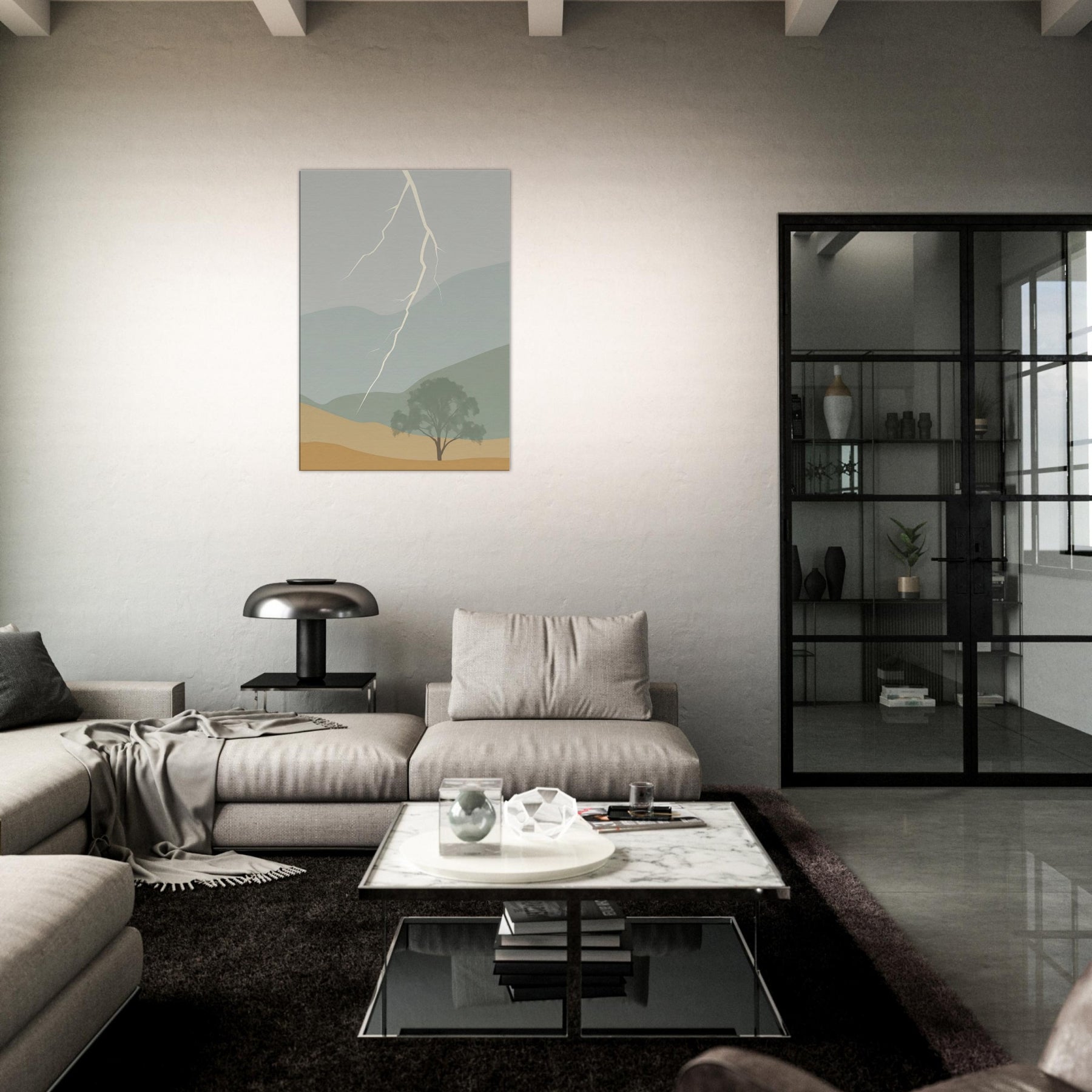 Place this minimalist scene in a quiet corner and feel the air shift with a rising Thunderstorm. The composition strips a storm to its essence: a jagged white bolt slicing through pale skies, a lone tree grounding the horizon, and soft, layered hills that glow in muted blues and sands. It invites calm reflection while suggesting movement like a breath before rain. In a living space, it enhances atmosphere without overpowering, pairing with neutral textiles and soft light to heighten each moment of edge and quiet.