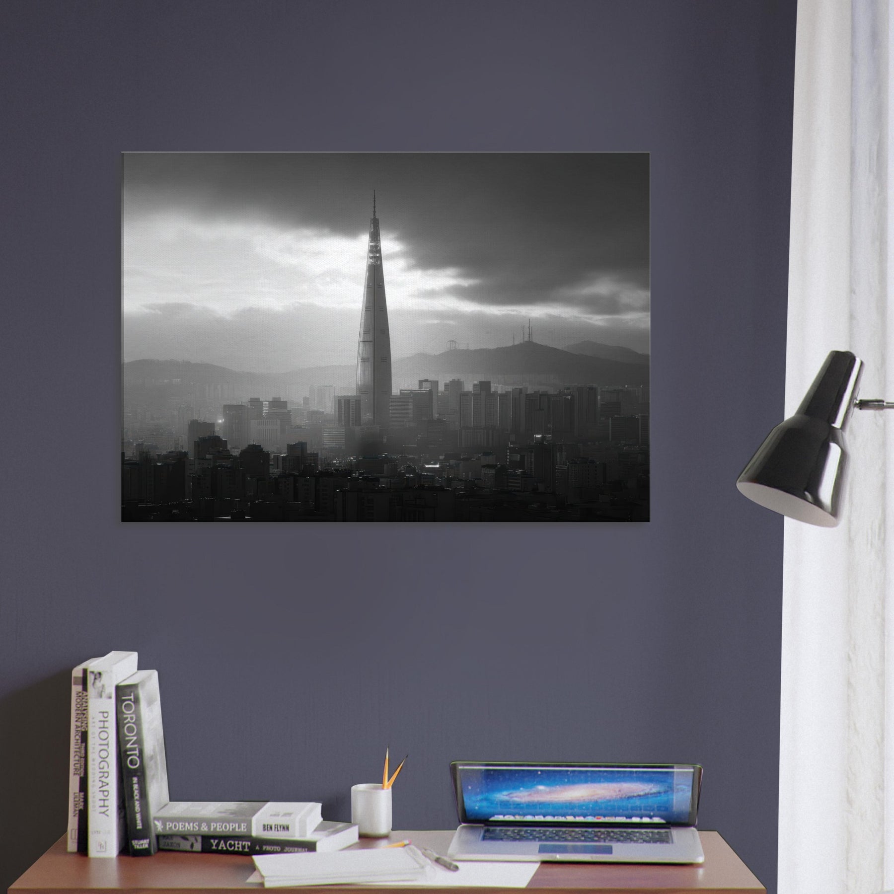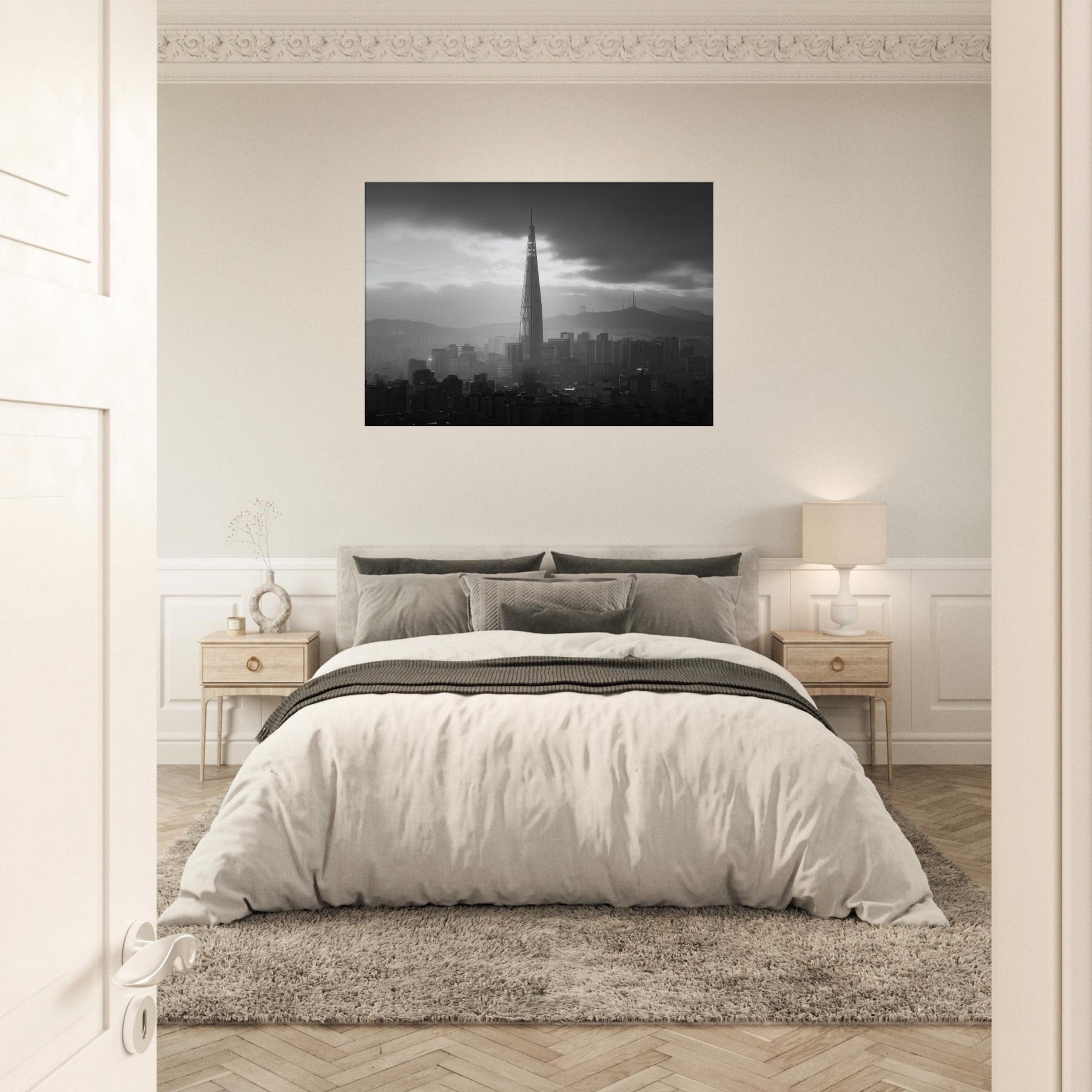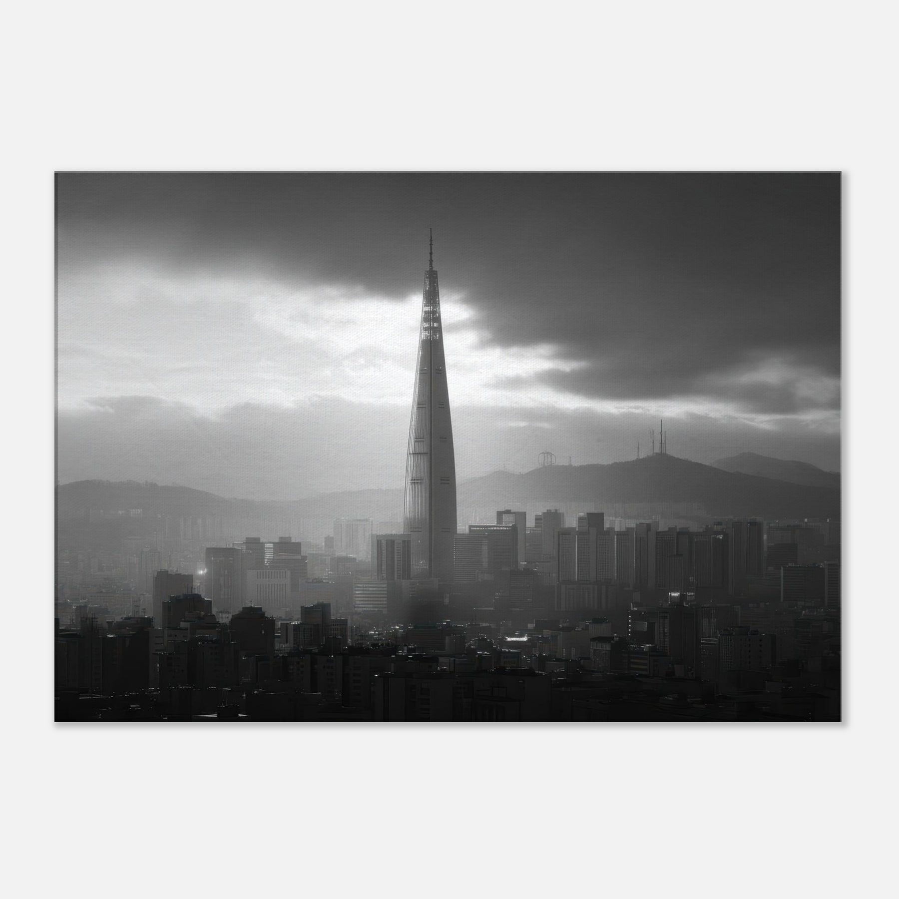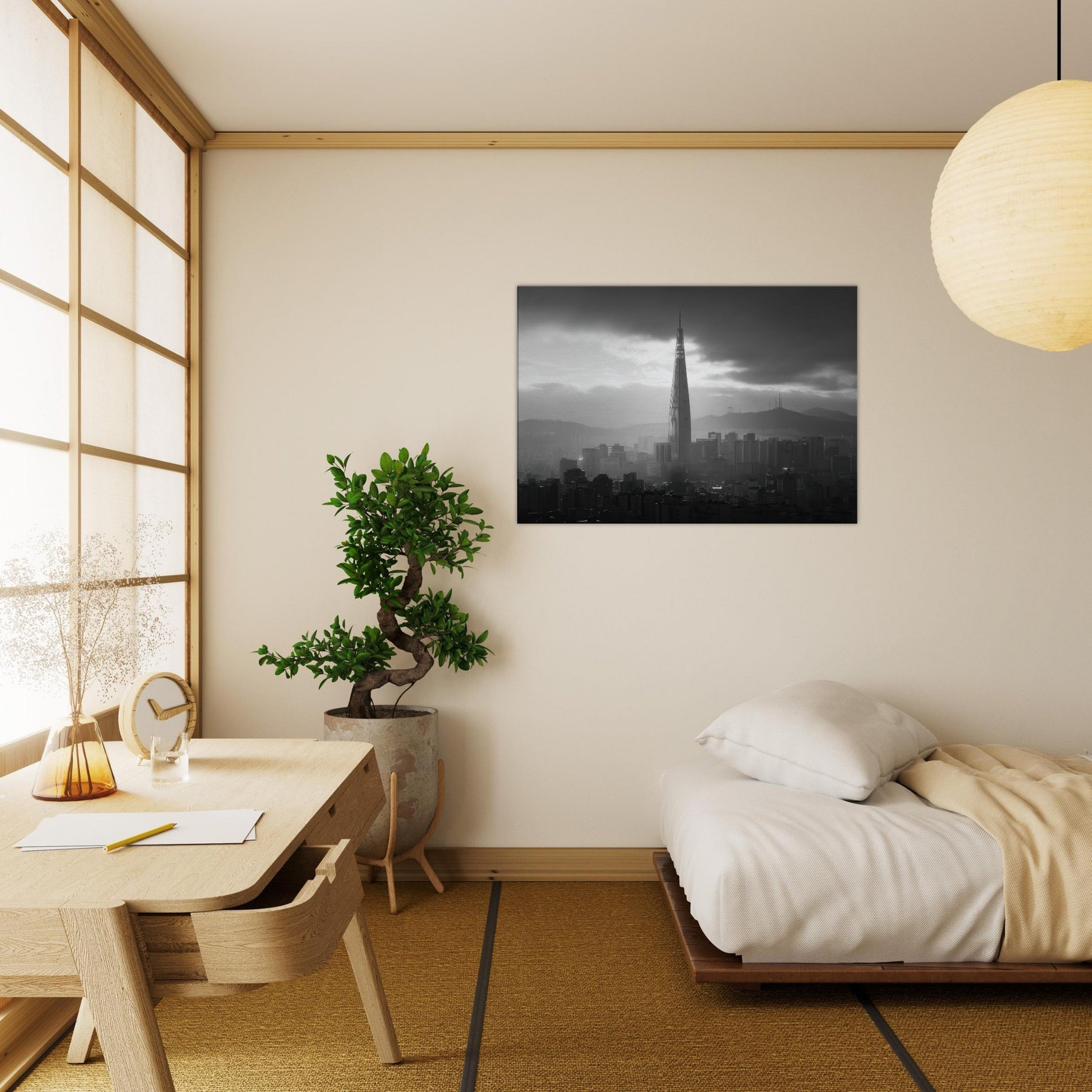 An arresting grayscale reverie where Seoul's skyline rises in quiet authority. This image hums with the hush between day and night: a velvet sky, rain kissed streets, and a lone silhouette of towering architecture catching the last light.