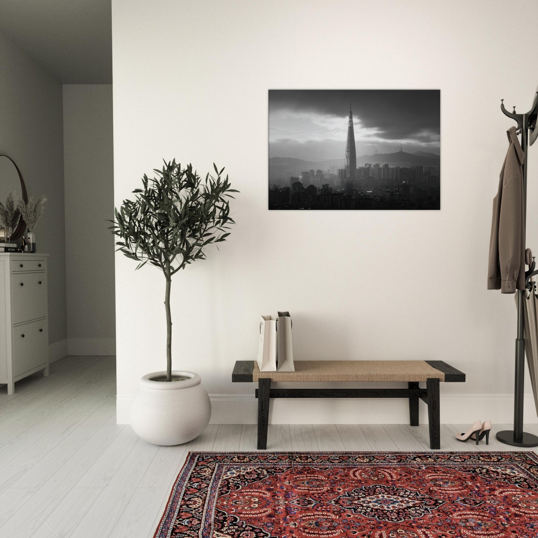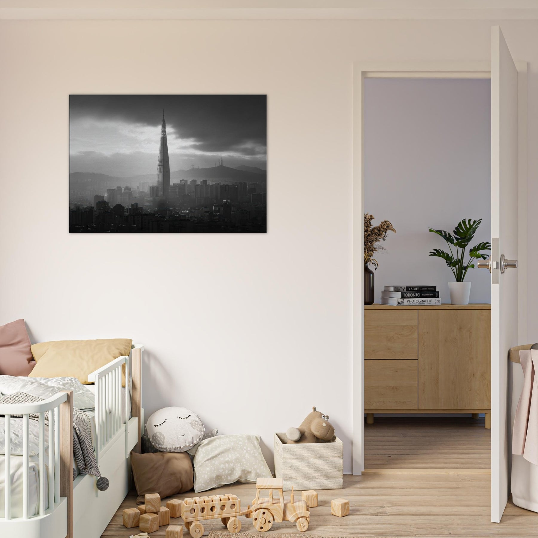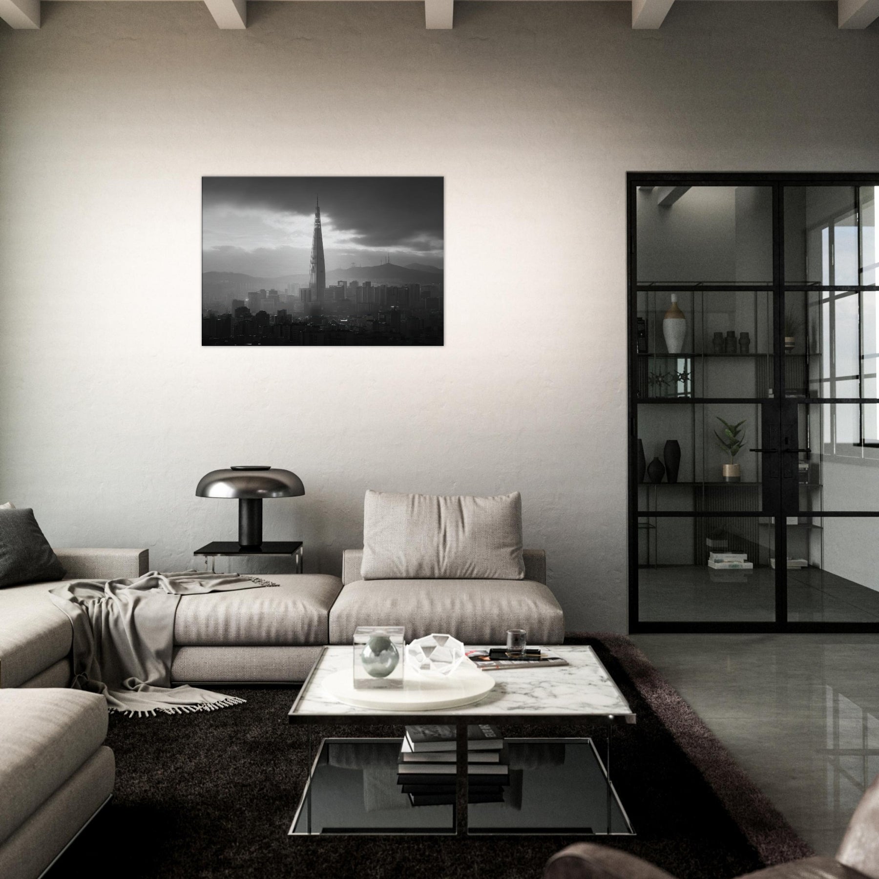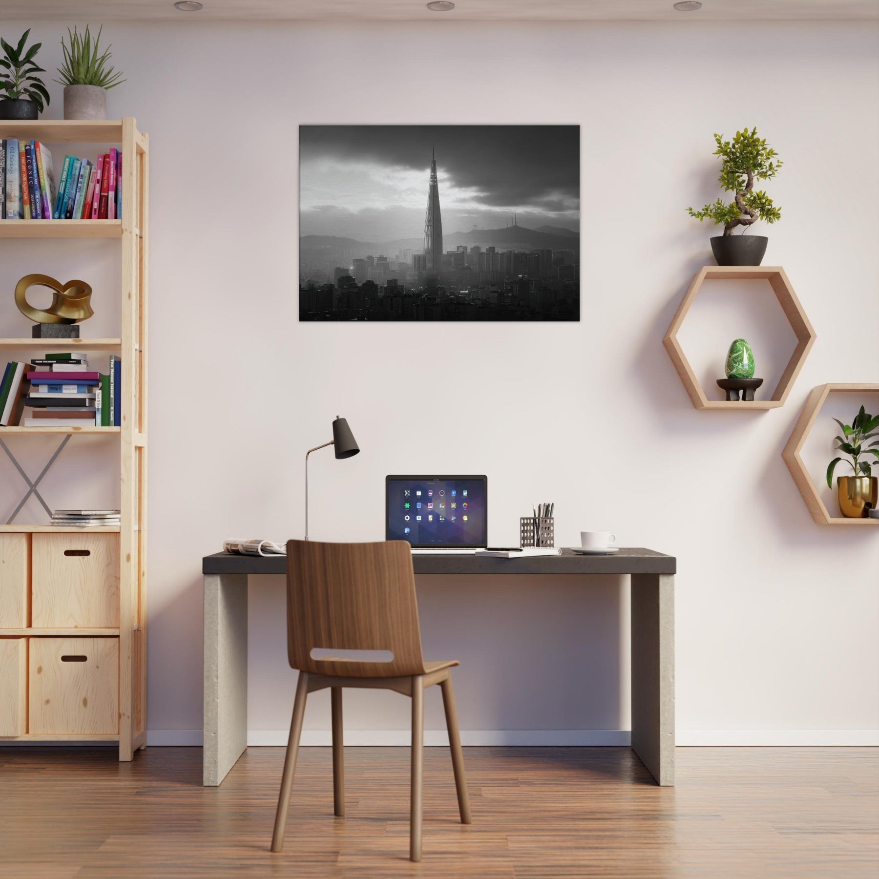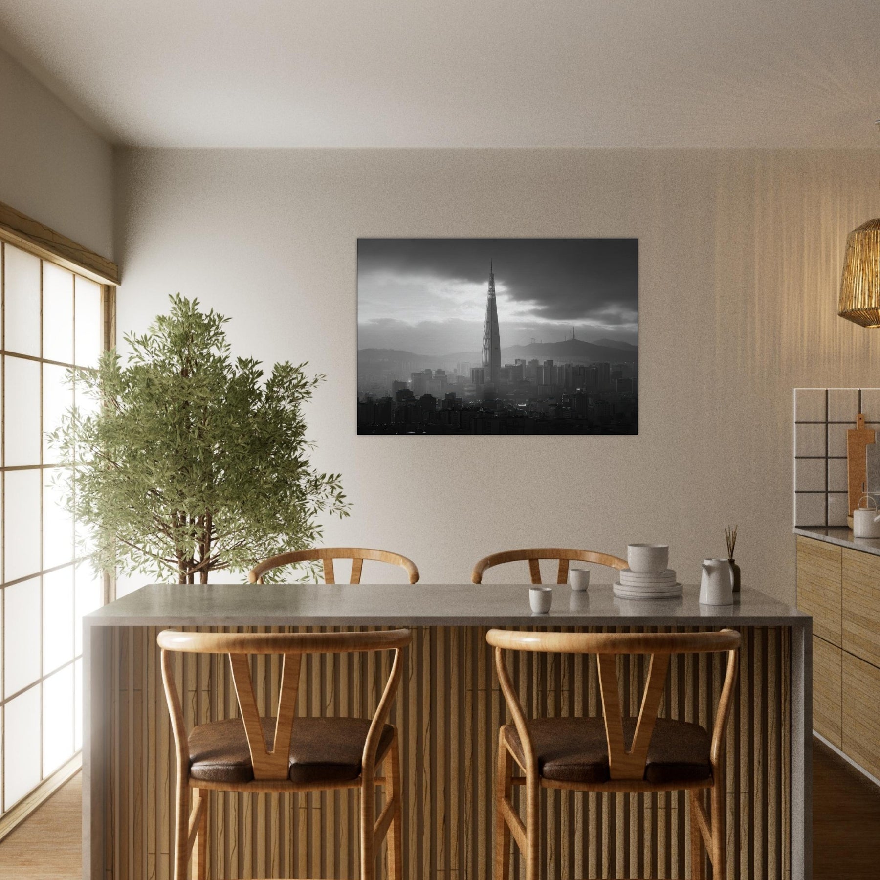 An arresting grayscale reverie where Seoul's skyline rises in quiet authority. This image hums with the hush between day and night: a velvet sky, rain kissed streets, and a lone silhouette of towering architecture catching the last light.