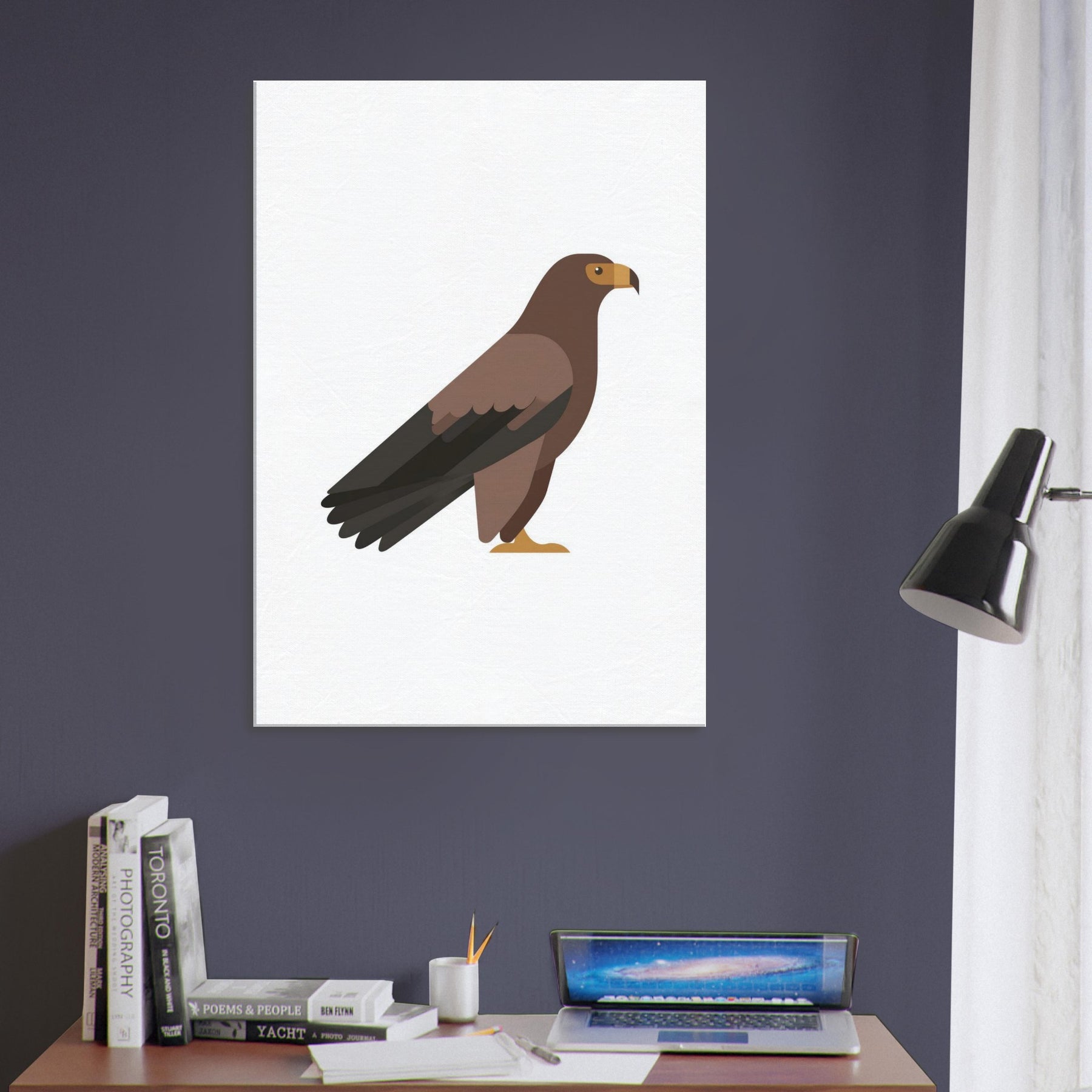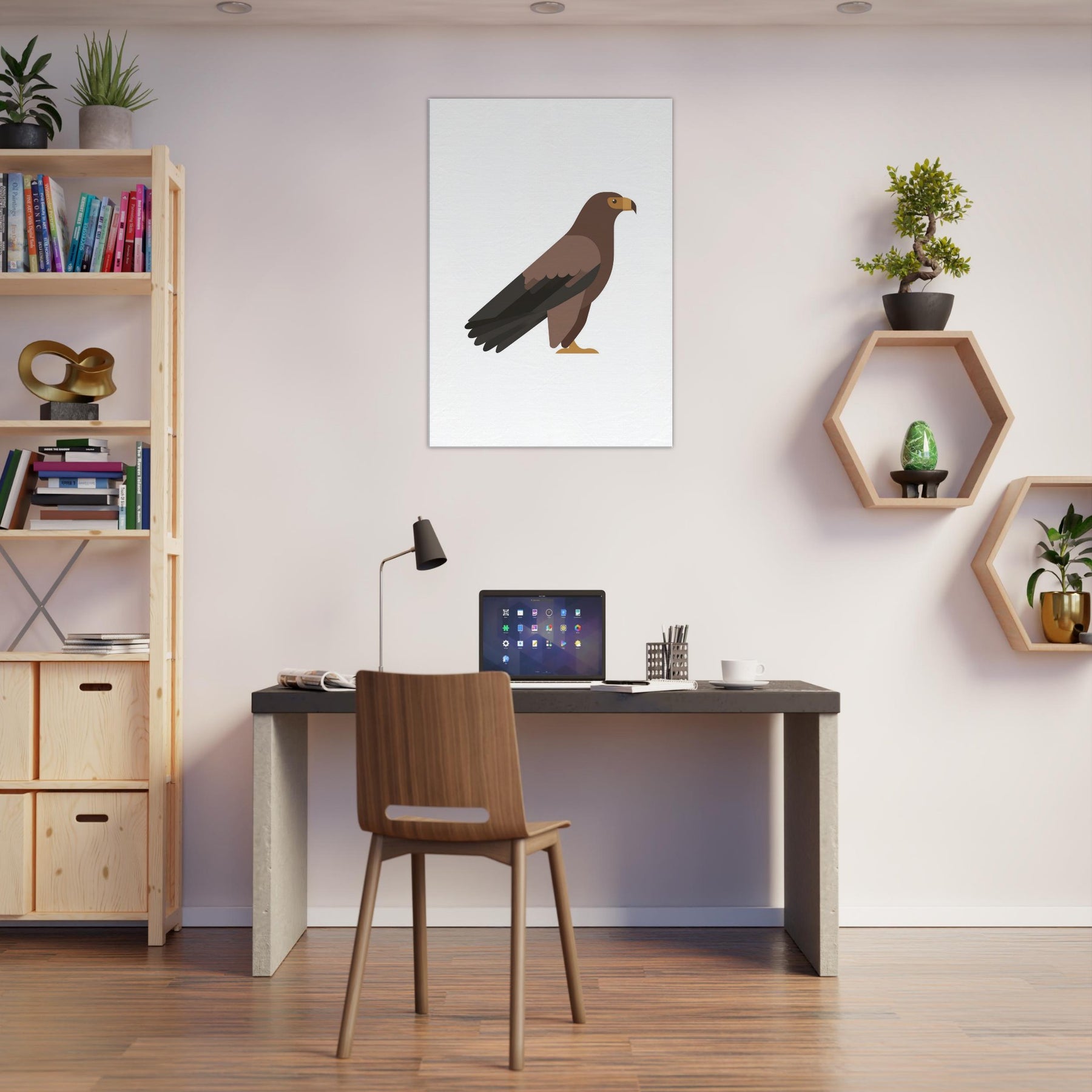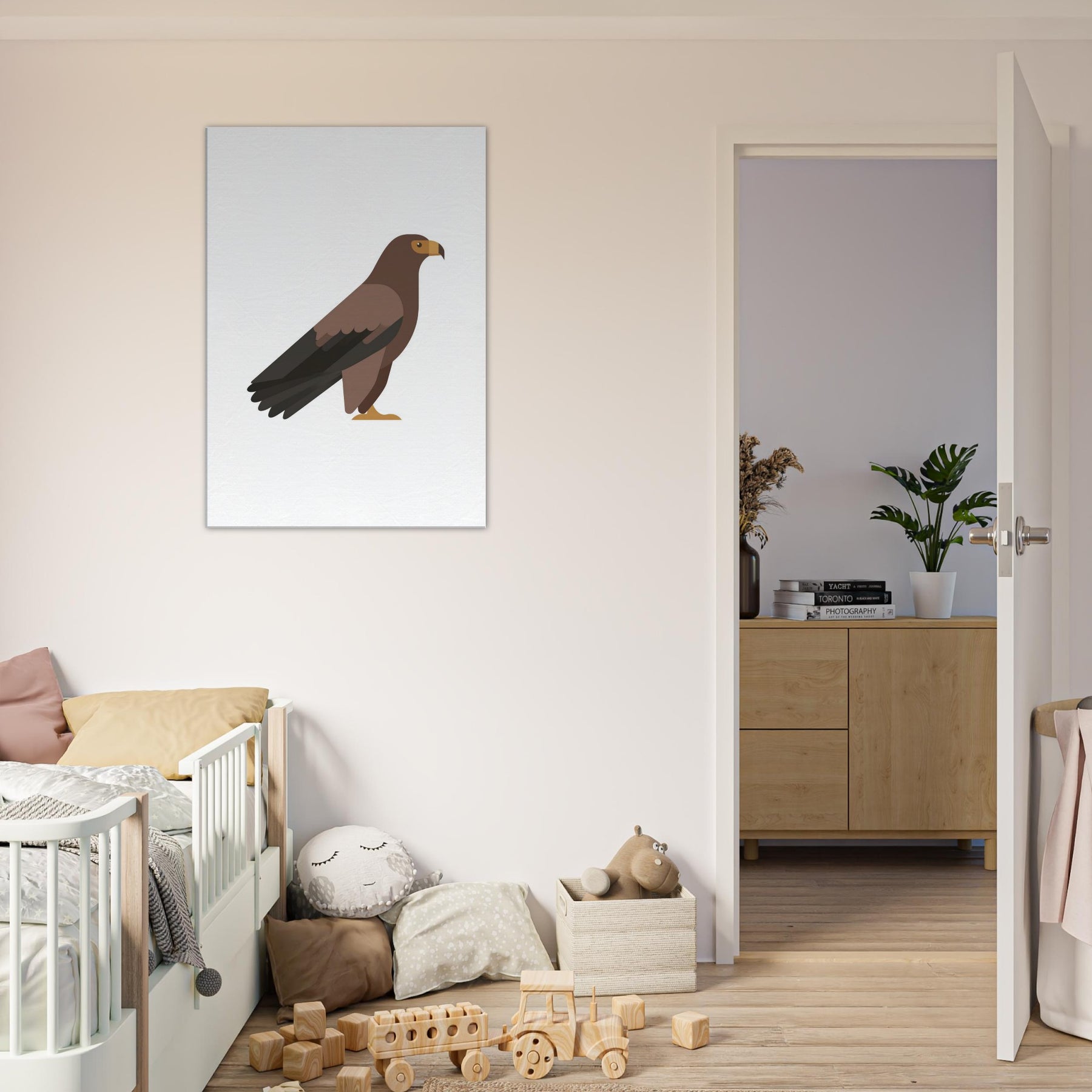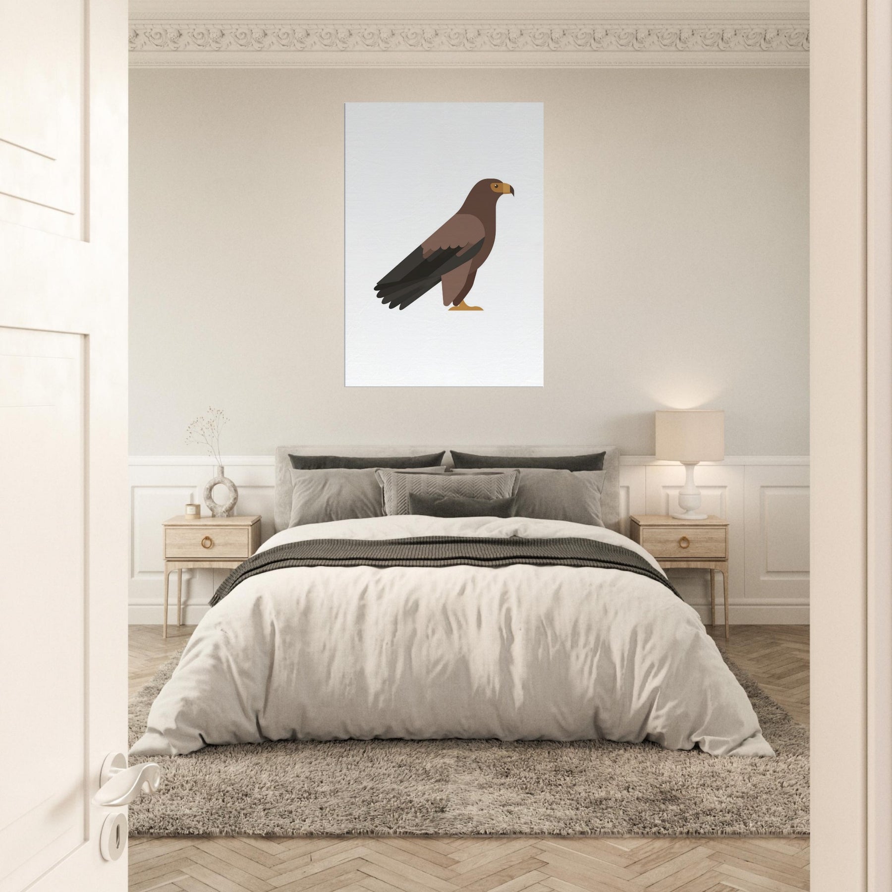 This minimalist eagle captures the quiet majesty of a soaring hunter, rendered in clean shapes and warm earth tones. The pared back composition invites calm and focus, making it ideal for a living room, study, or hallway. The eagle stands poised on a simple perch, its silhouette suggesting motion and restraint. The soft gradient of browns against a bright white backdrop creates a serene focal point that elevates modern interiors with natural energy.
