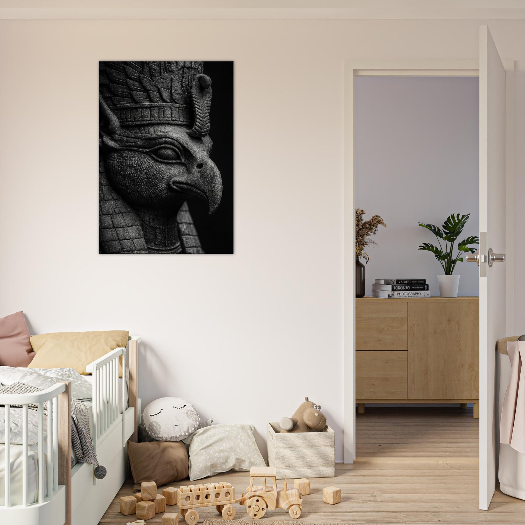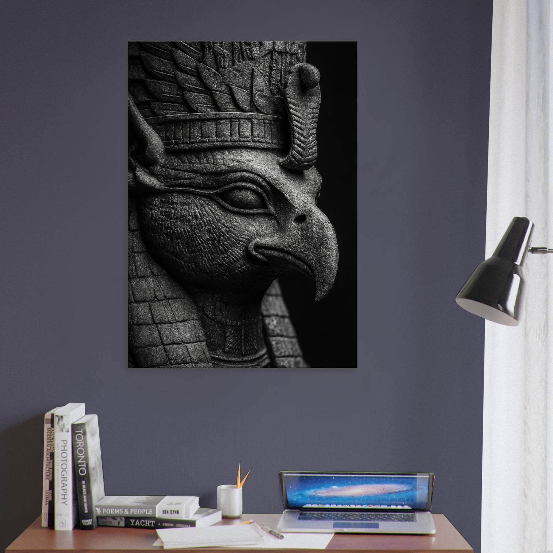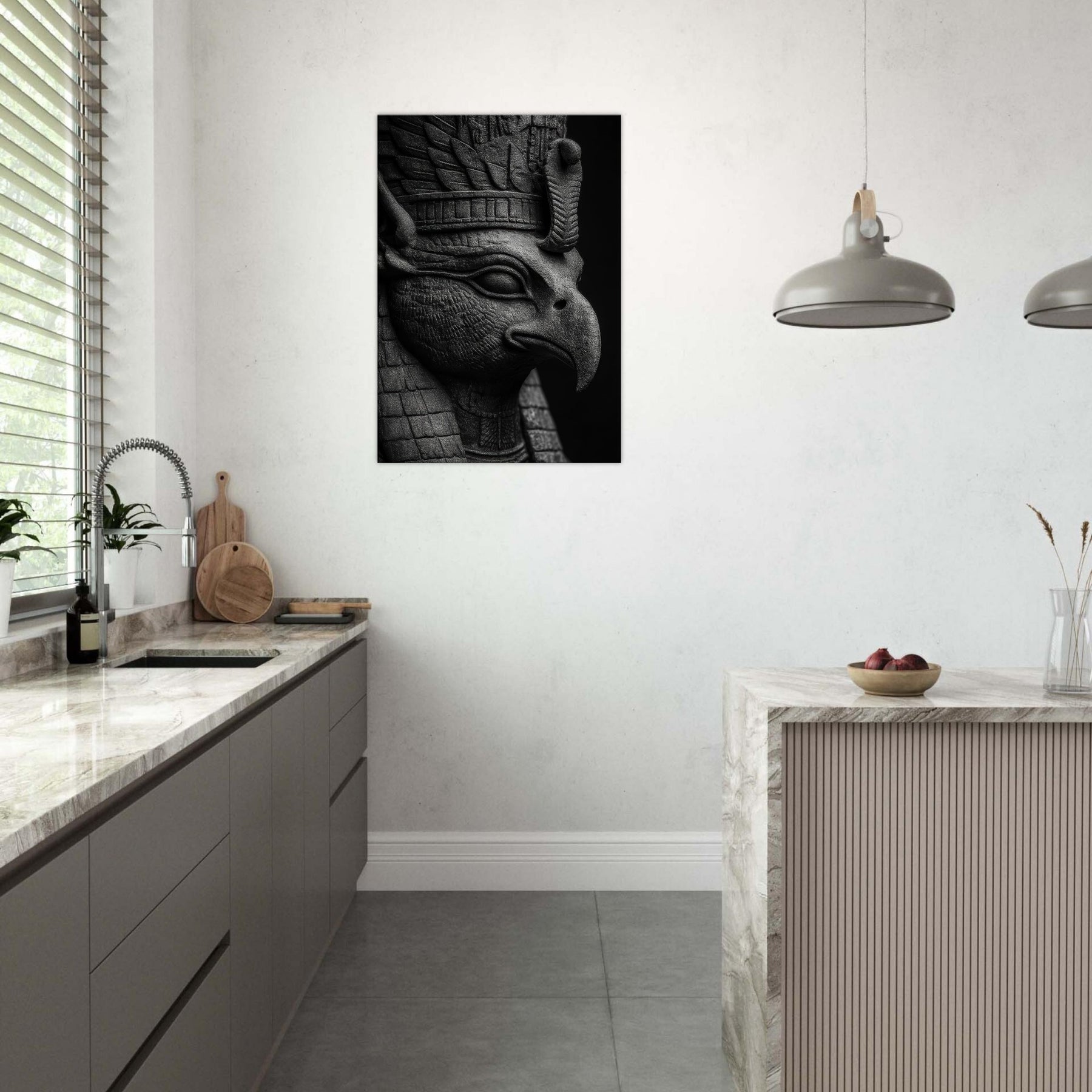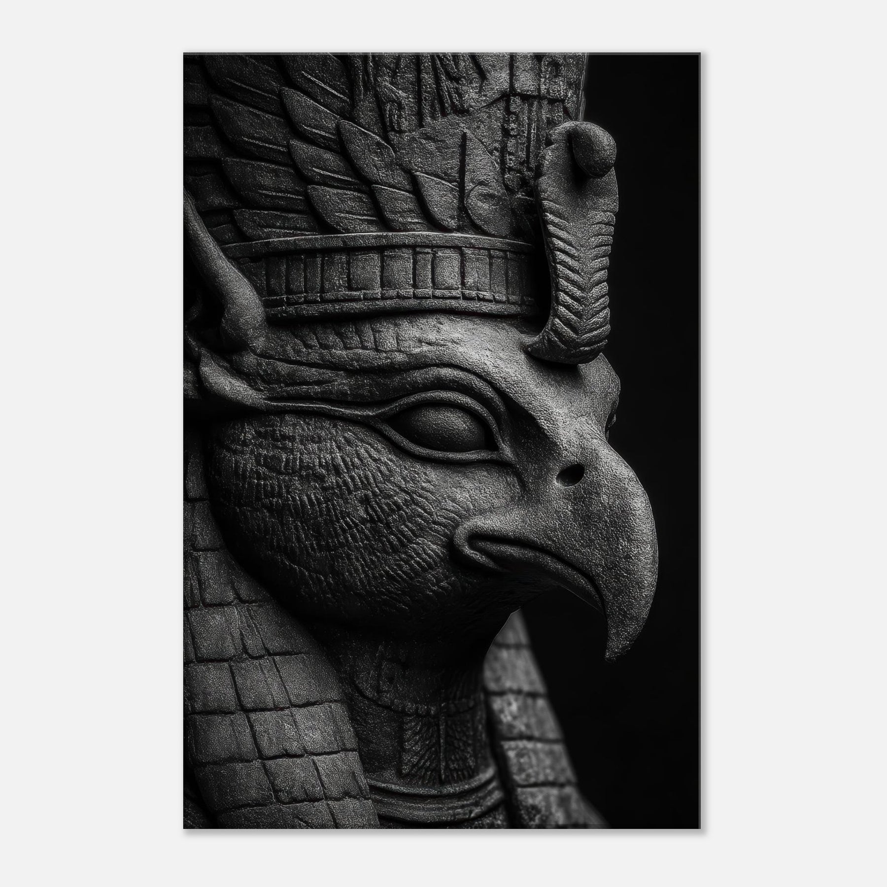 This black and white study breathes myth into modern walls, where every carved line and feathered contour catches light like a shard of dawn.