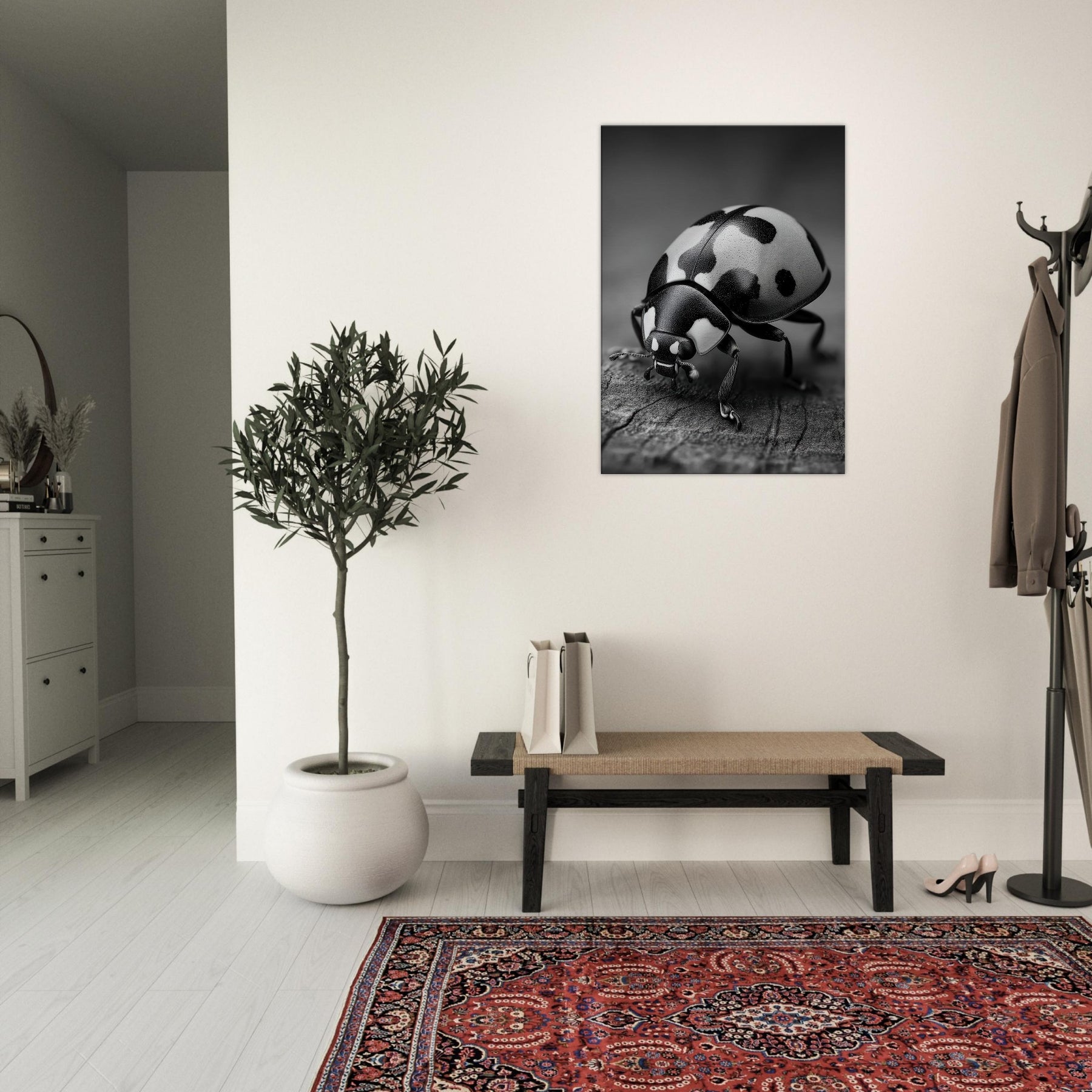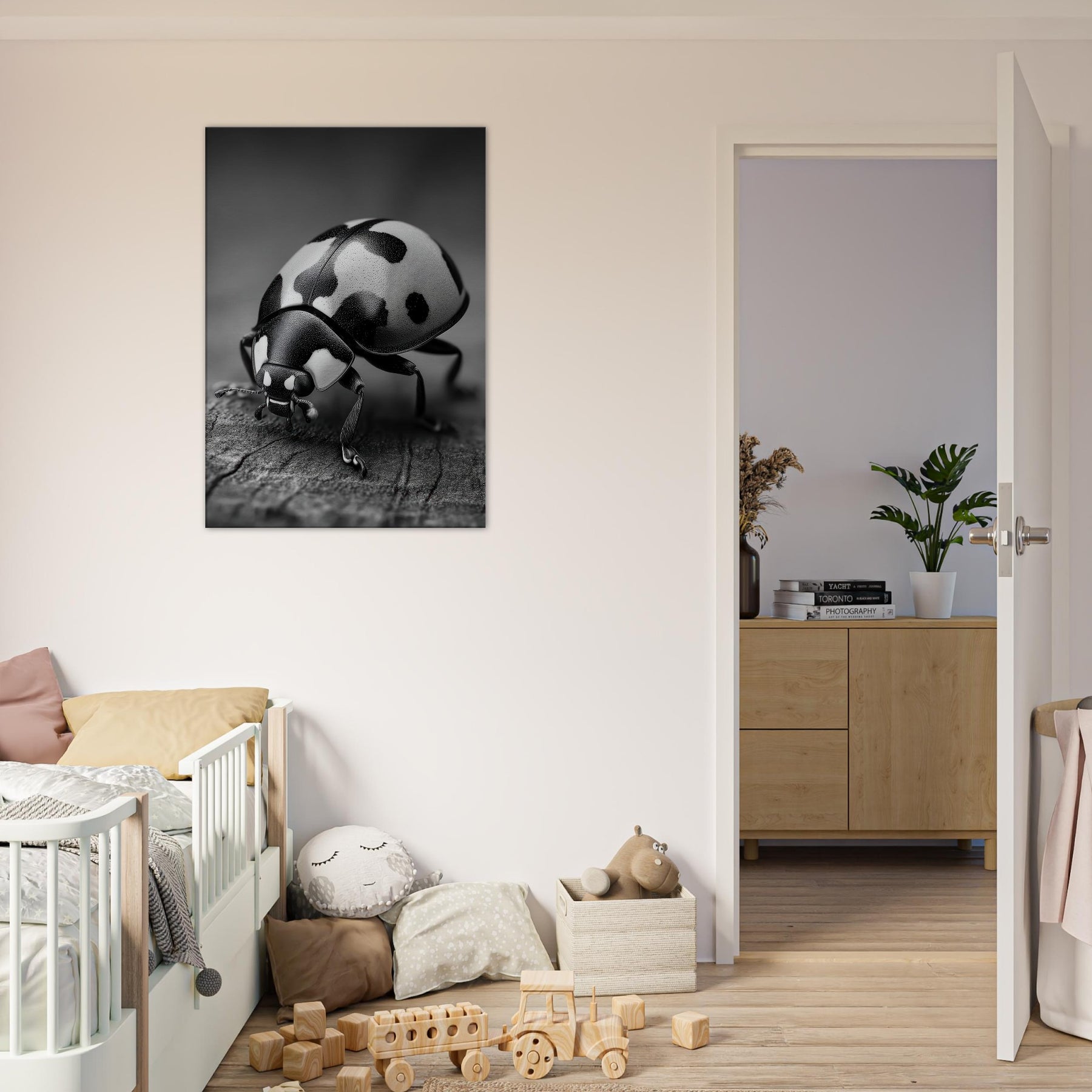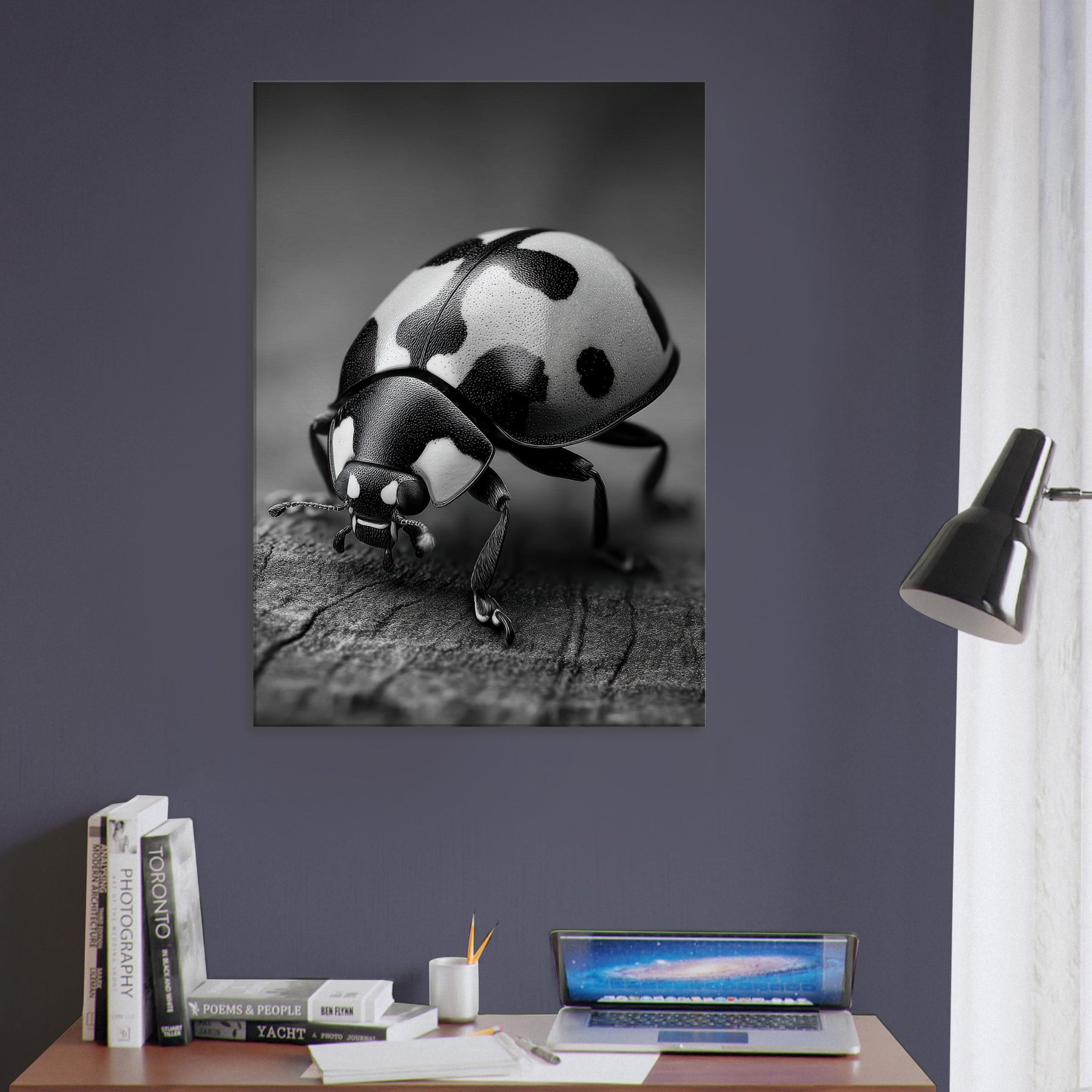 Let the quiet drama of a Ladybug captivate your room with restrained elegance. This black and white study of nature moves beyond color into form and texture, where the beetle's glossy shell becomes a sculpture of light on a textured surface.