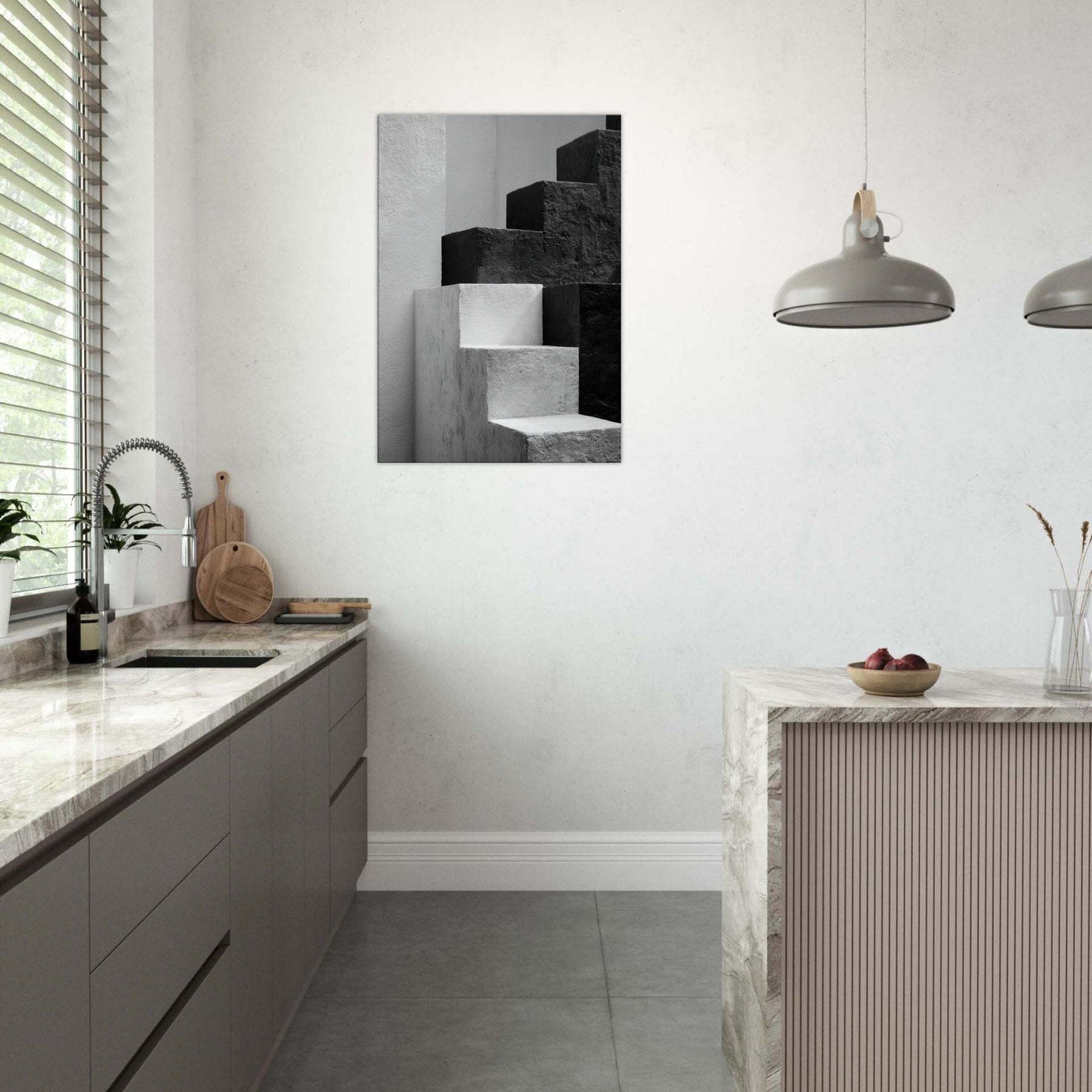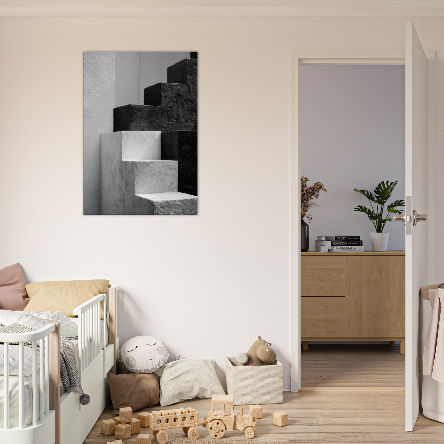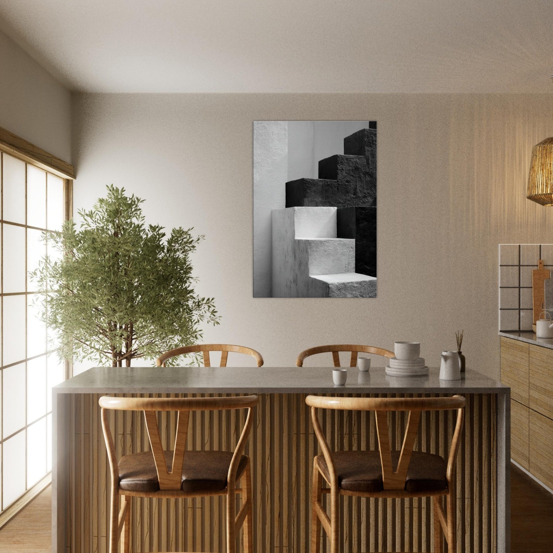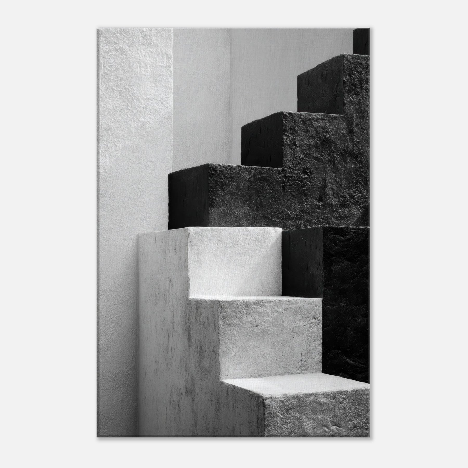 Bauhaus Blocks unfurls as a monochrome study of form and balance, where stacked blocks become silhouettes of faces and bodies in quiet conversation. The stark black and white dialogue invites rest and focus, turning a blank wall into a gallery of light and shade. In a living space, this piece anchors a modern aesthetic with architectural rhythm, guiding the eye along clean edges and tender shadows. It feels timeless, urban, and serene a subtle heartbeat for the room.