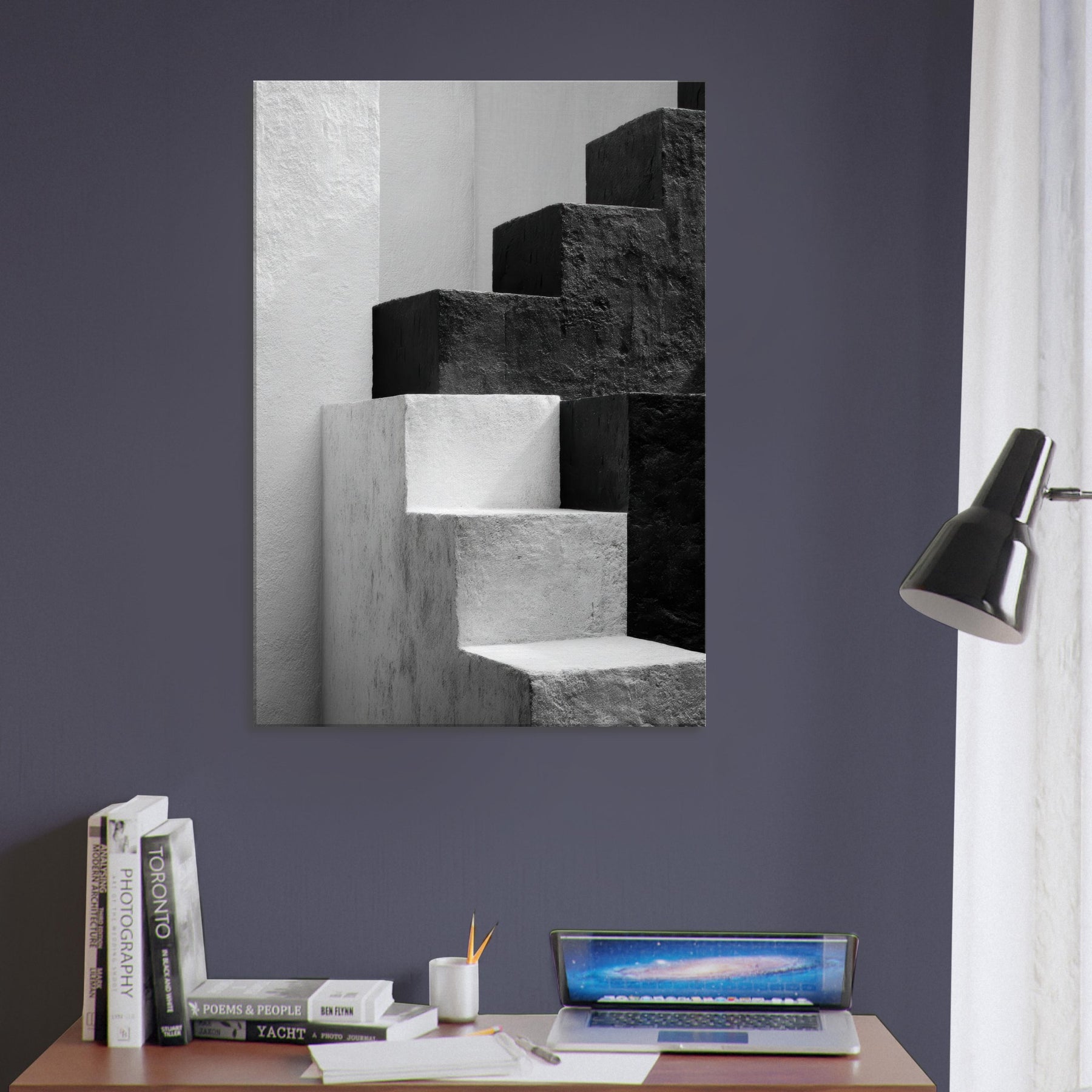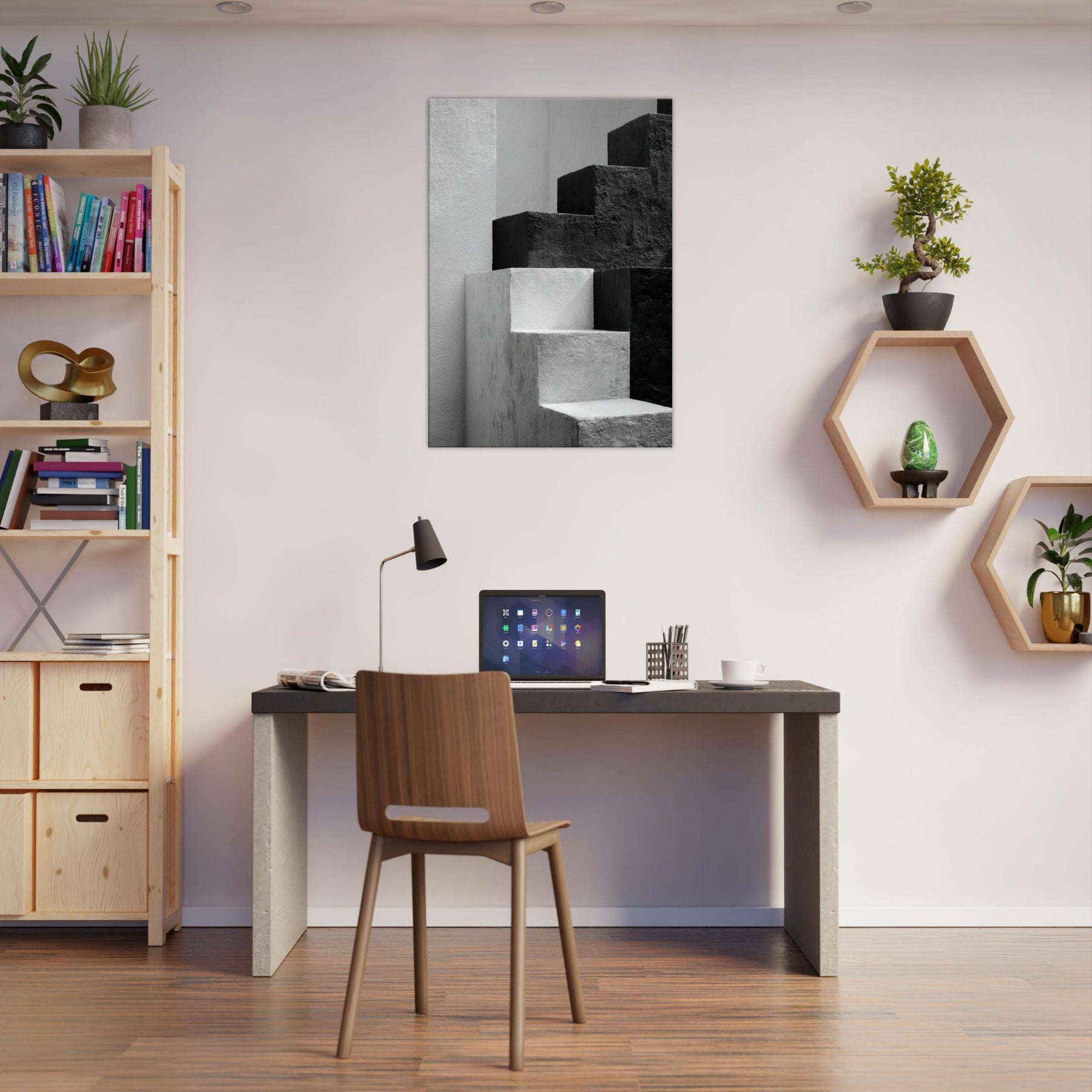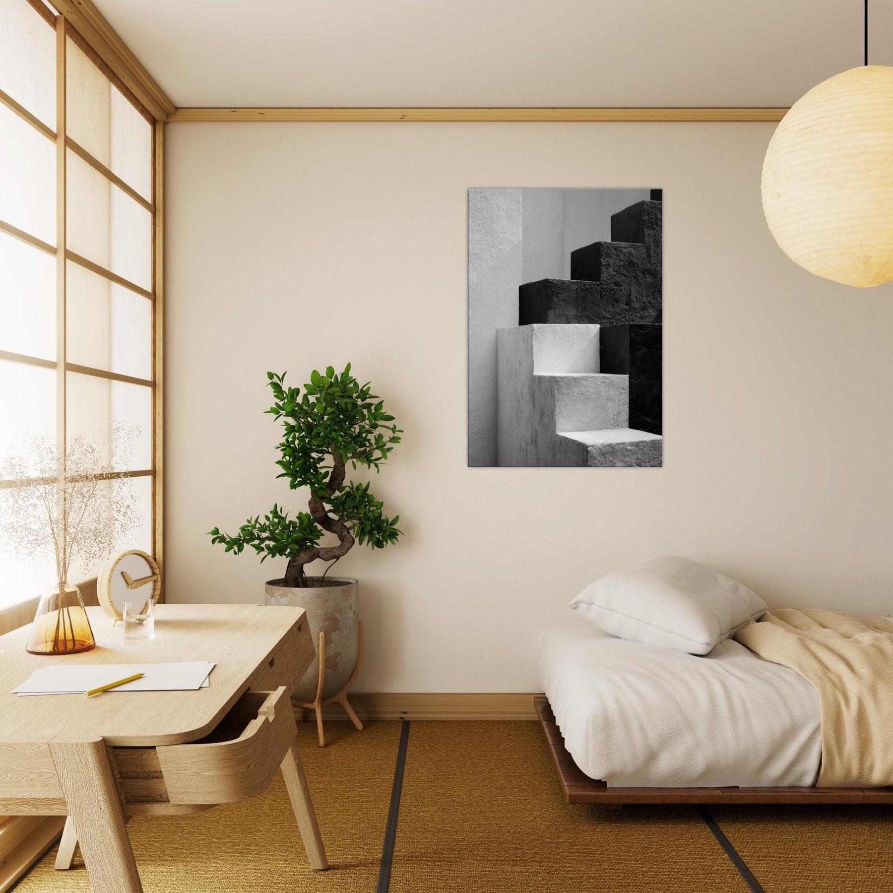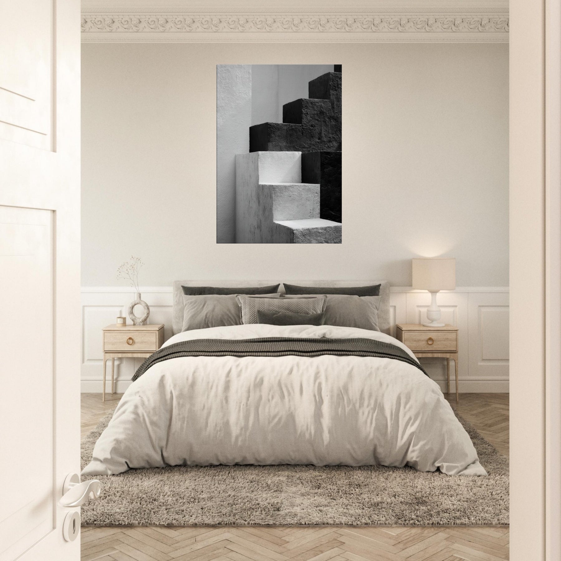Bauhaus Blocks unfurls as a monochrome study of form and balance, where stacked blocks become silhouettes of faces and bodies in quiet conversation. The stark black and white dialogue invites rest and focus, turning a blank wall into a gallery of light and shade. In a living space, this piece anchors a modern aesthetic with architectural rhythm, guiding the eye along clean edges and tender shadows. It feels timeless, urban, and serene a subtle heartbeat for the room.