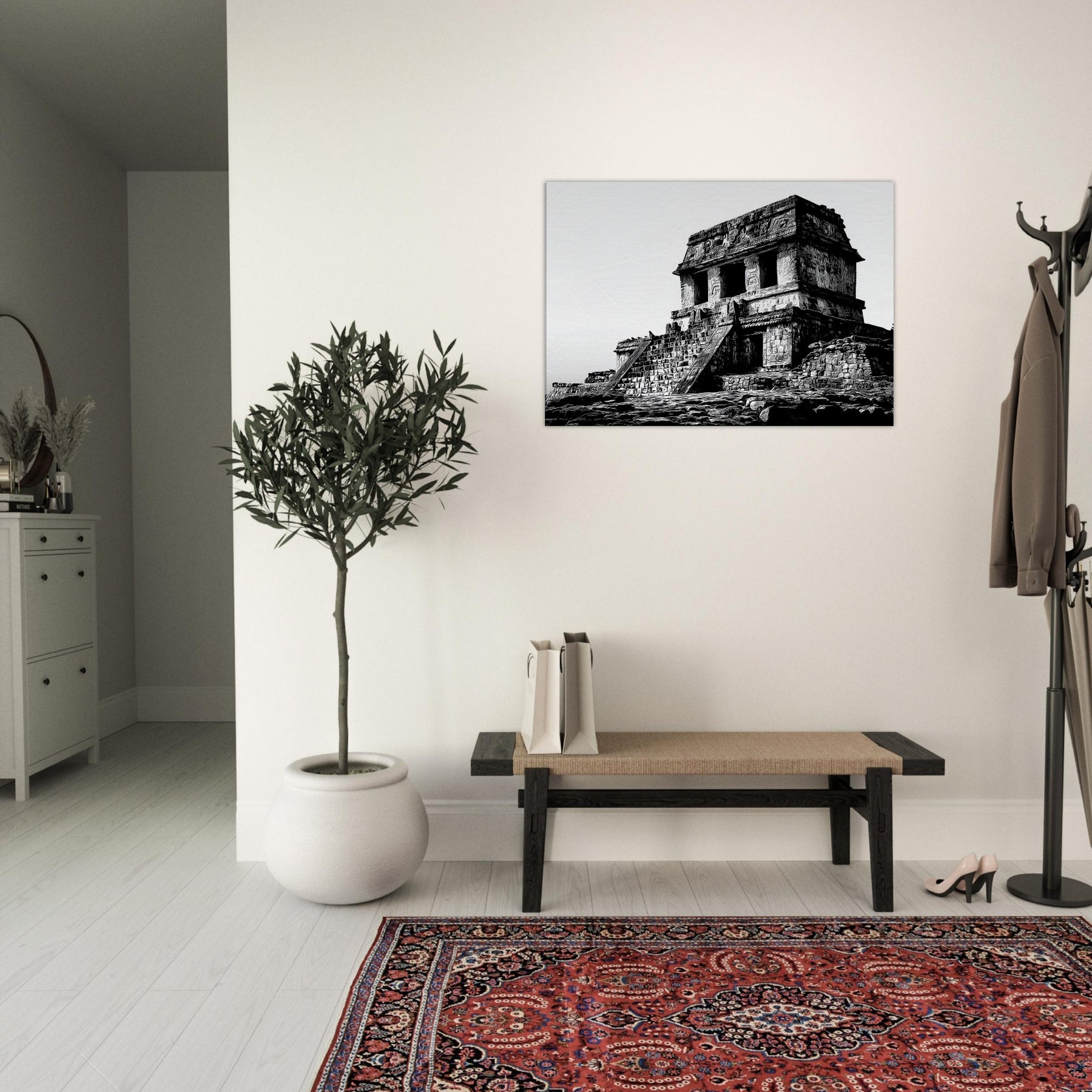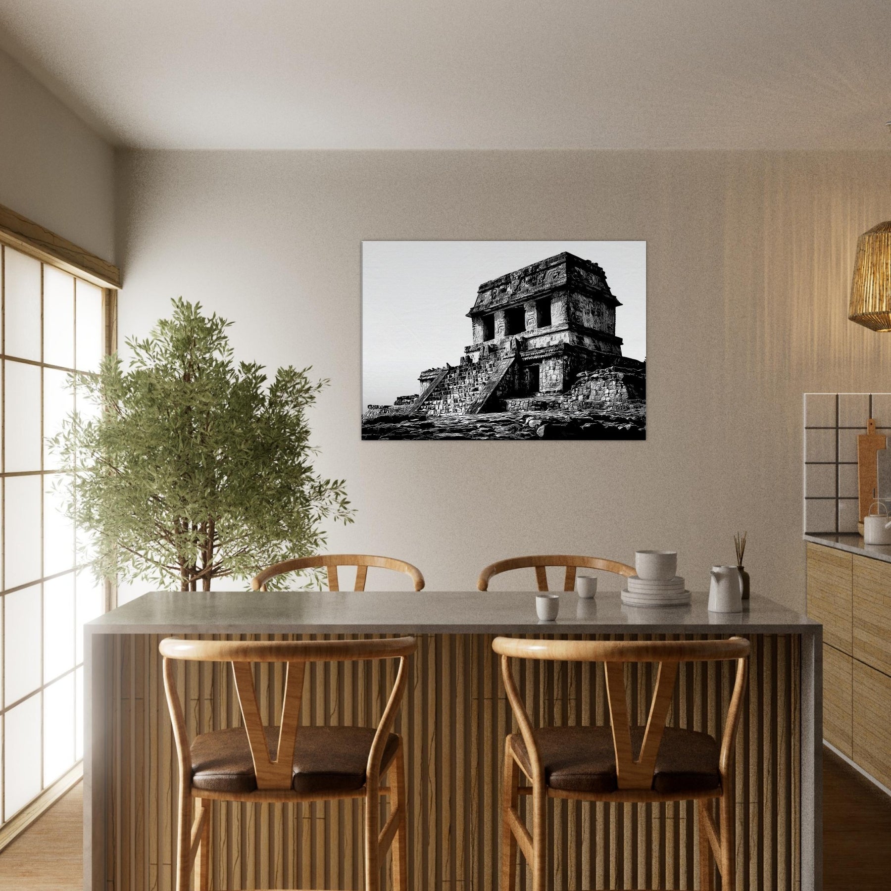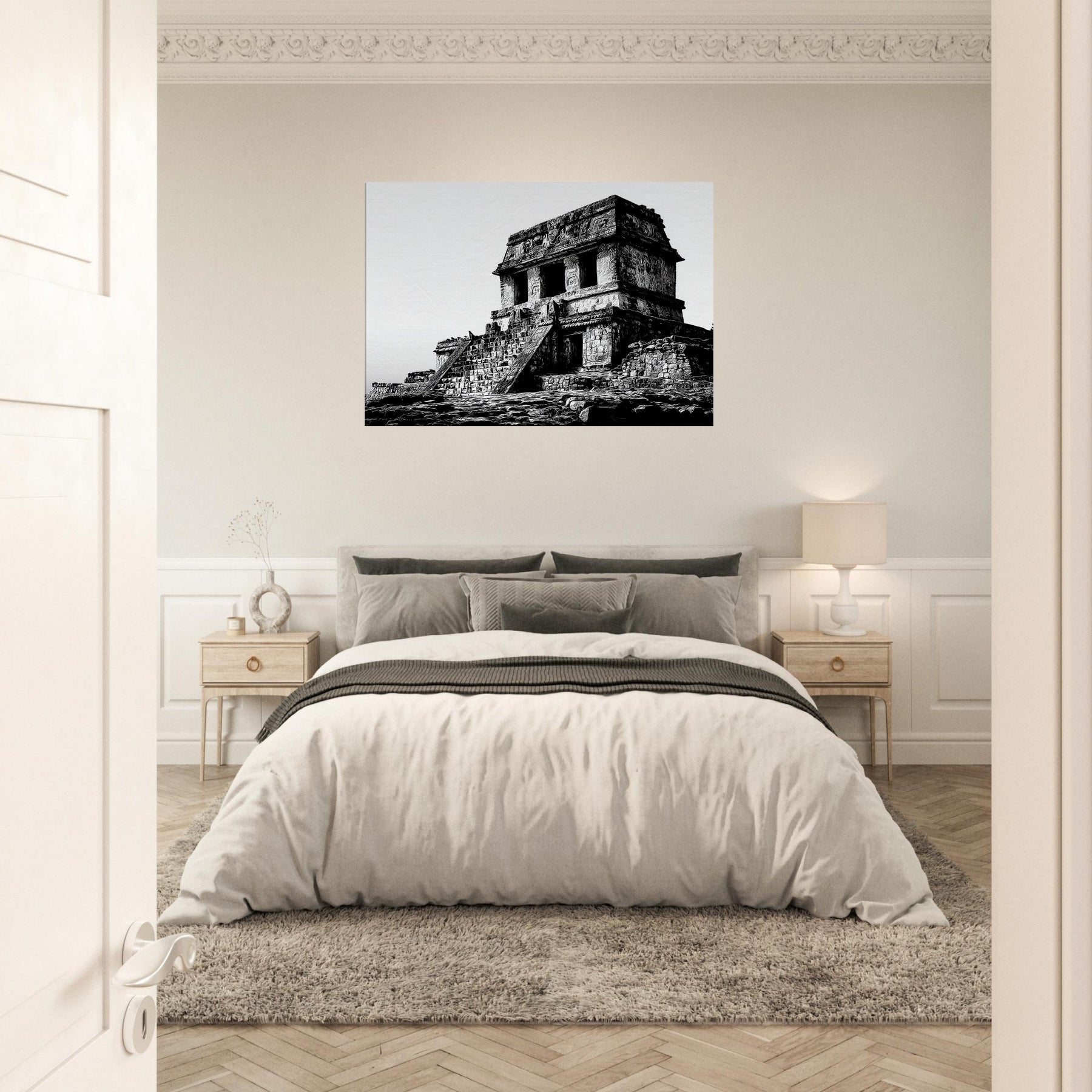Hang it in a living room or study to infuse quiet drama, warmth through texture, and a sense of timeless wonder. The atmosphere of the temple complex translates into everyday elegance, encouraging slow contemplation and sophisticated contrast in any space.