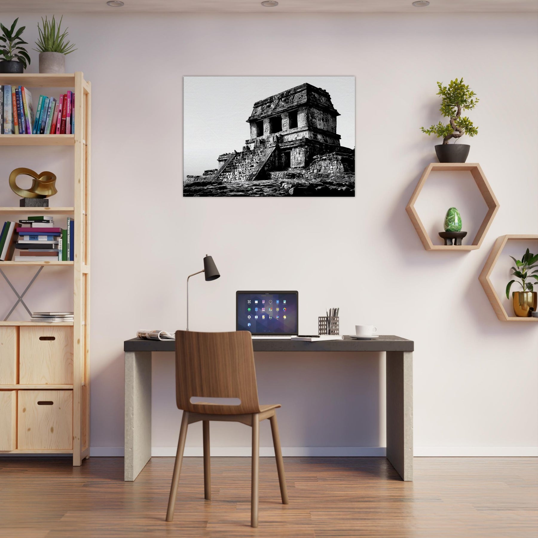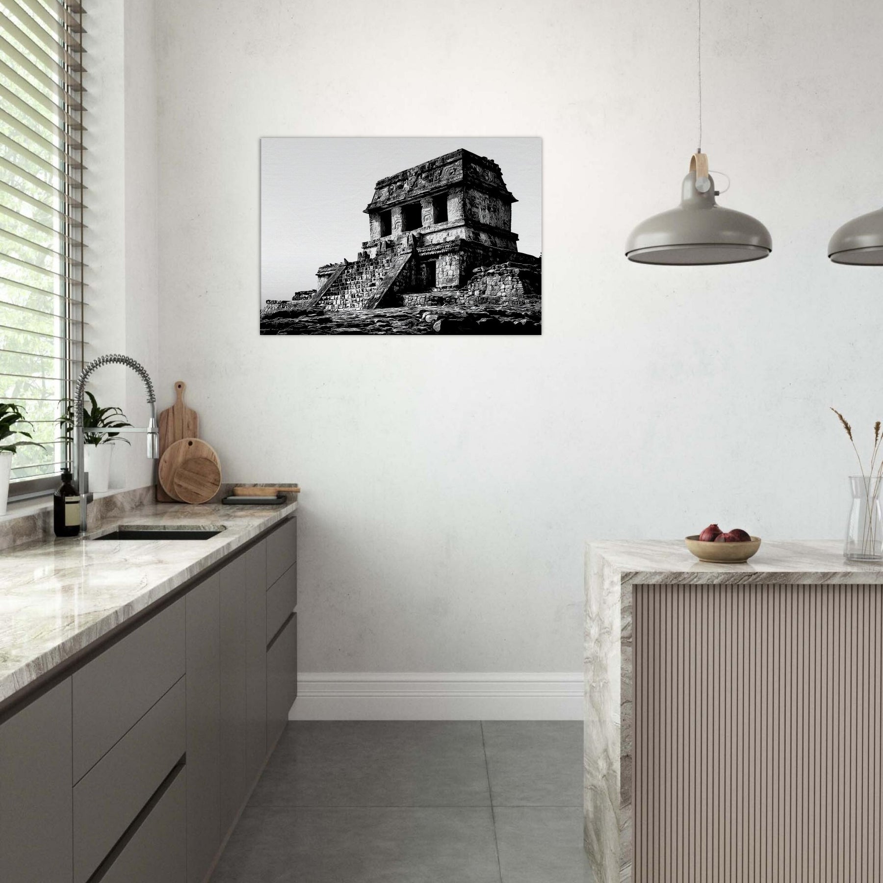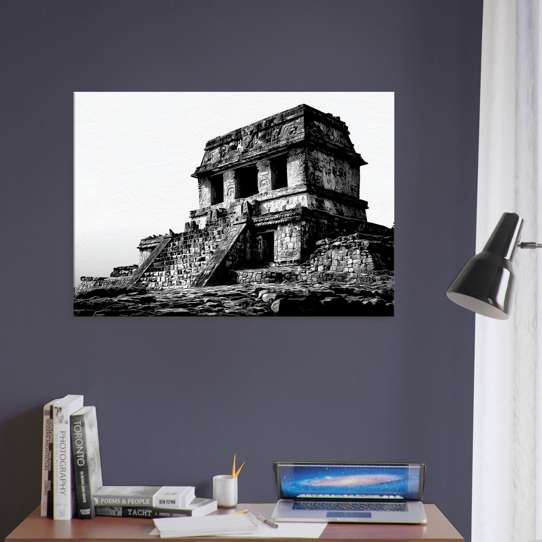 Hang it in a living room or study to infuse quiet drama, warmth through texture, and a sense of timeless wonder. The atmosphere of the temple complex translates into everyday elegance, encouraging slow contemplation and sophisticated contrast in any space.