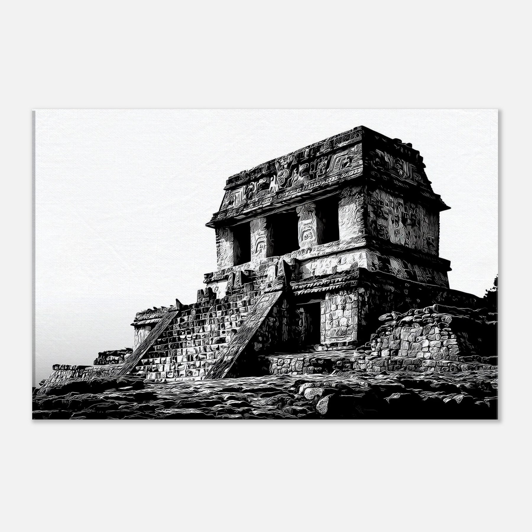 Mayan Temples rise in stark silhouette, inviting the eye to wander the tension between light and stone. This black and white portrayal captures the ritual symmetry and enduring craft of ancient stairways, turning the past into a mindful focal point.