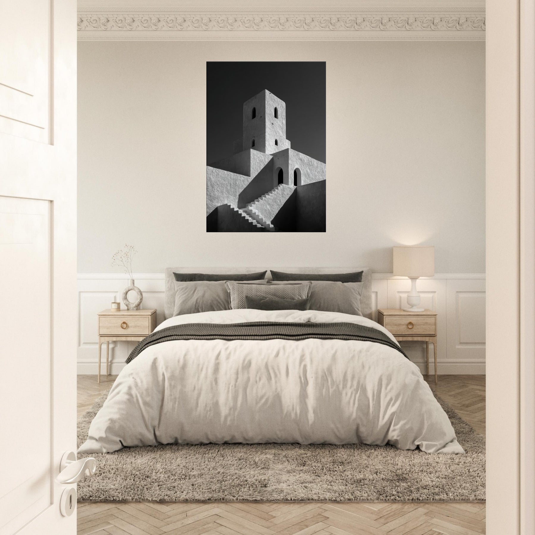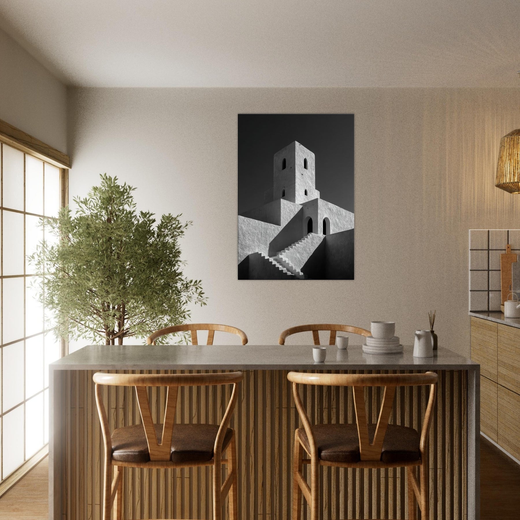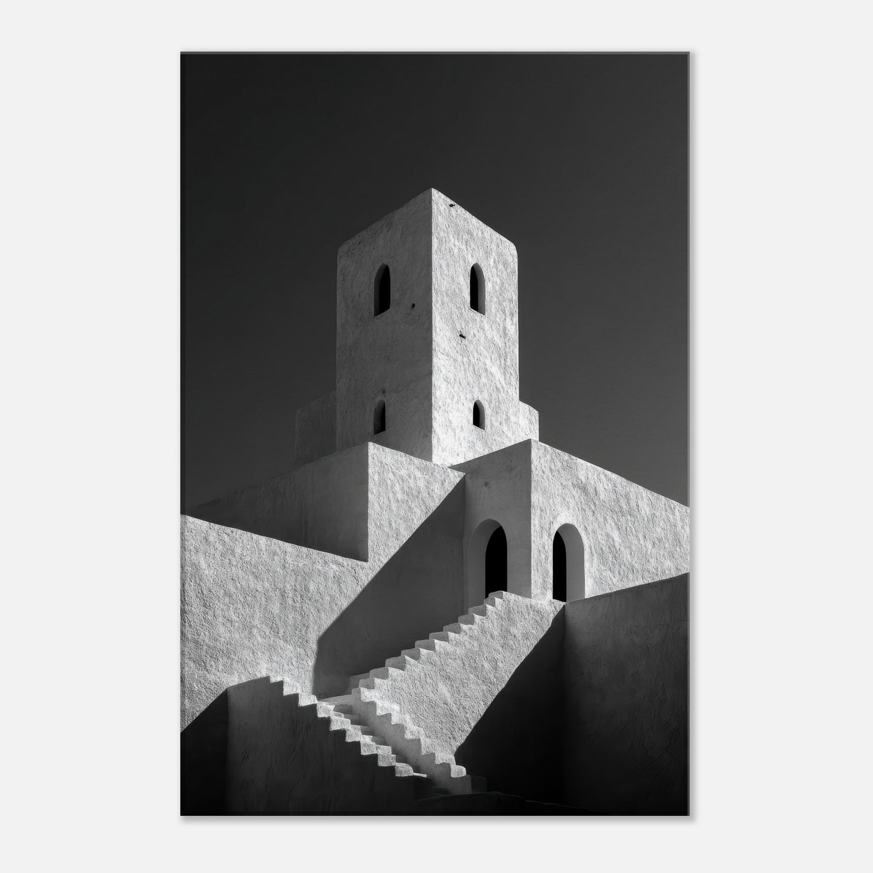 The texture of plaster and the stark contrast of black and white invite calm, focused contemplation, turning any living space into a quiet pavilion. Place this piece where morning sun dances across the facade or where evening lamps soften the angles, and let the city’s serene geometry set the mood.