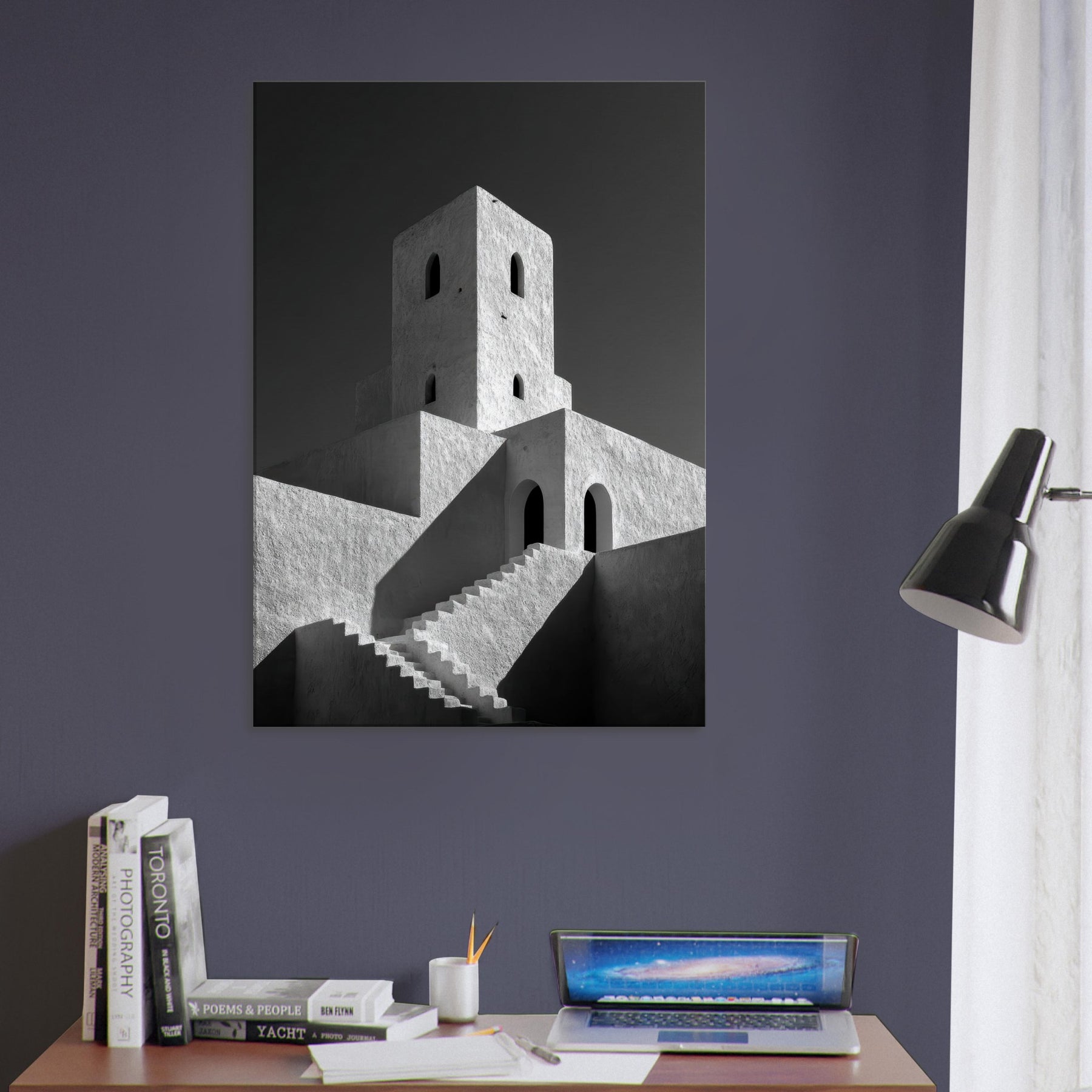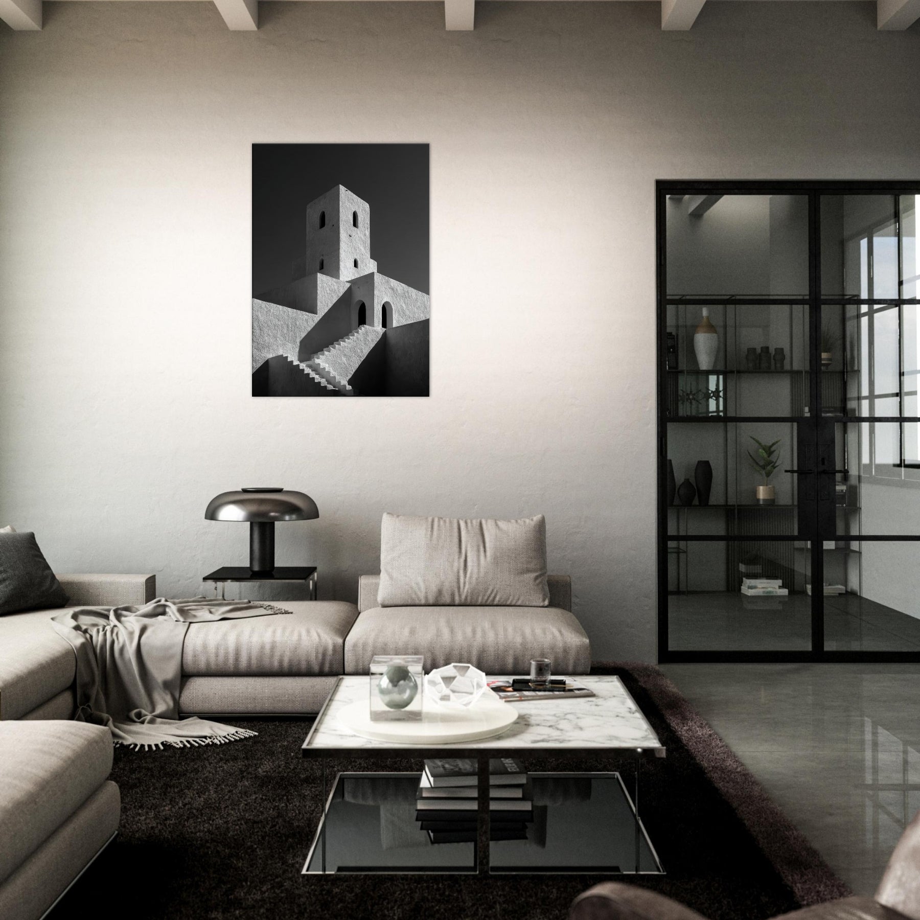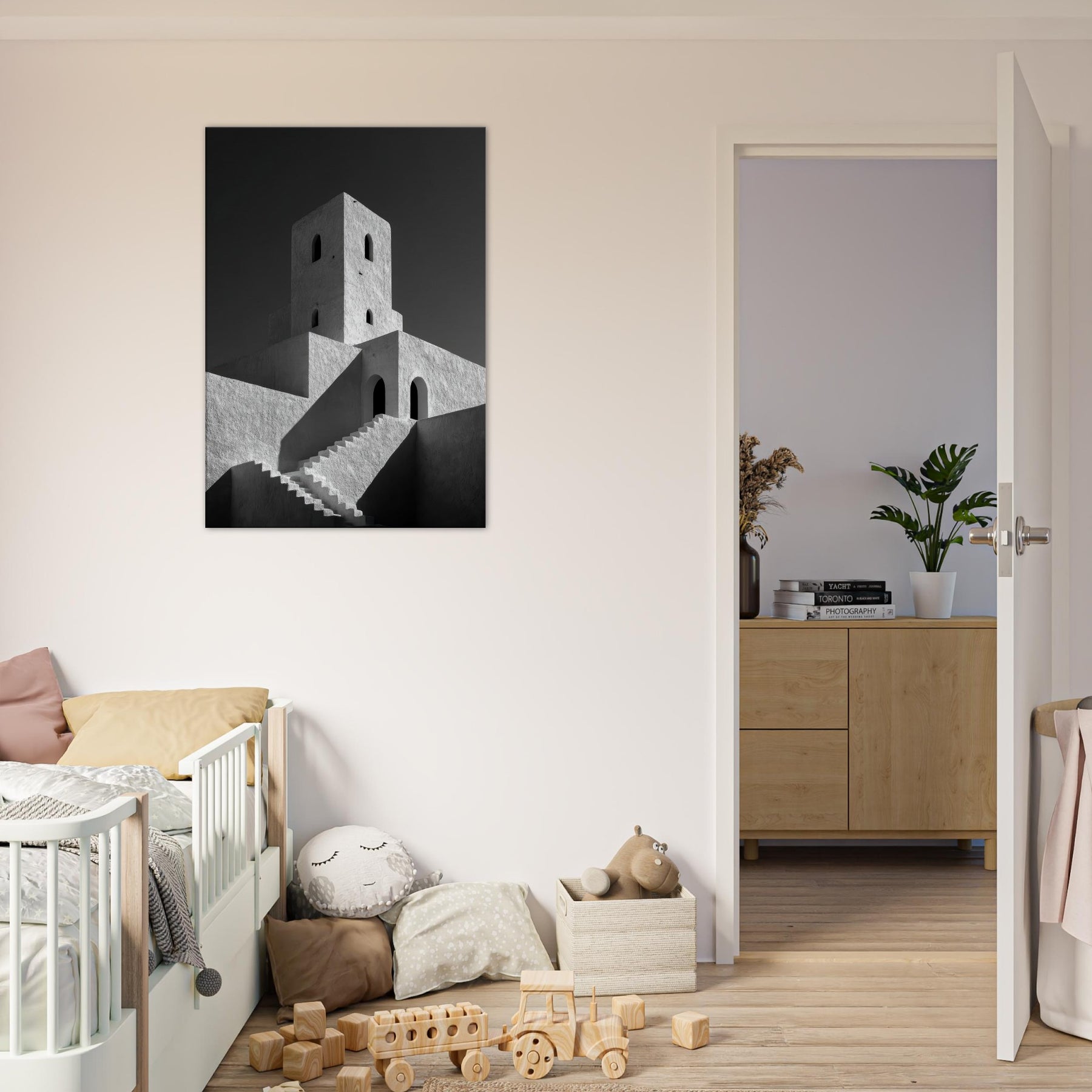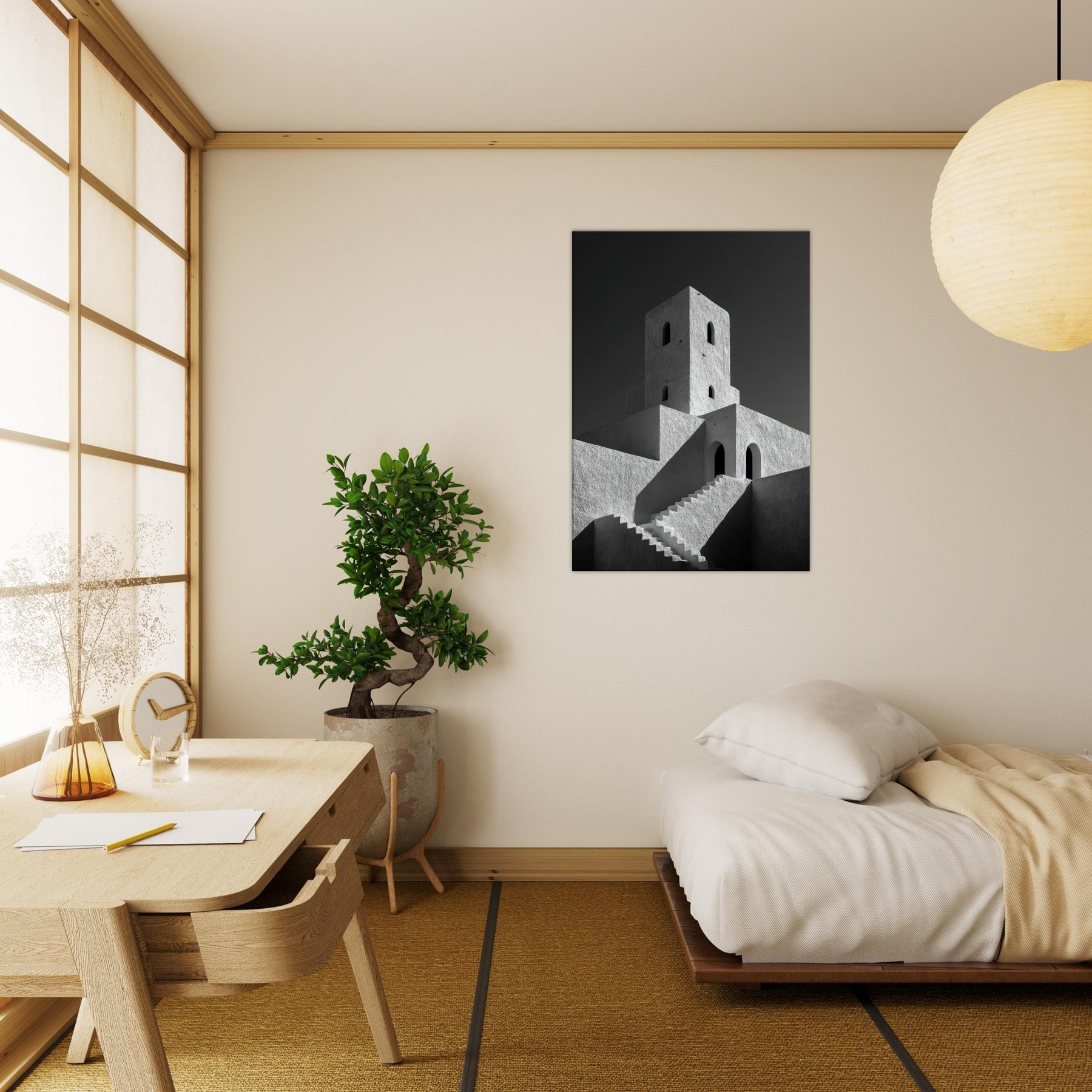 The texture of plaster and the stark contrast of black and white invite calm, focused contemplation, turning any living space into a quiet pavilion. Place this piece where morning sun dances across the facade or where evening lamps soften the angles, and let the city’s serene geometry set the mood.