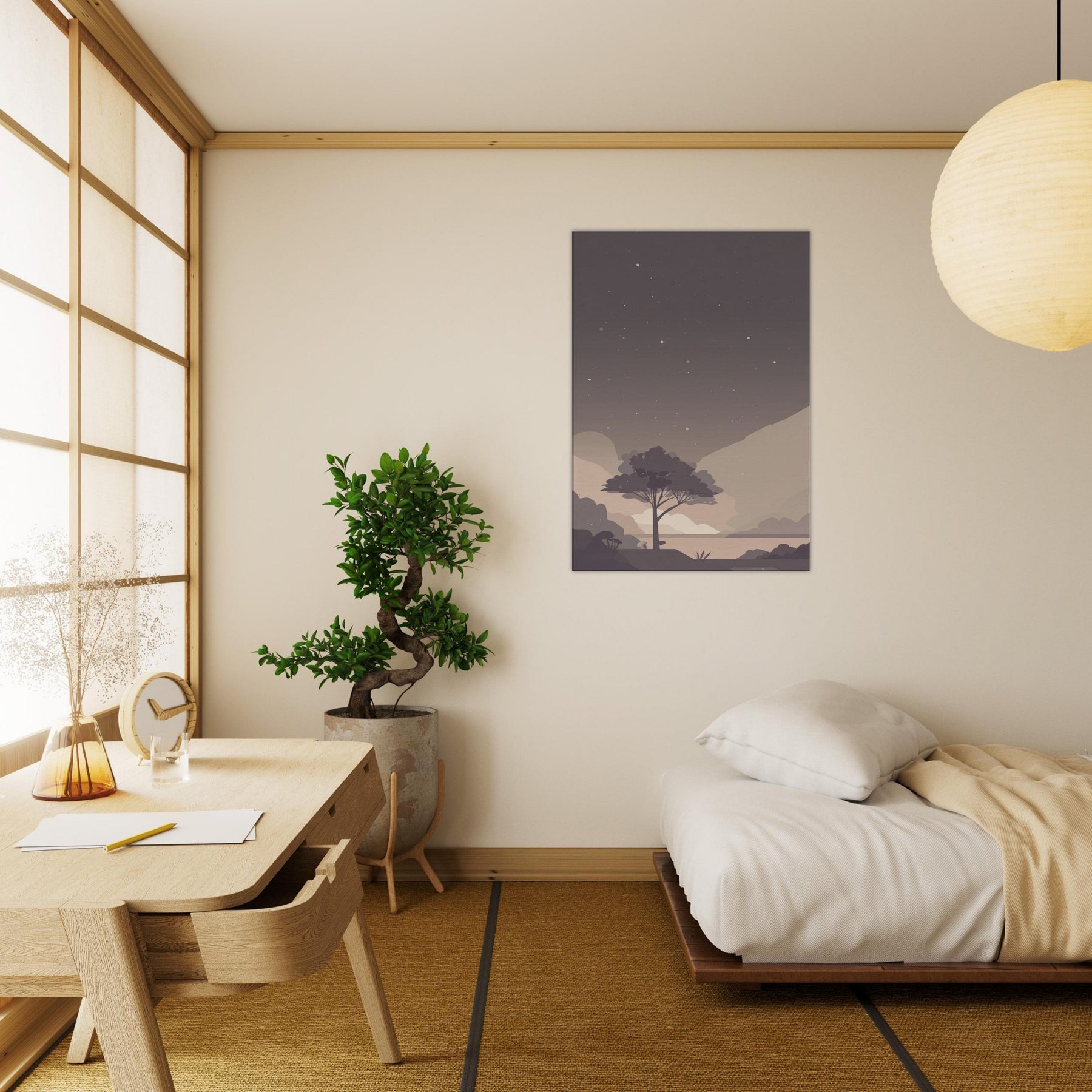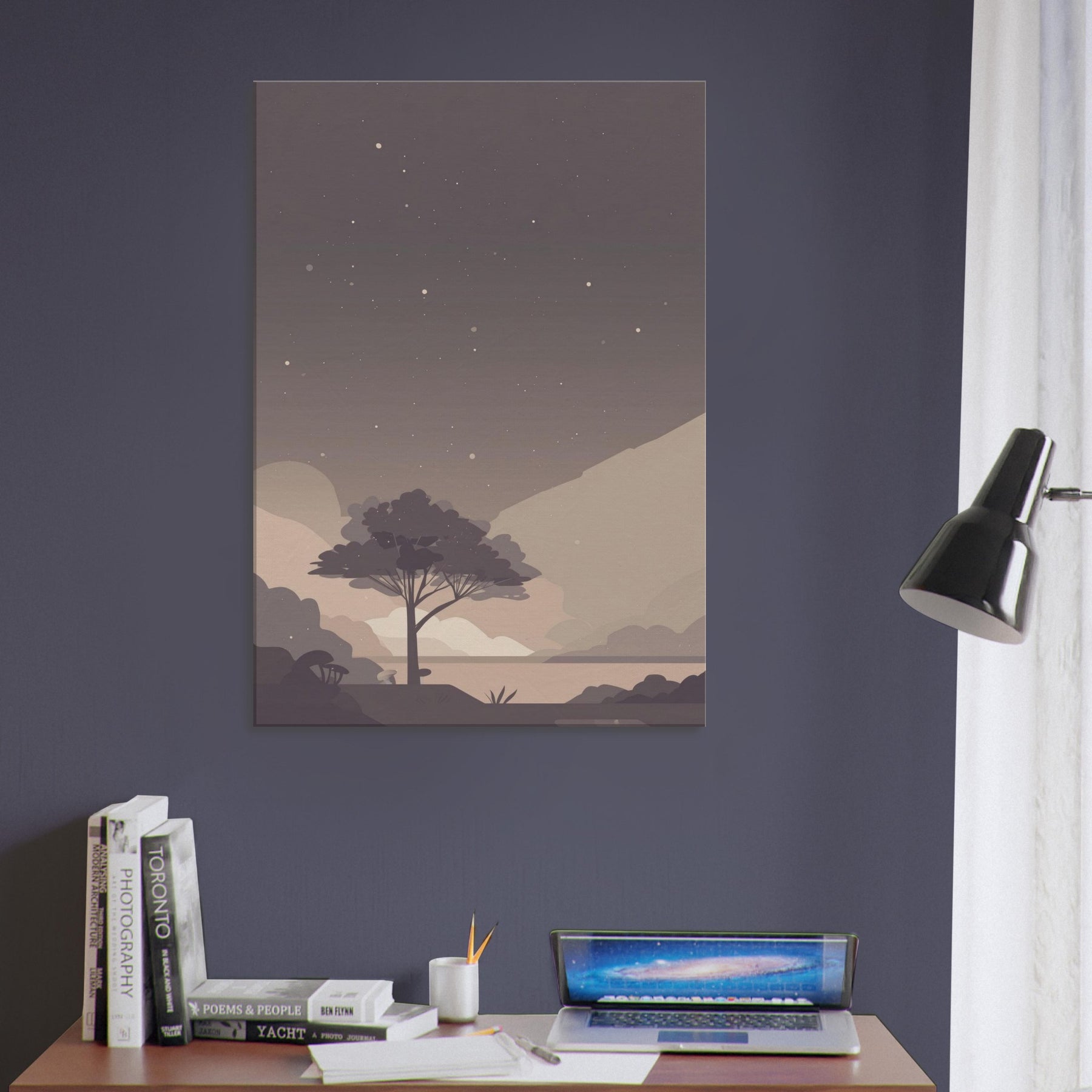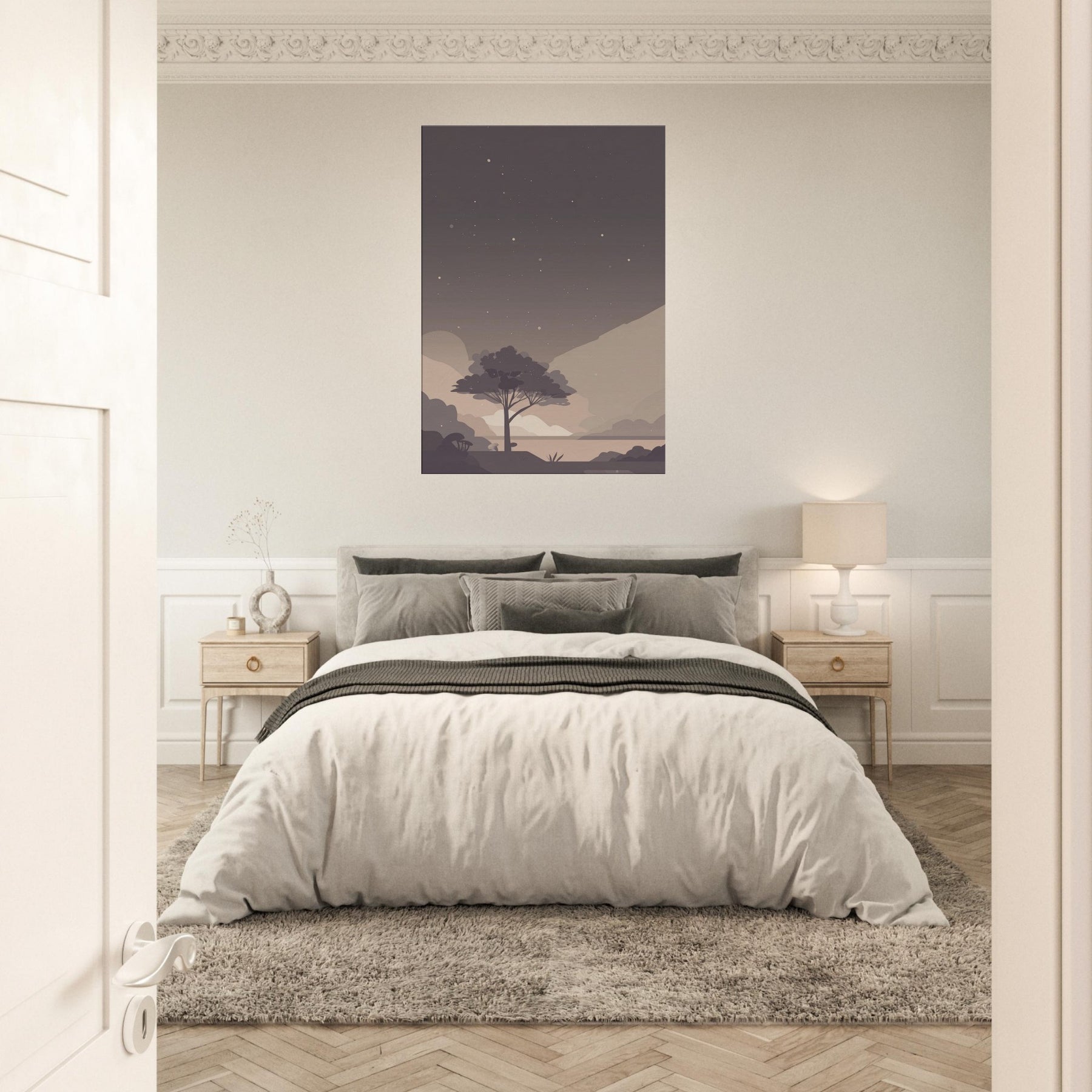 Starry Night Minimalist Wall Art invites the quiet of a clear evening into your living space. A single, graceful tree anchors a vast, velvet sky speckled with gentle stars, rendered in soft, tonal gradients that glow with restraint. The composition folds space and light into a calm horizon, creating a focal point that soothes the mind and lowers the room’s tempo. Perfect for a serene nook or above a sofa, it brings nature’s hush and cinematic distance to daily life, without overwhelming the senses.