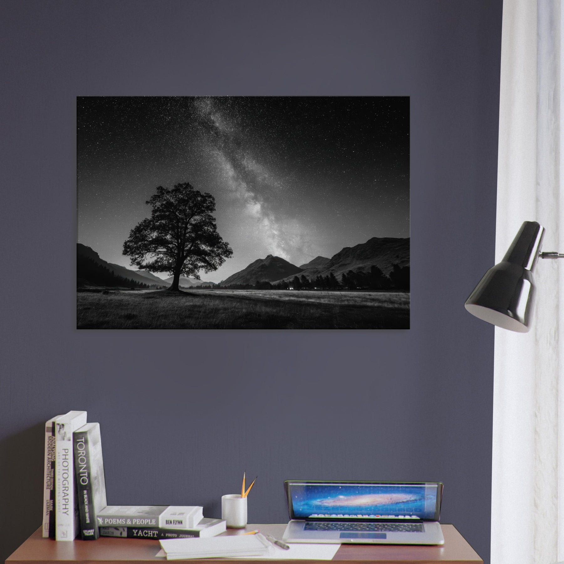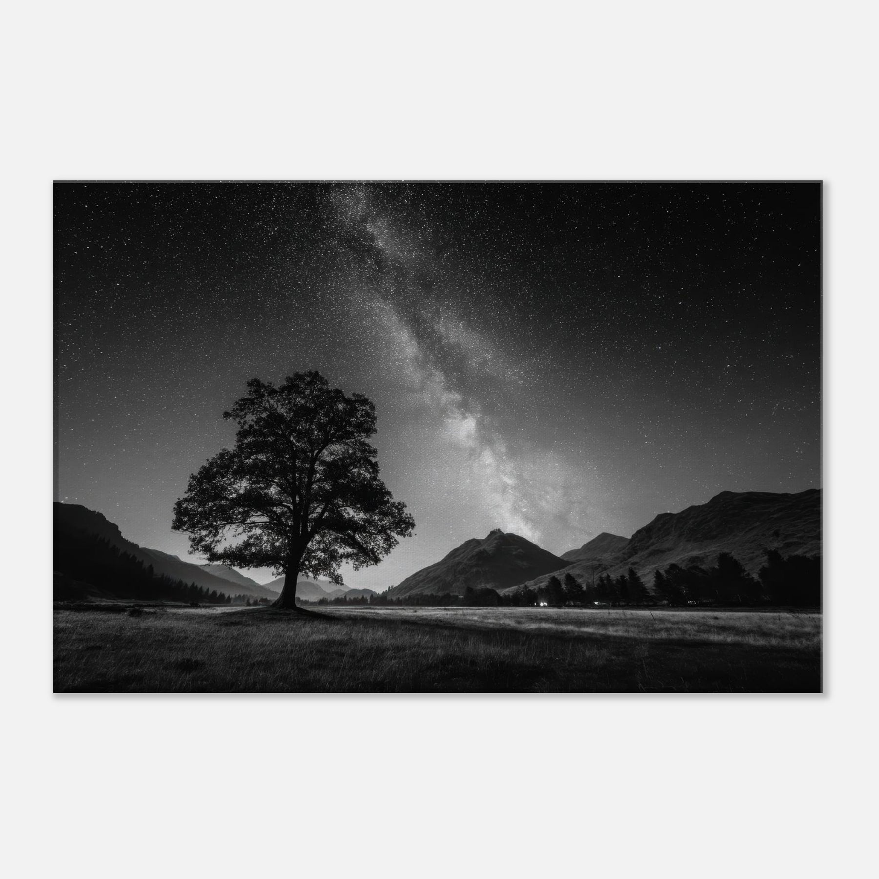 Starry Night invites quiet wonder into your living space, a black and white meditation where a solitary tree anchors a vast, star kissed valley. The Milky Way spills across the heavens in soft grayscale, while distant mountains absorb the night's hush. This piece folds the outdoors into your room, wrapping walls in mood and timeless stillness that heightens conversation and pause alike. Perfect for a calm gallery wall or a cozy reading nook, it makes every evening feel expansive and deeply restful.