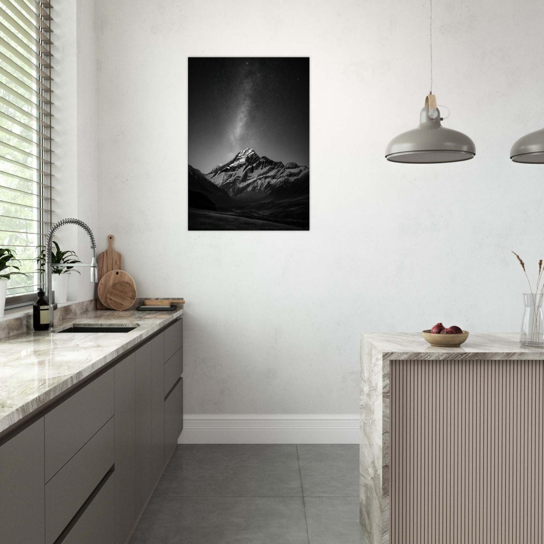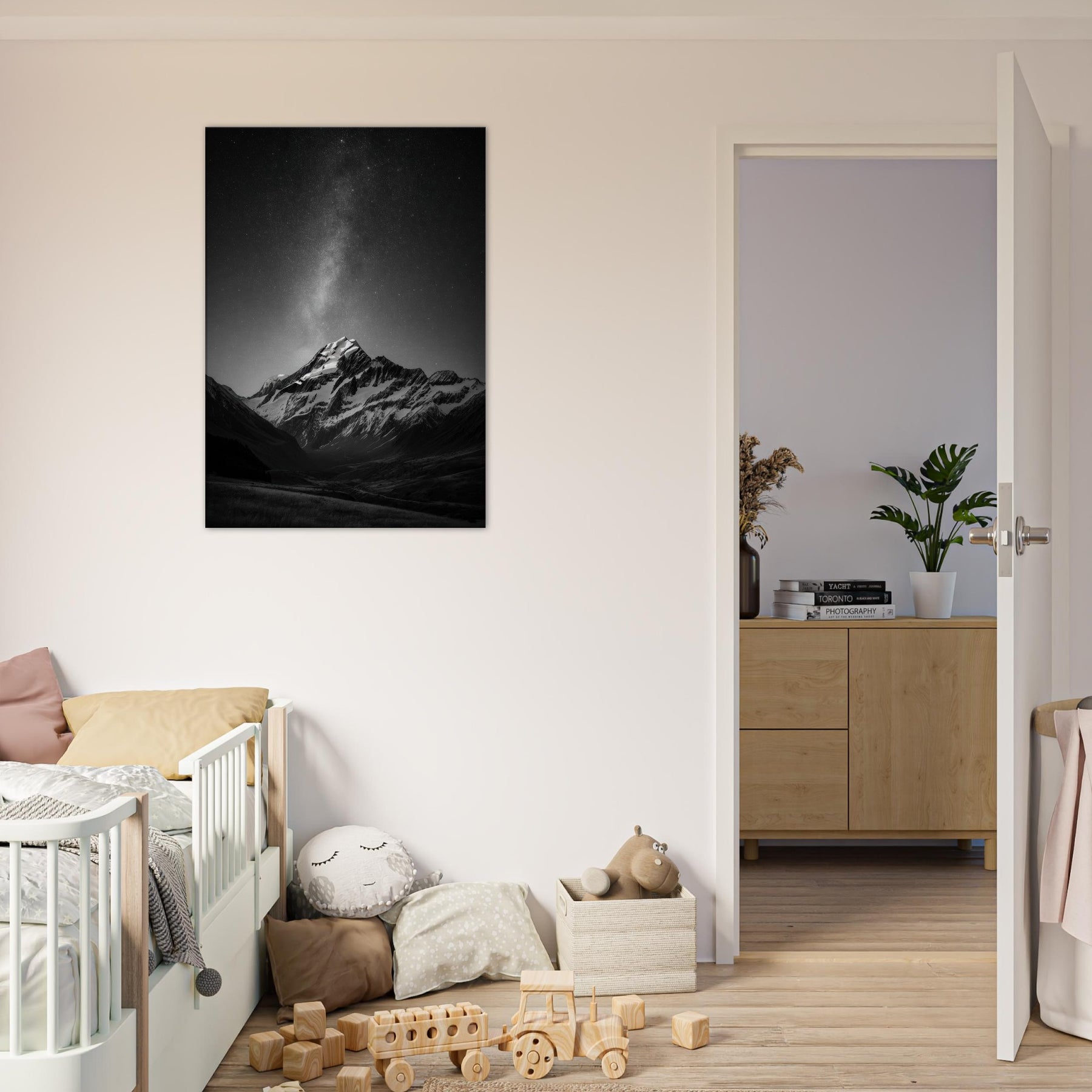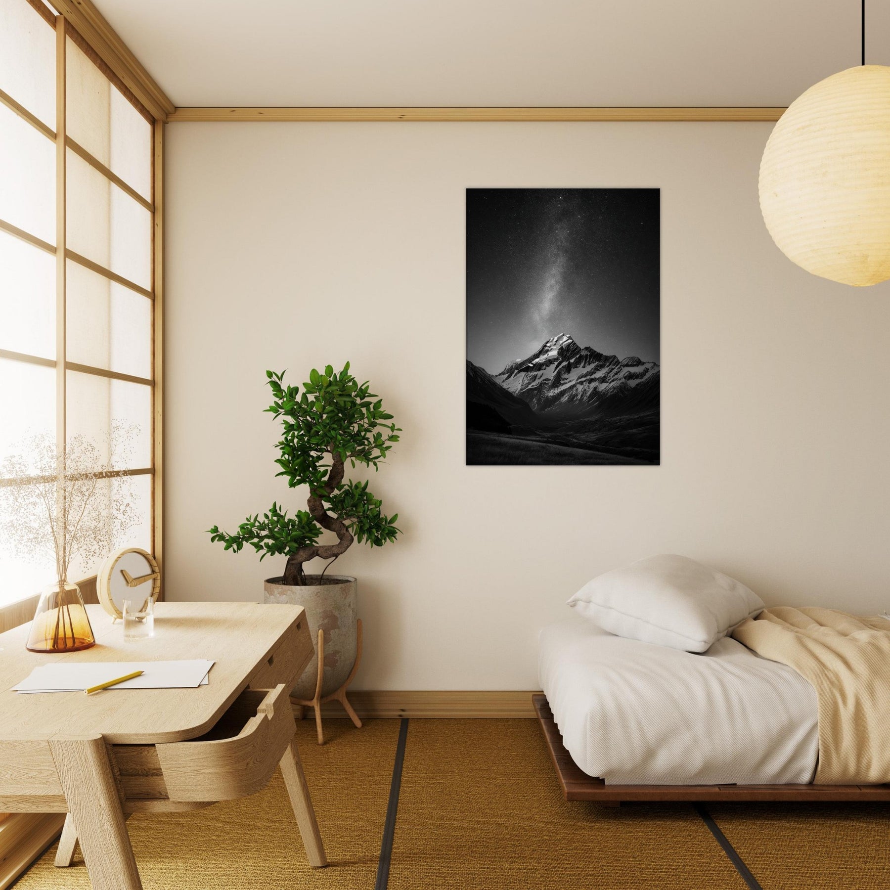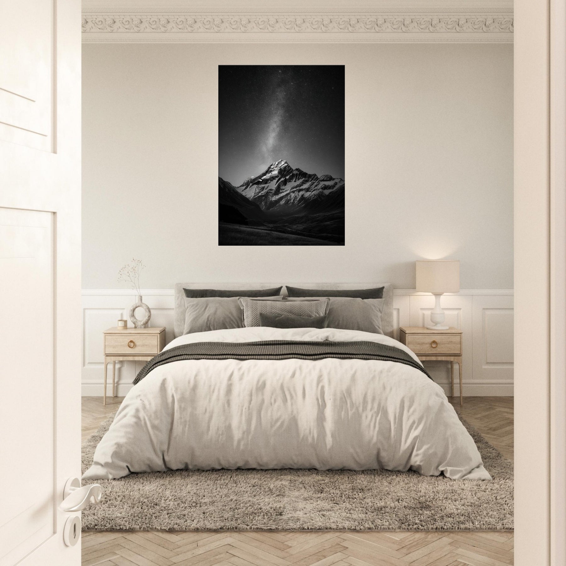 This black and white invites quiet reflection, as if each star were a breath stirred by the mountains' ancient stillness. The tonal grade and sculpted shadows make the room feel larger, calmer, and more cinematic - a timeless backdrop for living rooms, bedrooms, or study nooks. A refined, nature inspired centerpiece that elevates everyday moments into quiet reverie.