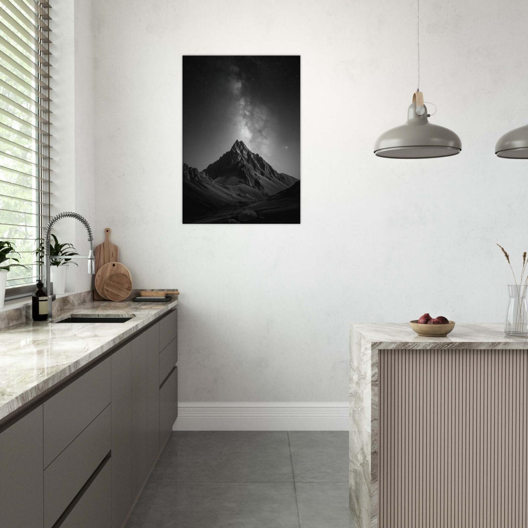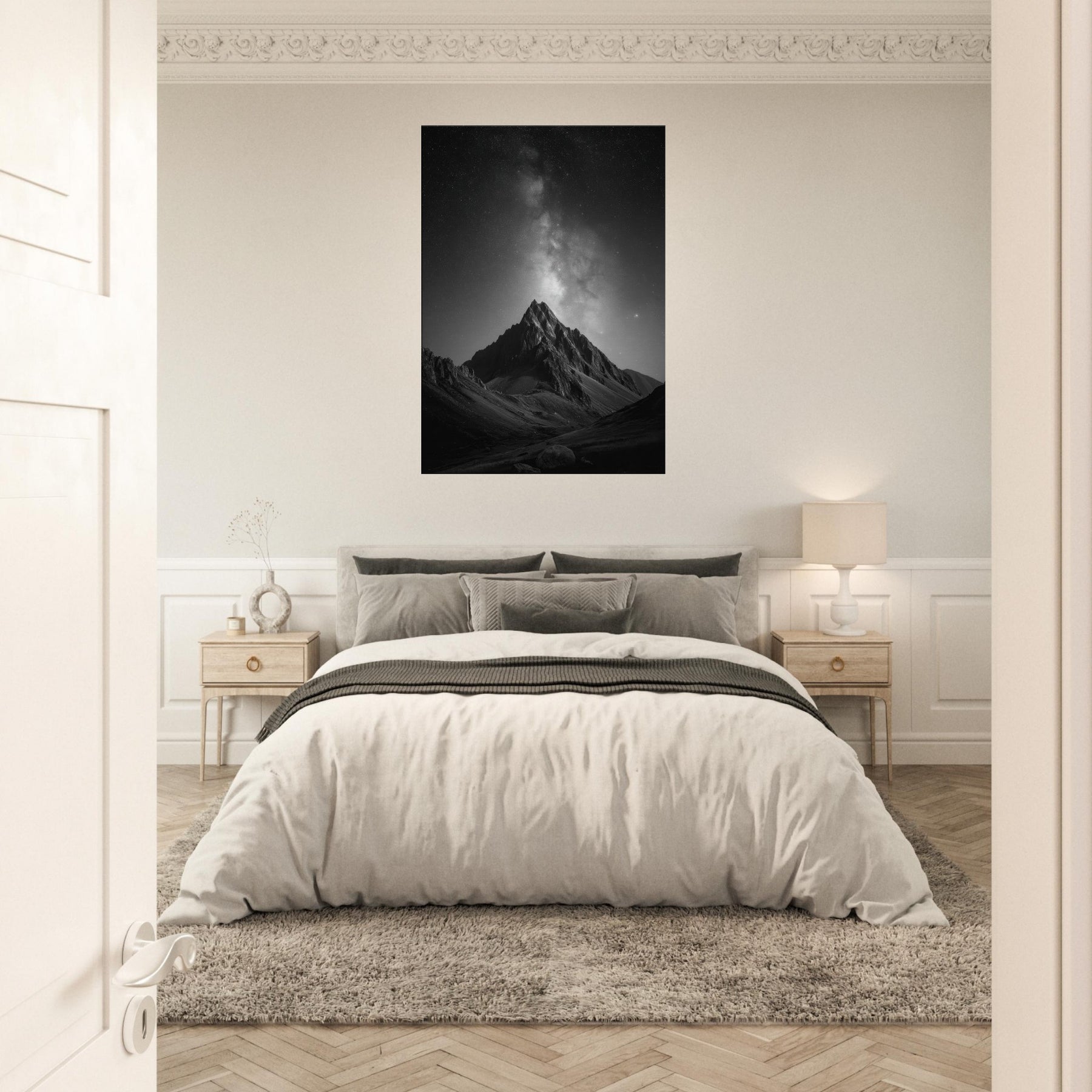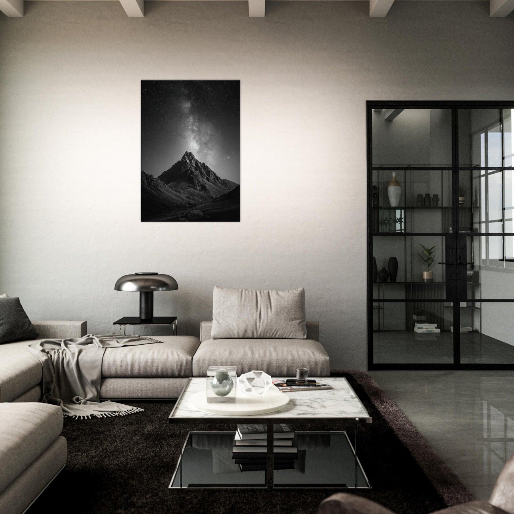 The composition invites contemplation, turning any wall into a window to the high alpine night. Place it in a living room, study, or foyer to anchor a calm, cinematic mood and spark conversations about distance, memory, and the vast beauty of nature.
