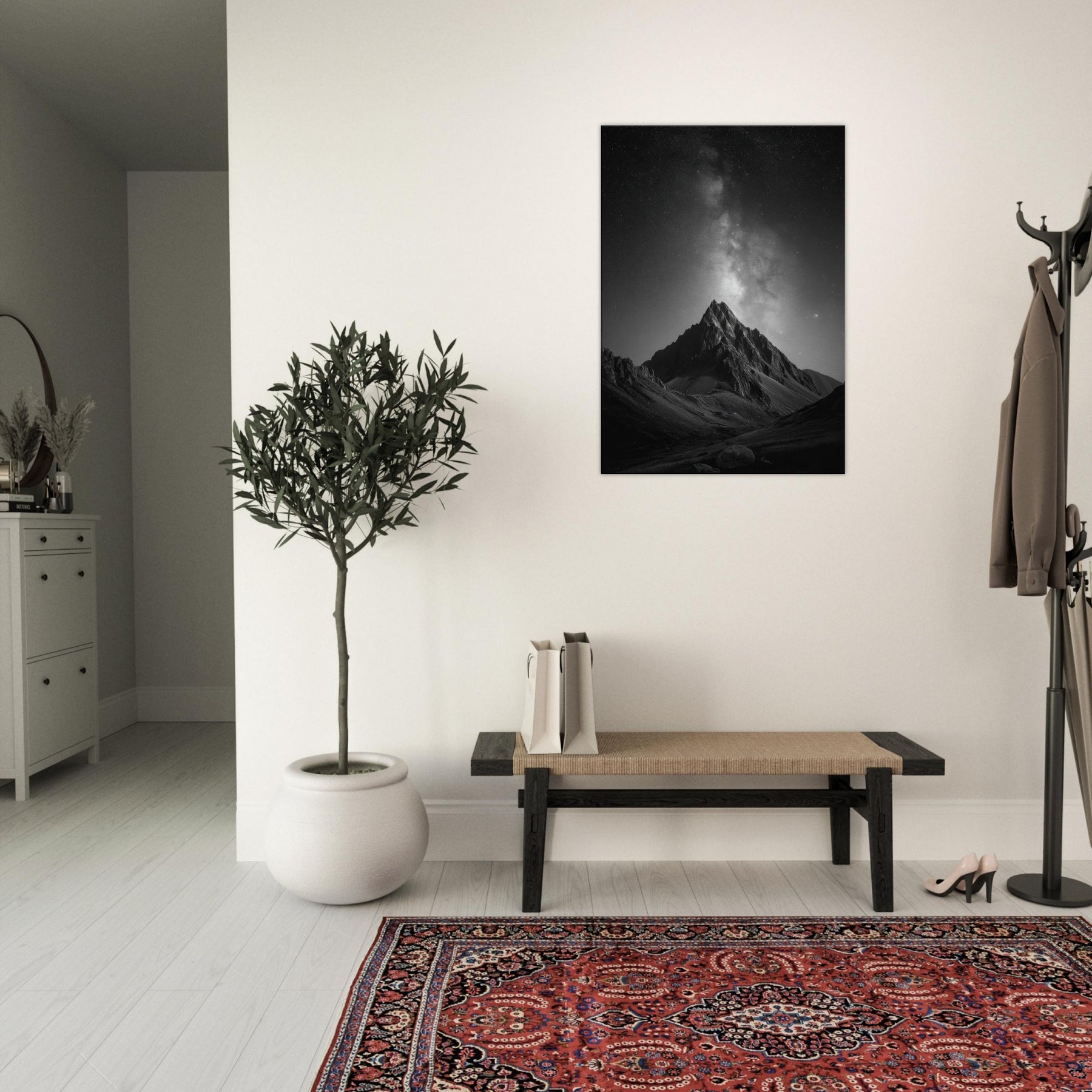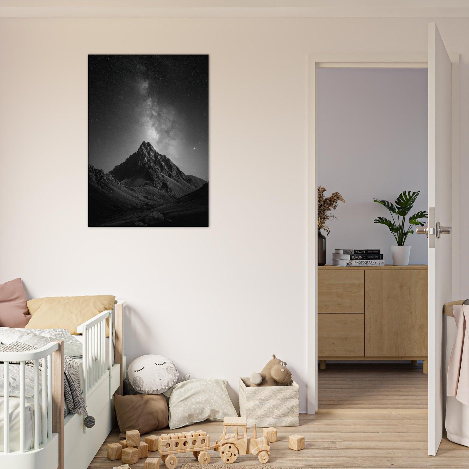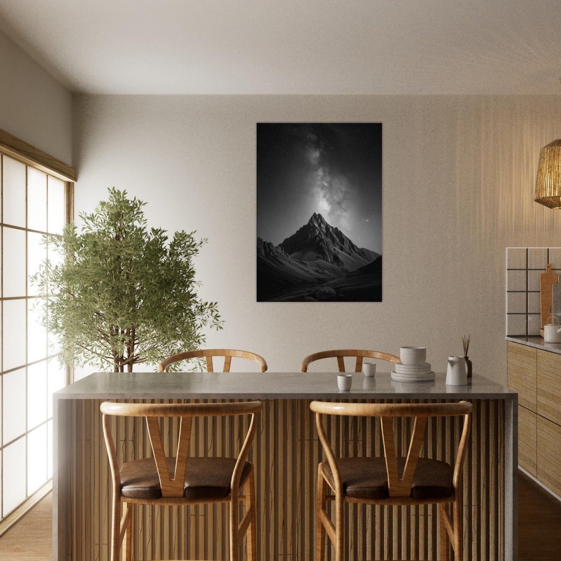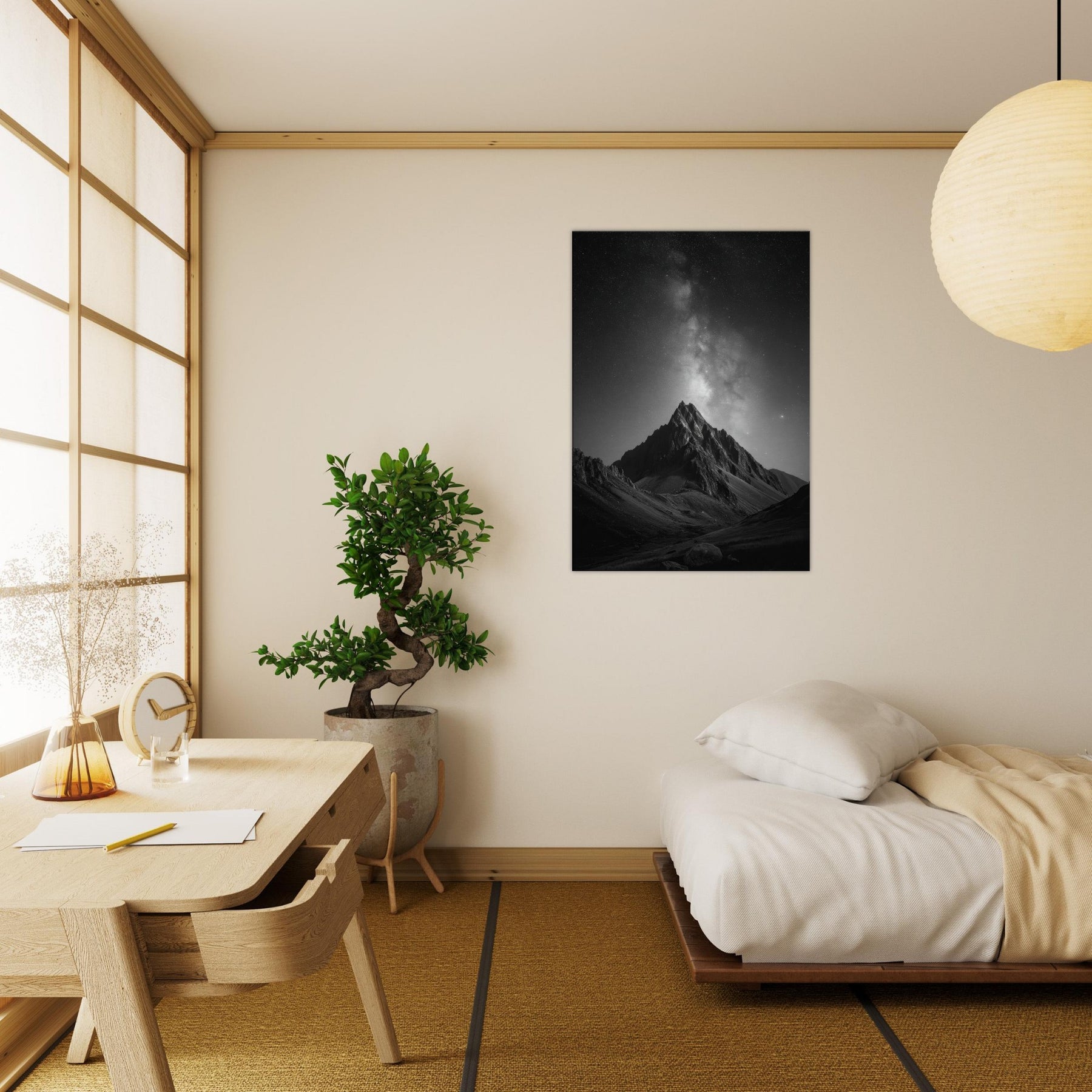 The composition invites contemplation, turning any wall into a window to the high alpine night. Place it in a living room, study, or foyer to anchor a calm, cinematic mood and spark conversations about distance, memory, and the vast beauty of nature.