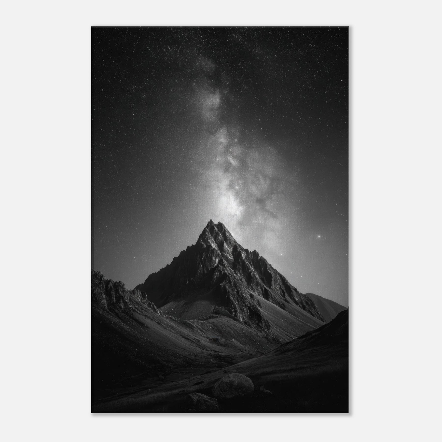 Starry Night rises in monochrome, where jagged peaks cradle an endless velvet sky. This Black And White photograph arouses quiet awe crisp edges, soft shadows, a hush of starlight that seems nearly audible.
