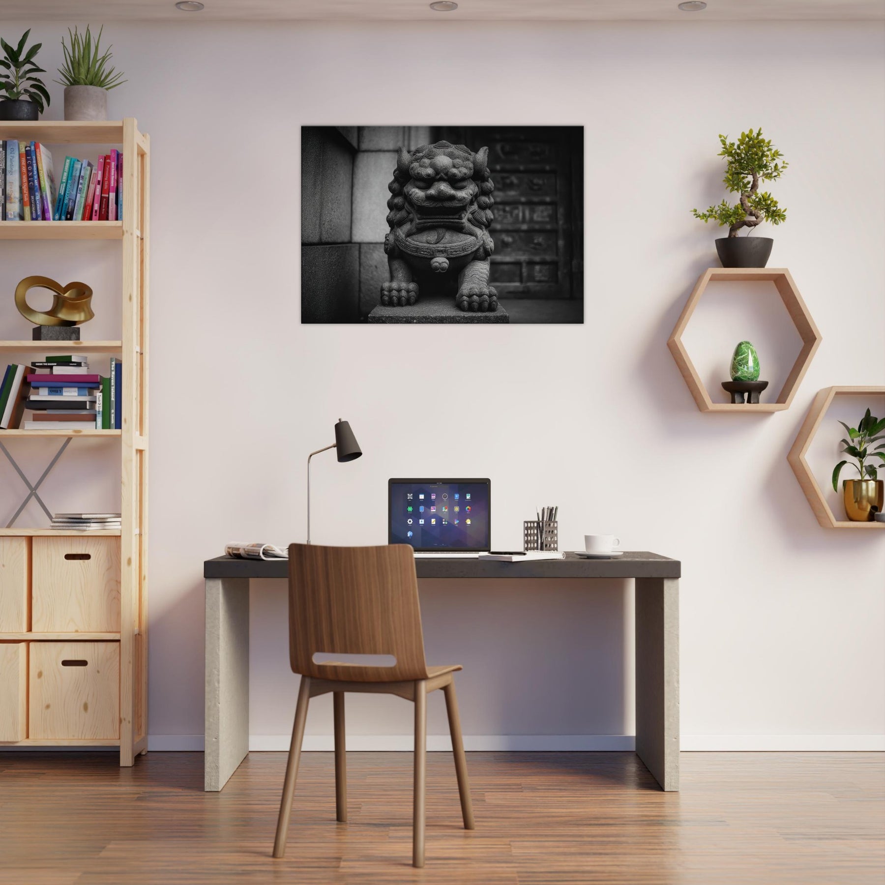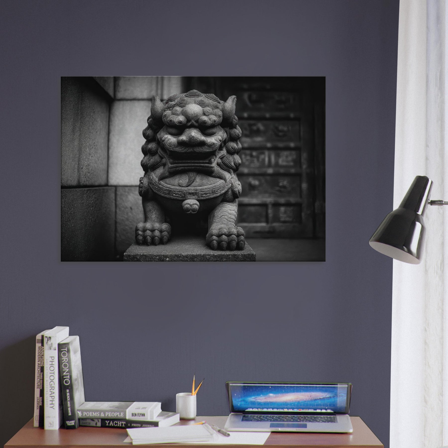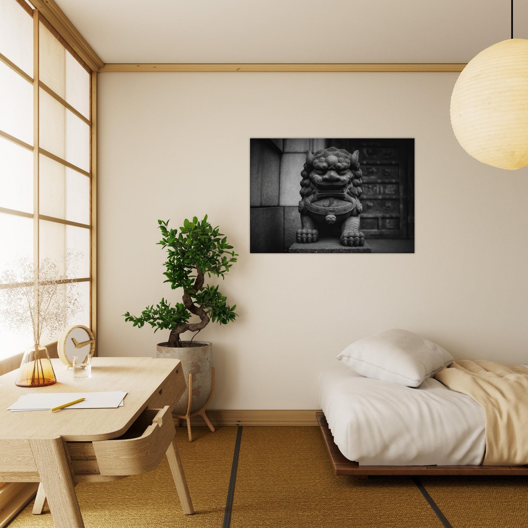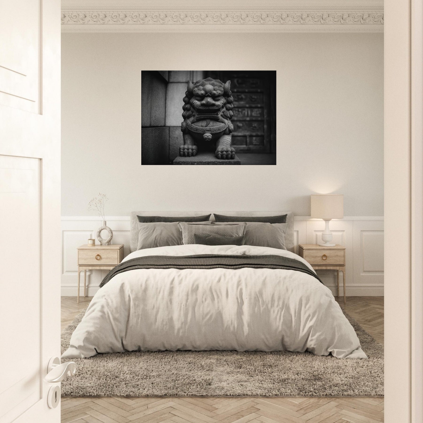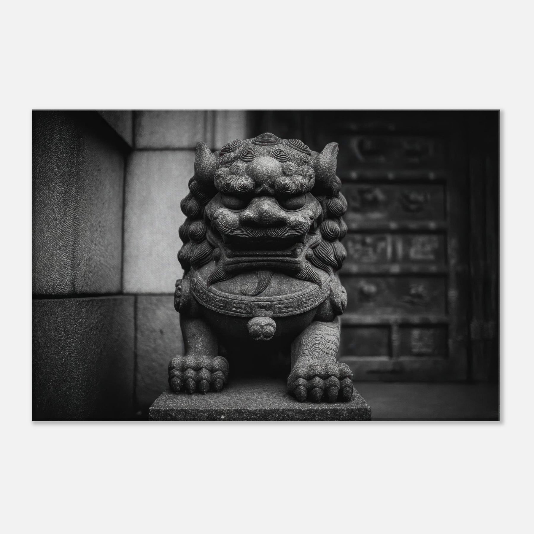 Rendered in stark monochrome, the Asian Guardian Lion (Shishi or Foo Dog) stands vigilant before a temple gate, its carved features tracing wind and centuries of ritual. The bold textures curling mane, weathered stone, and powerful paws evoke quiet ceremony and enduring protection. This wall art invites contemplation and elevates a living space with timeless gravity, turning hallways or living rooms into a shrine of stillness, refinement, and mythic presence that lingers in light and shadow.