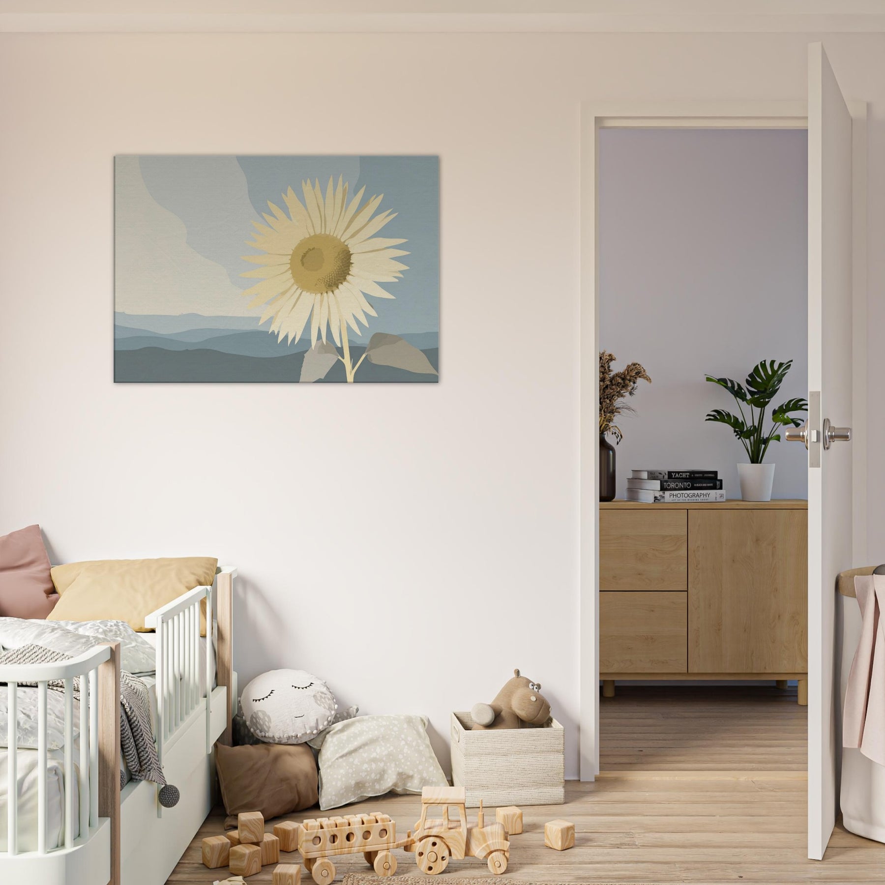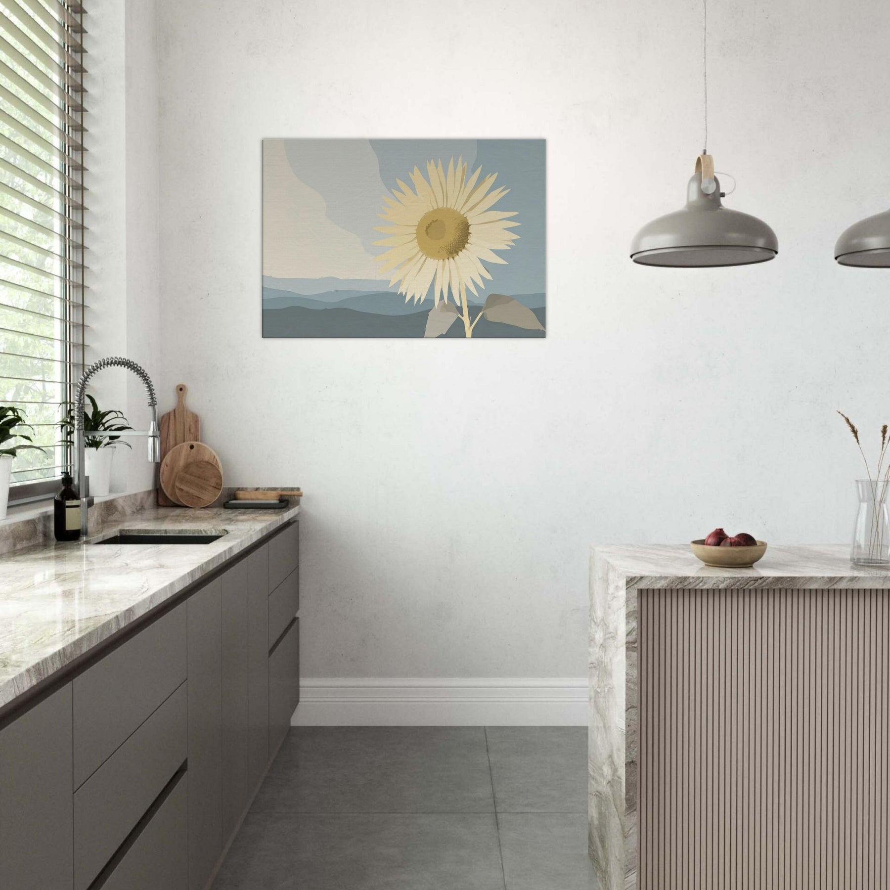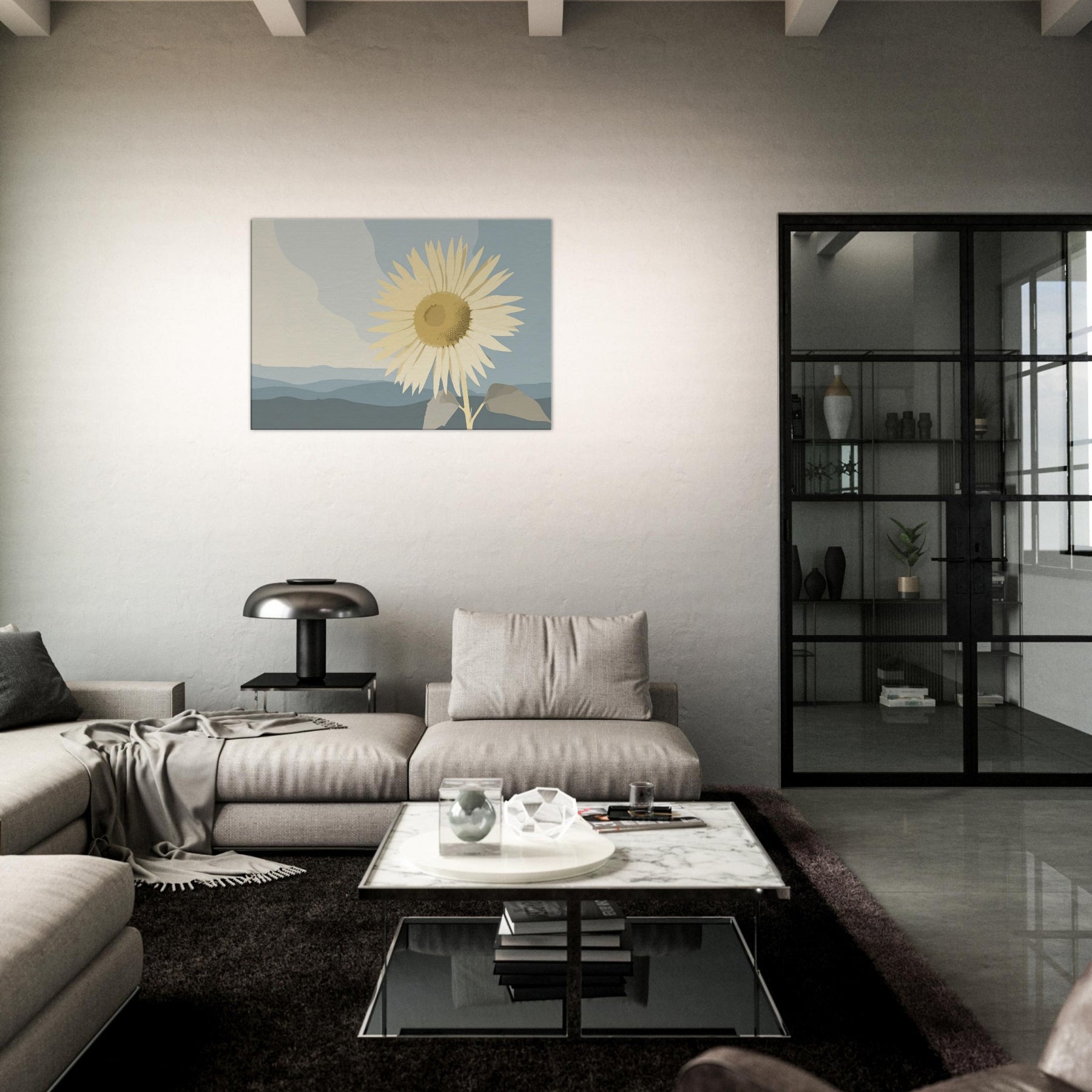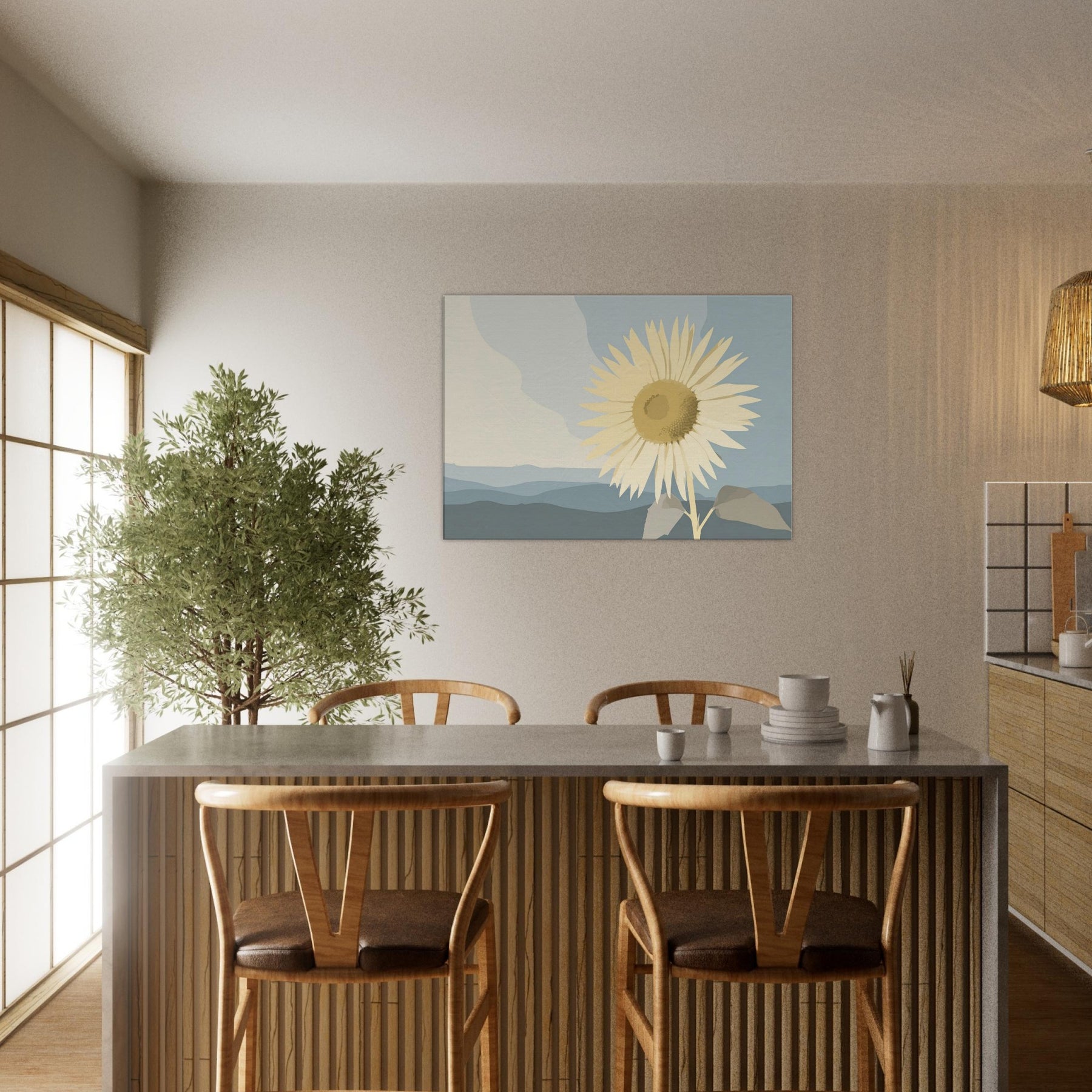 Sunflower Dawn envelopes a quiet room with soft, warm light. In minimalist strokes, the blossom stands serene against layered blues and cream, a gentle dialogue between earth and sky. The air seems to hum with a lullaby of color, inviting calm and focus to a living space where morning brightness meets tranquil gravity. This Sunflower, reduced to its essence, becomes a quiet companion for reflection, guiding conversation and comfort in a modern home.