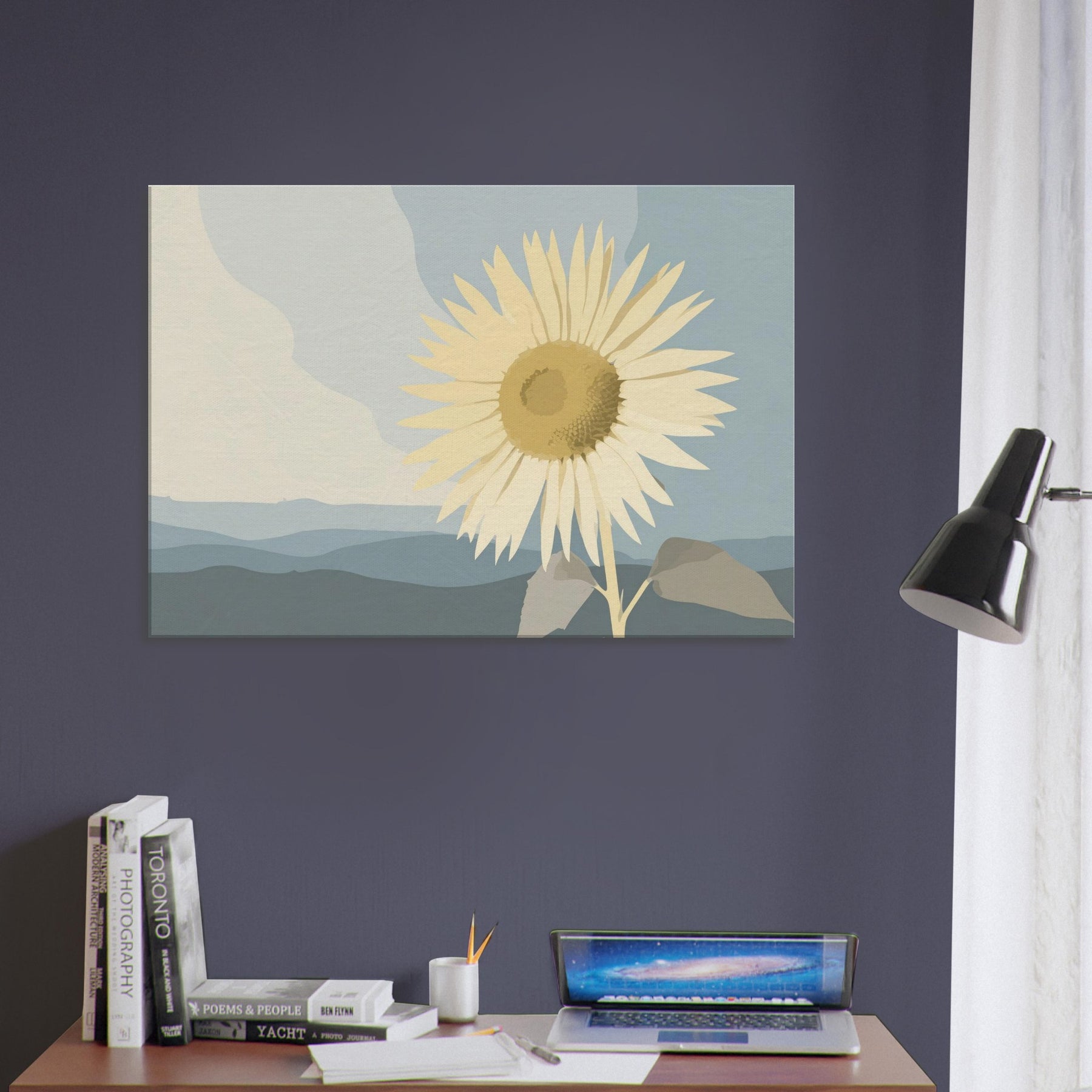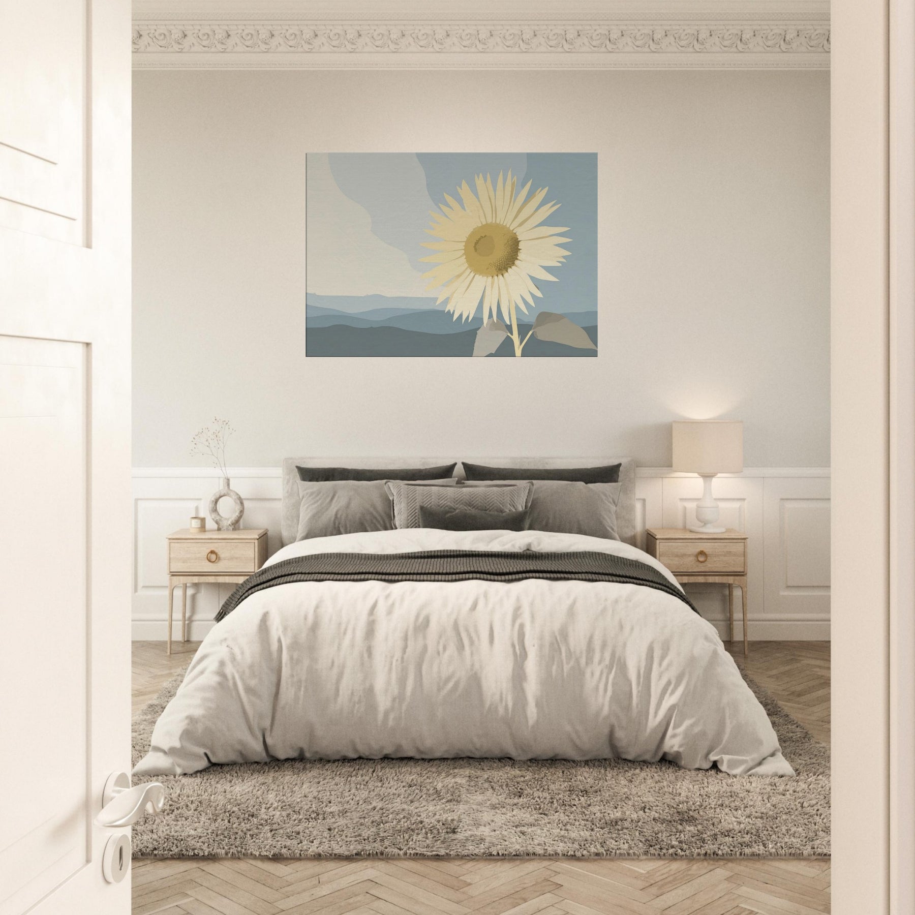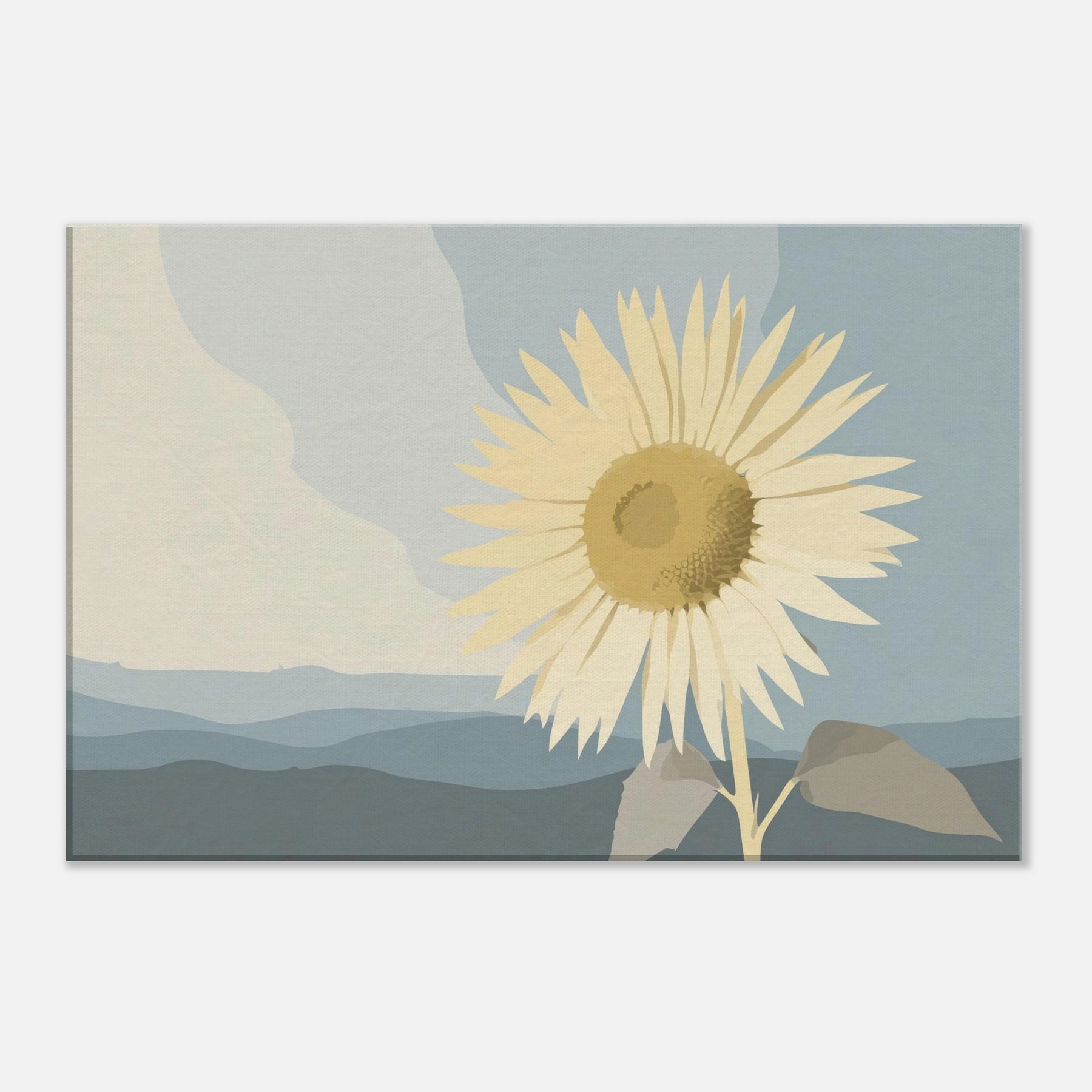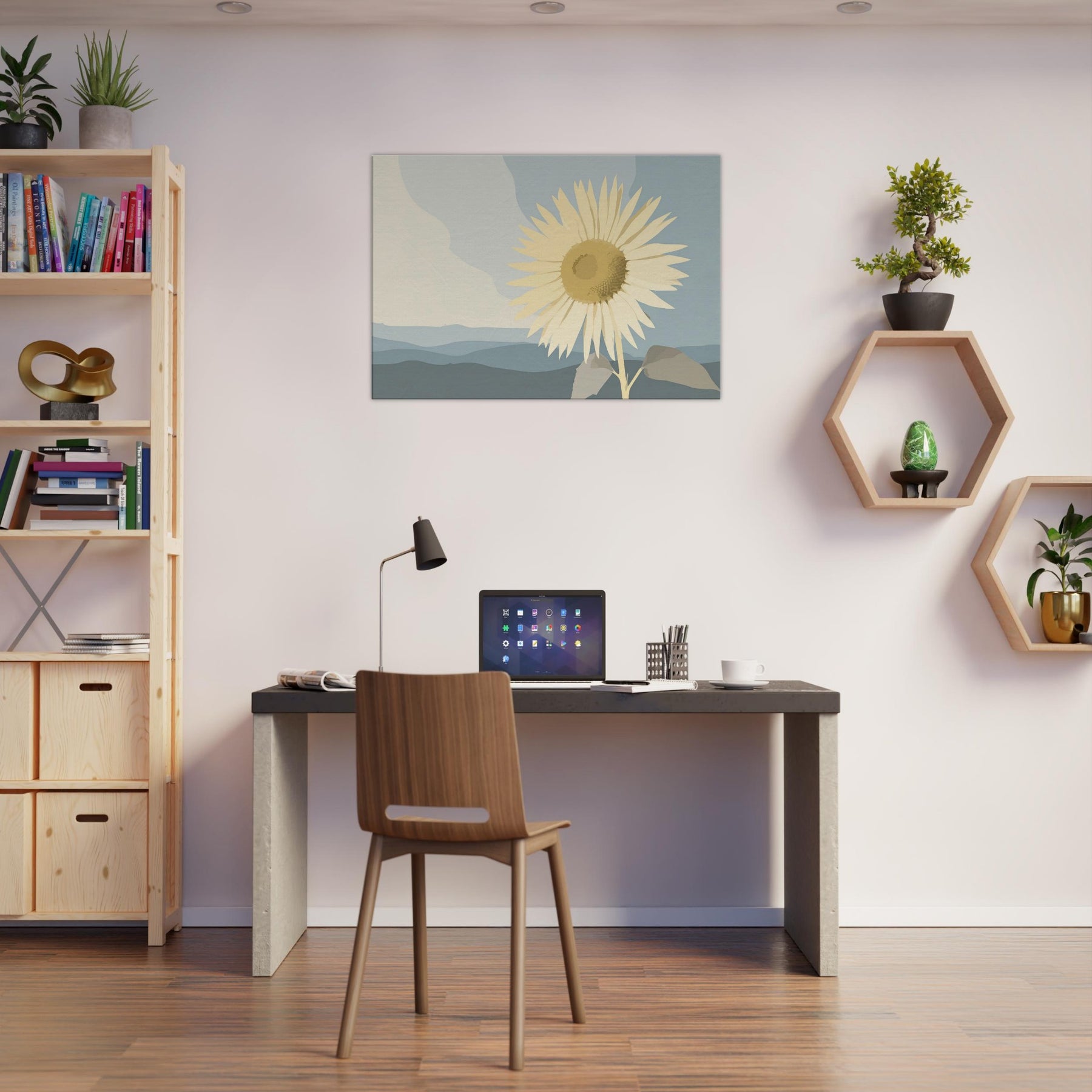 Sunflower Dawn envelopes a quiet room with soft, warm light. In minimalist strokes, the blossom stands serene against layered blues and cream, a gentle dialogue between earth and sky. The air seems to hum with a lullaby of color, inviting calm and focus to a living space where morning brightness meets tranquil gravity. This Sunflower, reduced to its essence, becomes a quiet companion for reflection, guiding conversation and comfort in a modern home.
