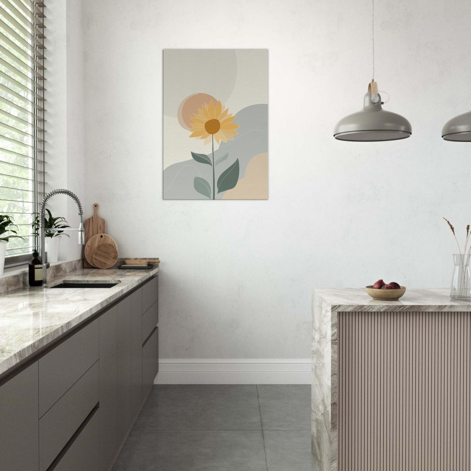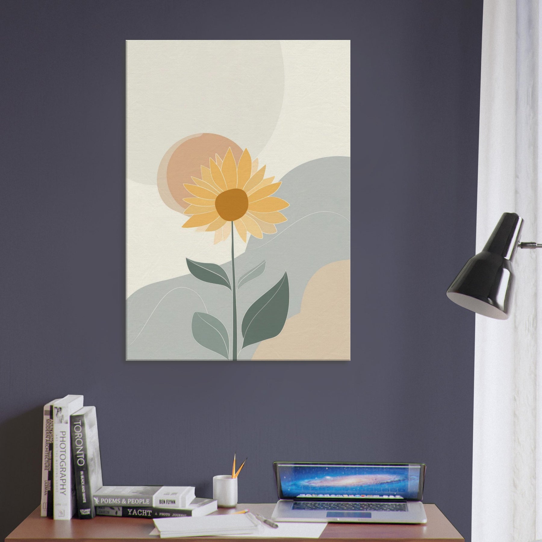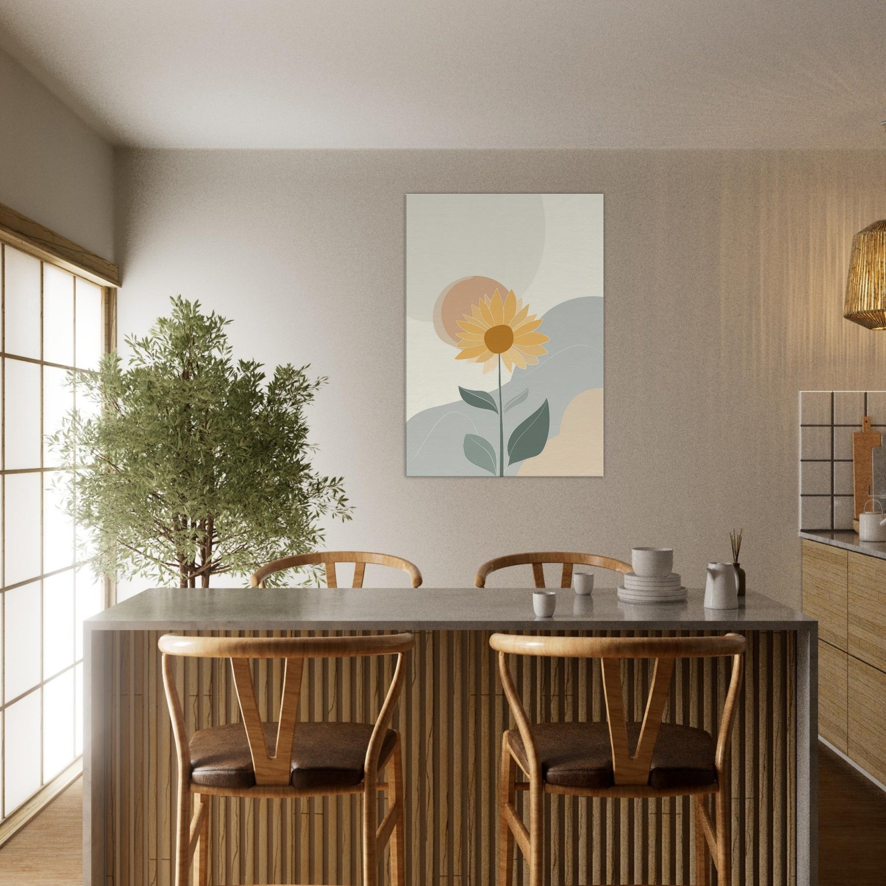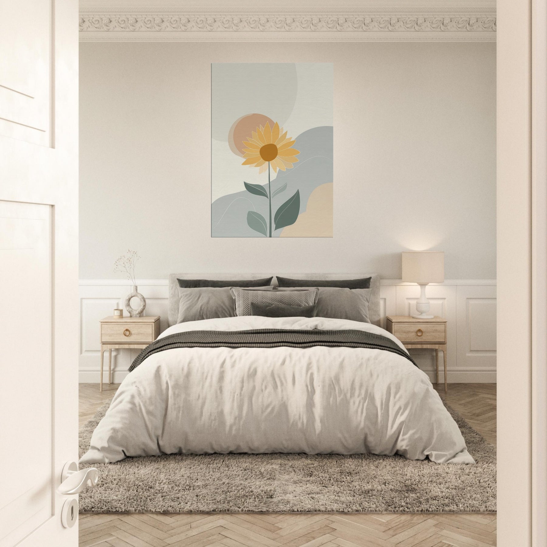 Bathed in warm, whispering light, this minimalist sunflower print invites calm into any room. The clean silhouette and soft, layered shapes suggest a quiet garden at dawn, where each petal glows like a memory. As sunlight spills across walls, the serene palette creamy ivory, muted ochre, and slate greens drifts around the stem, elevating your space without shouting for attention. A focal point that complements nature inspired interiors and invites daily moments of pause and wonder.
