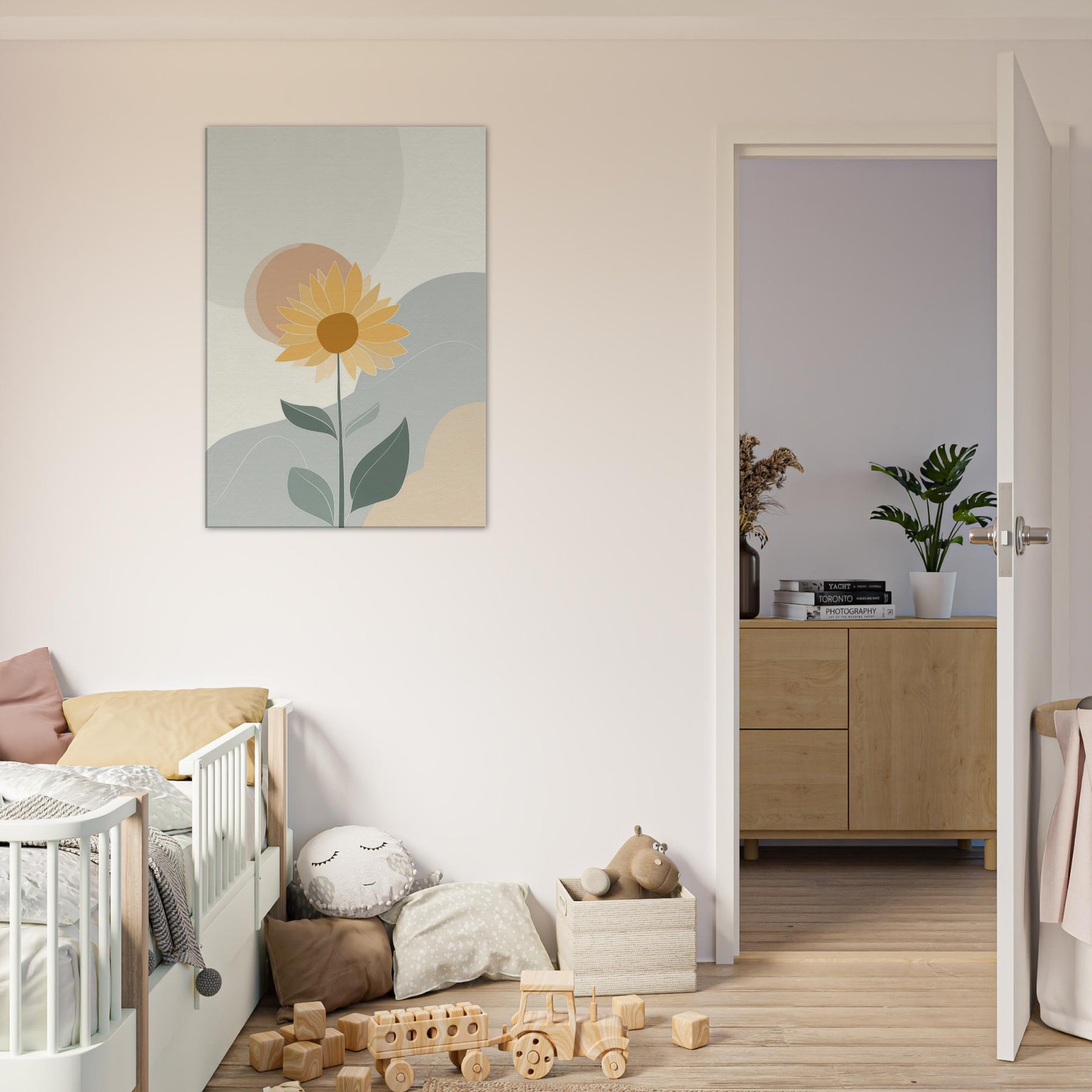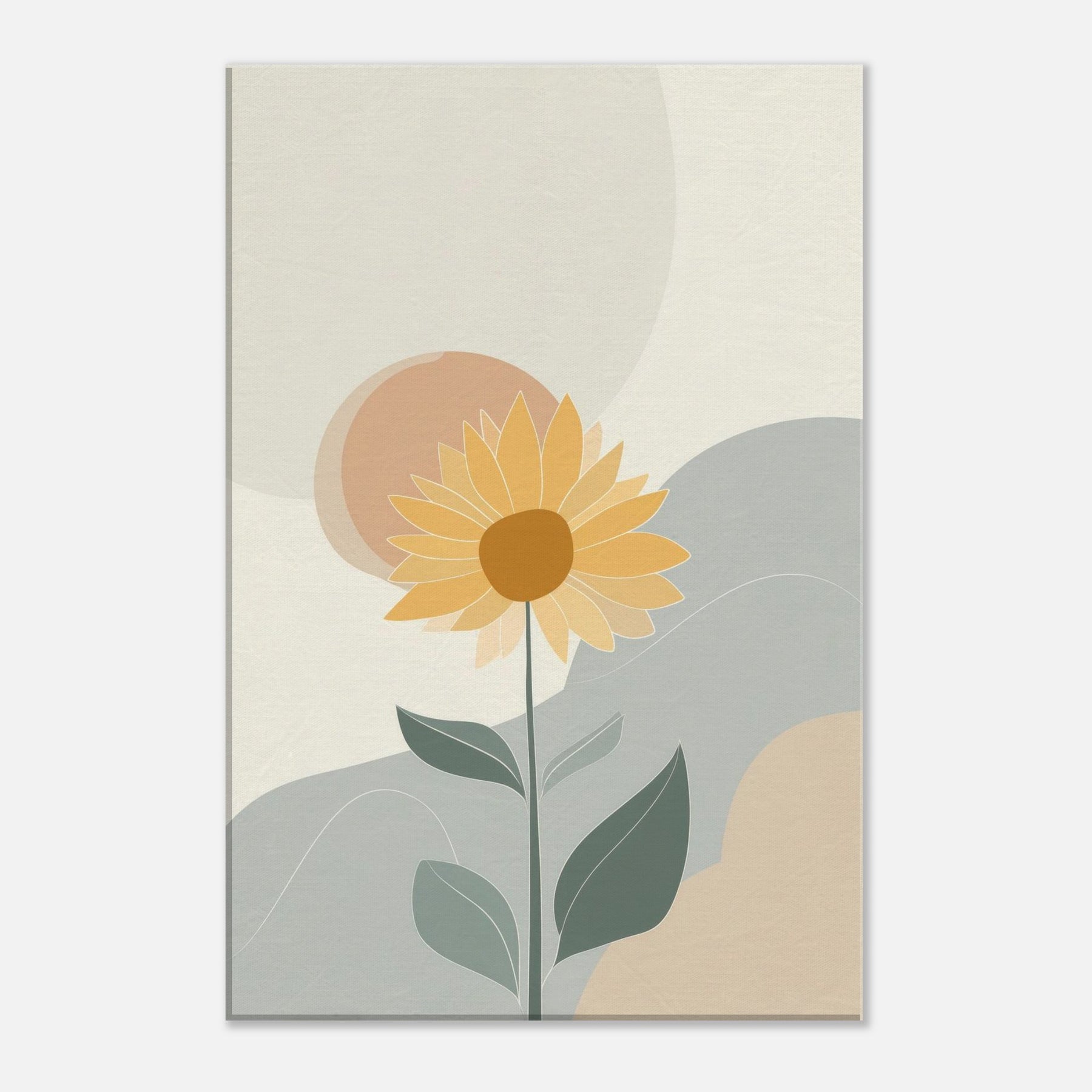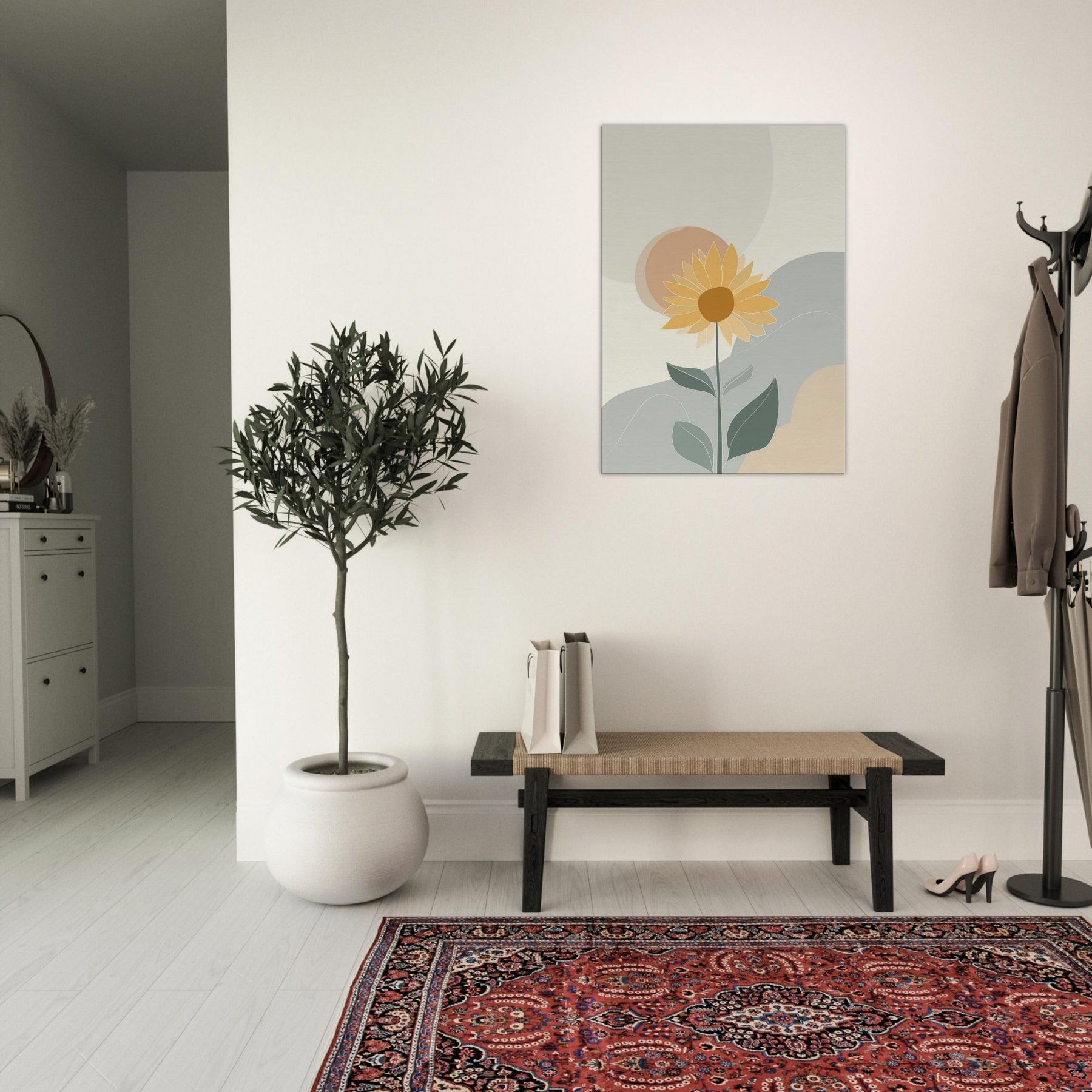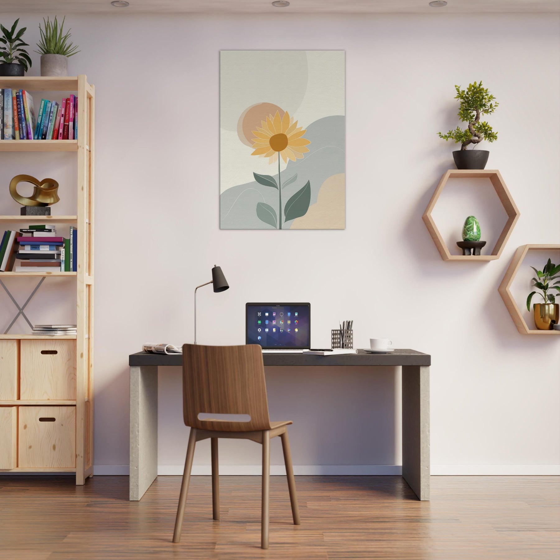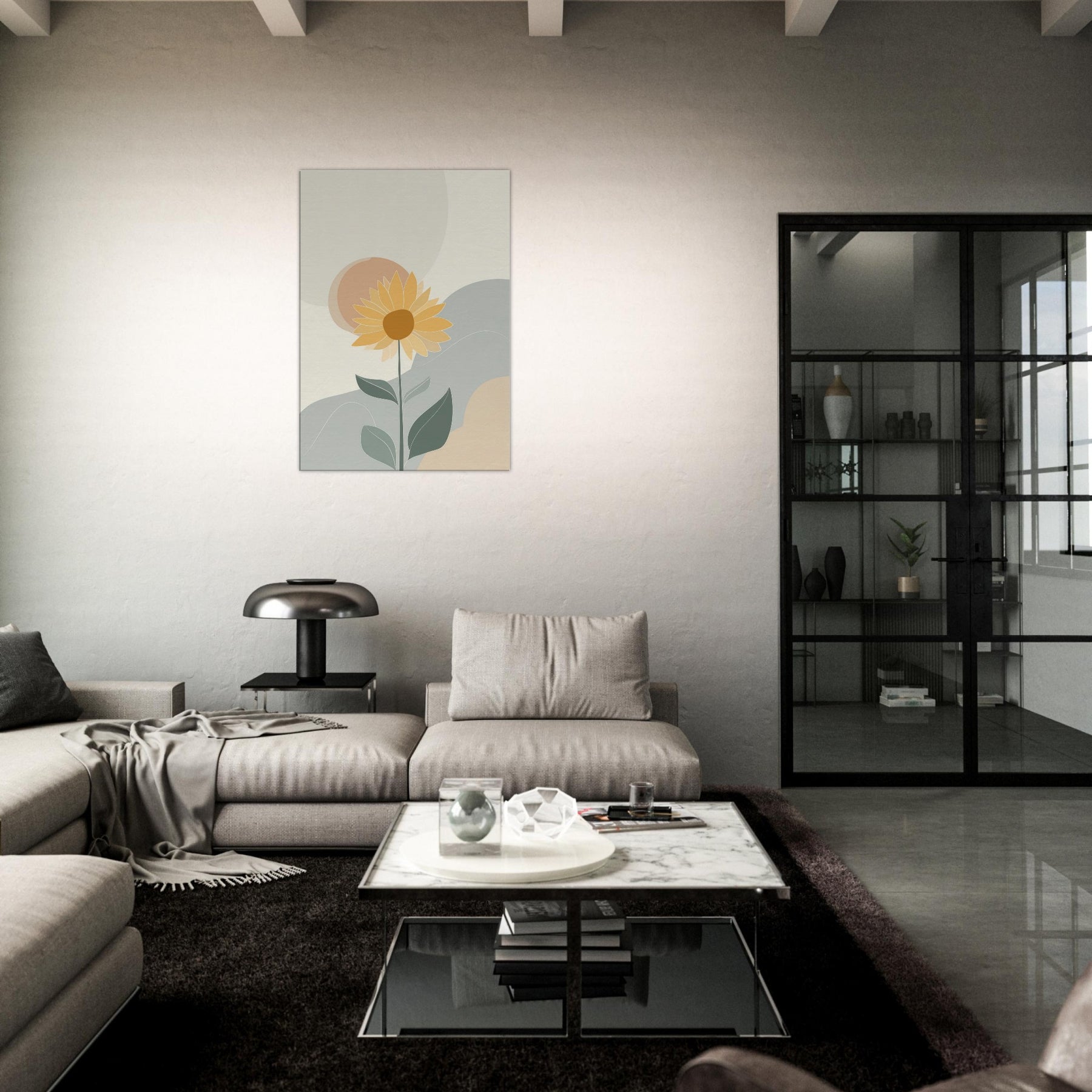 Bathed in warm, whispering light, this minimalist sunflower print invites calm into any room. The clean silhouette and soft, layered shapes suggest a quiet garden at dawn, where each petal glows like a memory. As sunlight spills across walls, the serene palette creamy ivory, muted ochre, and slate greens drifts around the stem, elevating your space without shouting for attention. A focal point that complements nature inspired interiors and invites daily moments of pause and wonder.