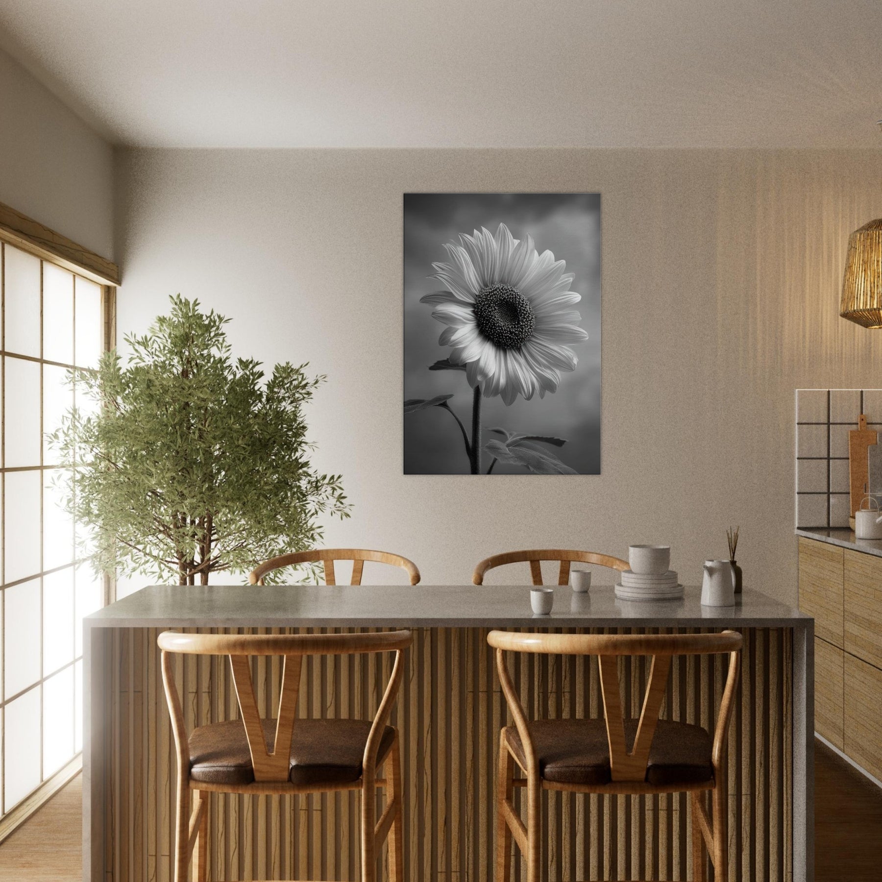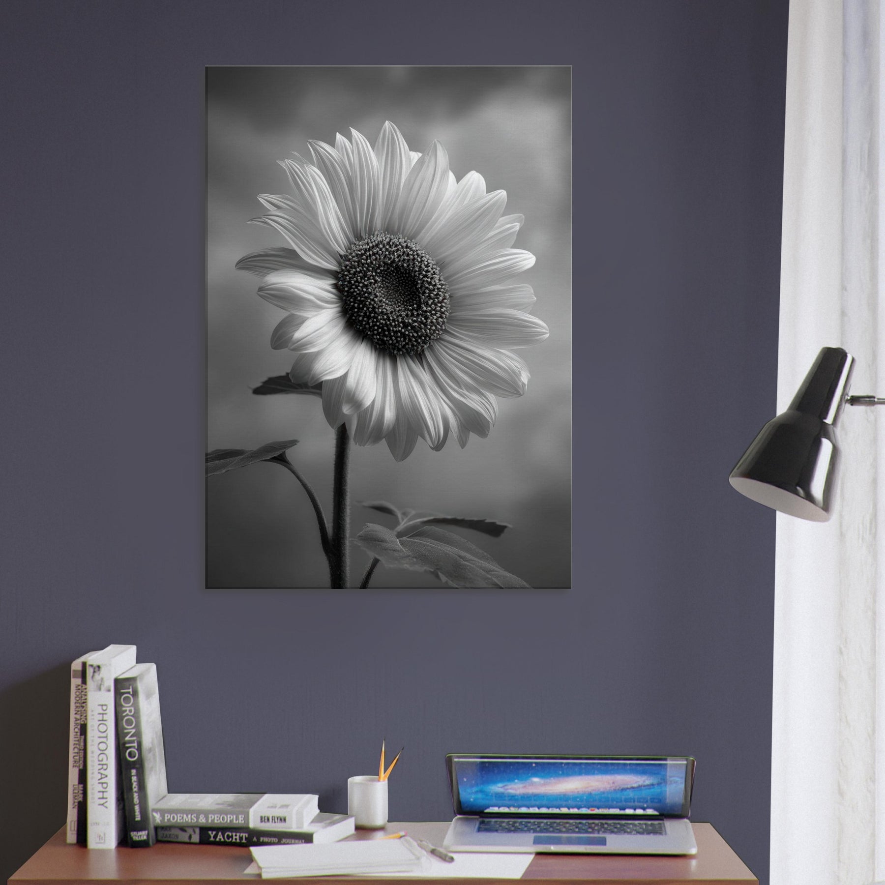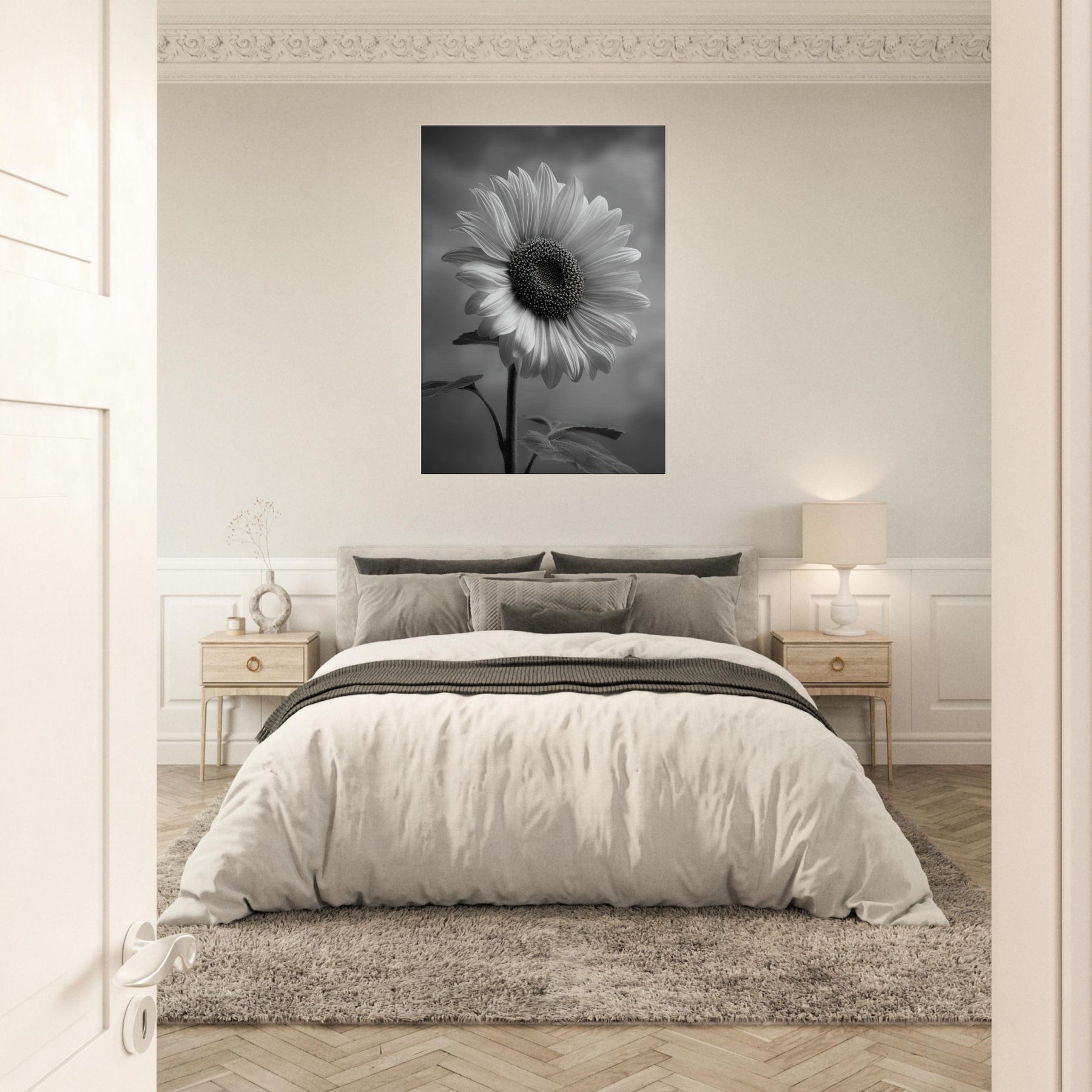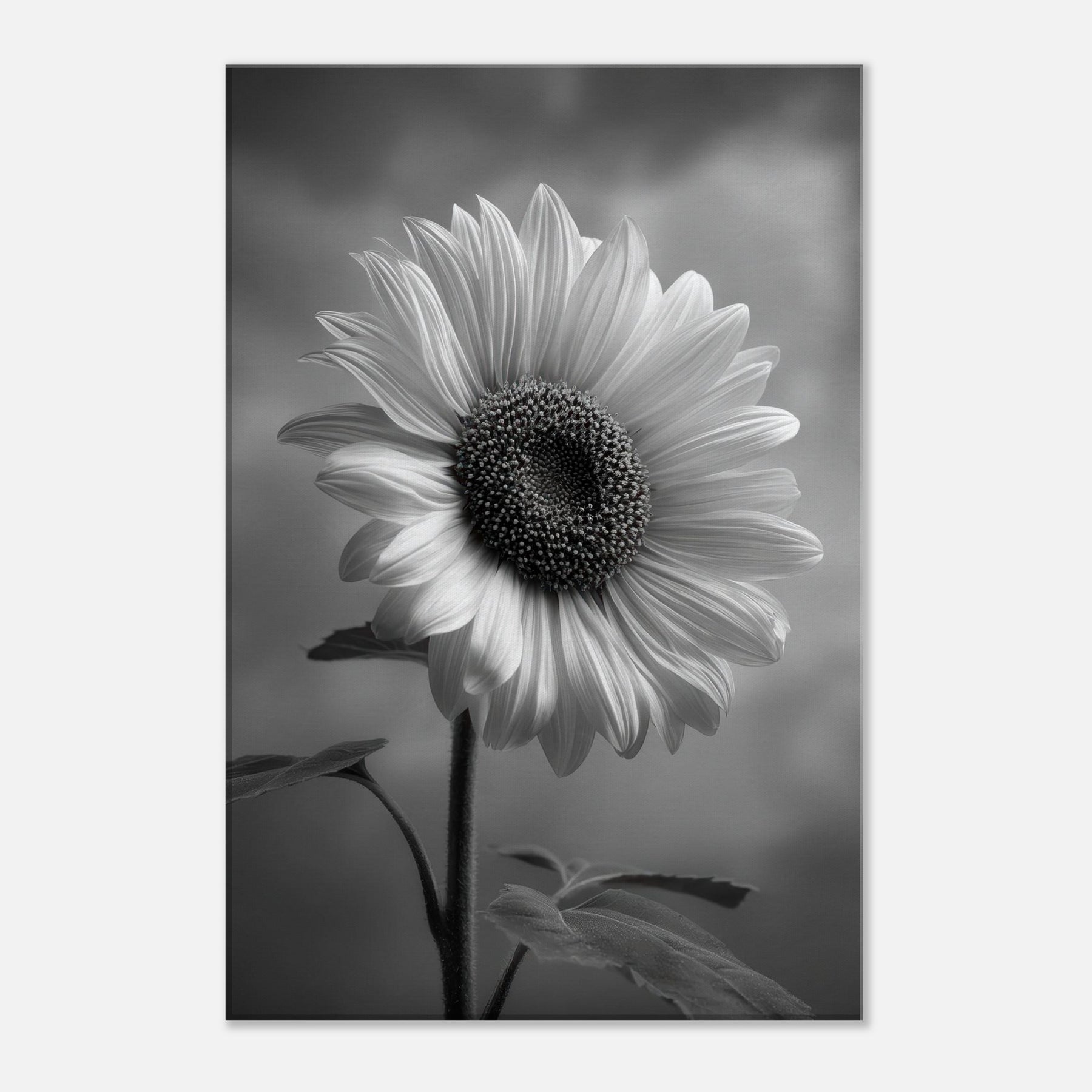 Sunflower Reverie invites the warmth of a sunlit field into a quiet room, rendered in gleaming grayscale that heightens shadow and texture. The central bloom forms a a generous arc of petals, its dark, studded center drawing the eye and imagination.