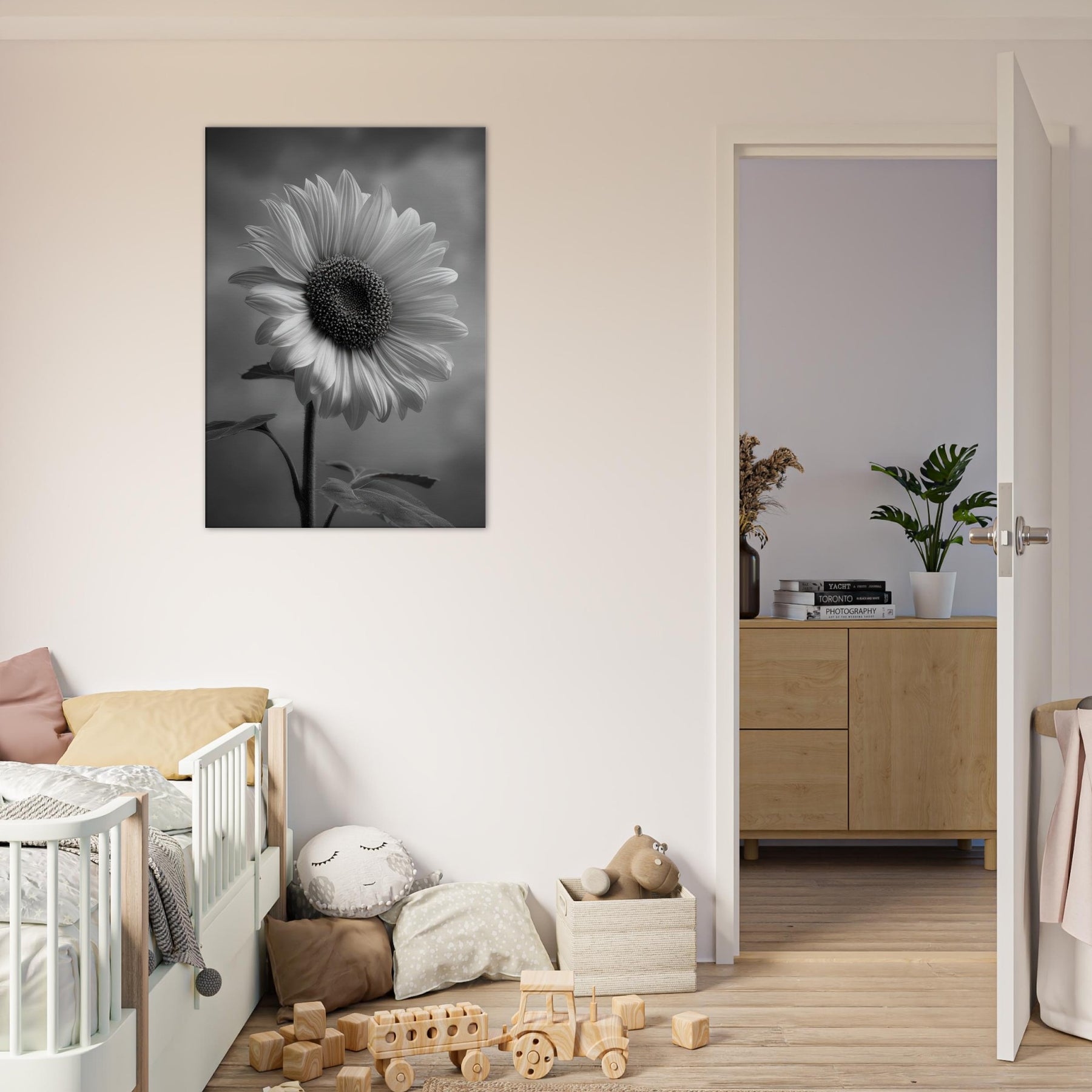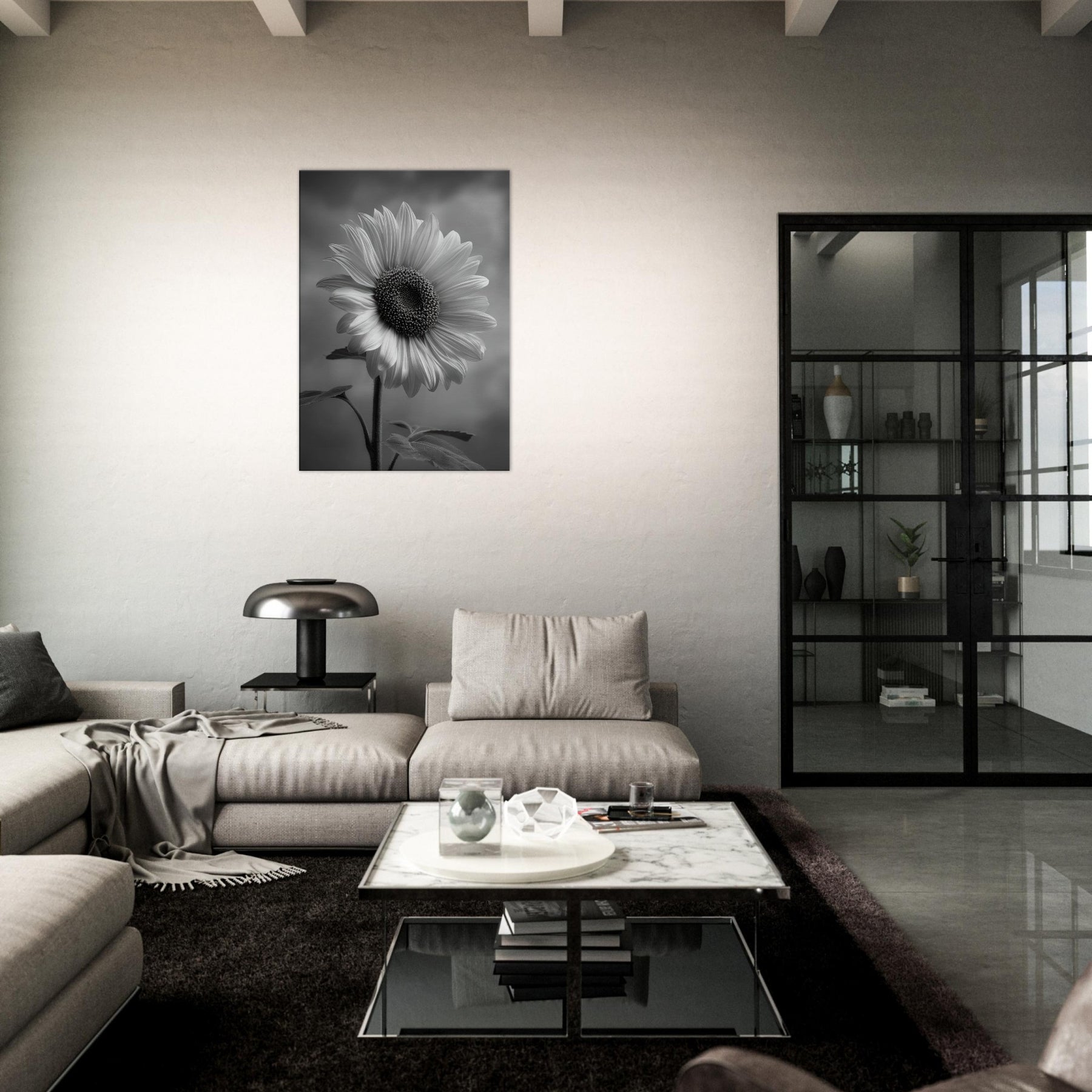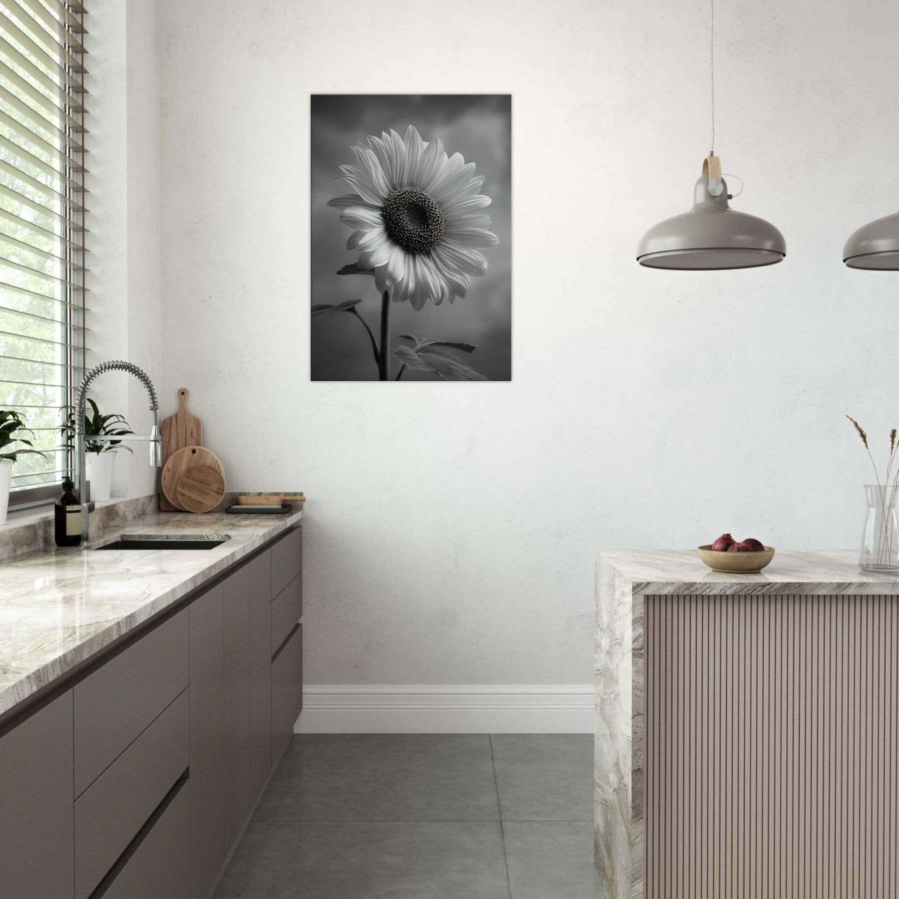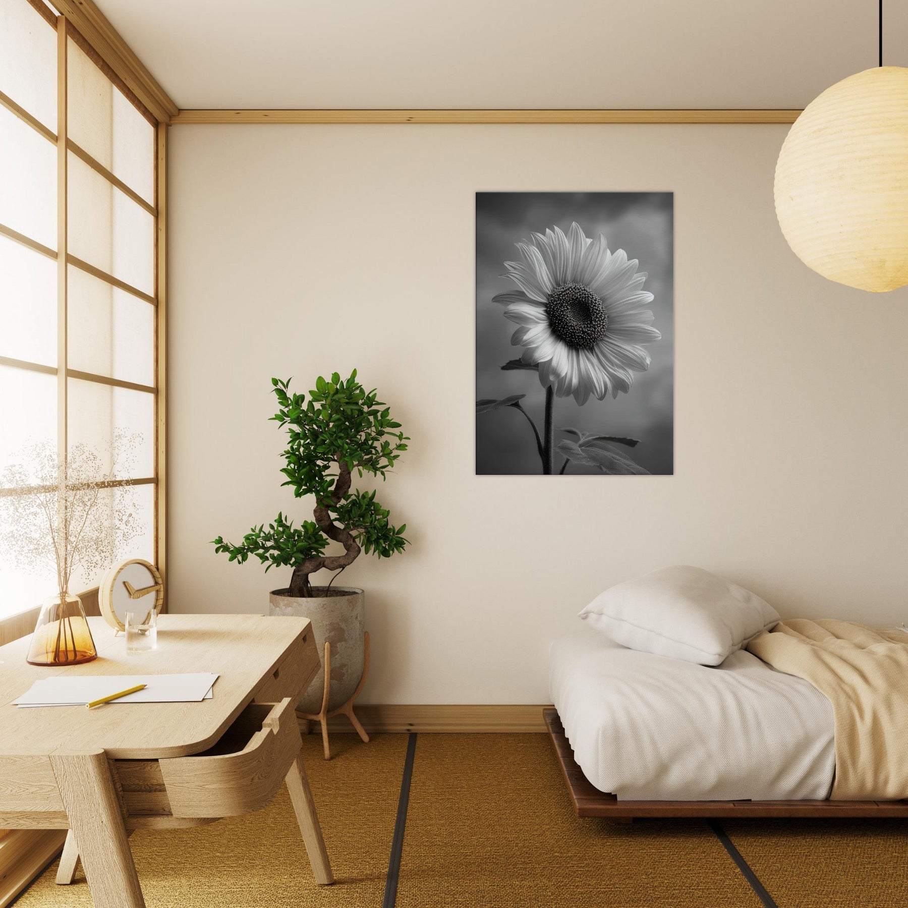 Sunflower Reverie invites the warmth of a sunlit field into a quiet room, rendered in gleaming grayscale that heightens shadow and texture. The central bloom forms a a generous arc of petals, its dark, studded center drawing the eye and imagination.