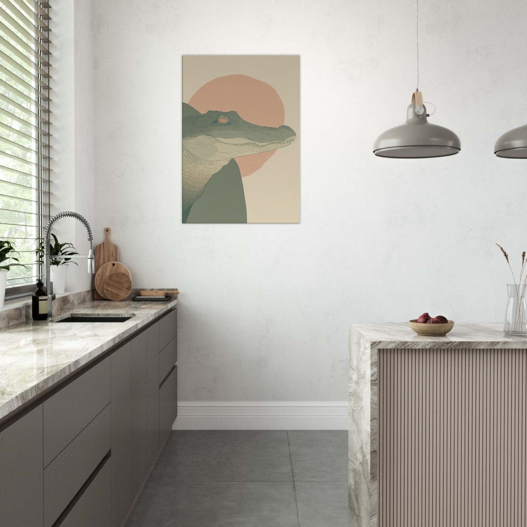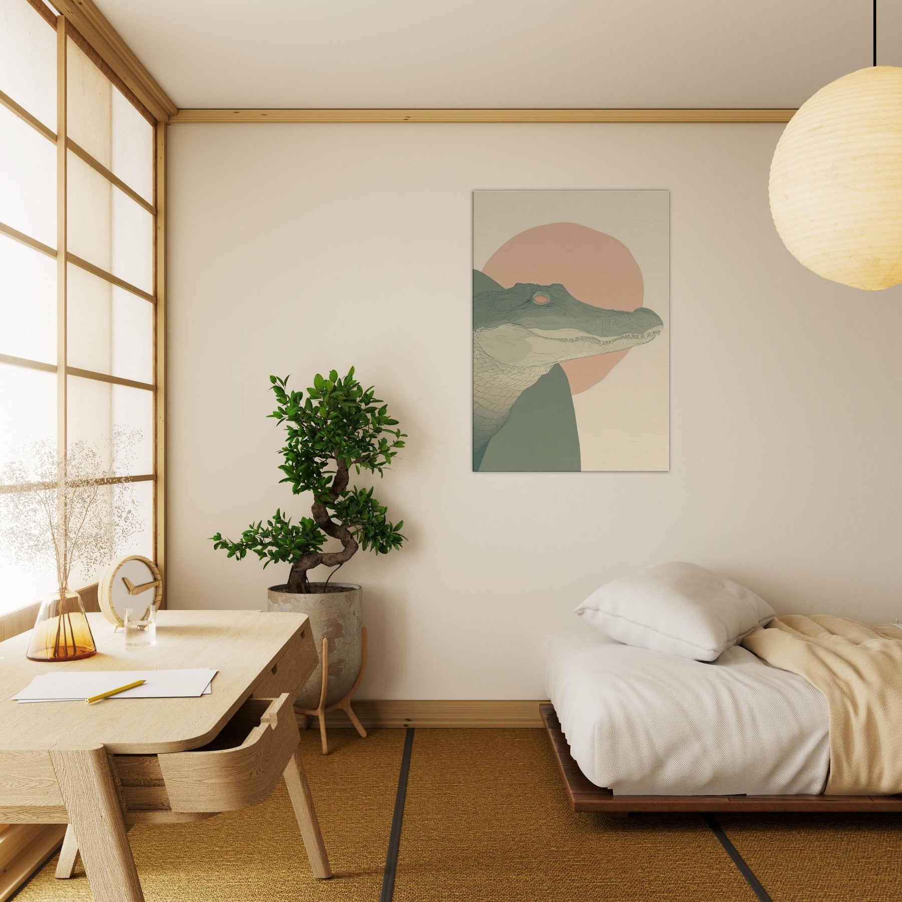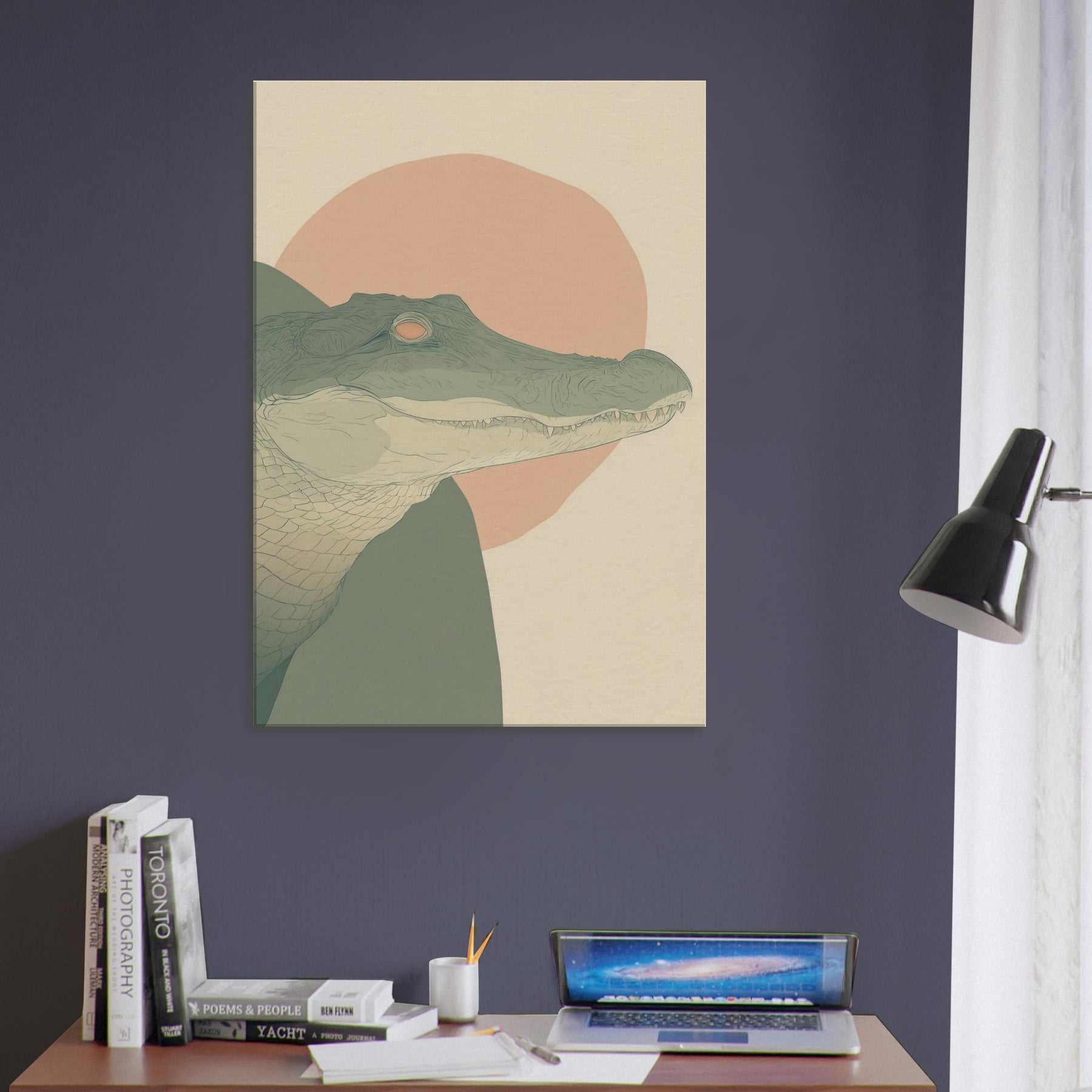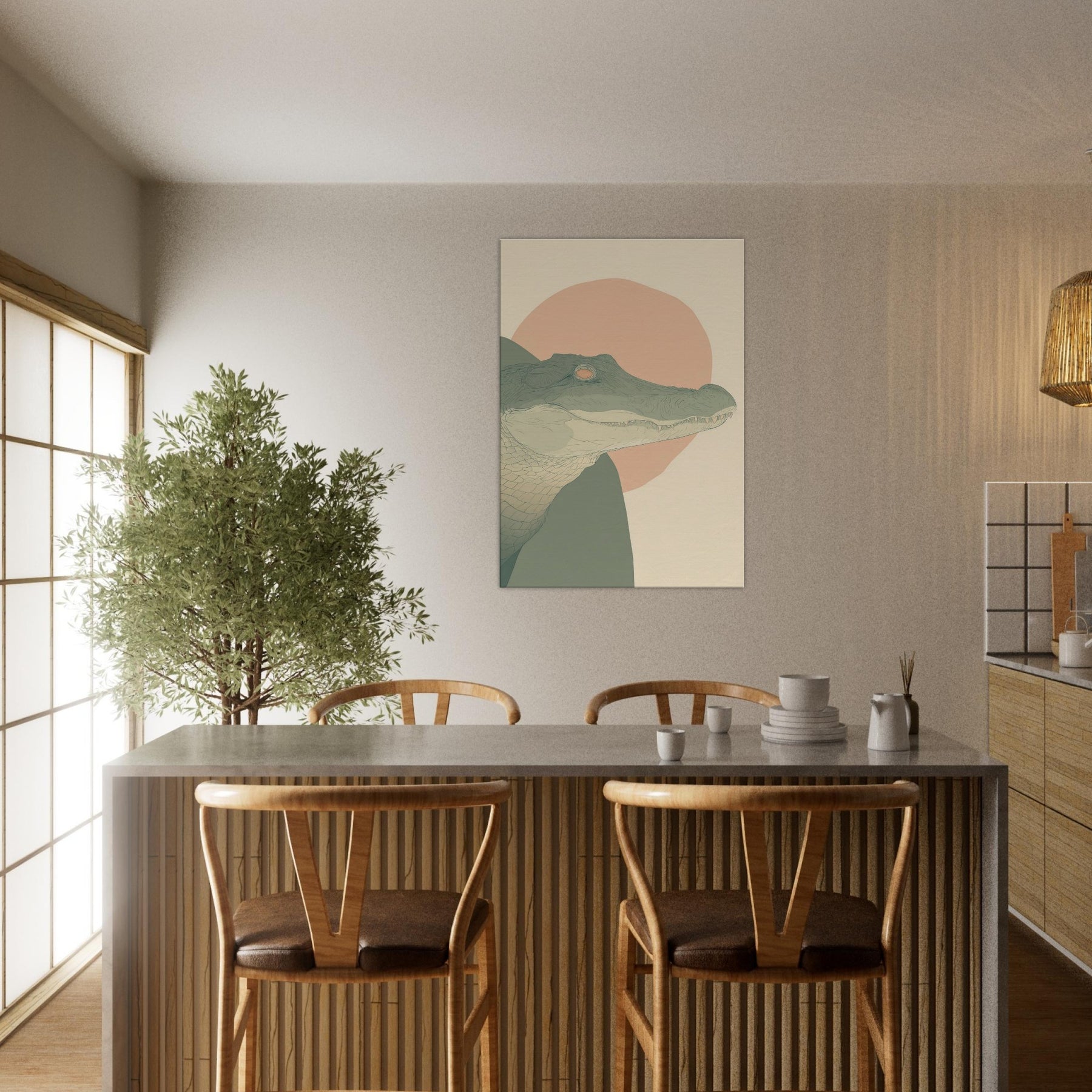 Step closer to a quiet horizon with this minimalist Crocodile wall art. The restrained palette of sage greens, soft ochre, and a warm peach sun renders the animal as a poised silhouette rather than a shout. Its elongated lines and gentle curves invite calm, echoing the stillness of a late afternoon room. Perfect above a sofa or in a study, it creates a sense of balance, drama, and quiet confidence that lingers in every gaze.