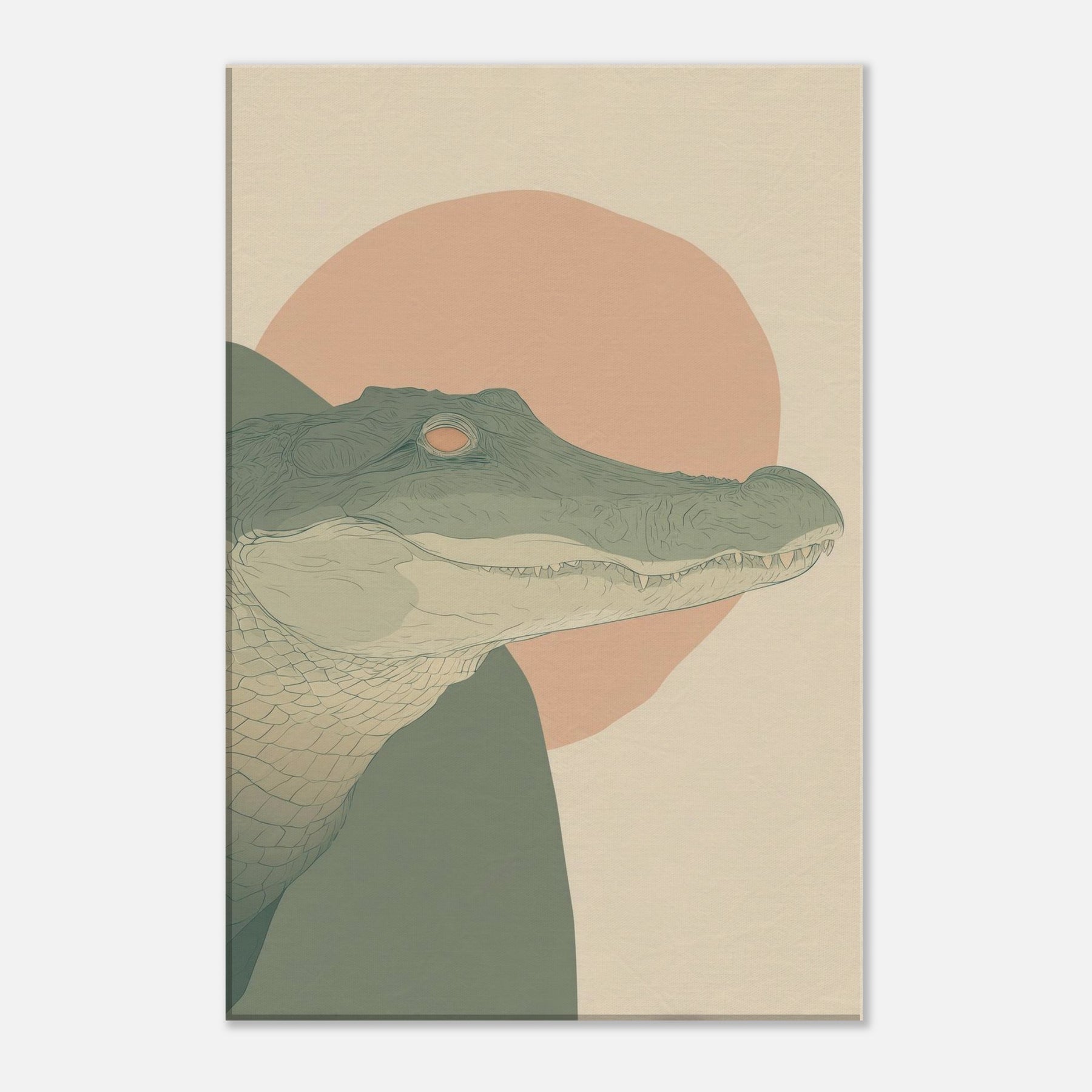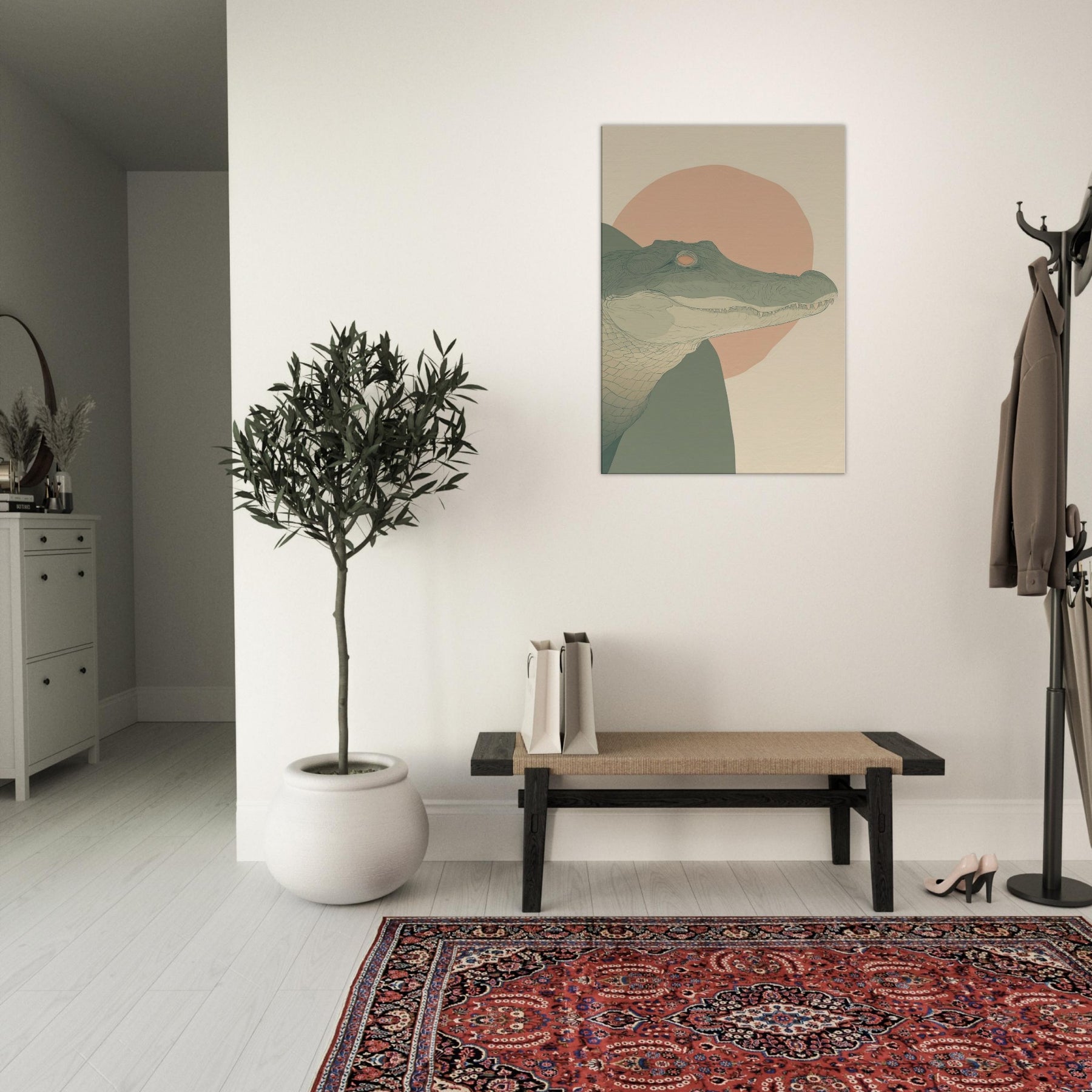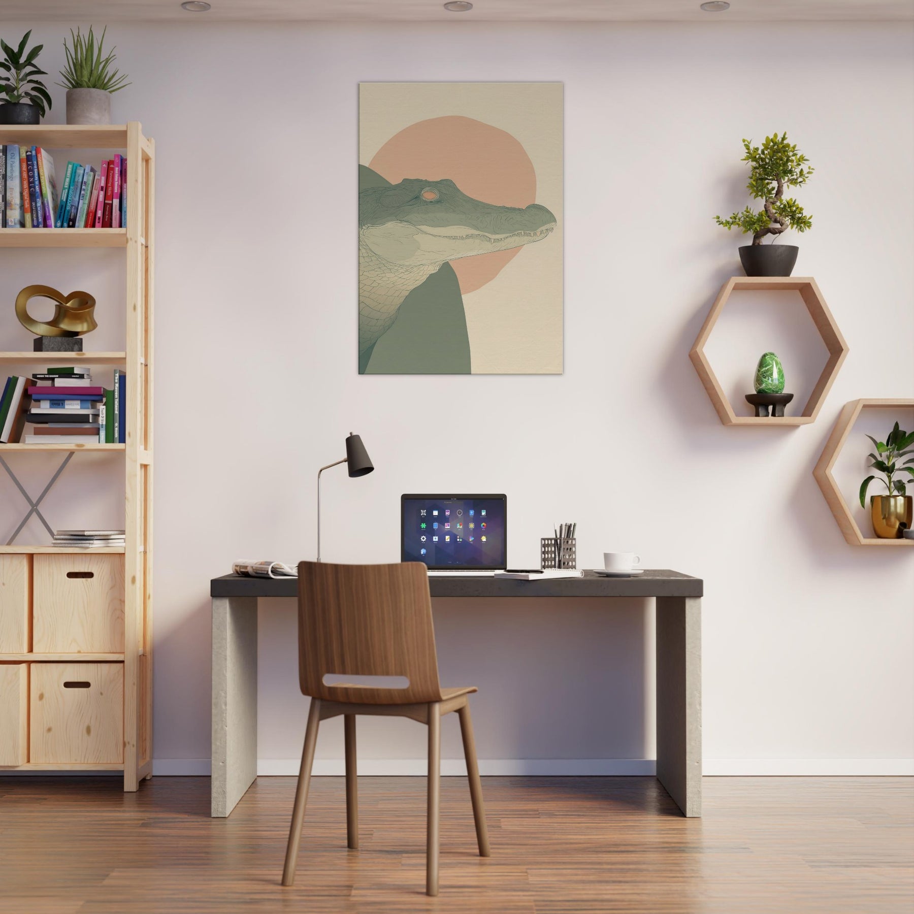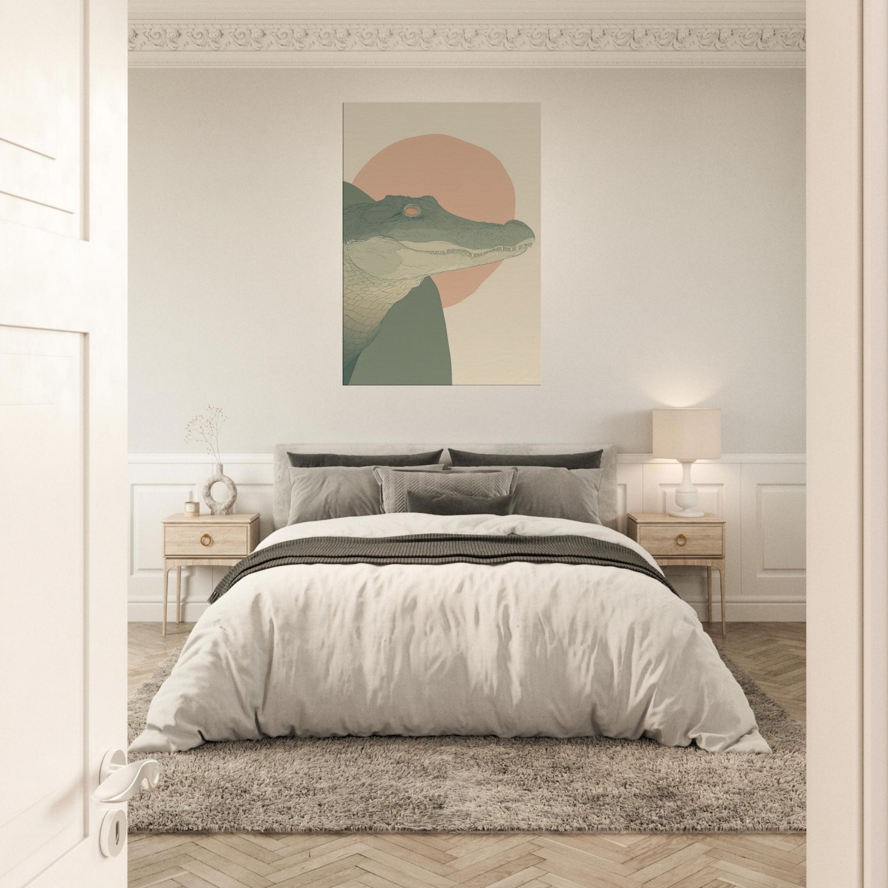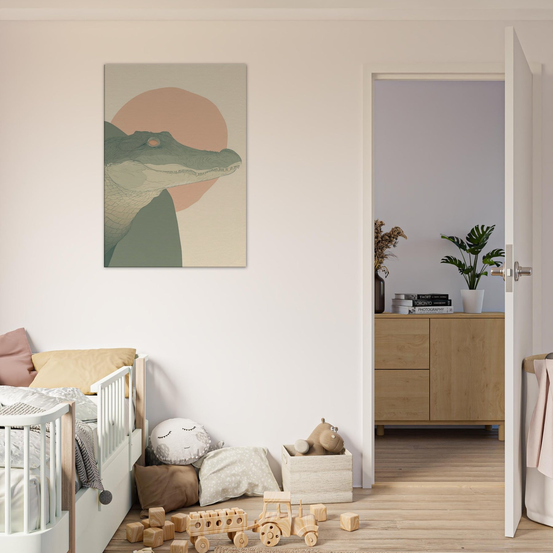 Step closer to a quiet horizon with this minimalist Crocodile wall art. The restrained palette of sage greens, soft ochre, and a warm peach sun renders the animal as a poised silhouette rather than a shout. Its elongated lines and gentle curves invite calm, echoing the stillness of a late afternoon room. Perfect above a sofa or in a study, it creates a sense of balance, drama, and quiet confidence that lingers in every gaze.