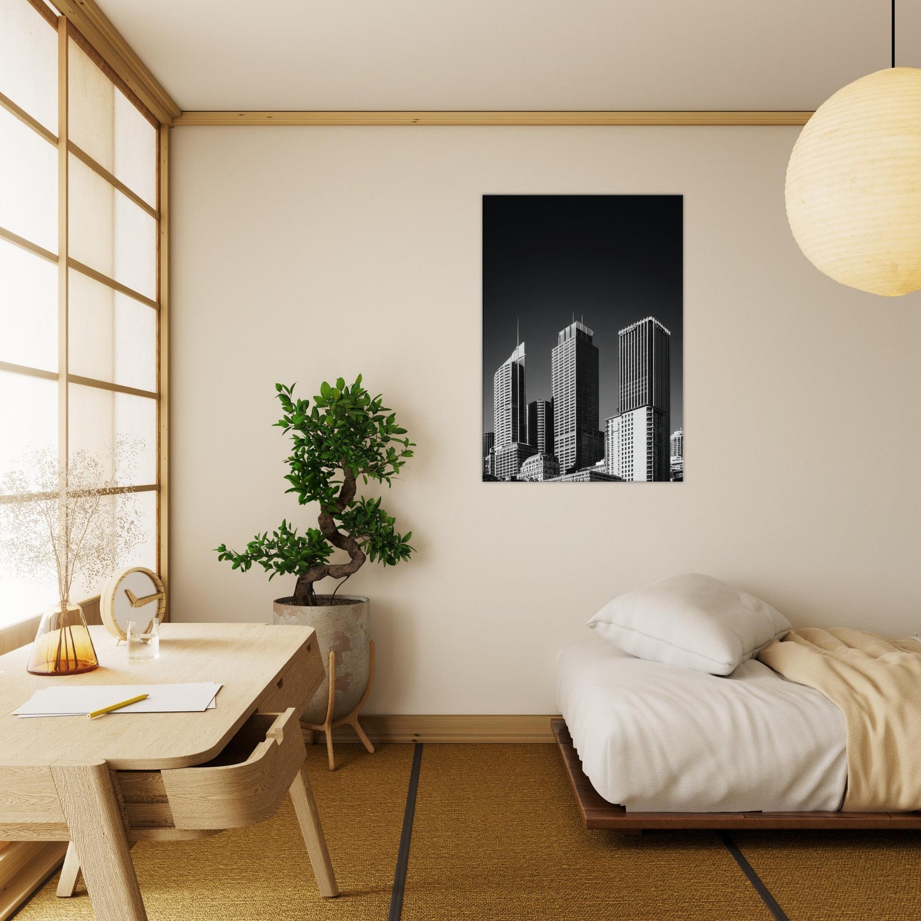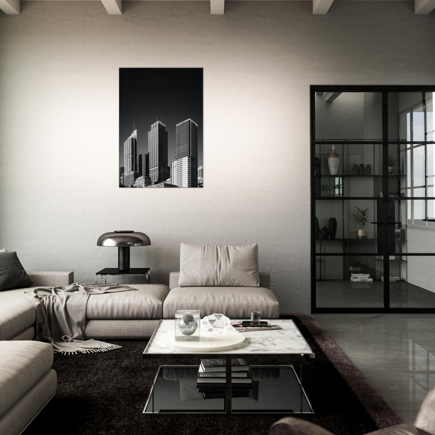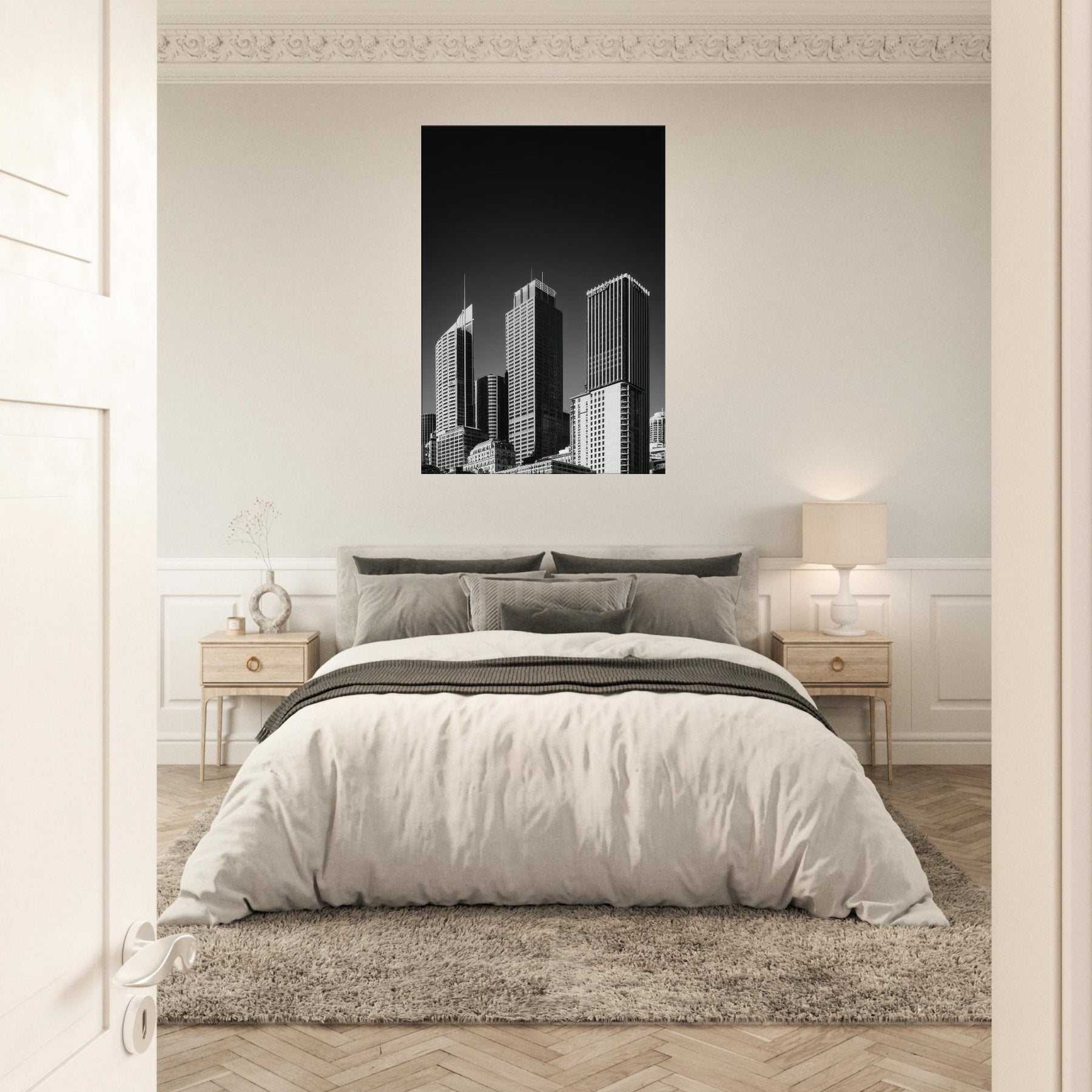 Perfect for a living area, study, or entry, it pairs effortlessly with minimal palettes and metallic accents, heightening a sense of spaciousness. A timeless reminder that urban beauty can reside in the stillness between shadows.