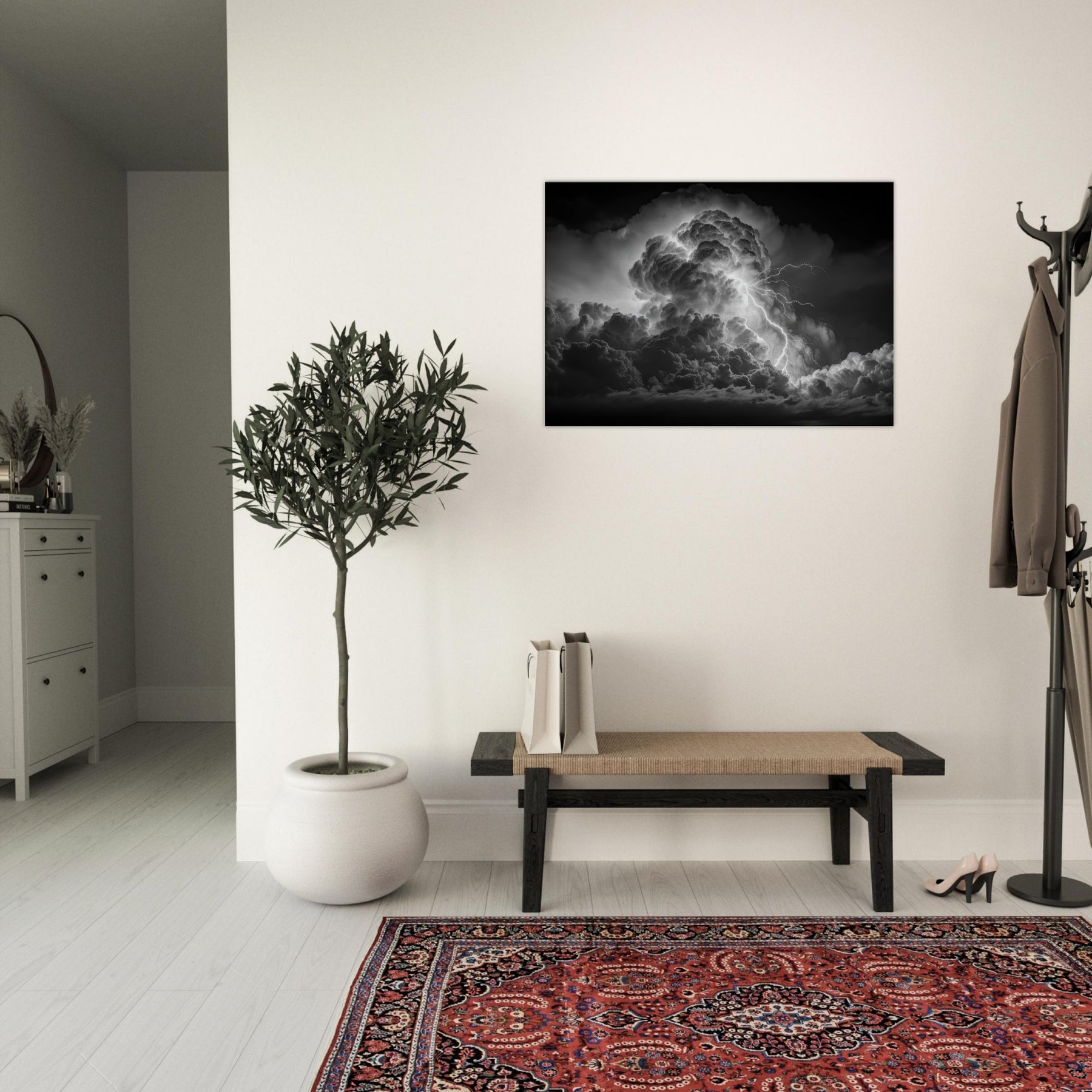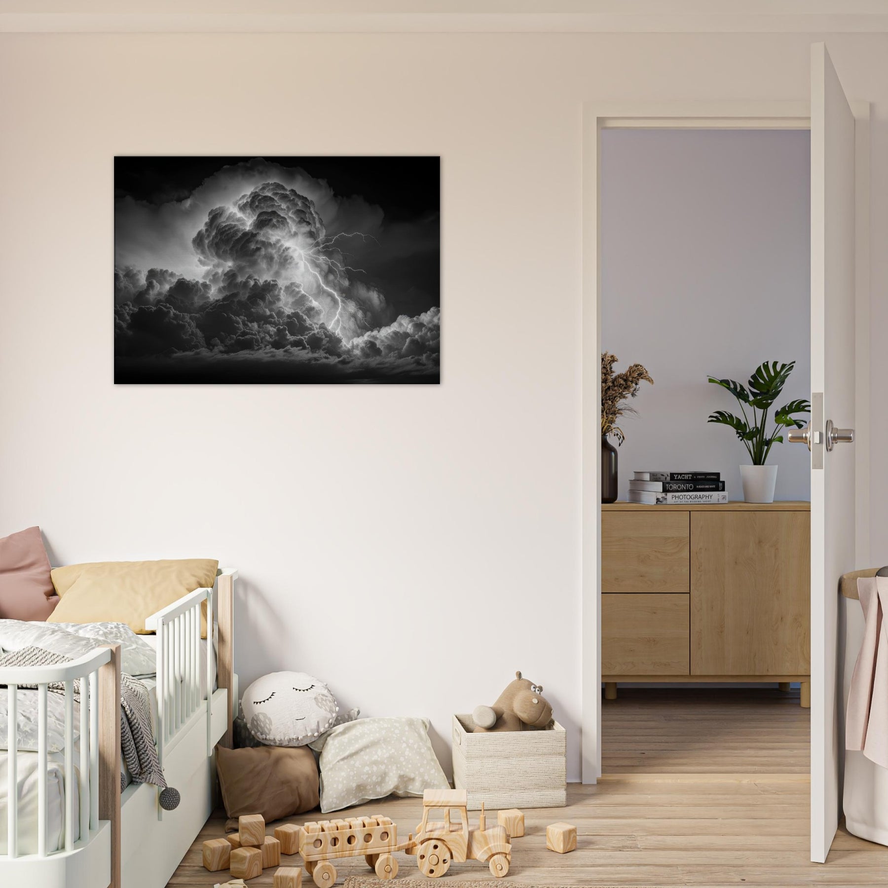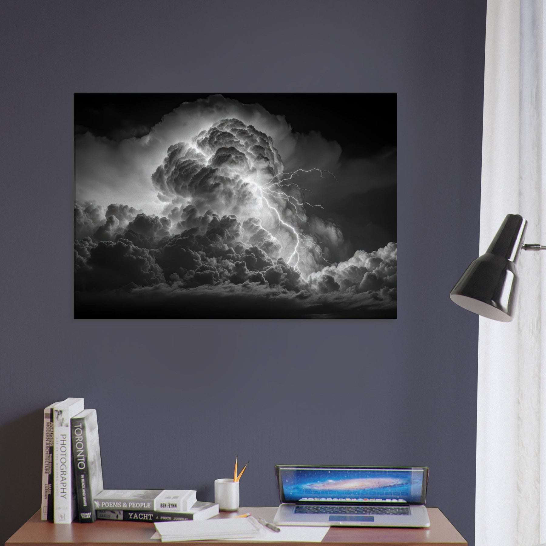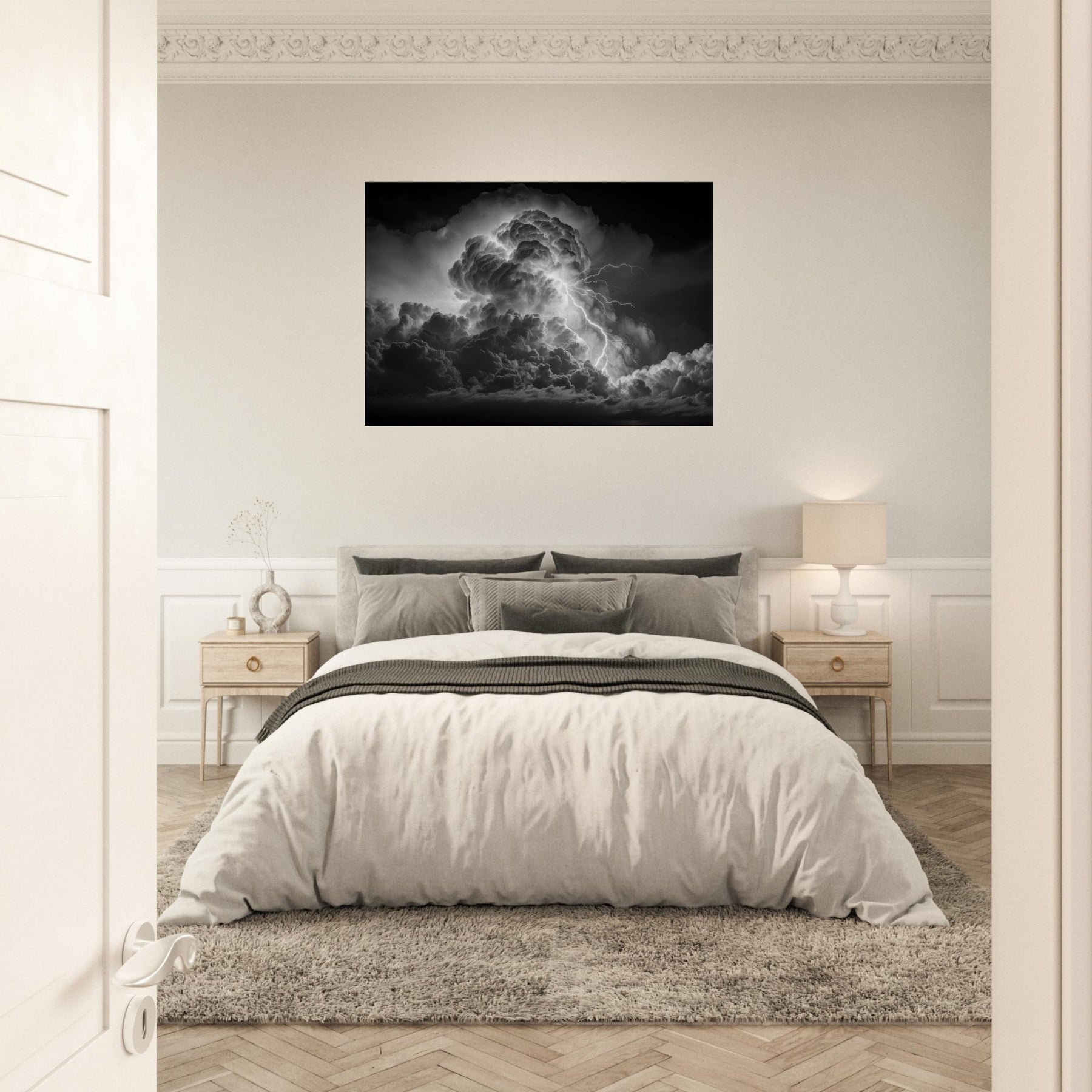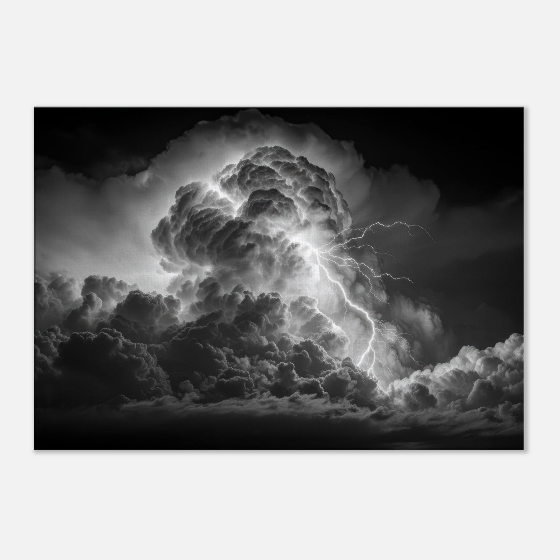 In stark black and white, this portrayal frames Zeus, god of thunder and sky, at the heart of a colossal storm. Clouds churn with mythic gravity as electric tendrils stitch the heavens, turning any wall into a theater of power and quiet grace.