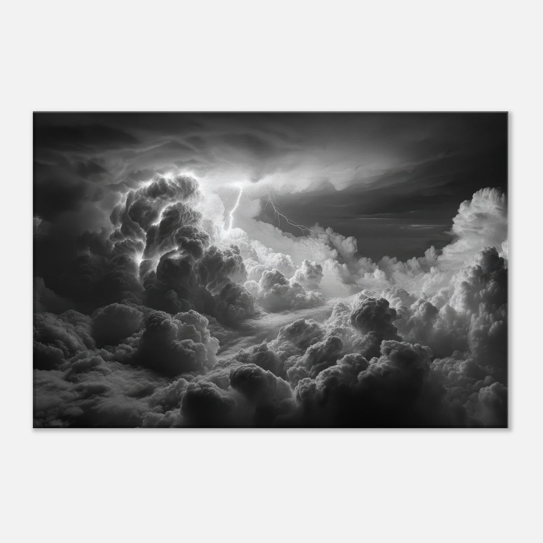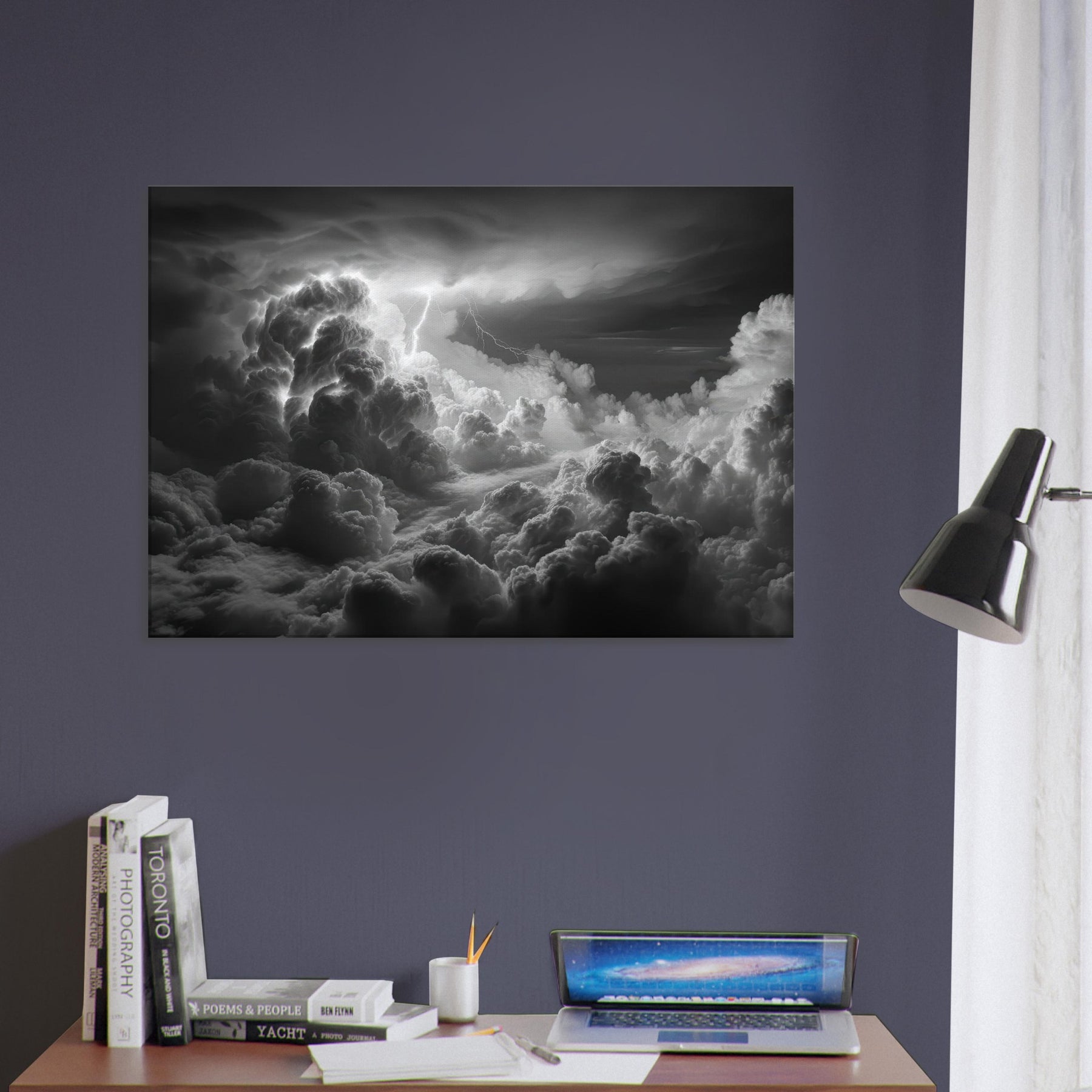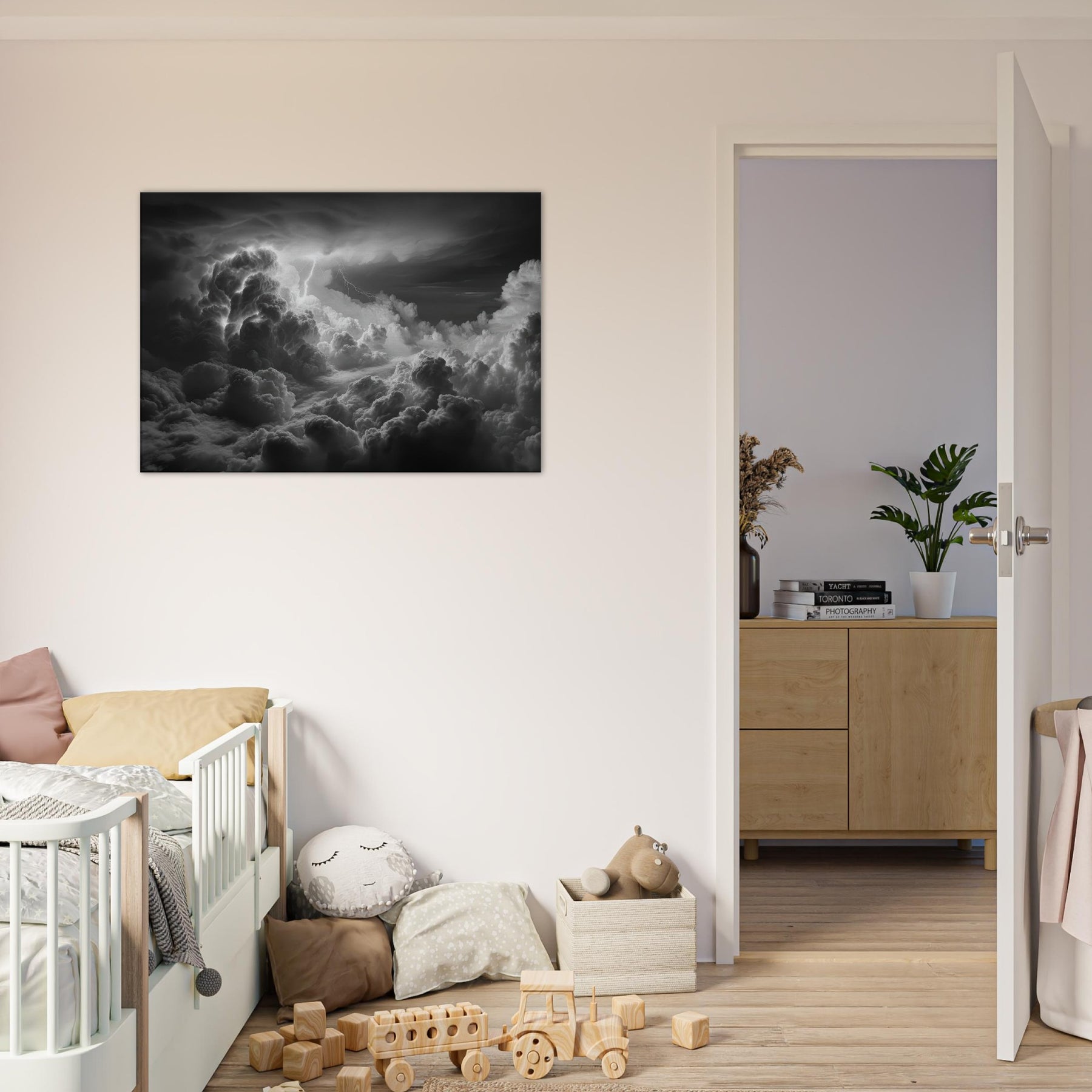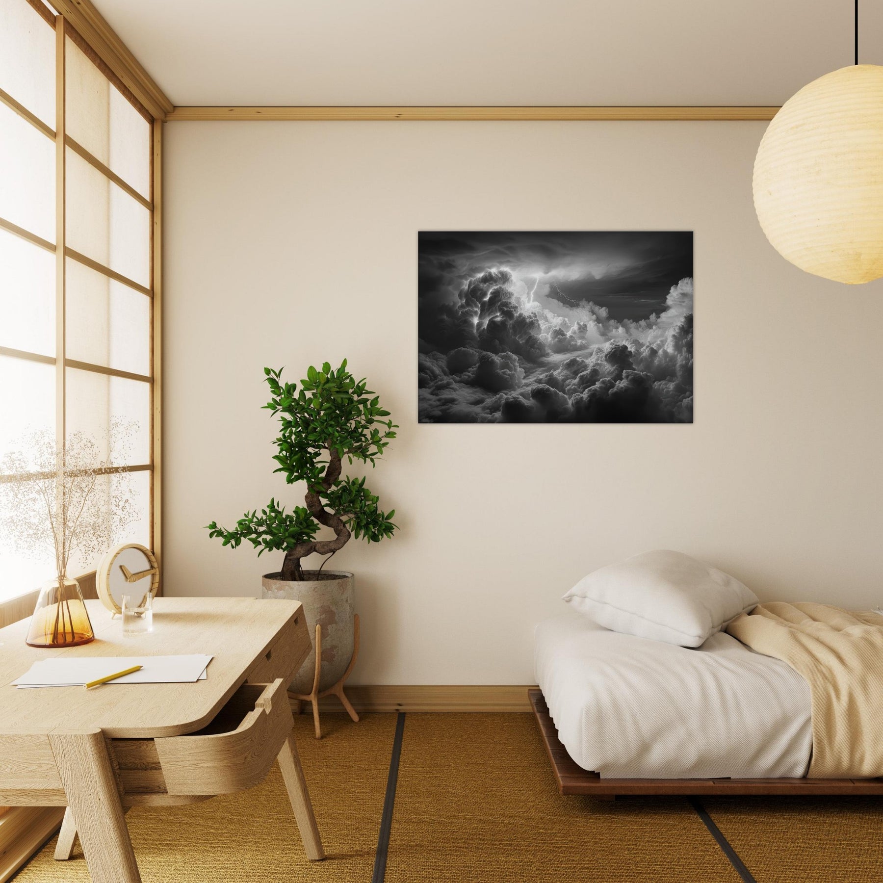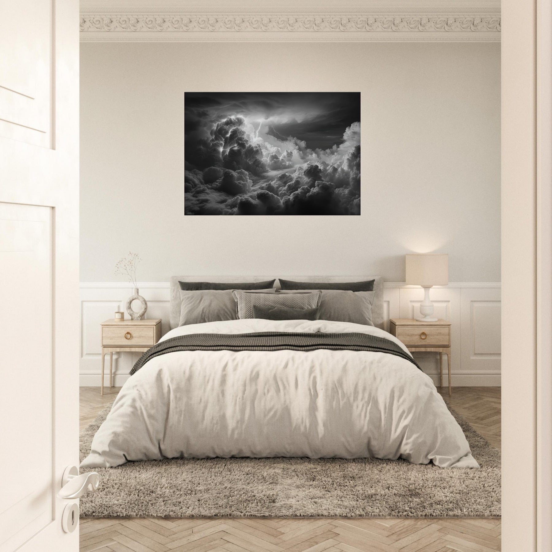 Zeus, the Primary Subject, rises through the storm, a silhouette of authority against a sea of luminous clouds. The black and white palette sharpens every flash of lightning and the hush that follows, inviting quiet contemplation while granting the room mythic gravity.