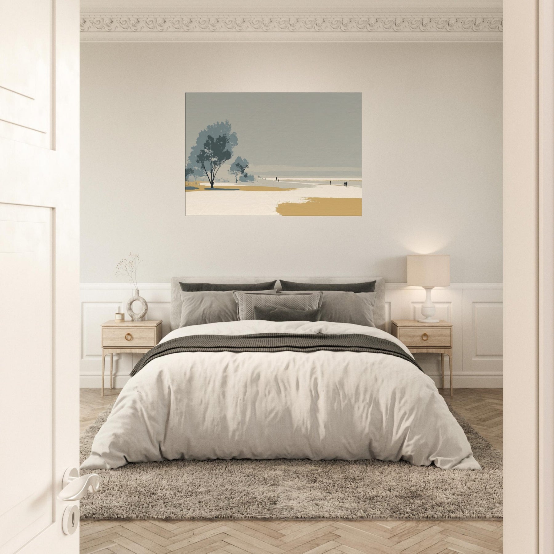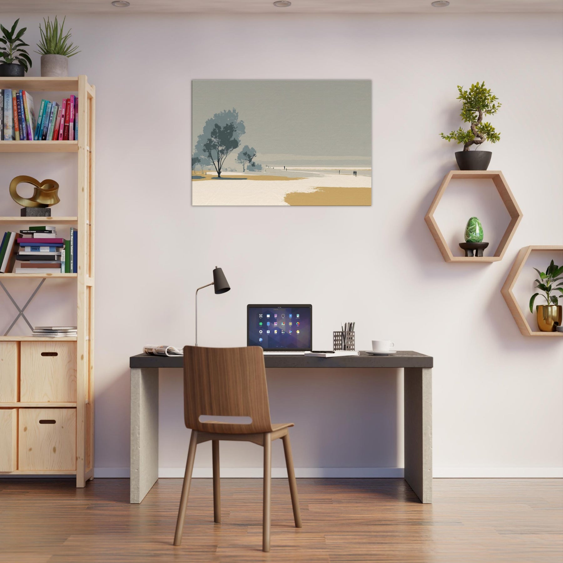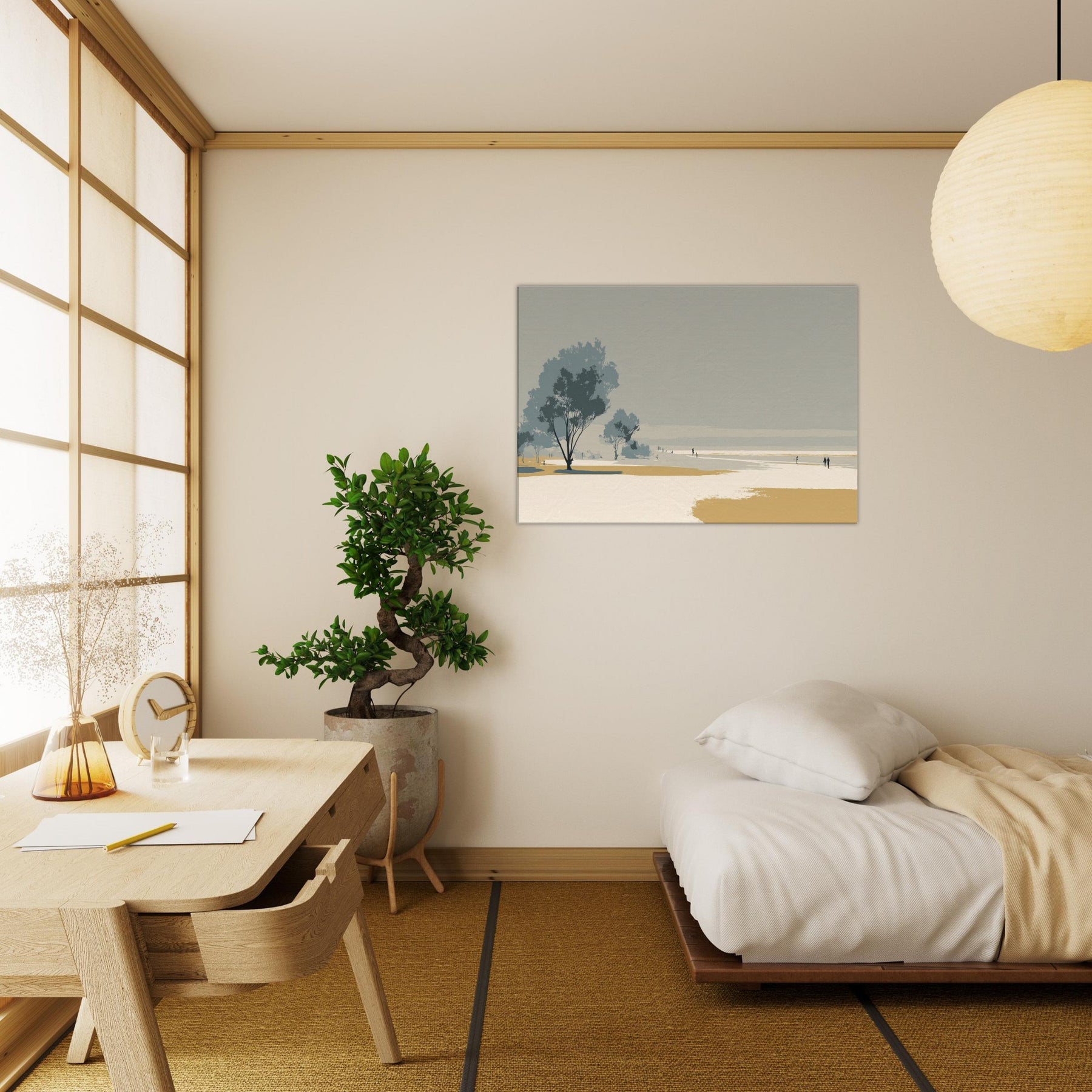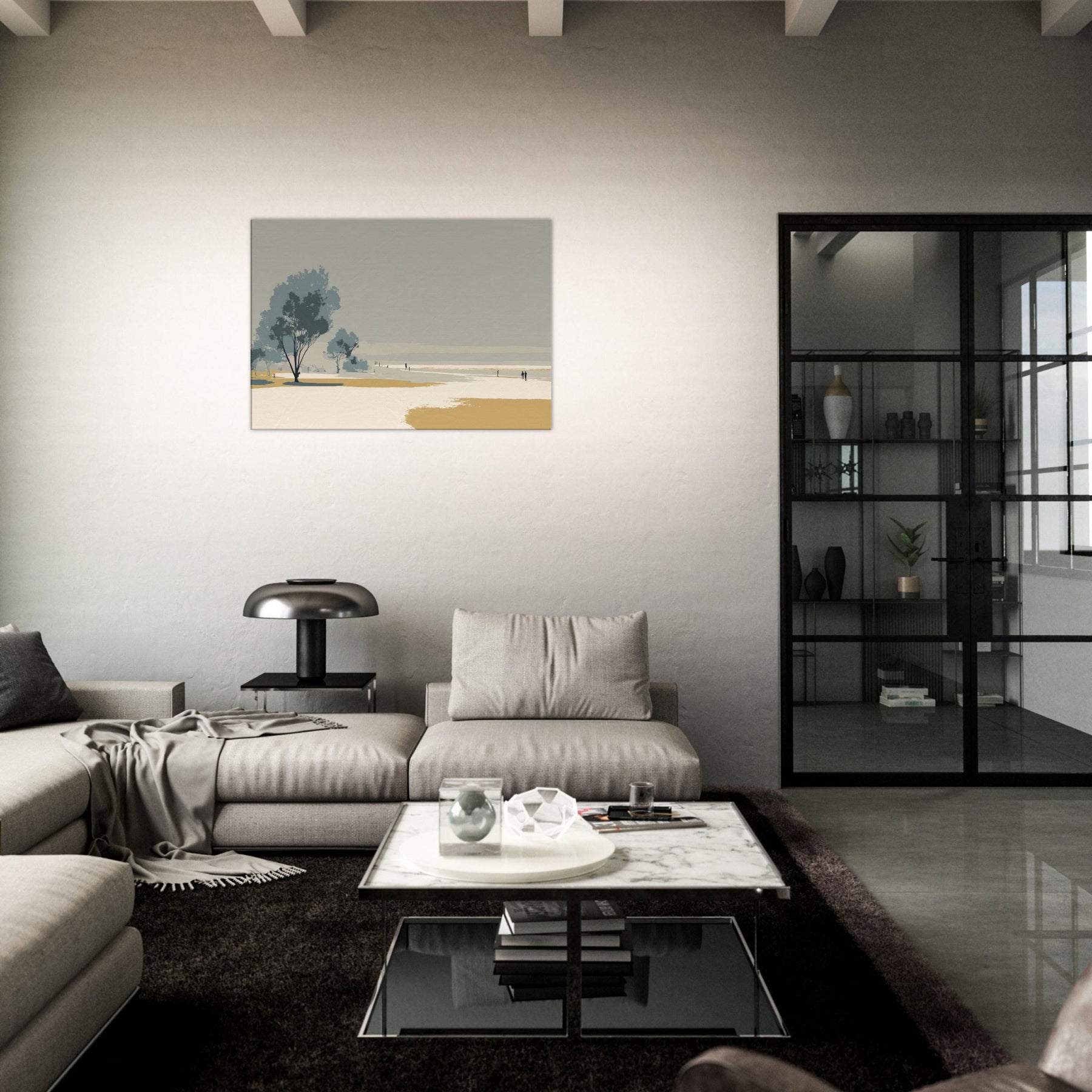 Let the Beach Minimalist scene wash your room in quiet light. Soft silhouettes of trees stand as gentle anchors along a sunlit shore, while expansive horizons invite the mind to rest. The restrained palette sand, sea gray, and muted blue whispers calm and clean, shaping a serene backdrop for conversation or contemplation. This artwork invites a sense of open air, turning a living space into a coastal retreat where every glance carries a breath of the sea.
