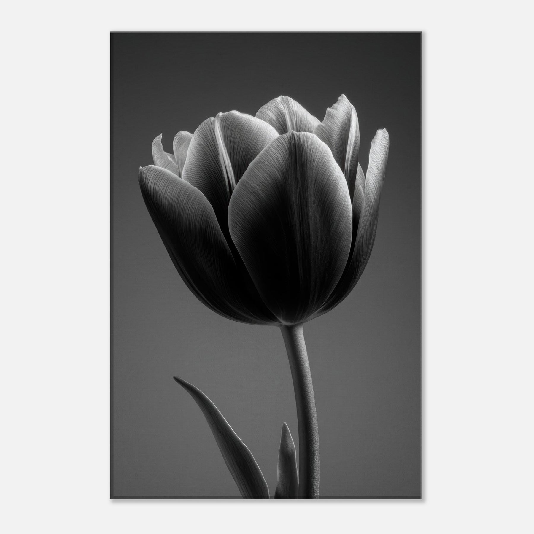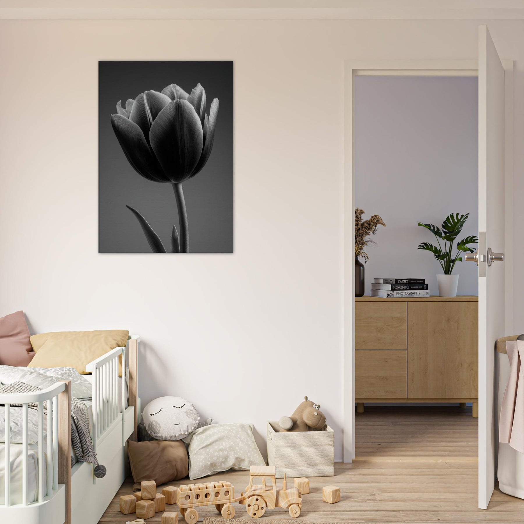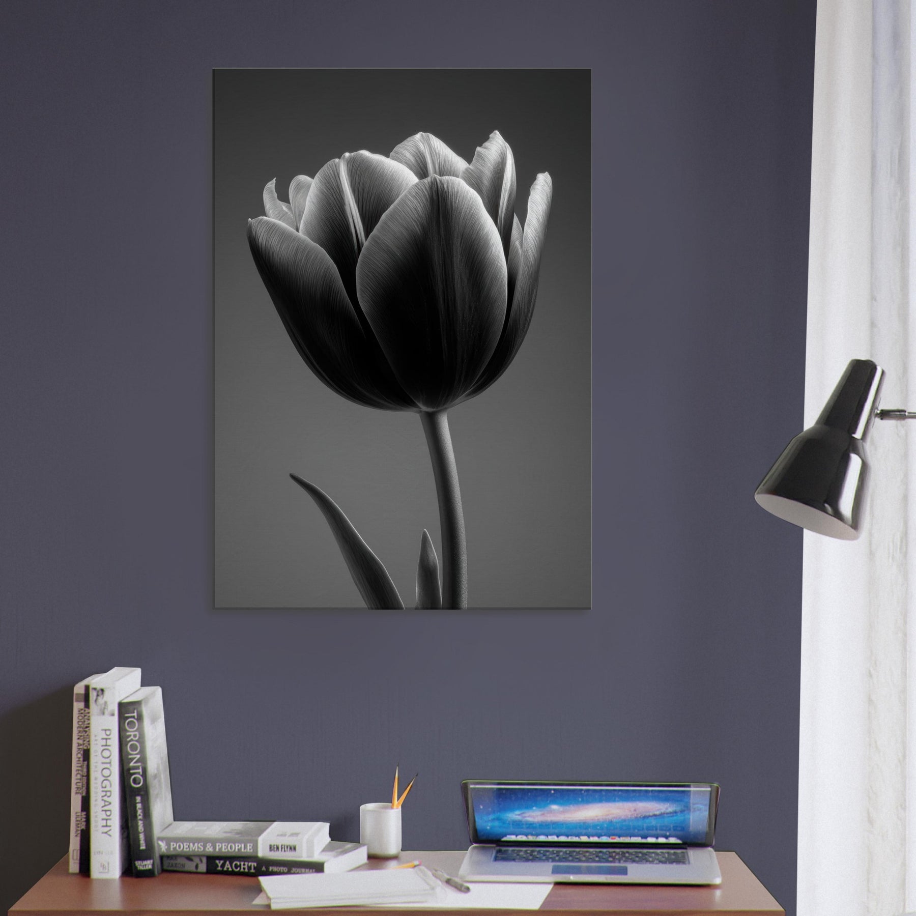 Softly lit and enduring, this Black and White Tulip radiates quiet grace. The petals unfold with restrained precision, revealing subtle veins and a tactile rhythm that invites a closer look. In monochrome, light and shadow become the bloom’s music, creating a serene focal point that calms a room while adding depth. Perfect for a living room or study, it offers nature’s elegance in a sculptural, timeless frame.