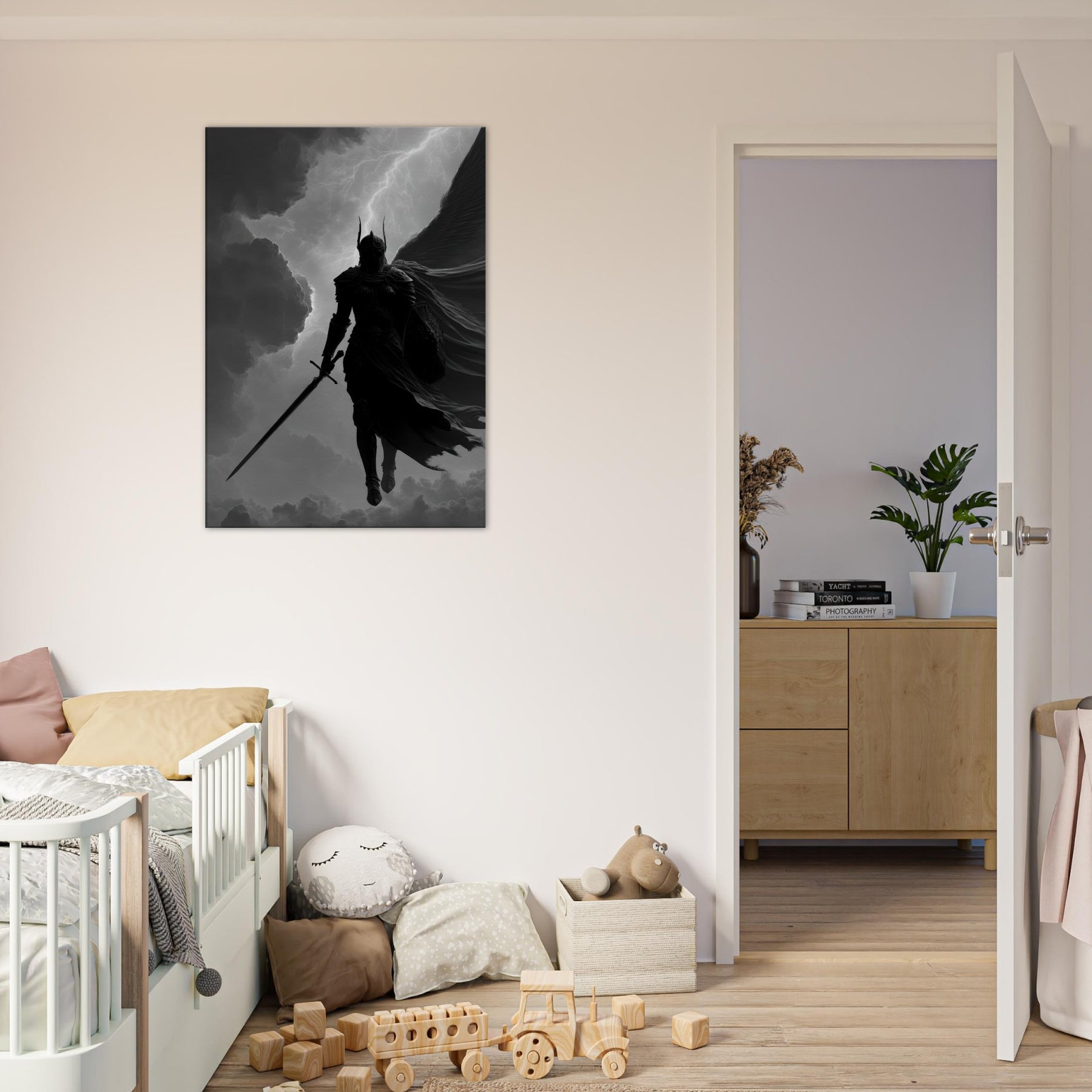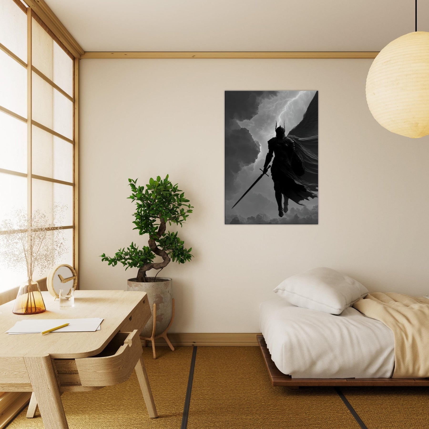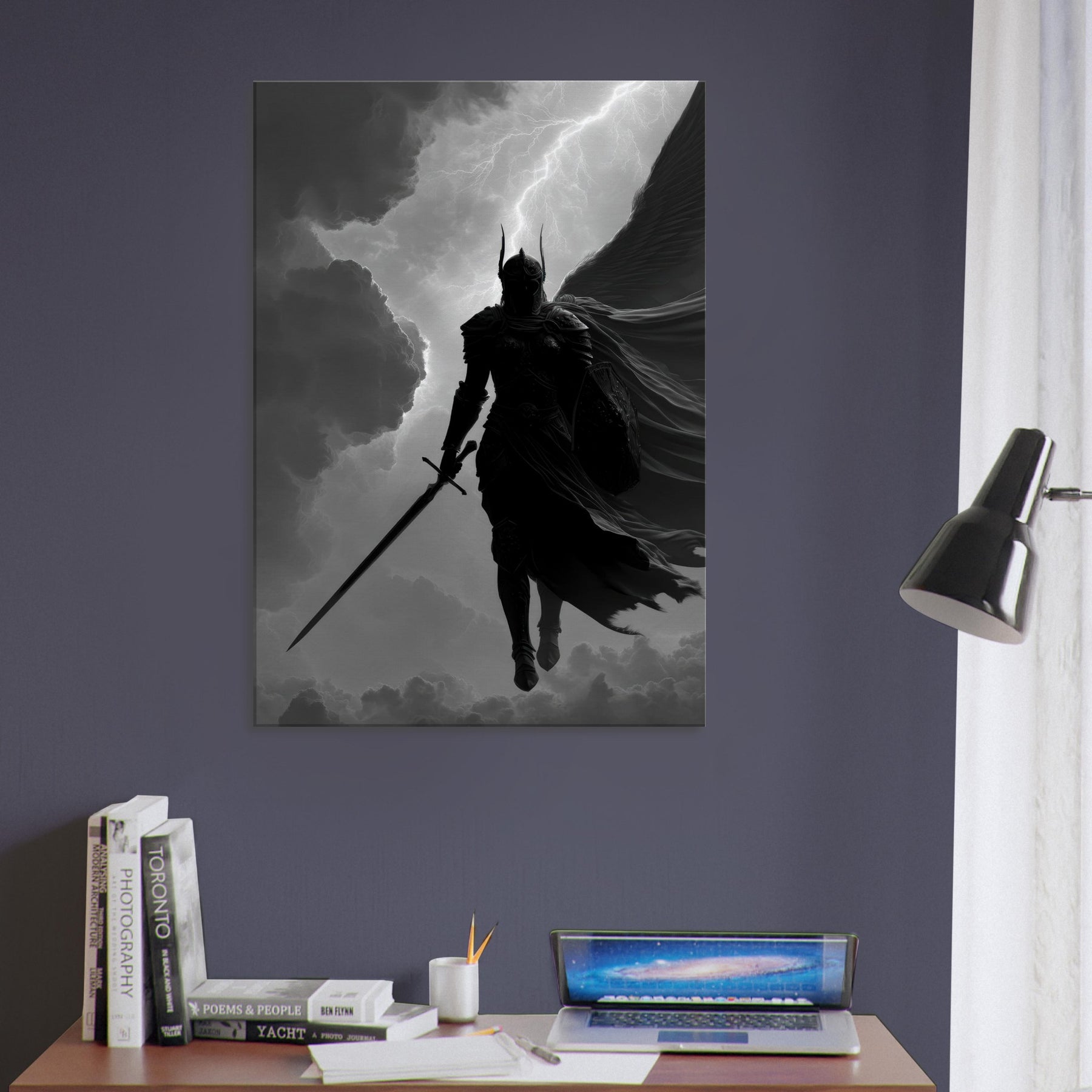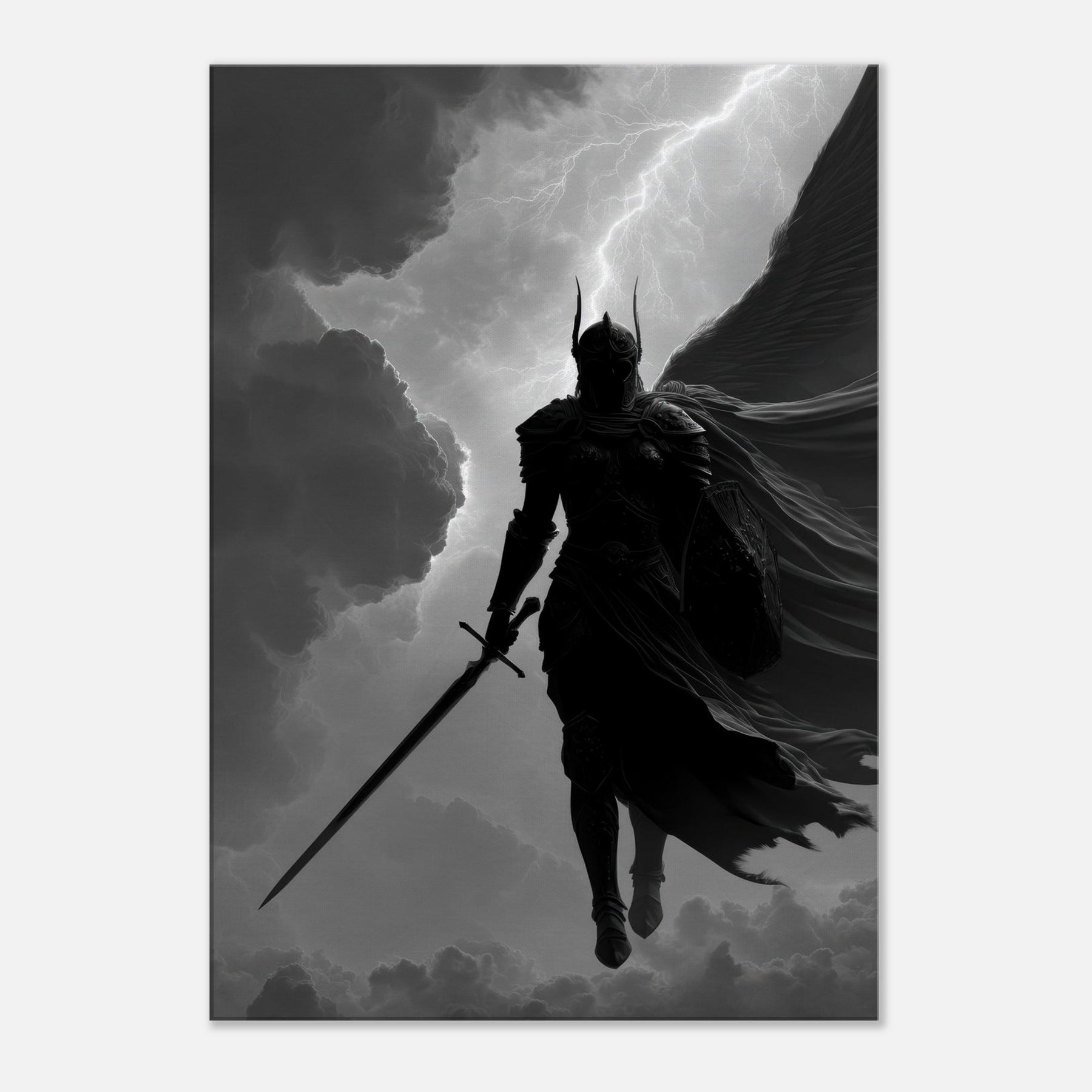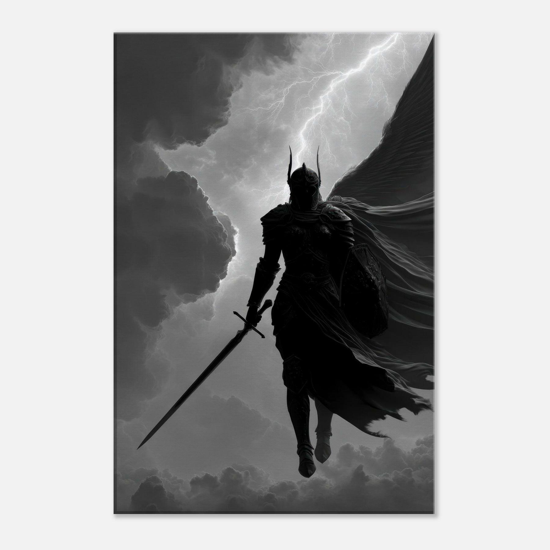 Let the Valkyrie descend from celestial storms into your living space, a study in tension and grace. This striking black and white image unfurls with wind swept cape and steel edged sword, casting nobility and courage against a moody, thunder sketched sky.
