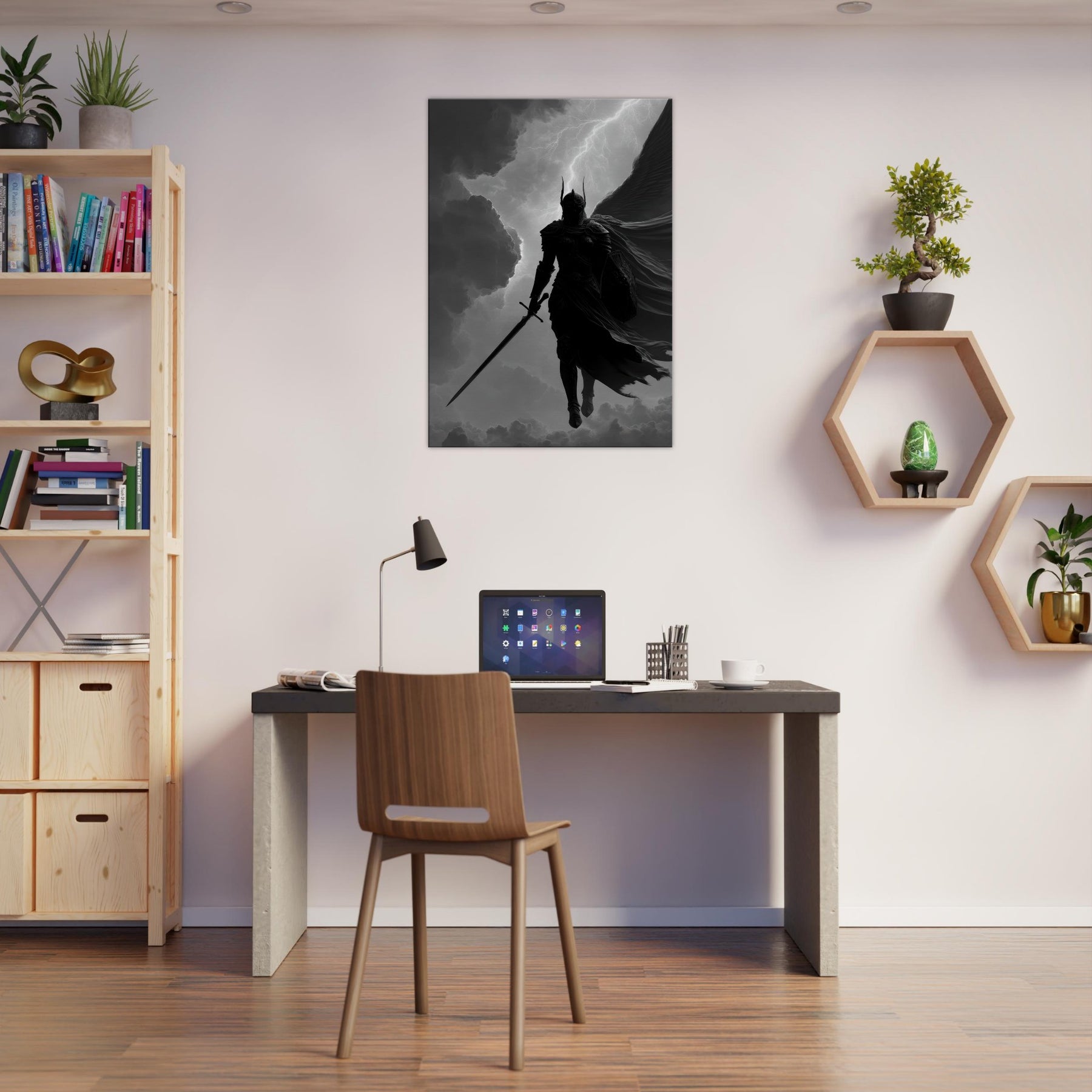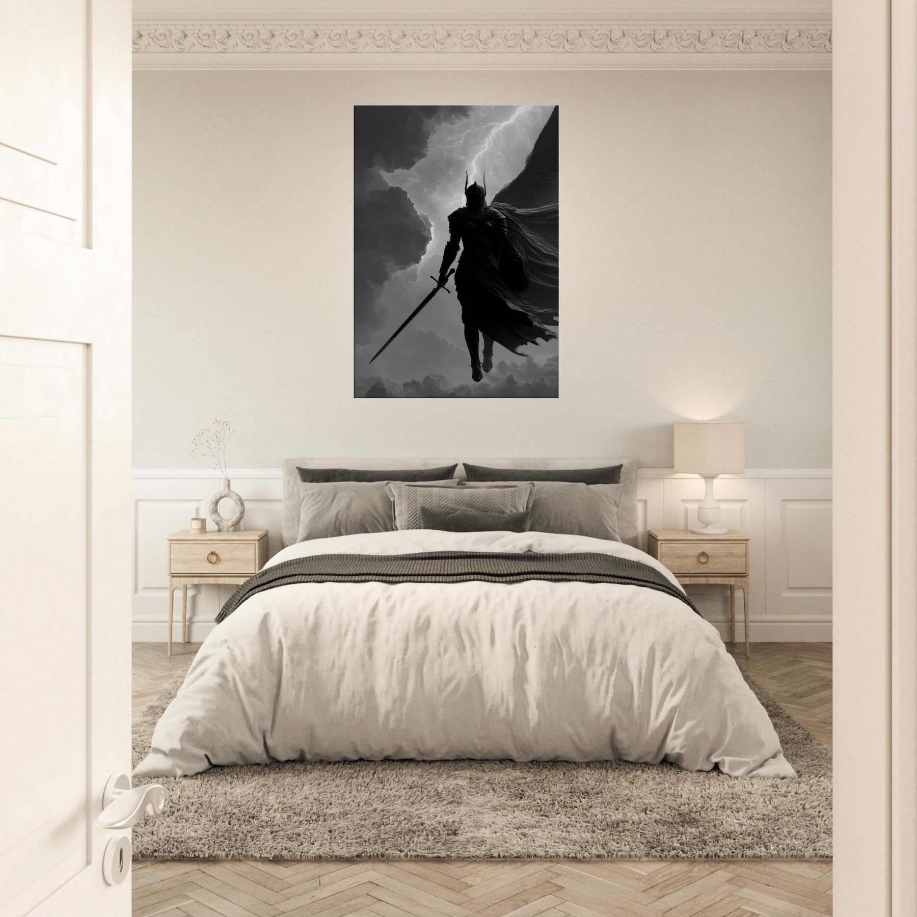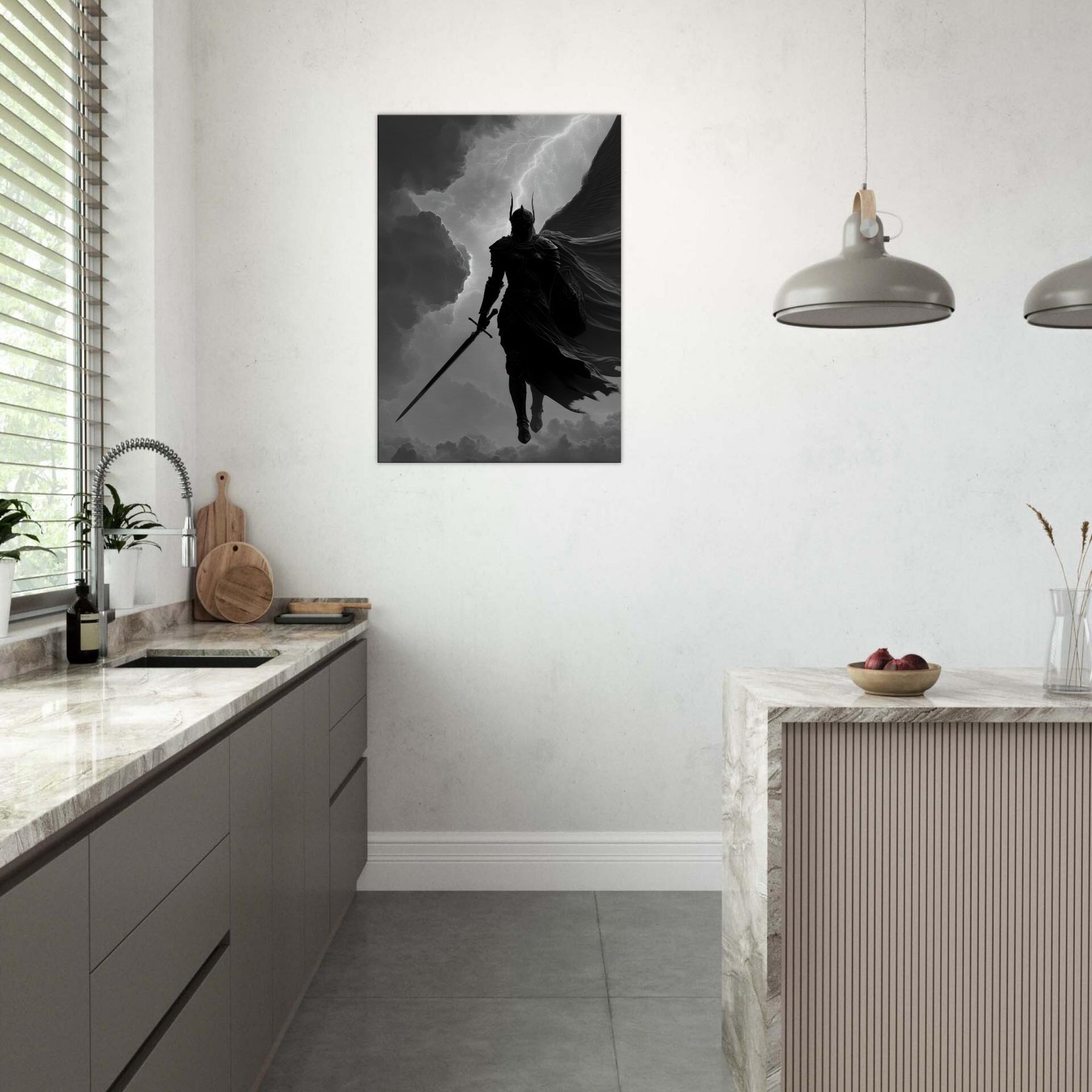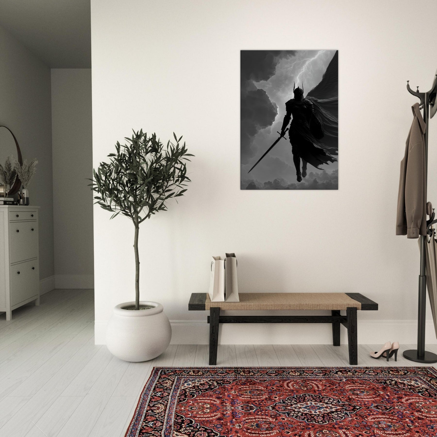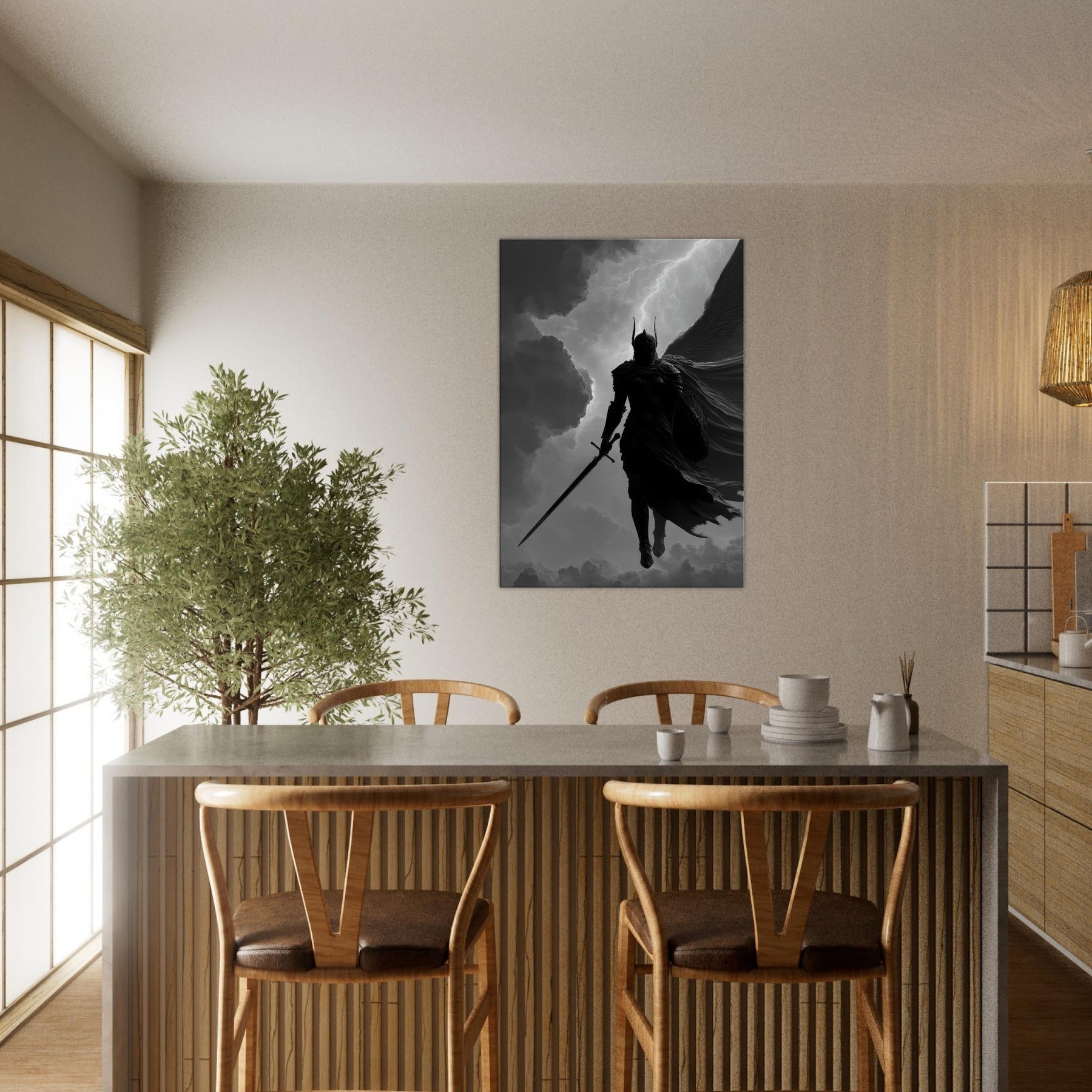 Let the Valkyrie descend from celestial storms into your living space, a study in tension and grace. This striking black and white image unfurls with wind swept cape and steel edged sword, casting nobility and courage against a moody, thunder sketched sky.
