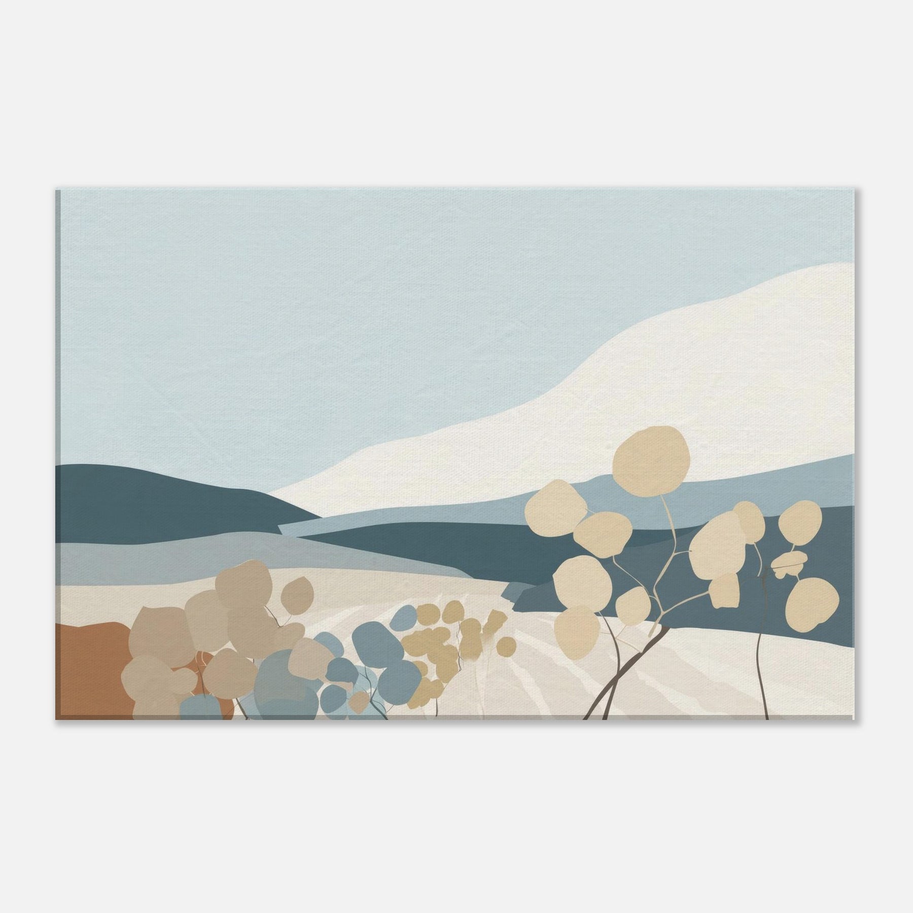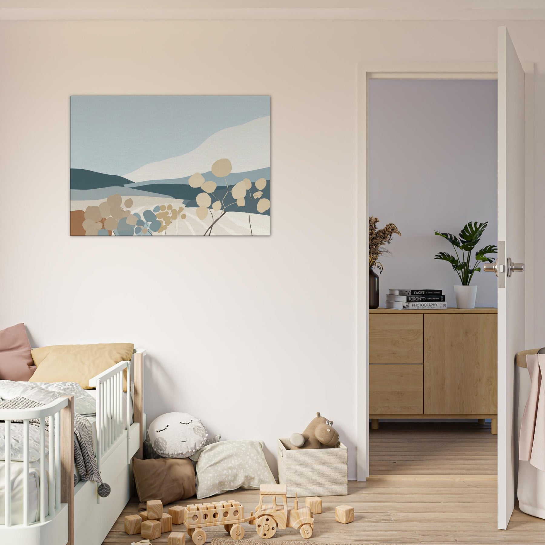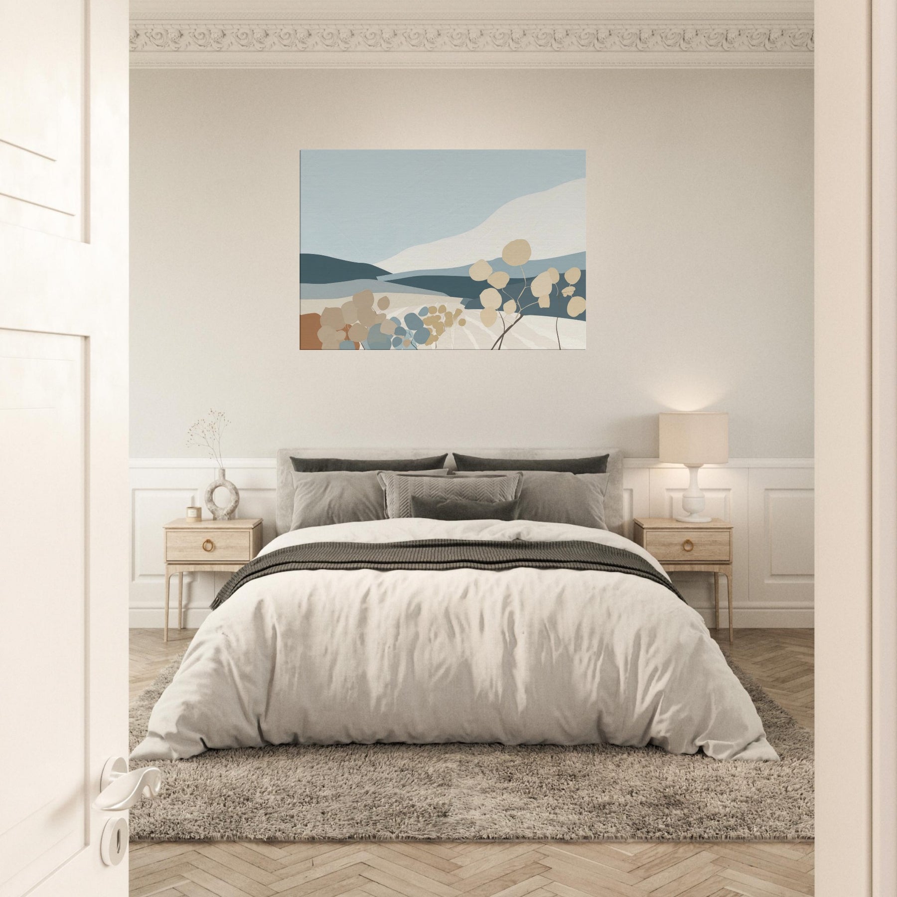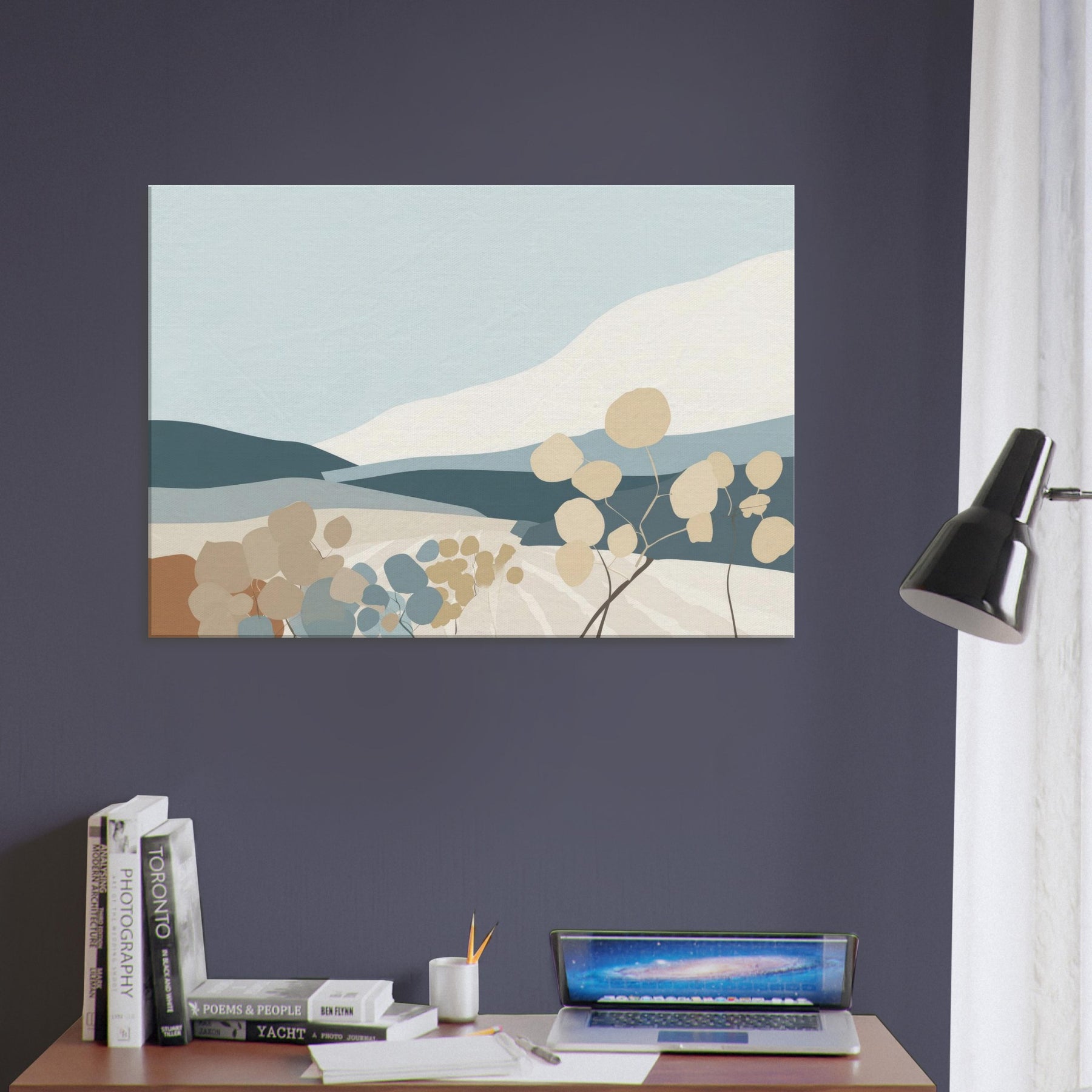 The Vineyard unfolds in soft, pared down forms, settling into a room like a quiet afternoon. This minimalist invites calm through gentle curves and a restrained palette of creams, blues, and earthy tones. The Vineyard feels almost memory like the subject softened into space, warmth and welcome radiating from the scene. Hang it where morning light spills across a sofa or entryway; it breathes atmosphere, expanding your living space and inviting peaceful, lingering conversations.