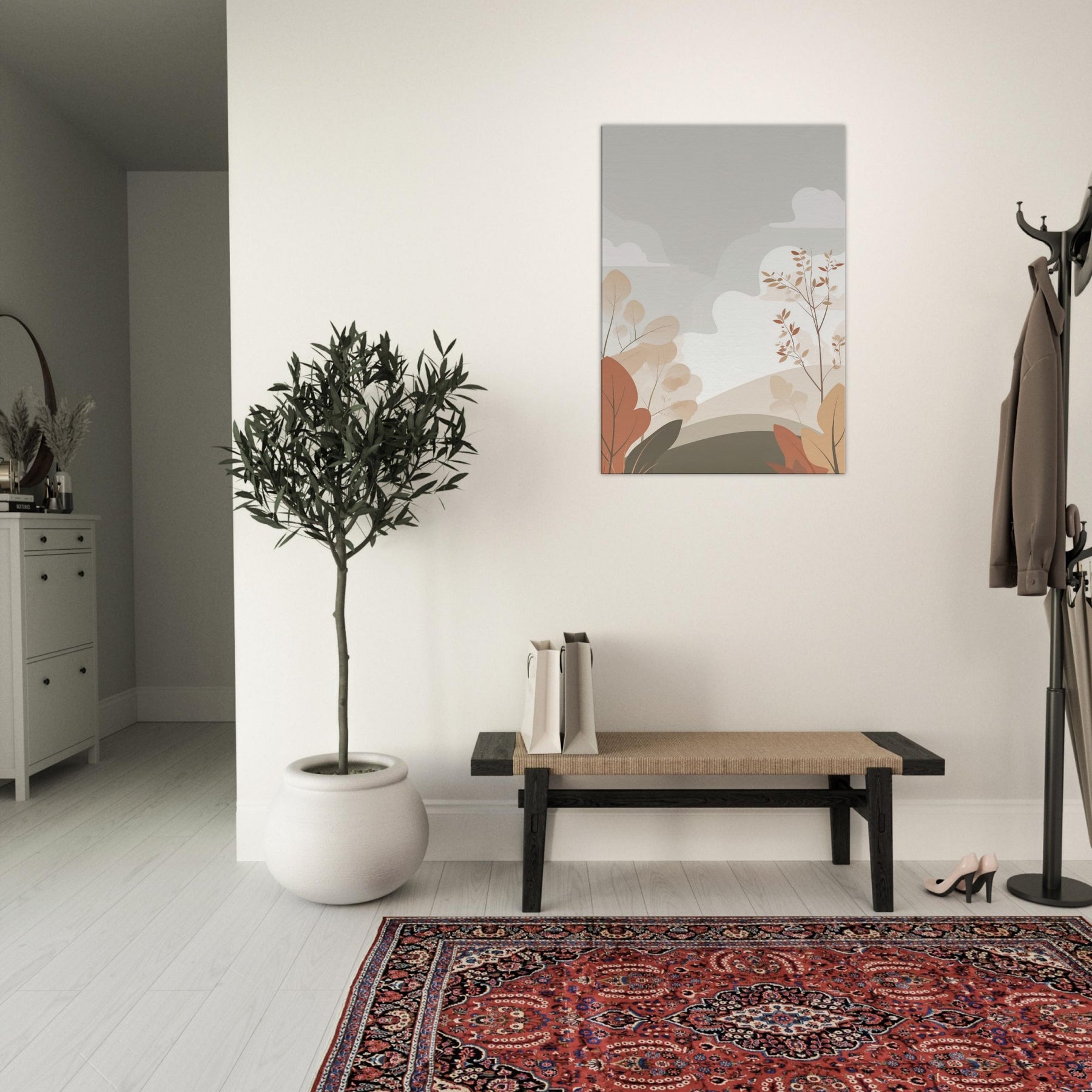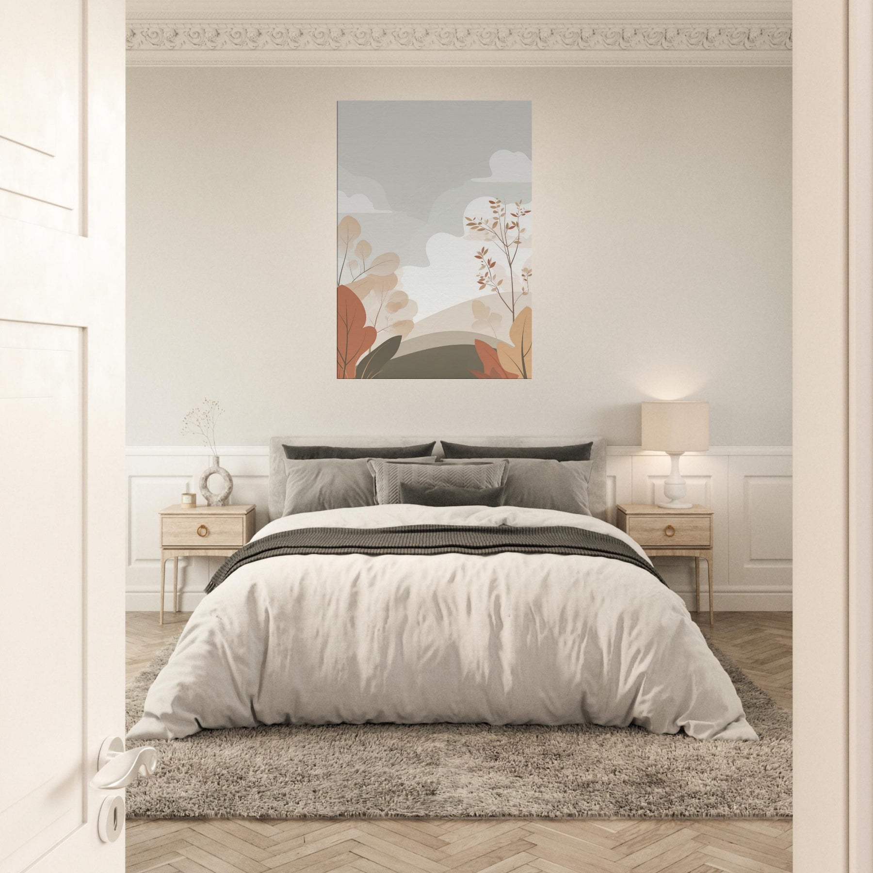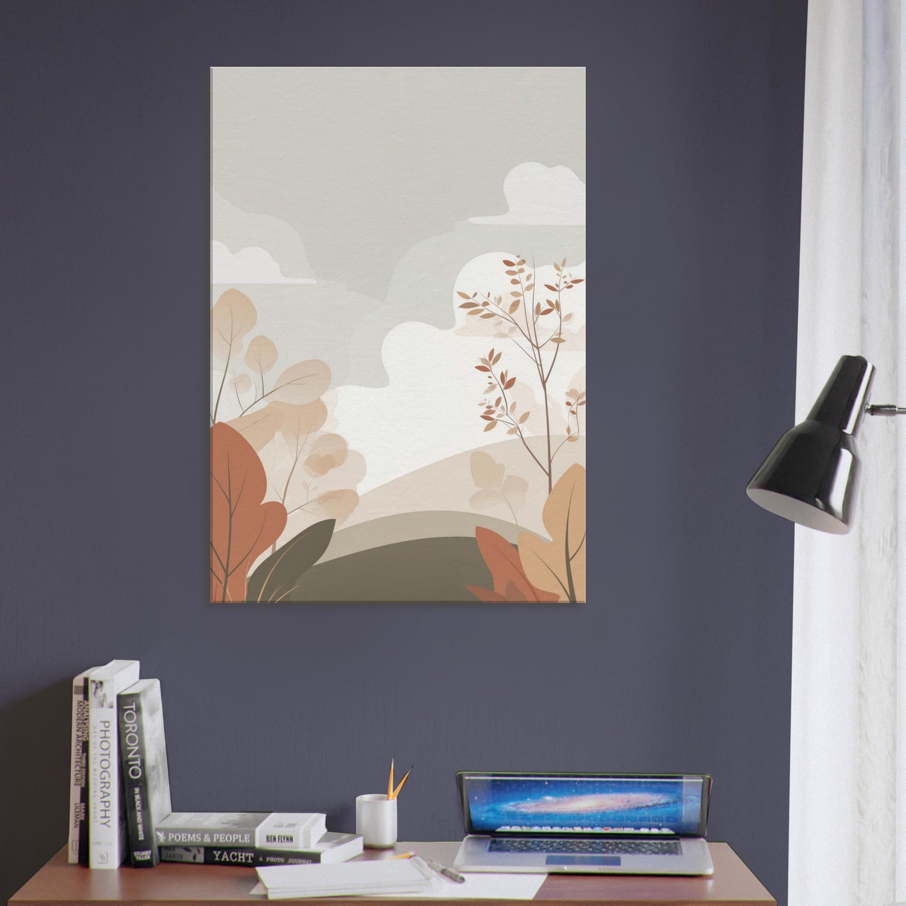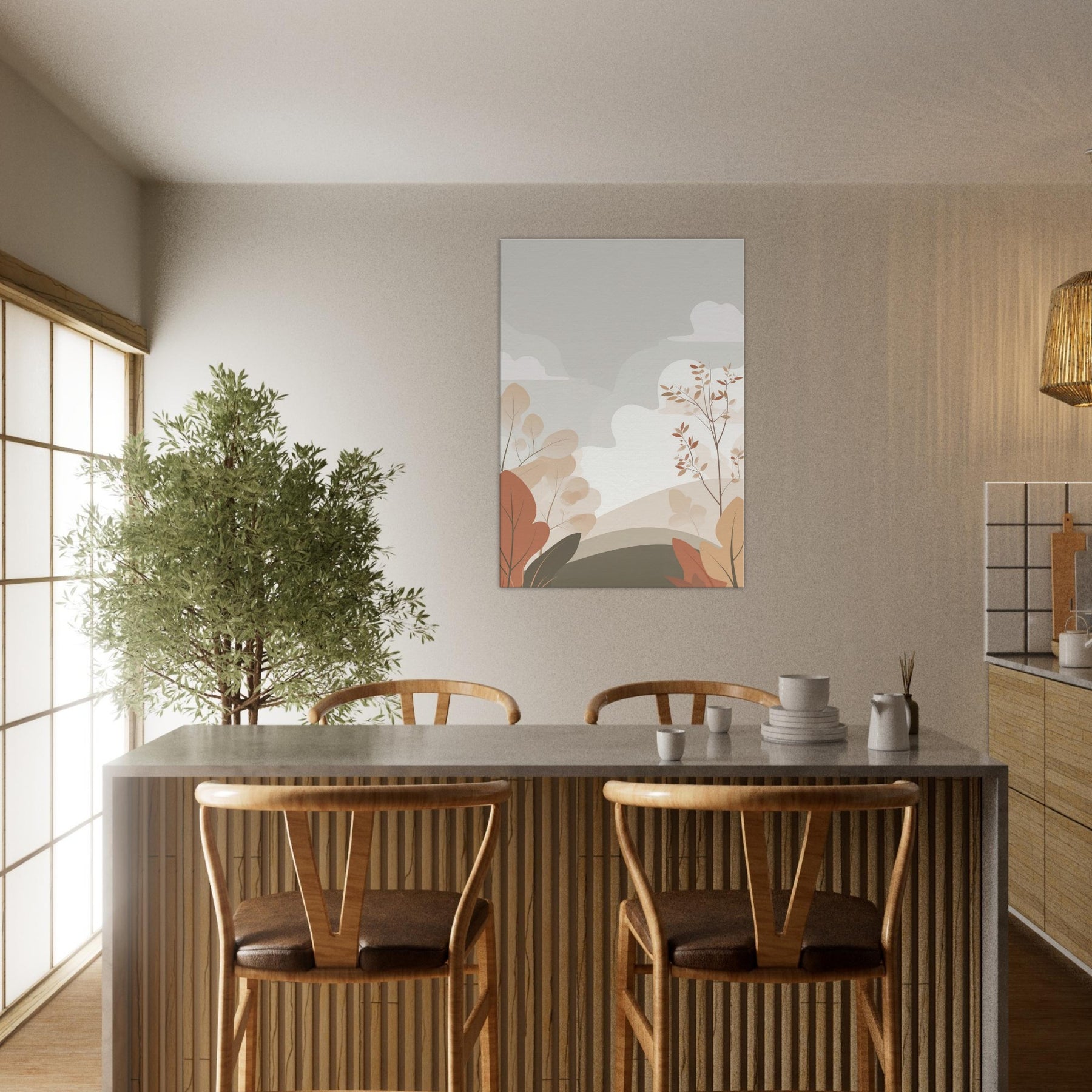 Vineyard unfolds in a tranquil morning, where soft ochre and sage drift over muted hills. This minimalist study of nature captures light kissing leaves, inviting quiet reflection in any living space. The Vineyard is rendered in gentle silhouettes and warm earth tones, creating room to breathe and dream. Hang it above a sofa or in a corridor to awaken calm, connection to the outdoors, and a subtle sense of spacious serenity.