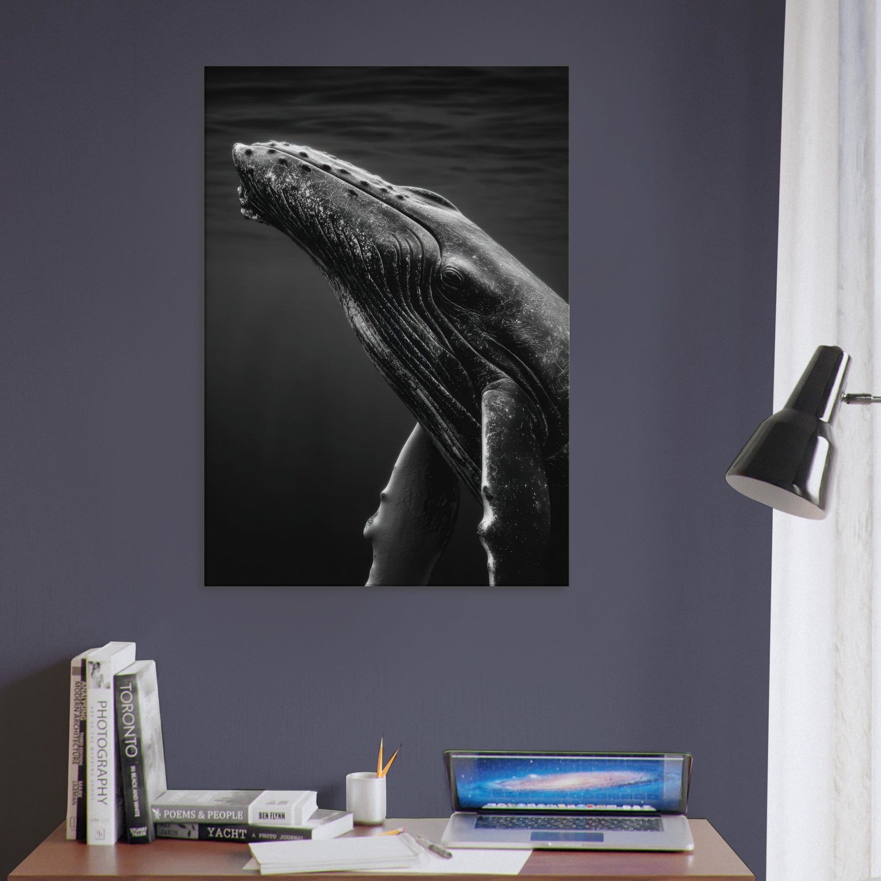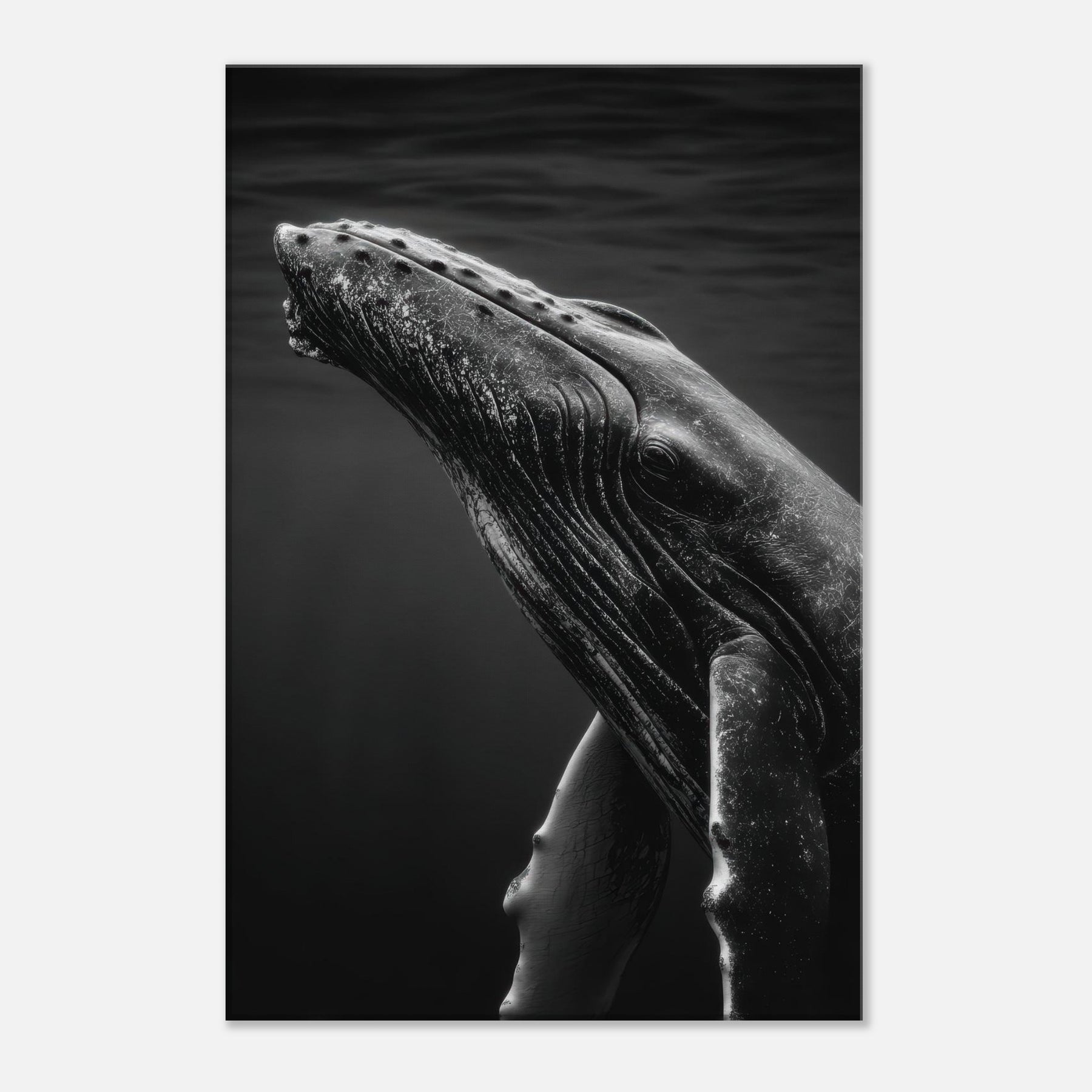 Rendered in stark black and white, this captures a Whale arching toward the light, its skin etched with lines that feel like wind swept water and ancient weather. The high contrast tones lend a tranquil gravity, turning a wall into an oceanic stillness where breath and time seem to slow. This work invites quiet contemplation and pairs beautifully with soft textures and natural materials, anchoring a living space with a sense of depth, movement, and understated drama centered on the whale.