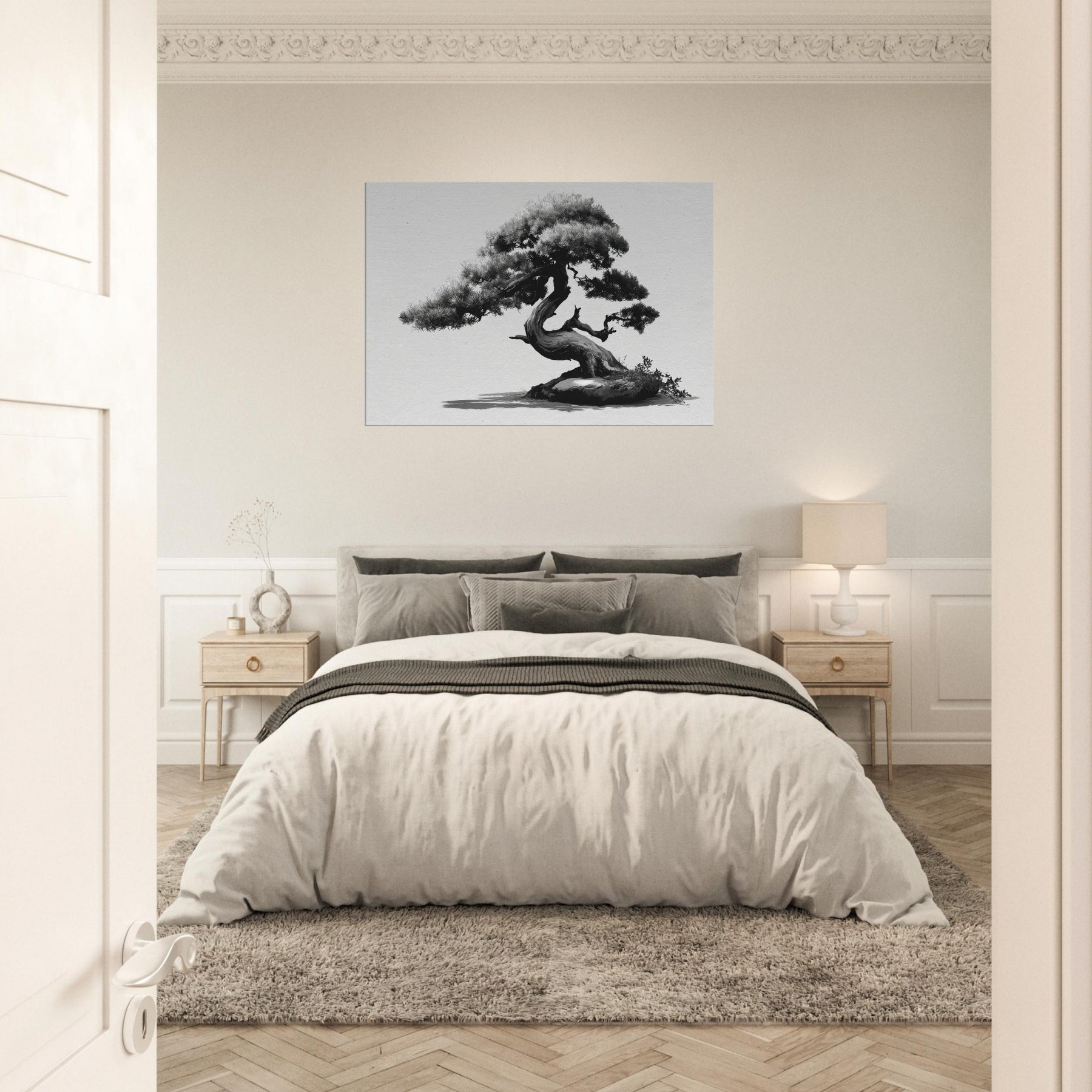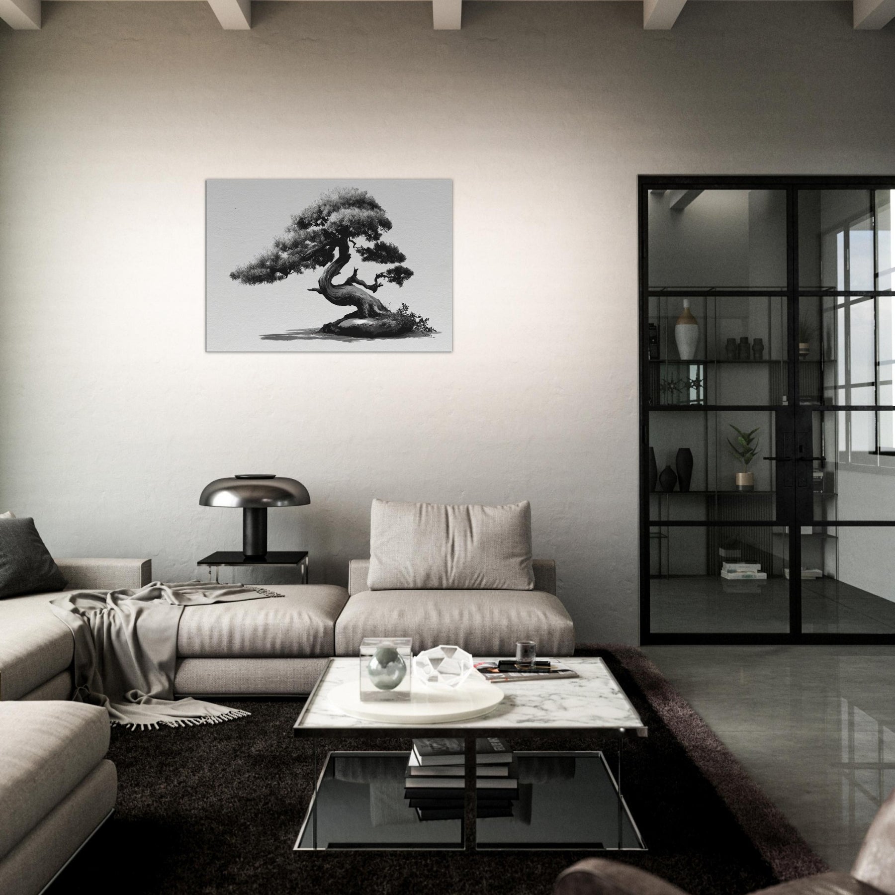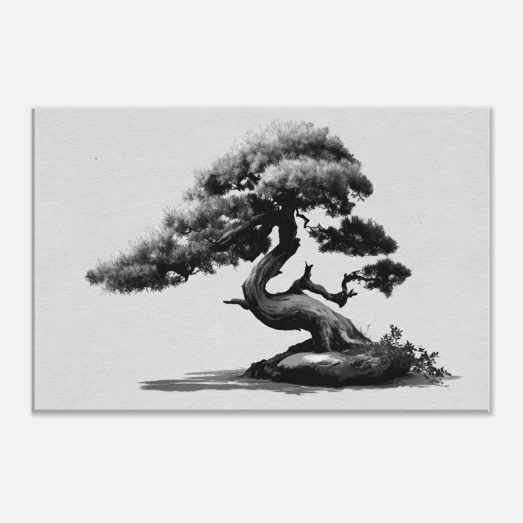 Like a whispered oath to restraint, this piece centers the room with timeless grace. This black and white study of form balances weight and elegance, inviting you to linger on each graceful curve of the trunk and needles.