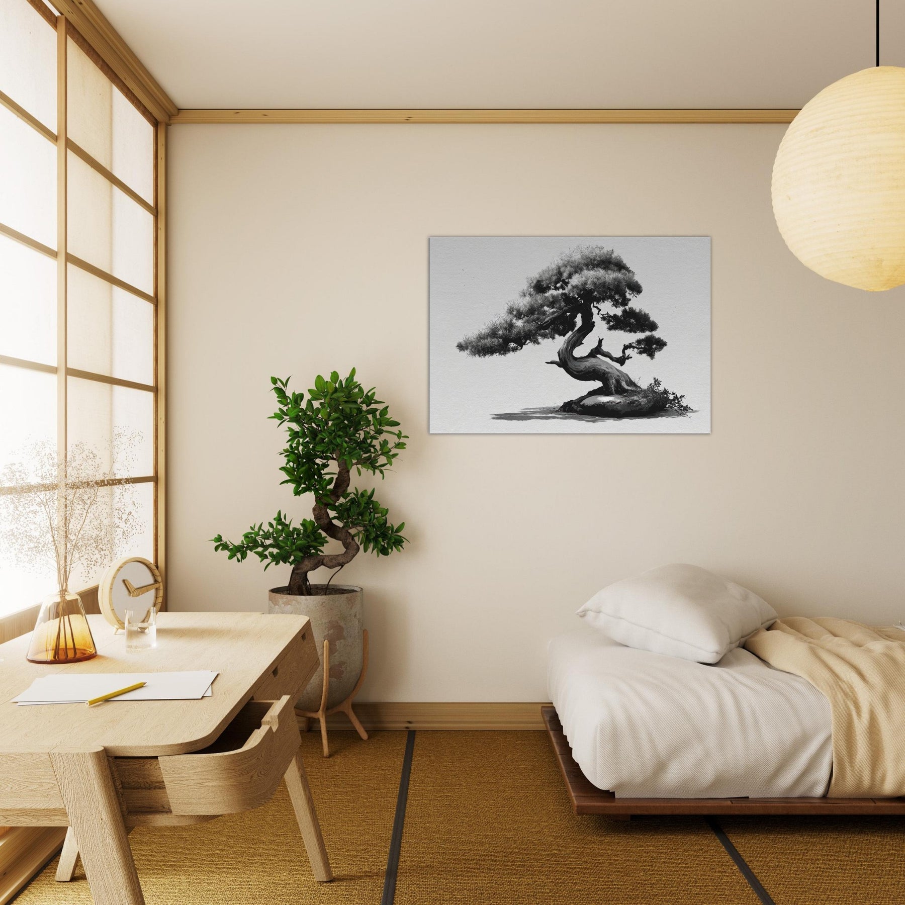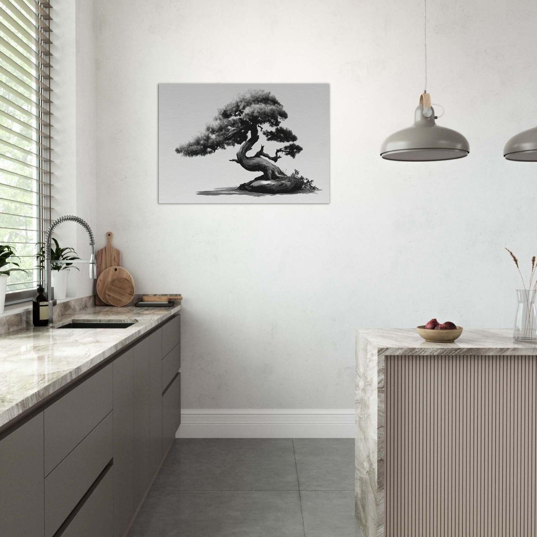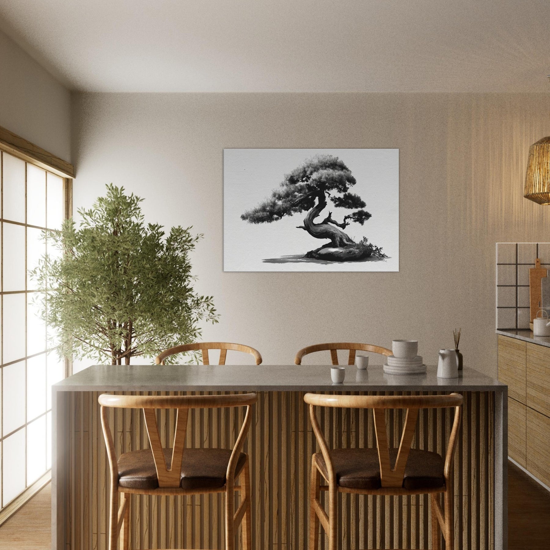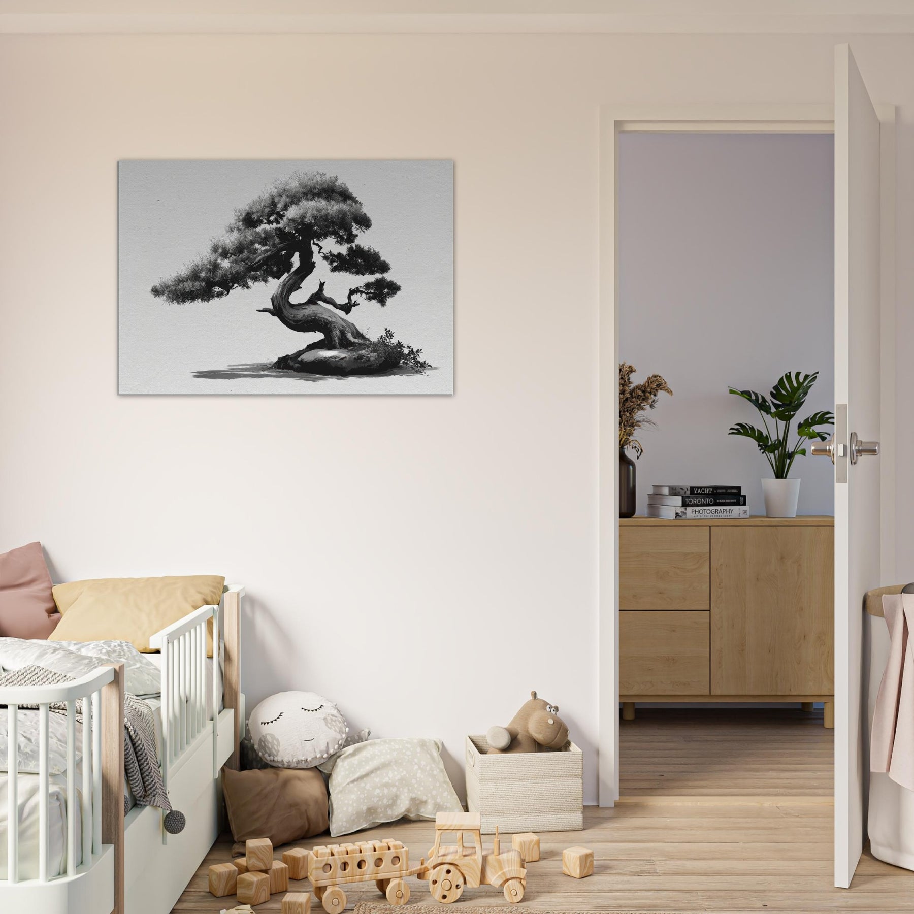 Like a whispered oath to restraint, this piece centers the room with timeless grace. This black and white study of form balances weight and elegance, inviting you to linger on each graceful curve of the trunk and needles.
