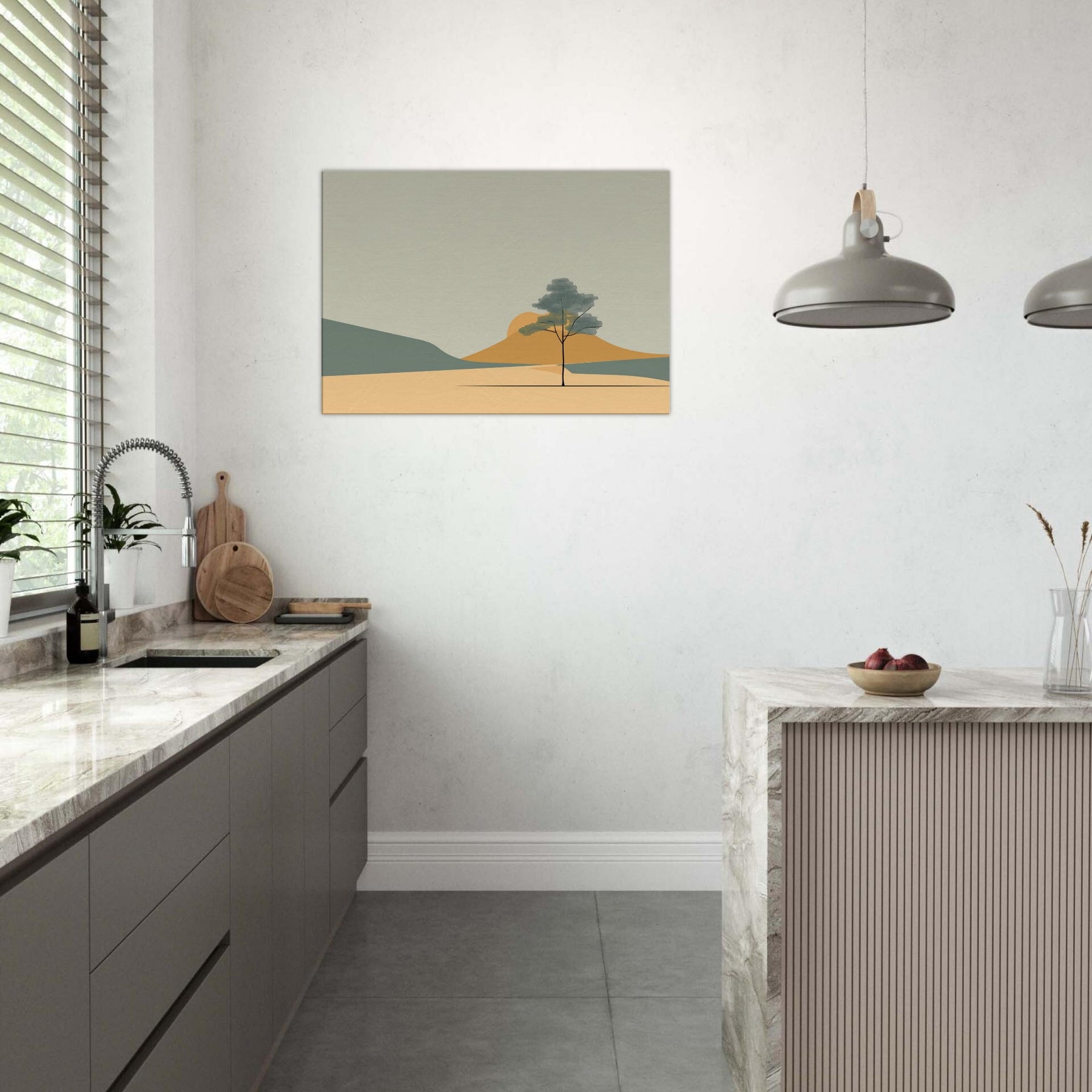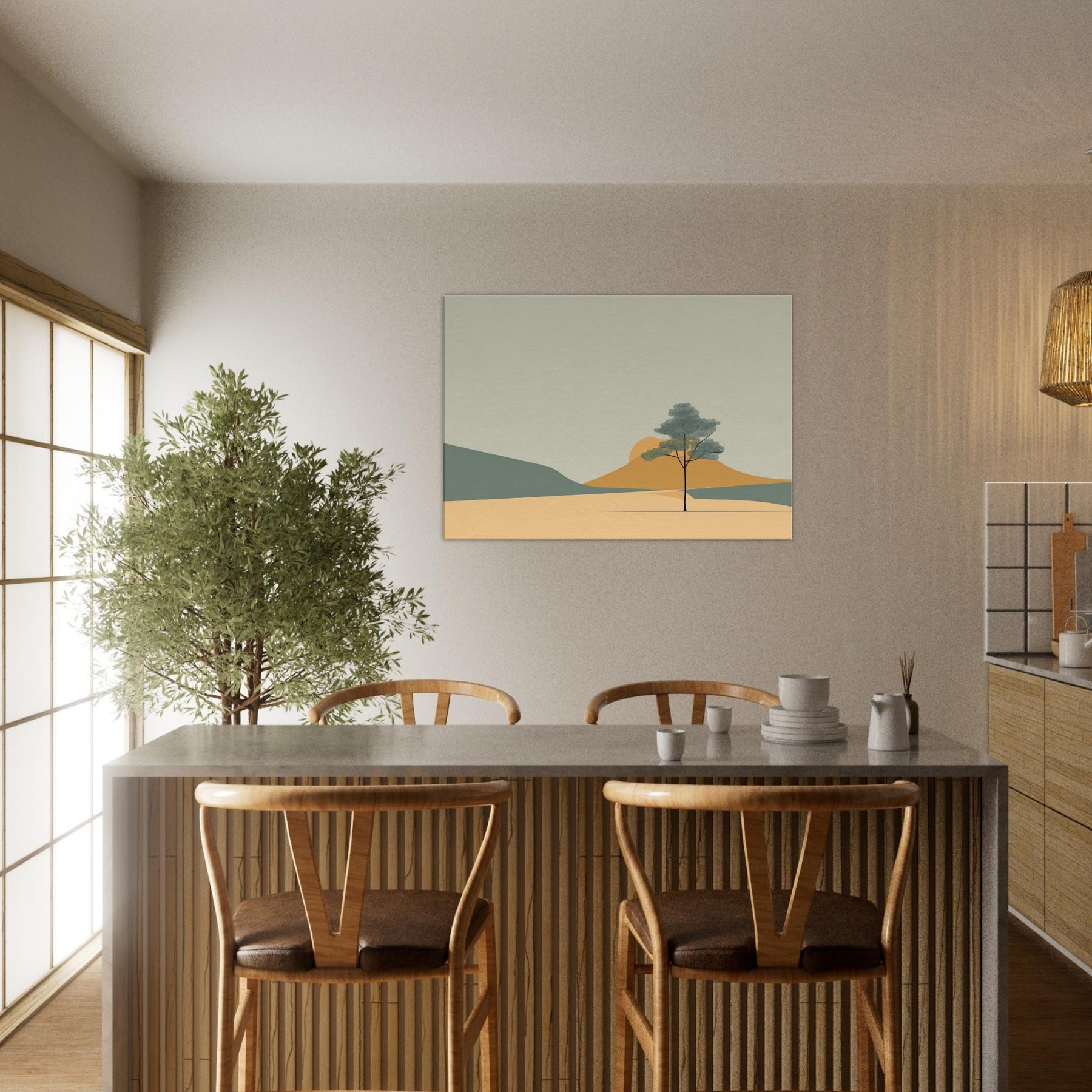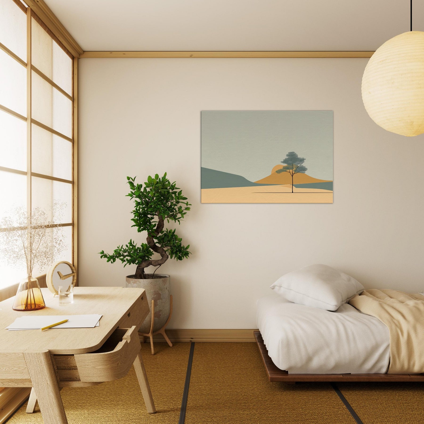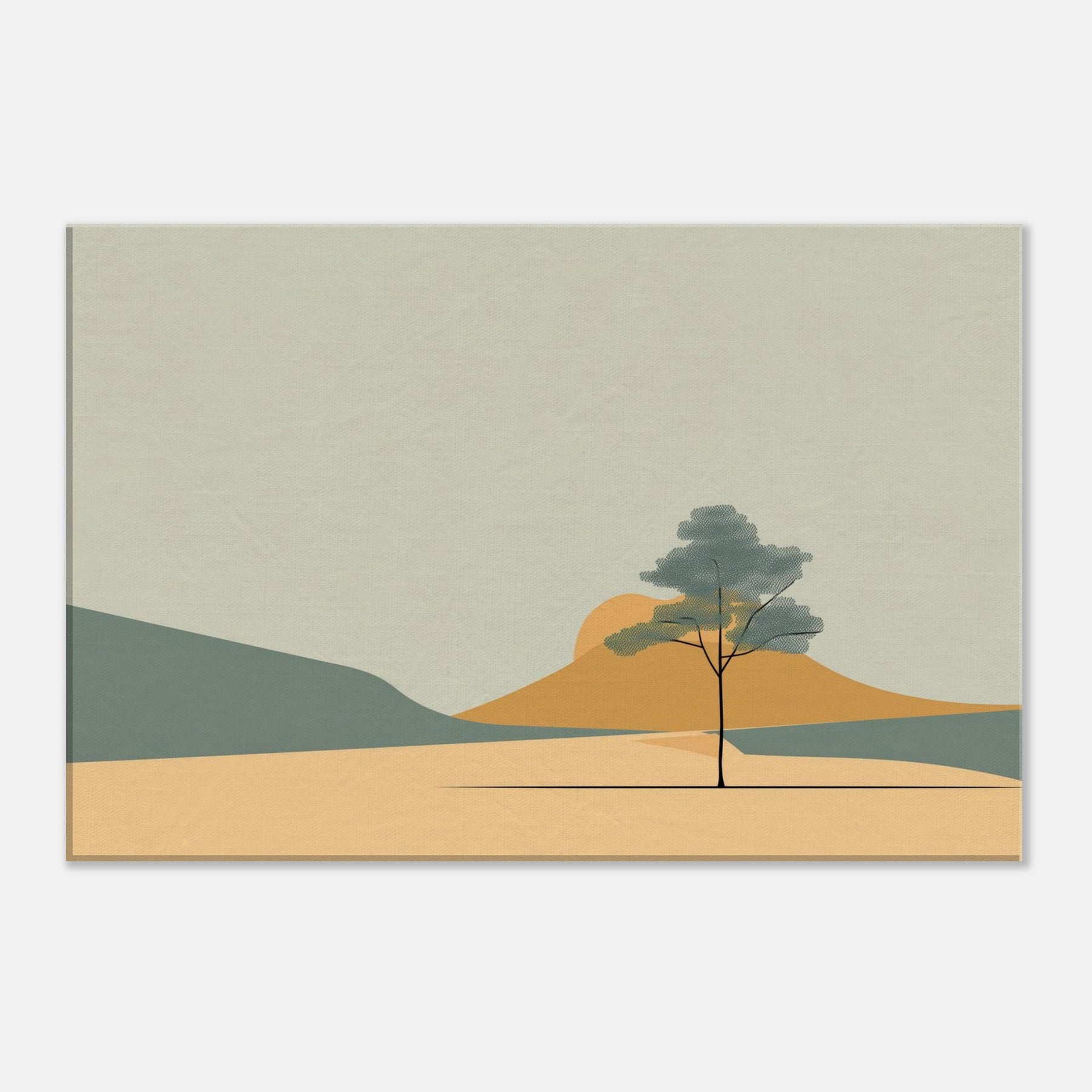 Zen Garden Rake Lines invites a calm hush into any space. The minimalist scene gathers soft sands, distant hills, and a lone tree in contemplative balance, capturing a moment of stillness as light shifts across the palette. Its restrained shapes and gentle tones echo a meditative breath, turning a living room or study into a sanctuary where worry loosens and focus returns. The primary subject, Zen Garden Rake Lines, becomes a quiet compass for daily life, a subtle reminder to pause, breathe, and simply be.