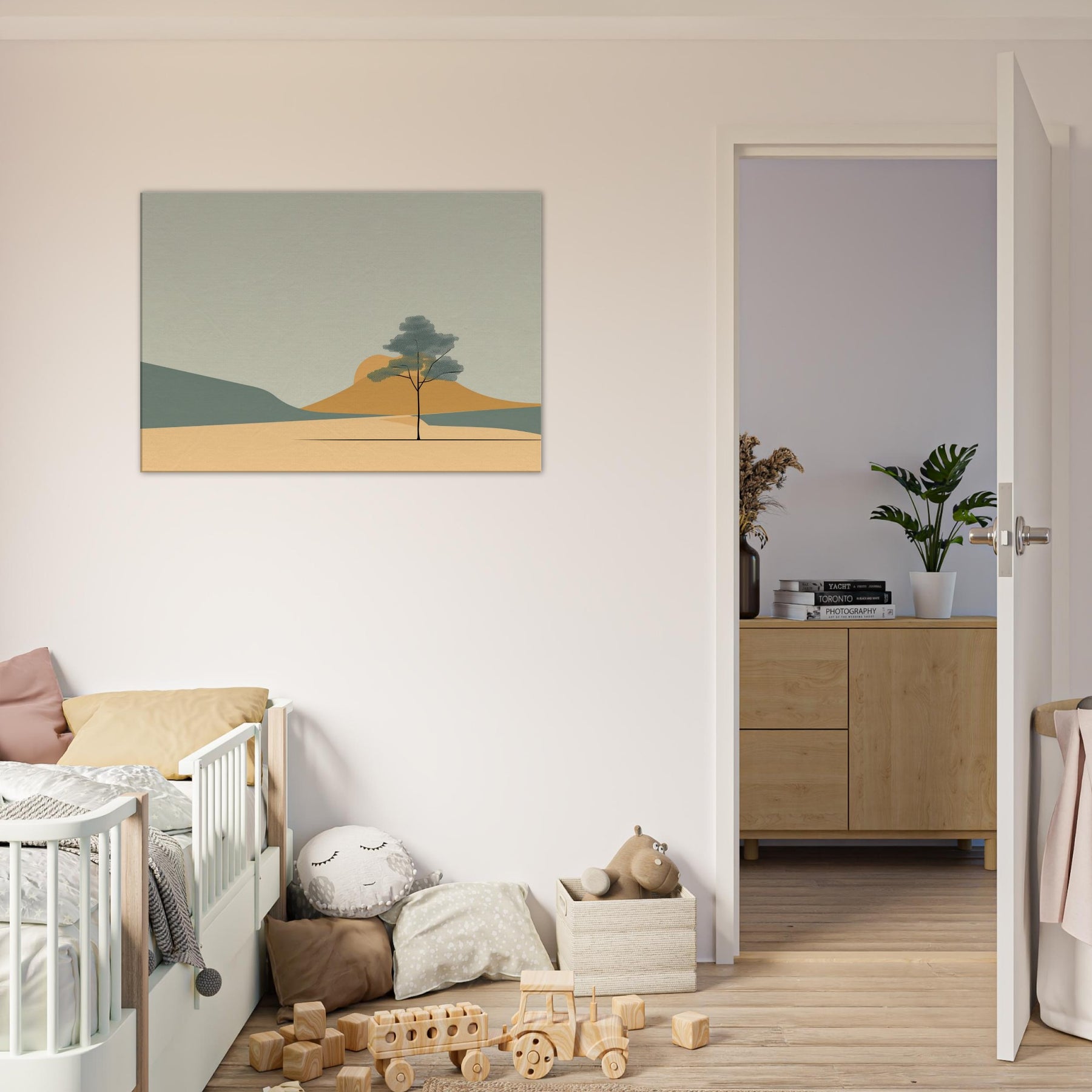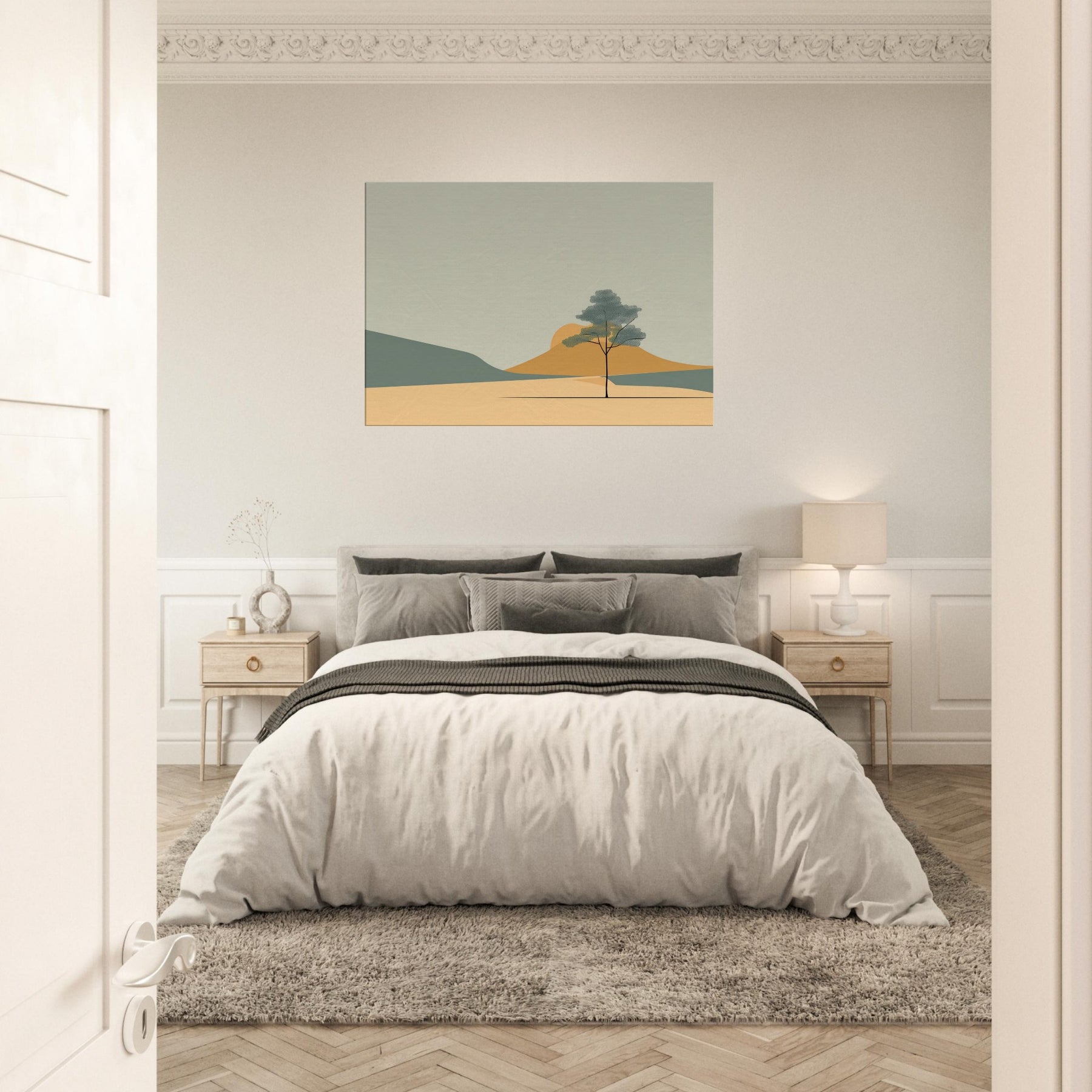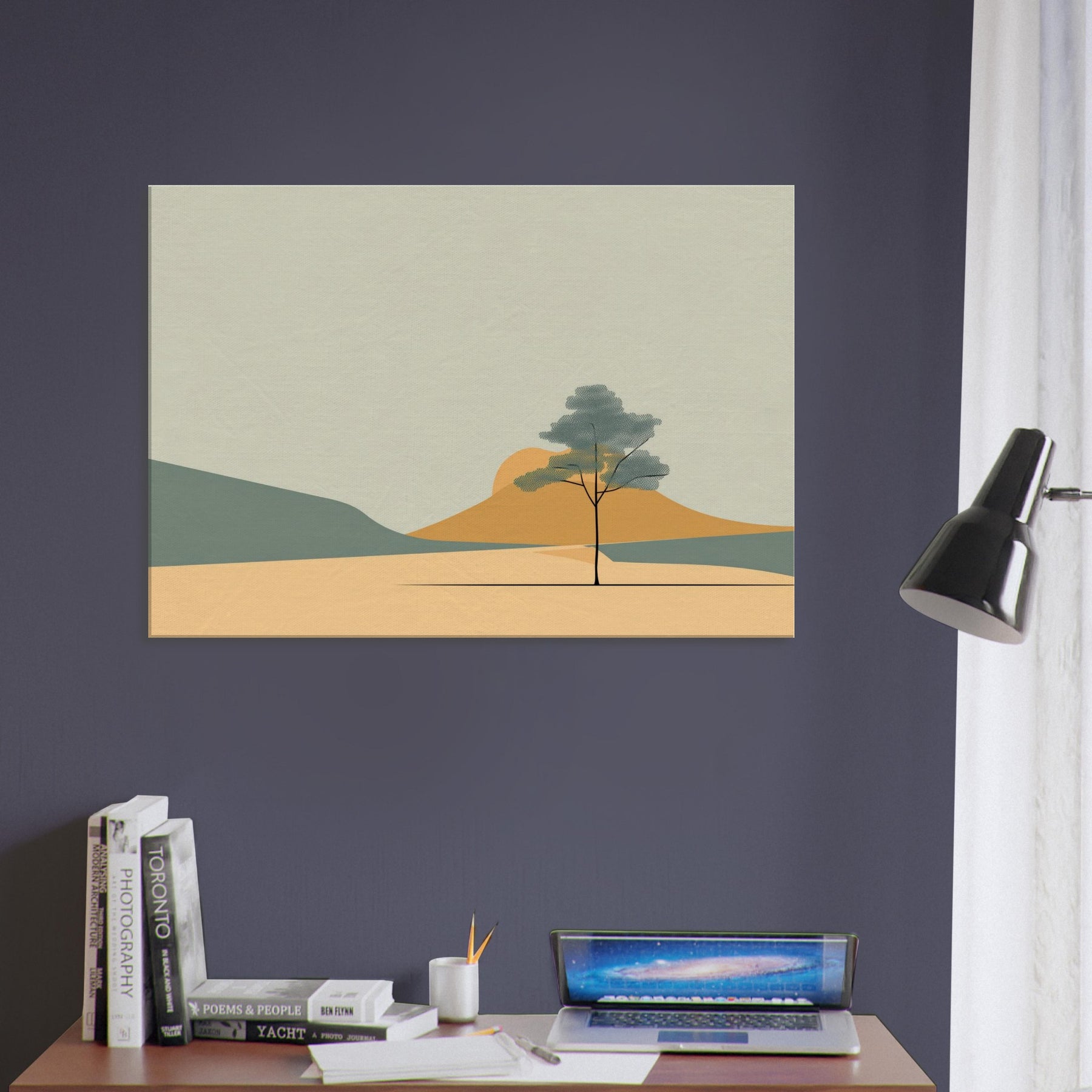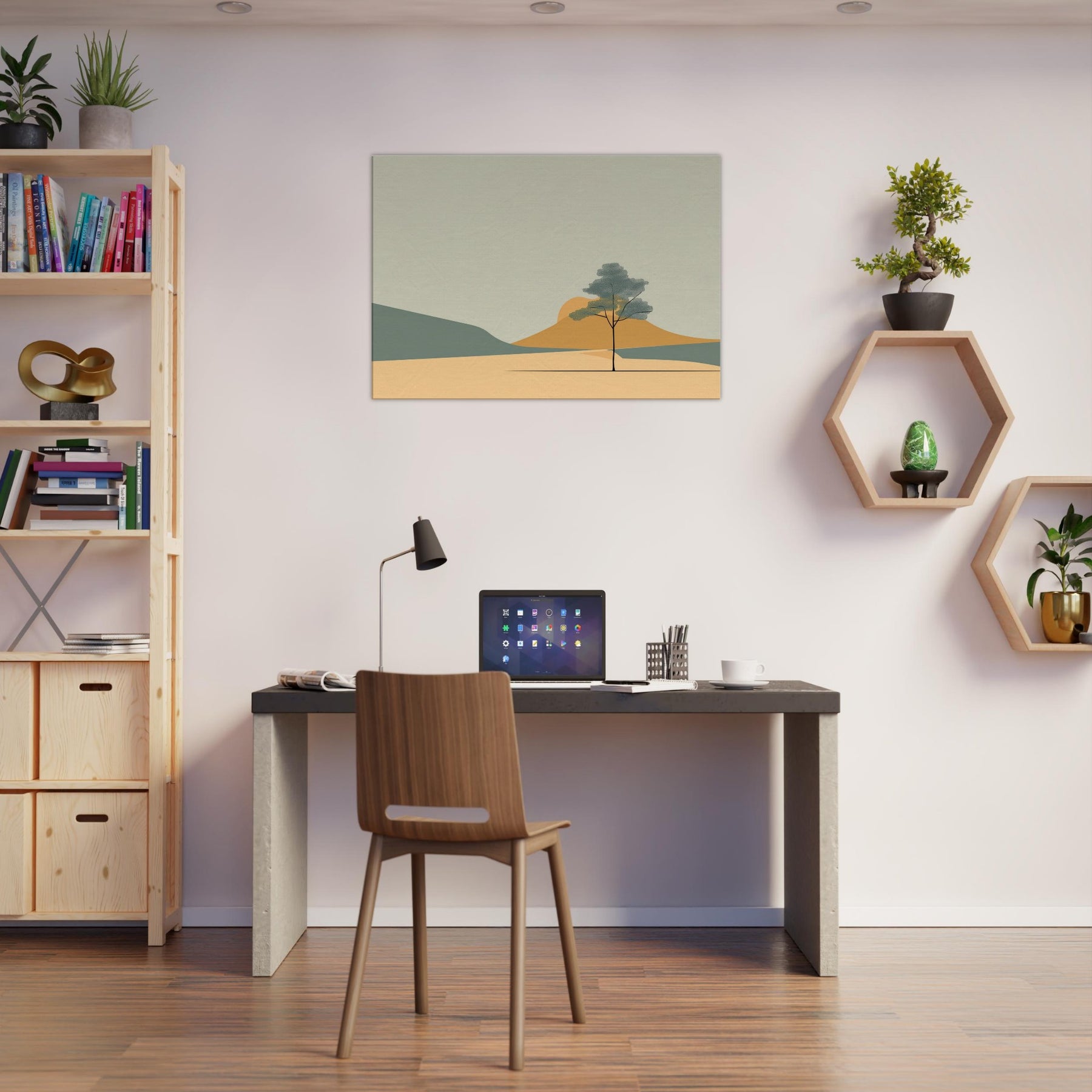 Zen Garden Rake Lines invites a calm hush into any space. The minimalist scene gathers soft sands, distant hills, and a lone tree in contemplative balance, capturing a moment of stillness as light shifts across the palette. Its restrained shapes and gentle tones echo a meditative breath, turning a living room or study into a sanctuary where worry loosens and focus returns. The primary subject, Zen Garden Rake Lines, becomes a quiet compass for daily life, a subtle reminder to pause, breathe, and simply be.