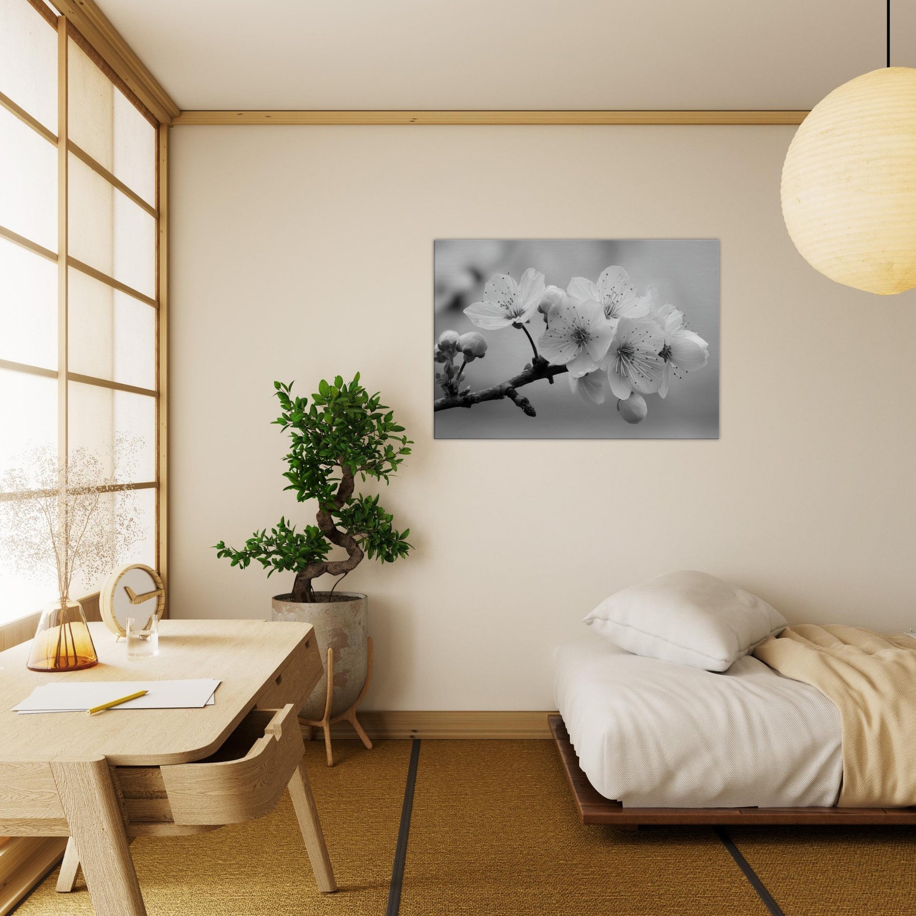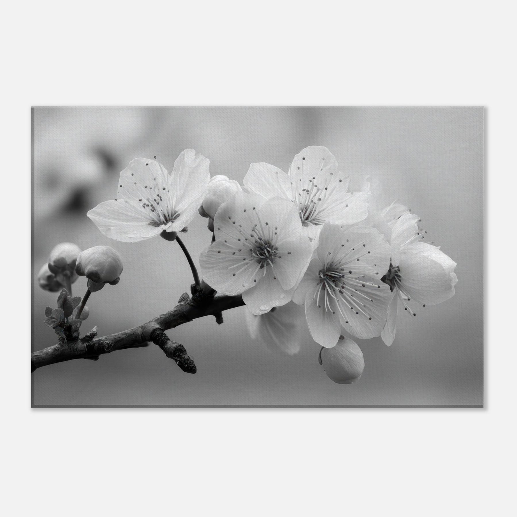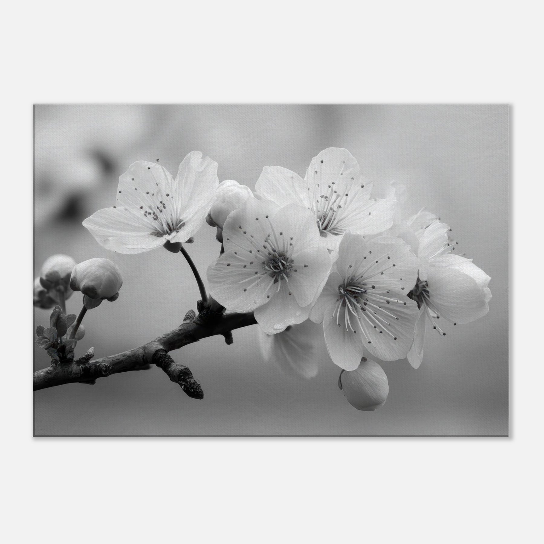 Let the Sakura Branch unfold in your living space, a delicate monochrome ode to quiet mornings and enduring seasons. In black and white, the blossoms become a study in light and shadow, each petal traced with intention, dewdrops like memory on the stem.