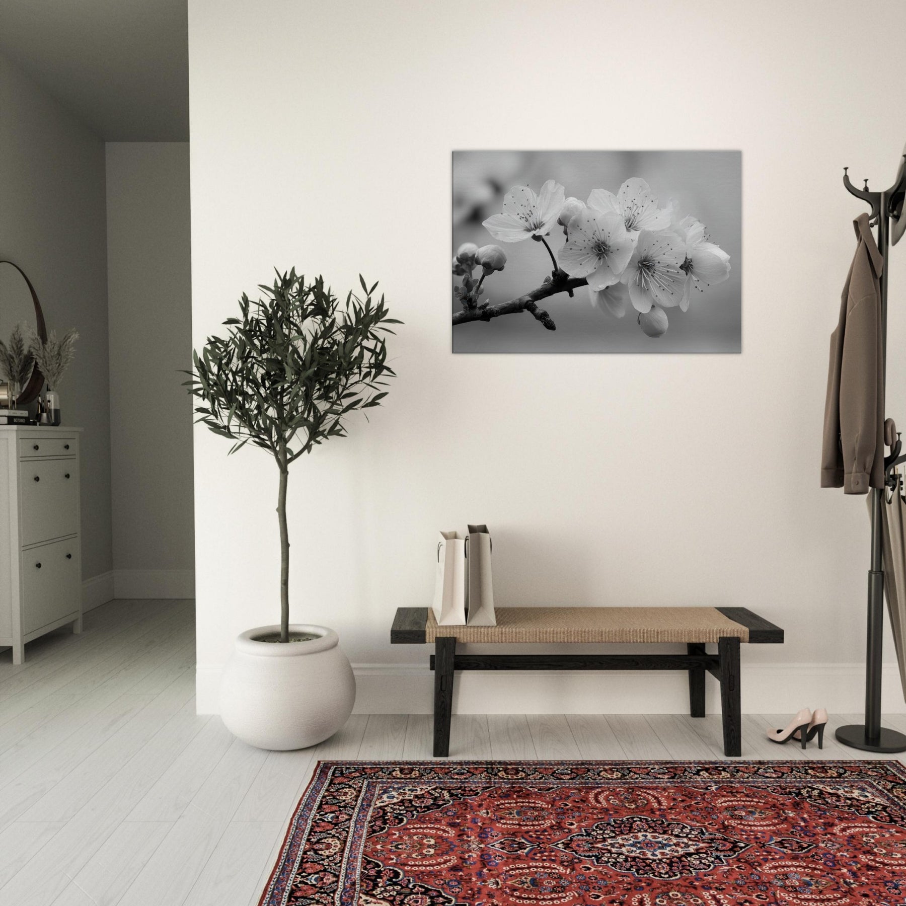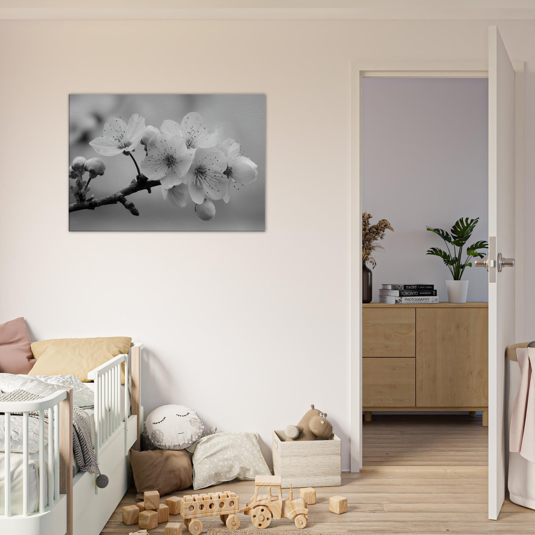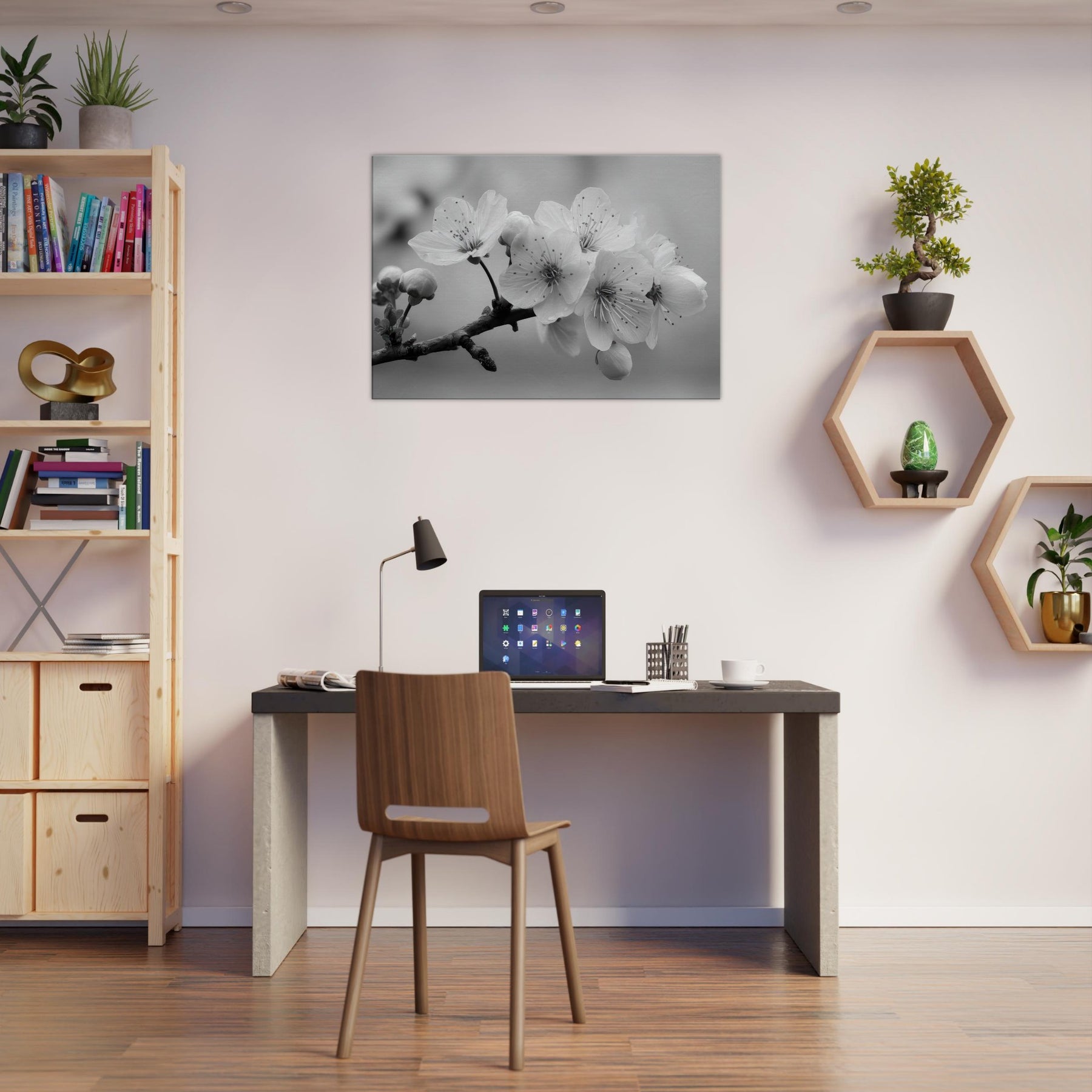 Let the Sakura Branch unfold in your living space, a delicate monochrome ode to quiet mornings and enduring seasons. In black and white, the blossoms become a study in light and shadow, each petal traced with intention, dewdrops like memory on the stem.