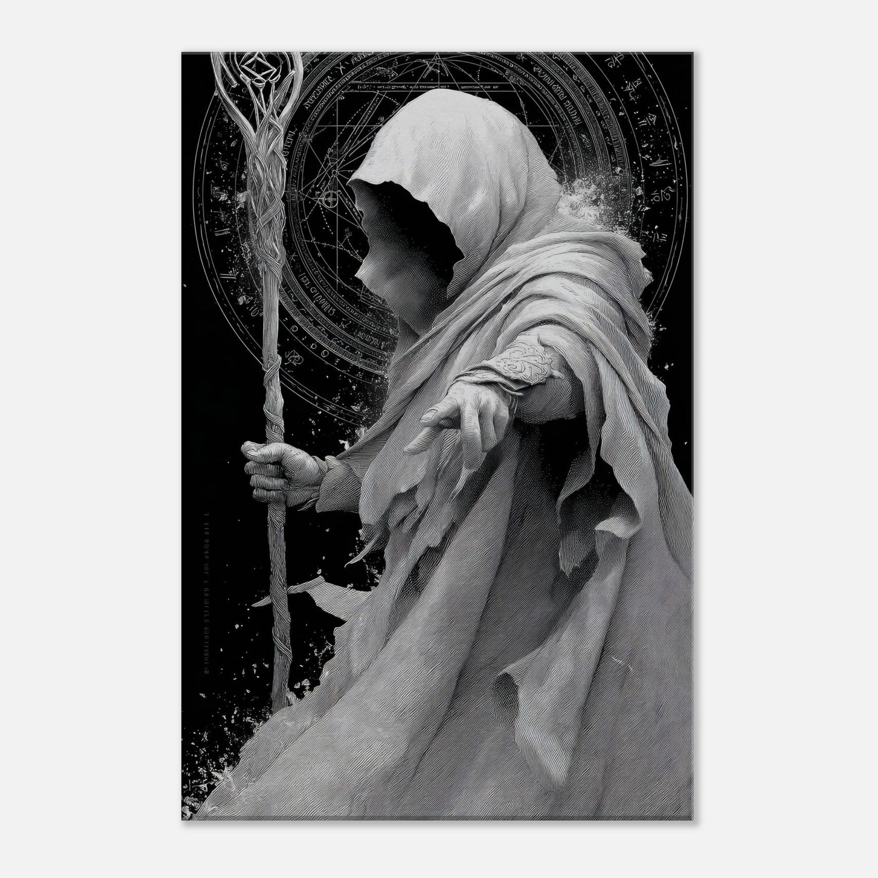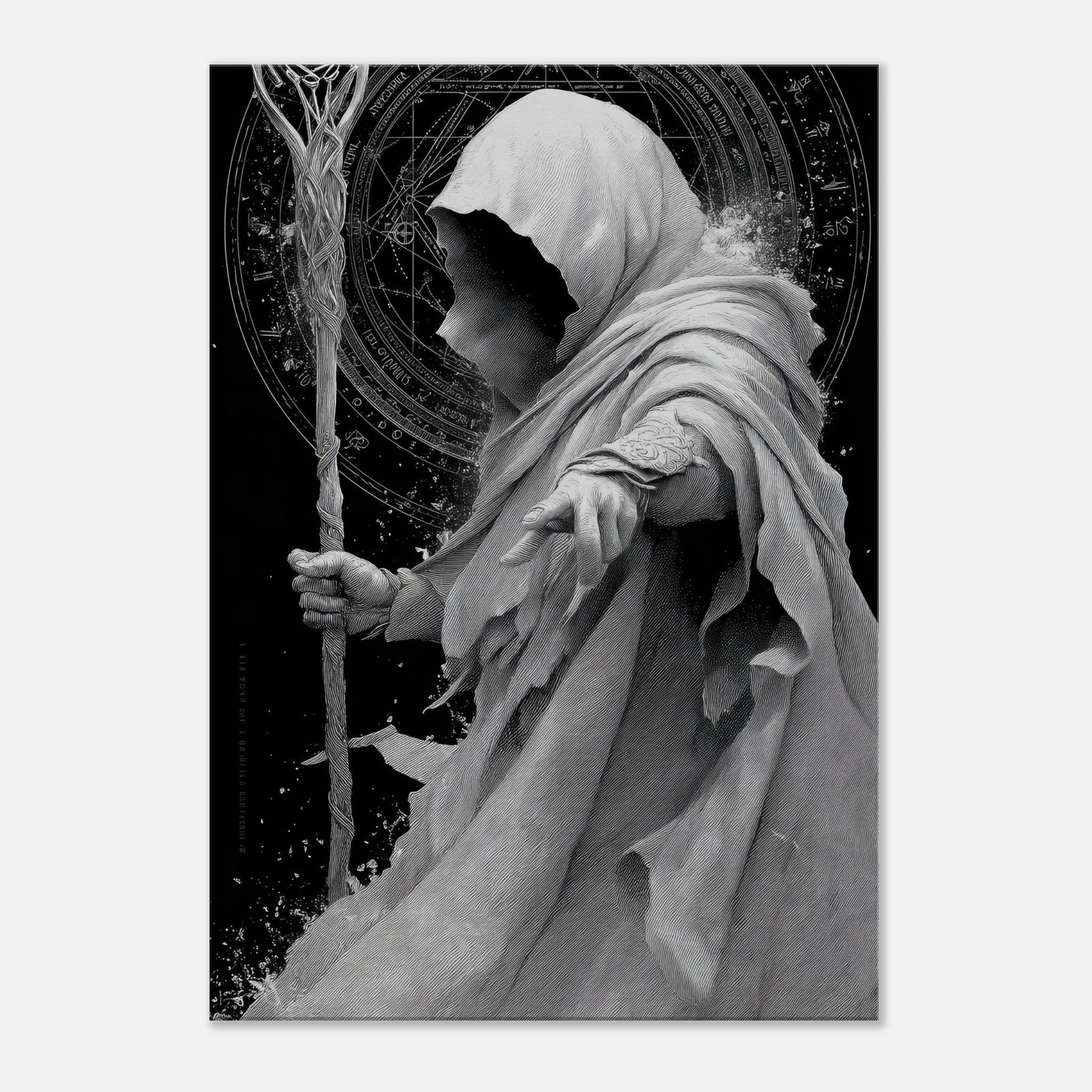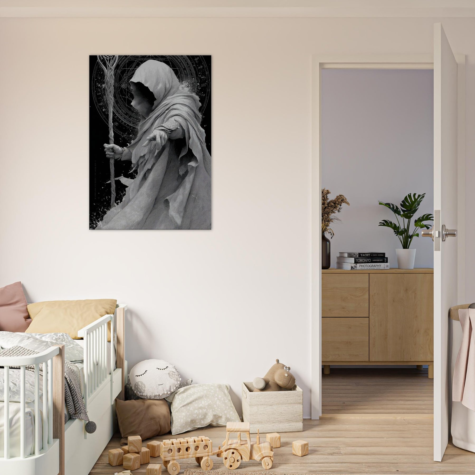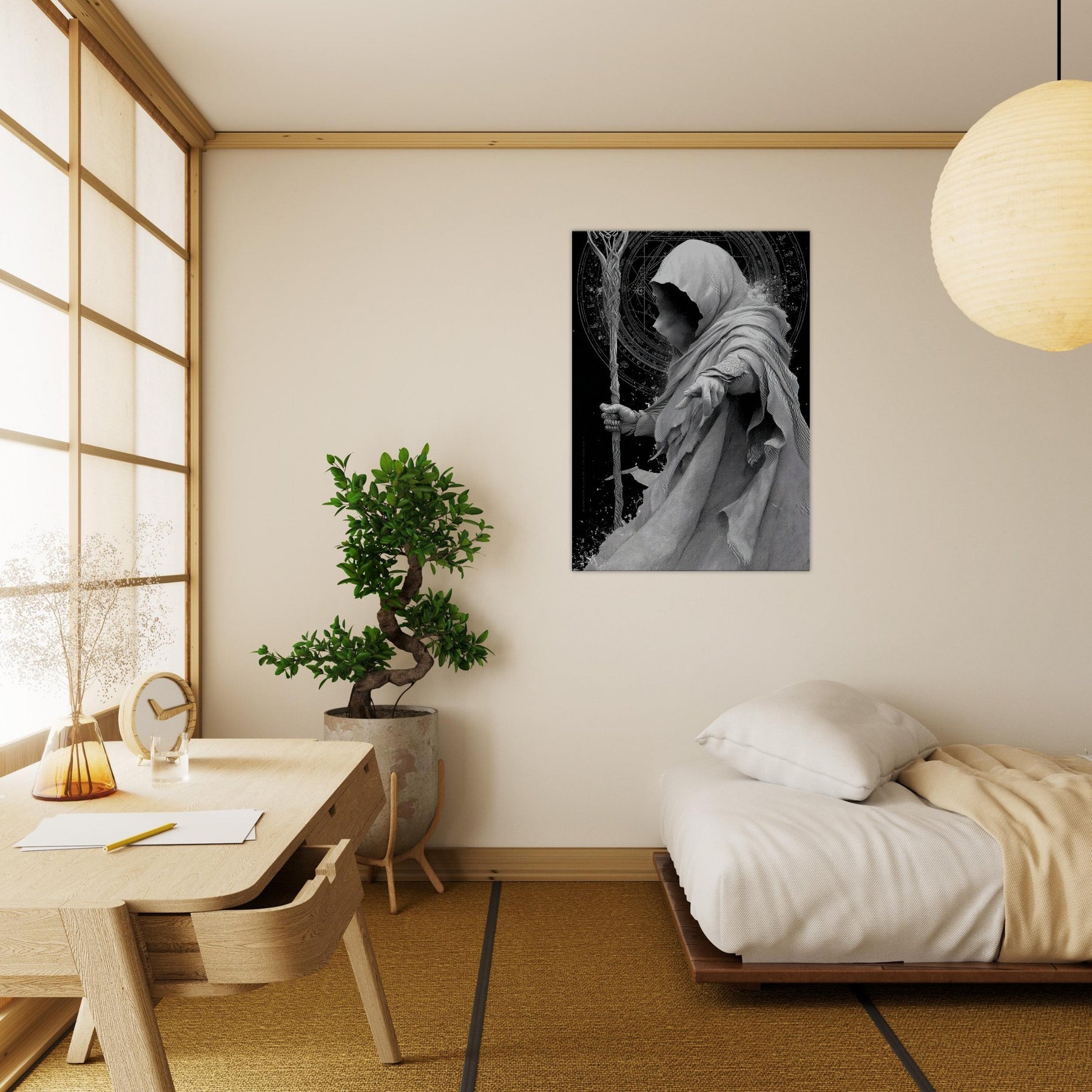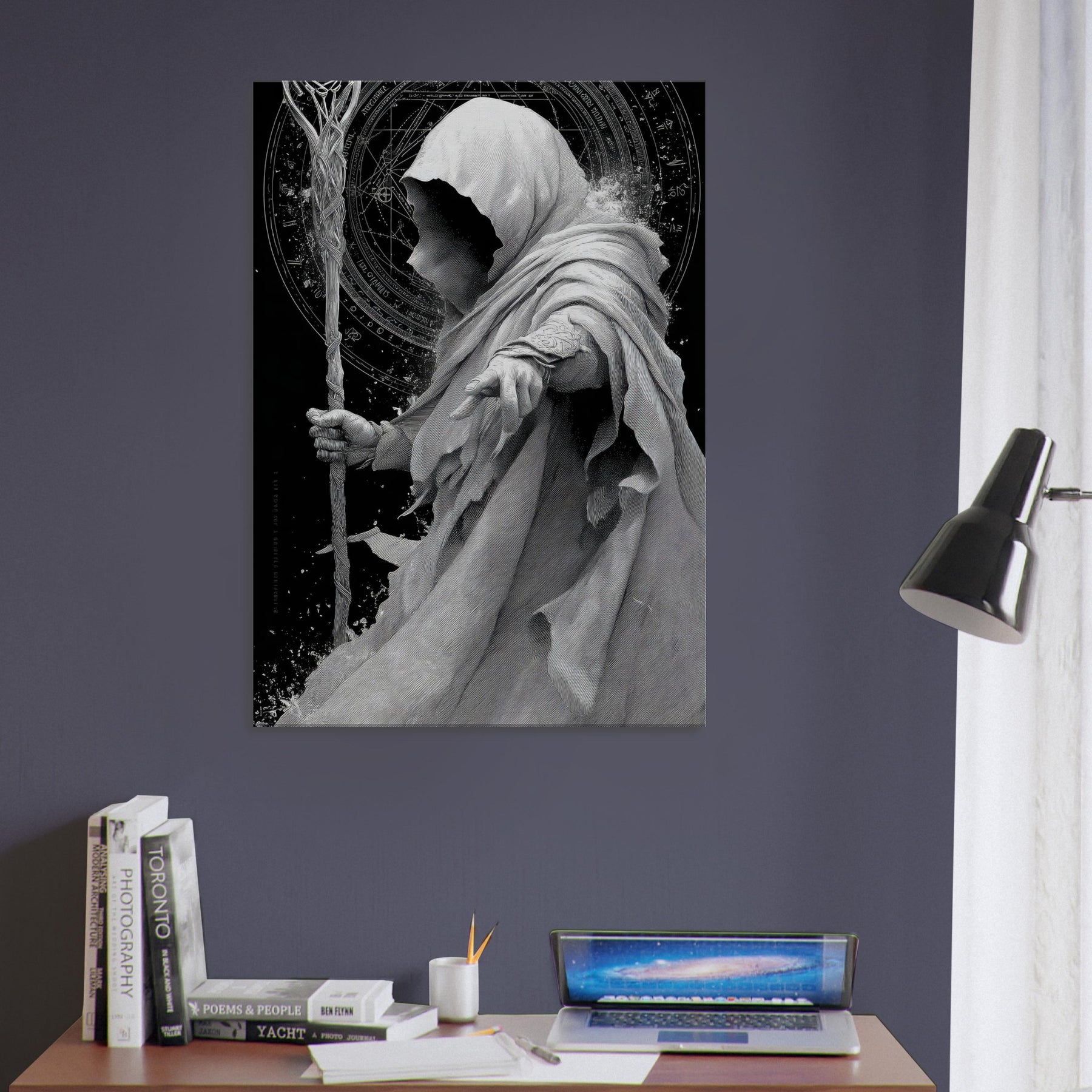 Step into a nocturnal chamber where light withdraws and magic threads through the air. This piece centers on a Mysterious Wizard casting spells, cloaked in a billowing hood and wisps of fabric, the staff carved with sigils. Against a starry, circular alchemical backdrop, the monochrome drama awakens a quiet awe, turning a living room into a sanctuary of focus and imagination. The ritual stillness invites contemplation, while the stark contrasts add depth to modern interiors, guiding conversations as if a spellbound doorway had opened.