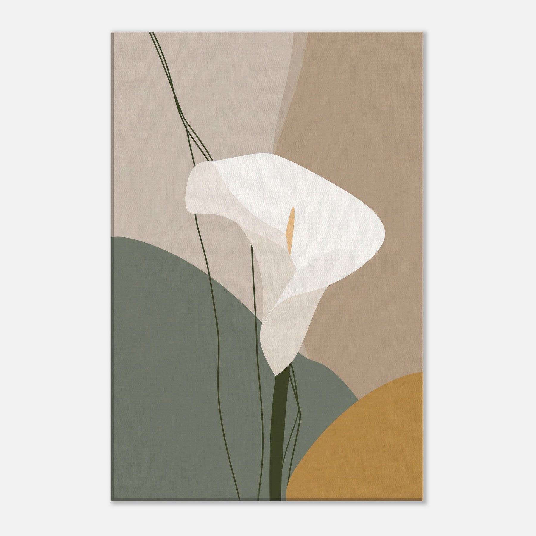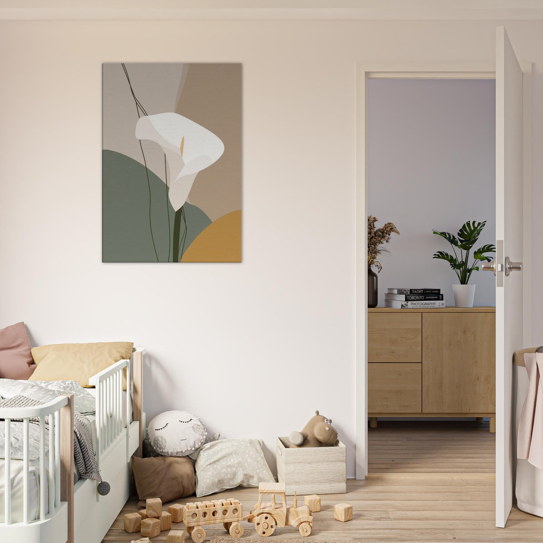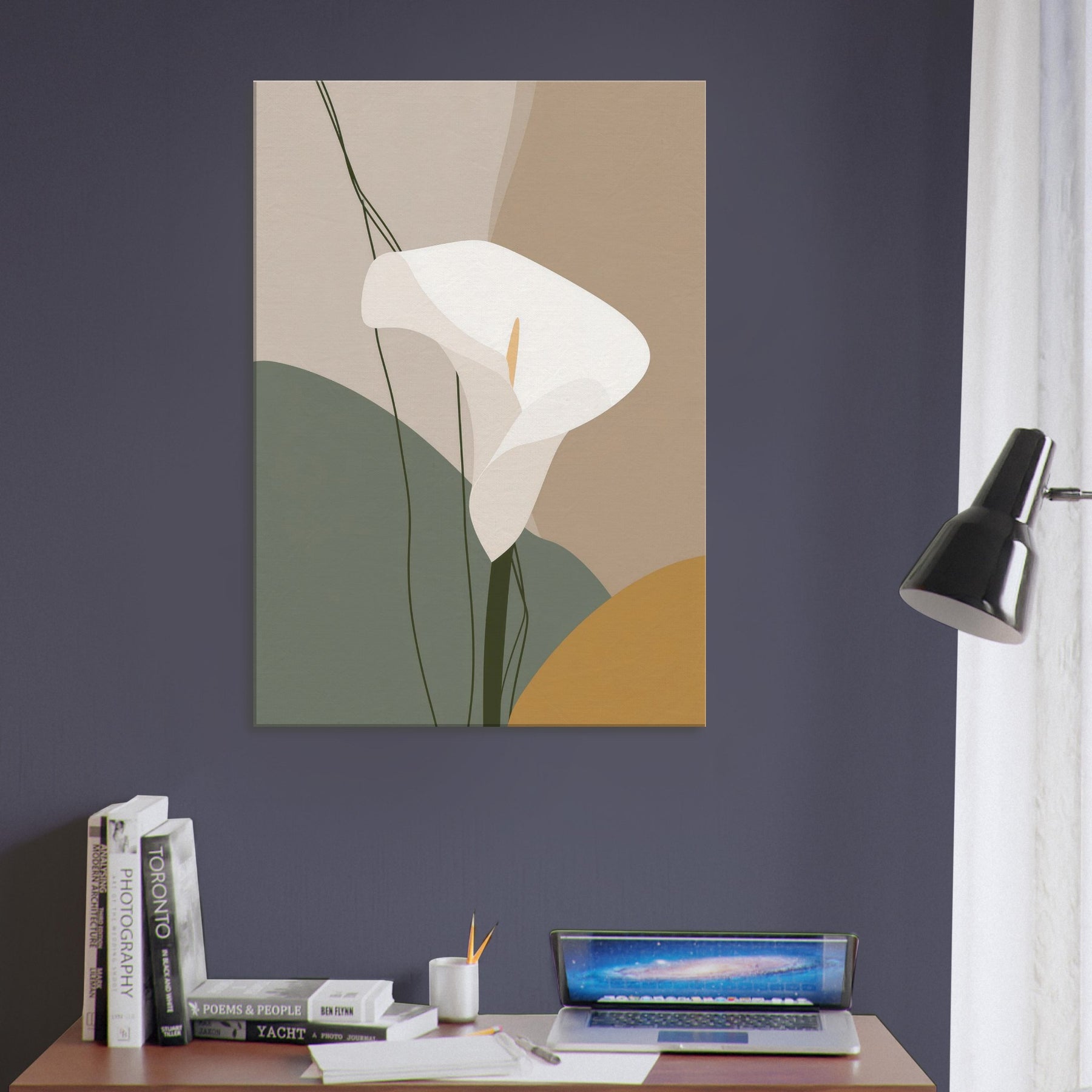 Soft, sculpted lines trace a single Calla Lily against a quiet, earth toned field. In this minimalist study, white petals curl gracefully, a pale central spine hinting at quiet strength. Muted greens, warm sand, and a touch of ochre form a tranquil backdrop that invites stillness and reflection. The composition breathes with spacious negative space, turning a doorway into a small sanctuary. Ideal for a living room or bedroom, it pairs with natural textures to create a serene focal point that feels timeless and clean.
