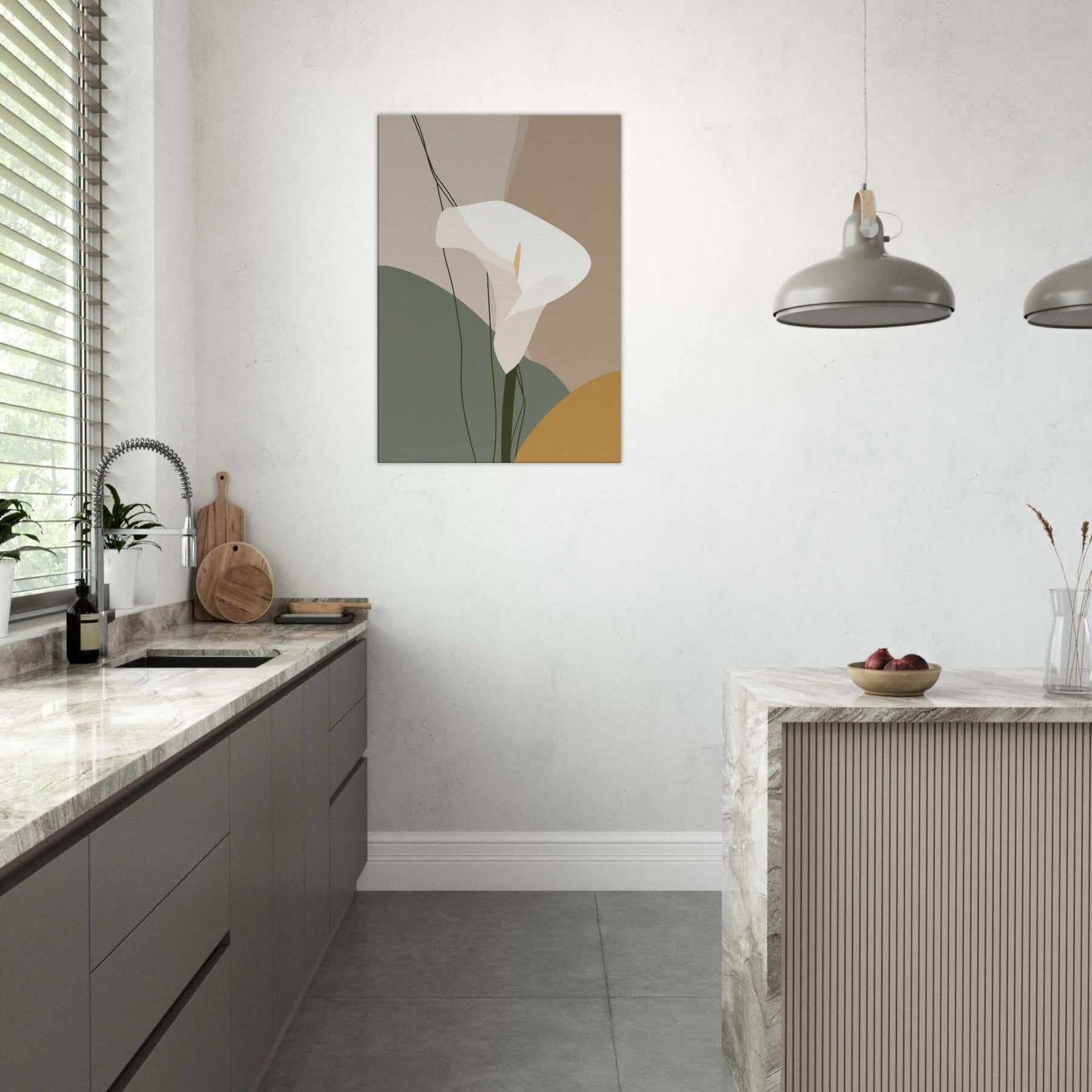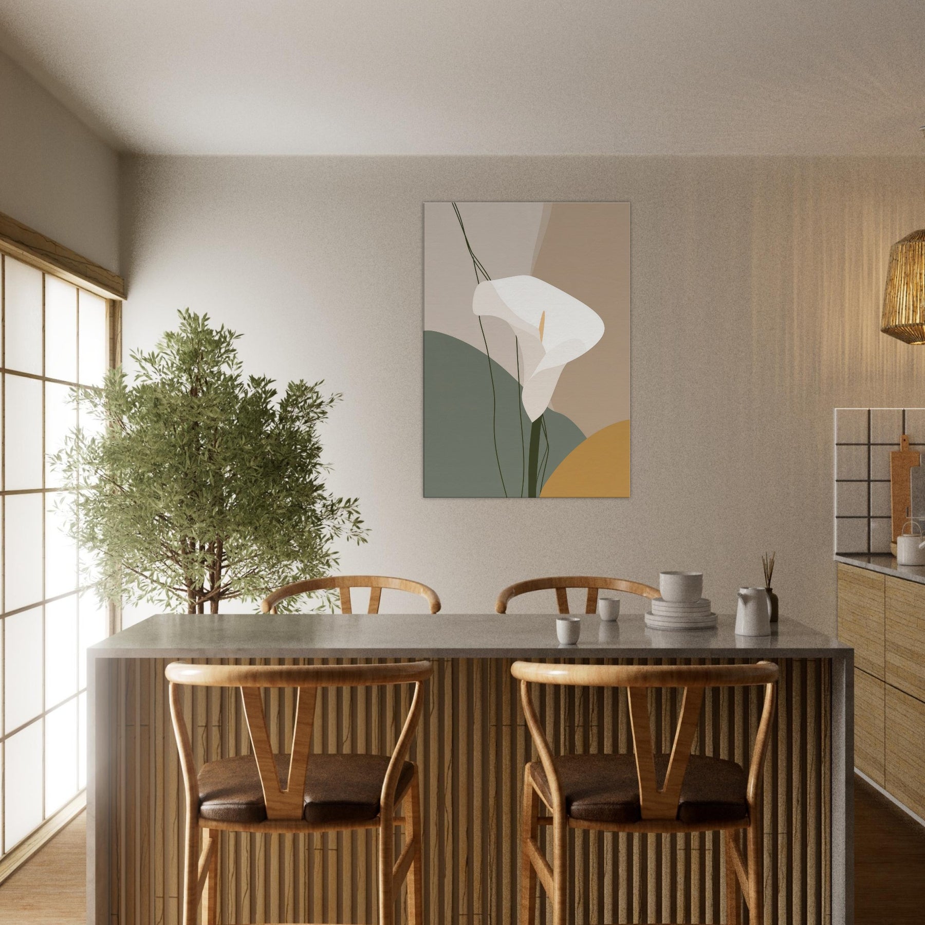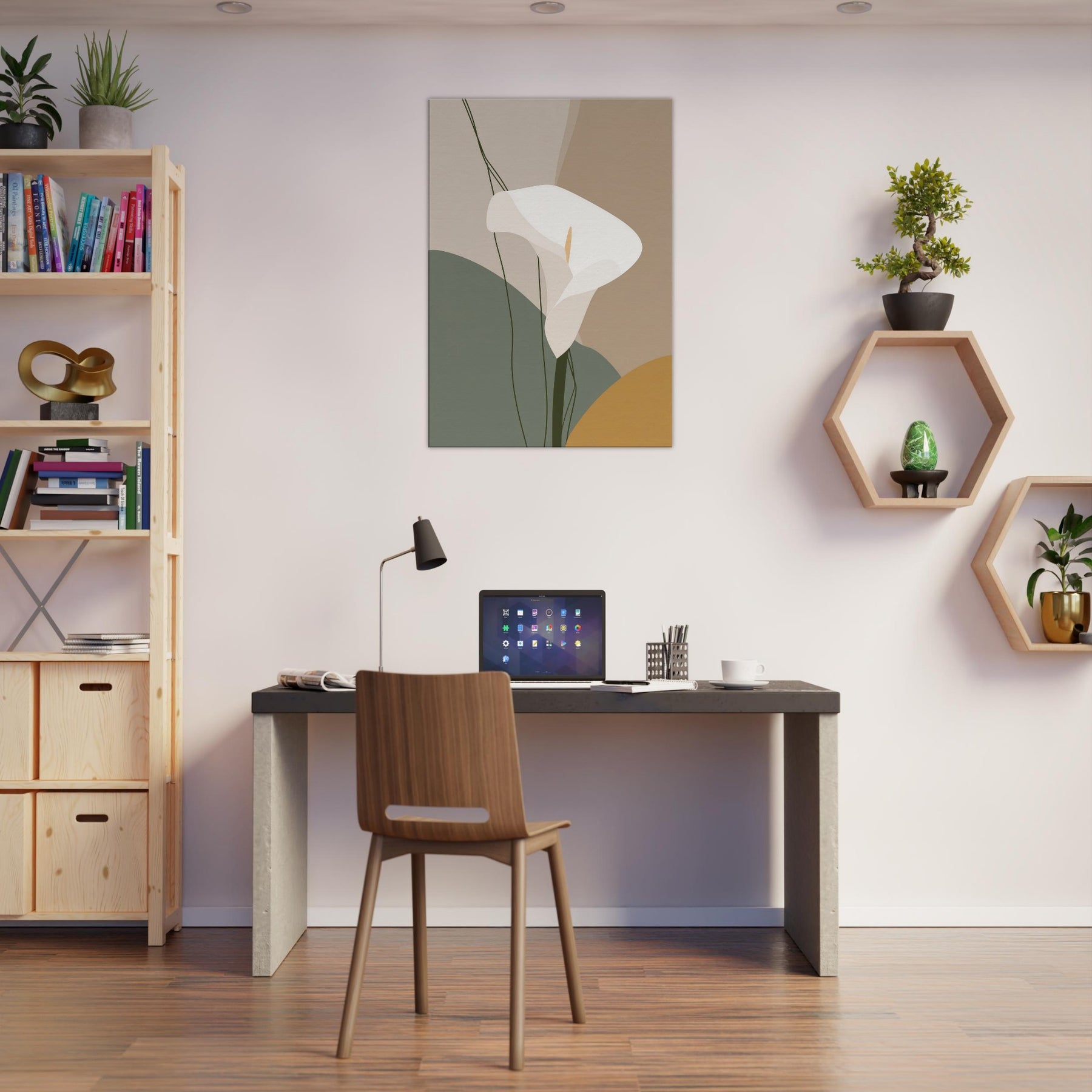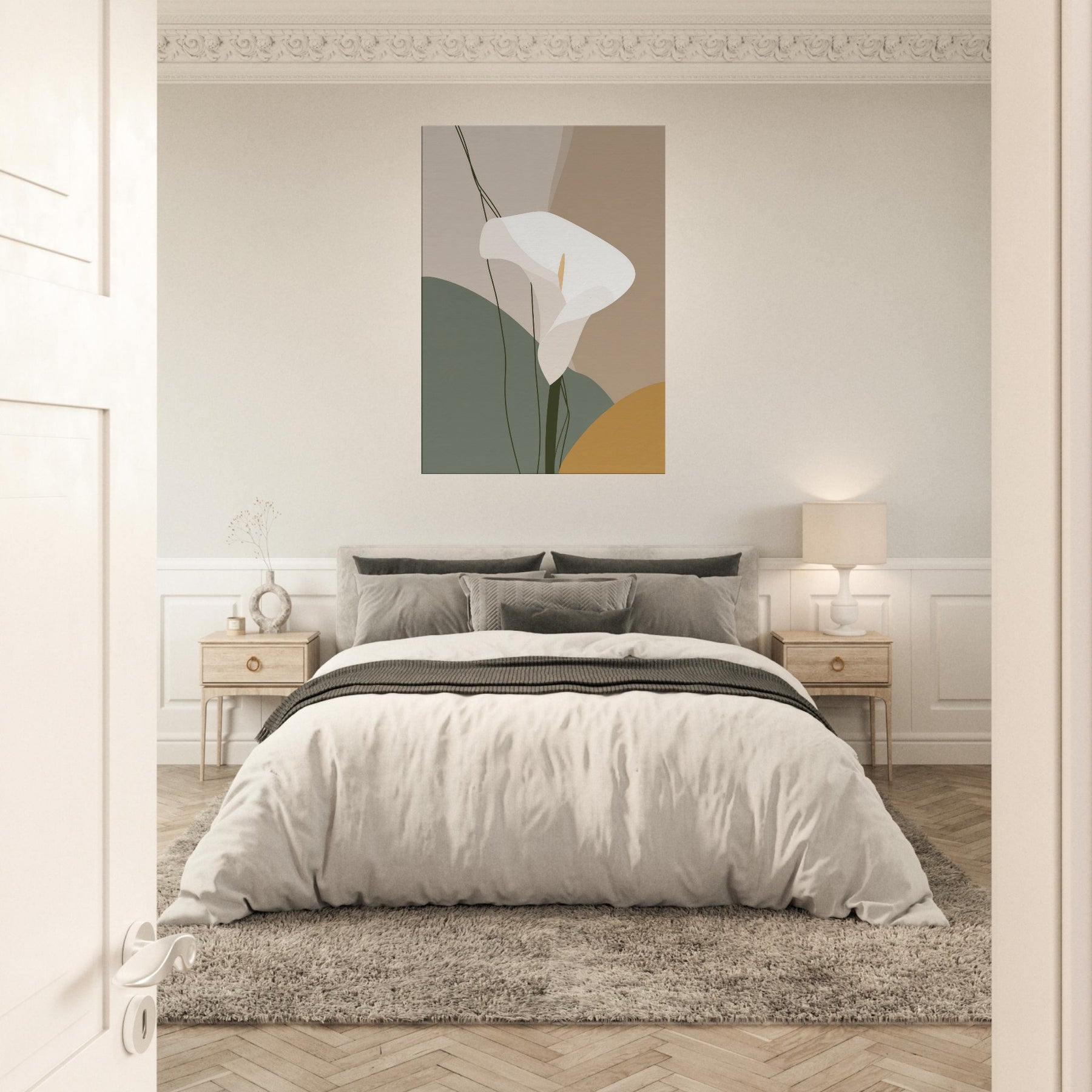 Soft, sculpted lines trace a single Calla Lily against a quiet, earth toned field. In this minimalist study, white petals curl gracefully, a pale central spine hinting at quiet strength. Muted greens, warm sand, and a touch of ochre form a tranquil backdrop that invites stillness and reflection. The composition breathes with spacious negative space, turning a doorway into a small sanctuary. Ideal for a living room or bedroom, it pairs with natural textures to create a serene focal point that feels timeless and clean.