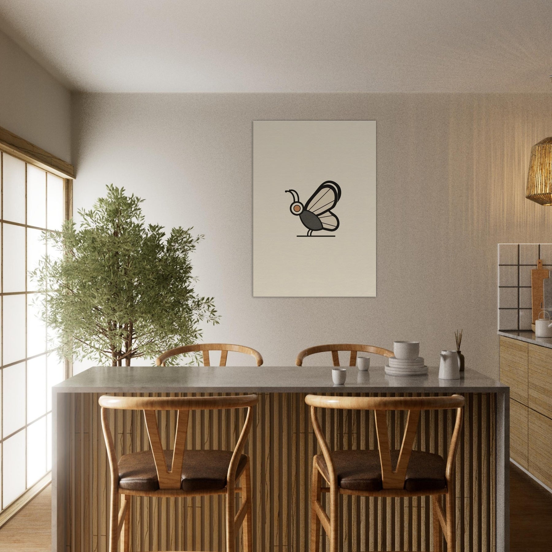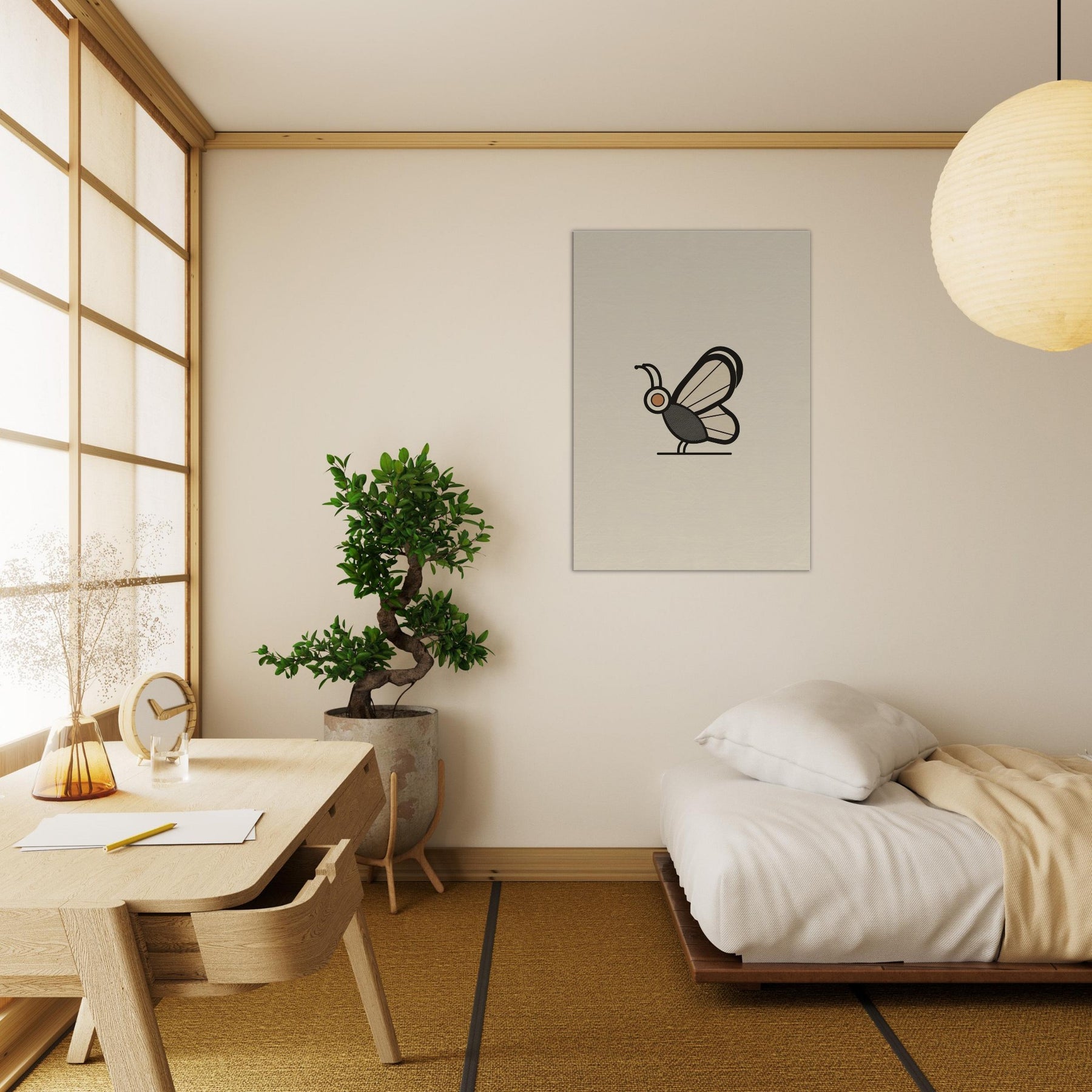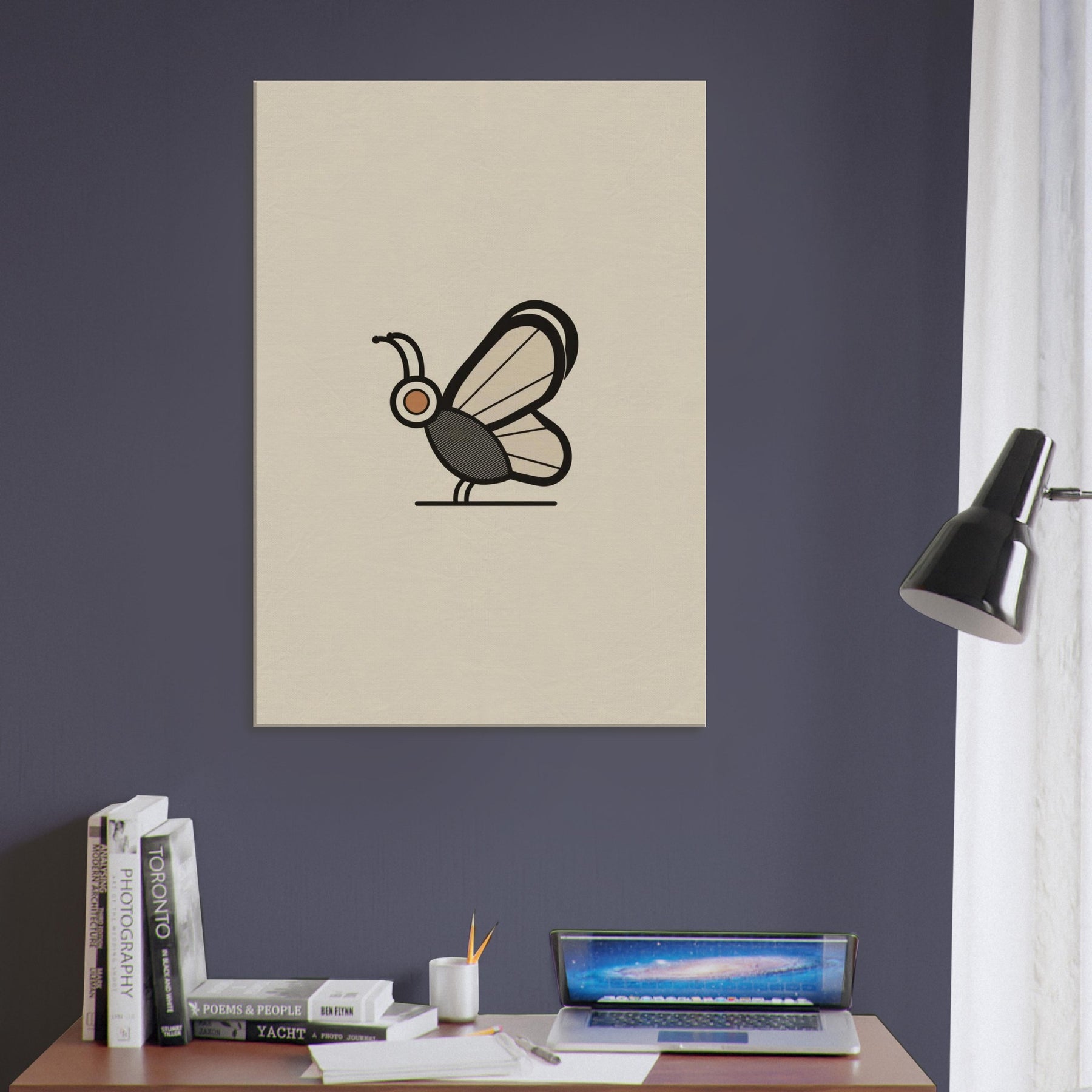 Butterfly becomes a quiet punctuation mark in a serene room. This minimalist study distills form into a single, confident line and a gentle palette that feels like dawn. The Butterfly, the primary subject, glides on still air, inviting contemplation without shouting. Soft light plays across the wall, turning daily spaces into calm sanctuaries. The restrained elegance pairs effortlessly with a range of interiors, from clean mid century to contemporary, enriching atmosphere with grace and restraint.